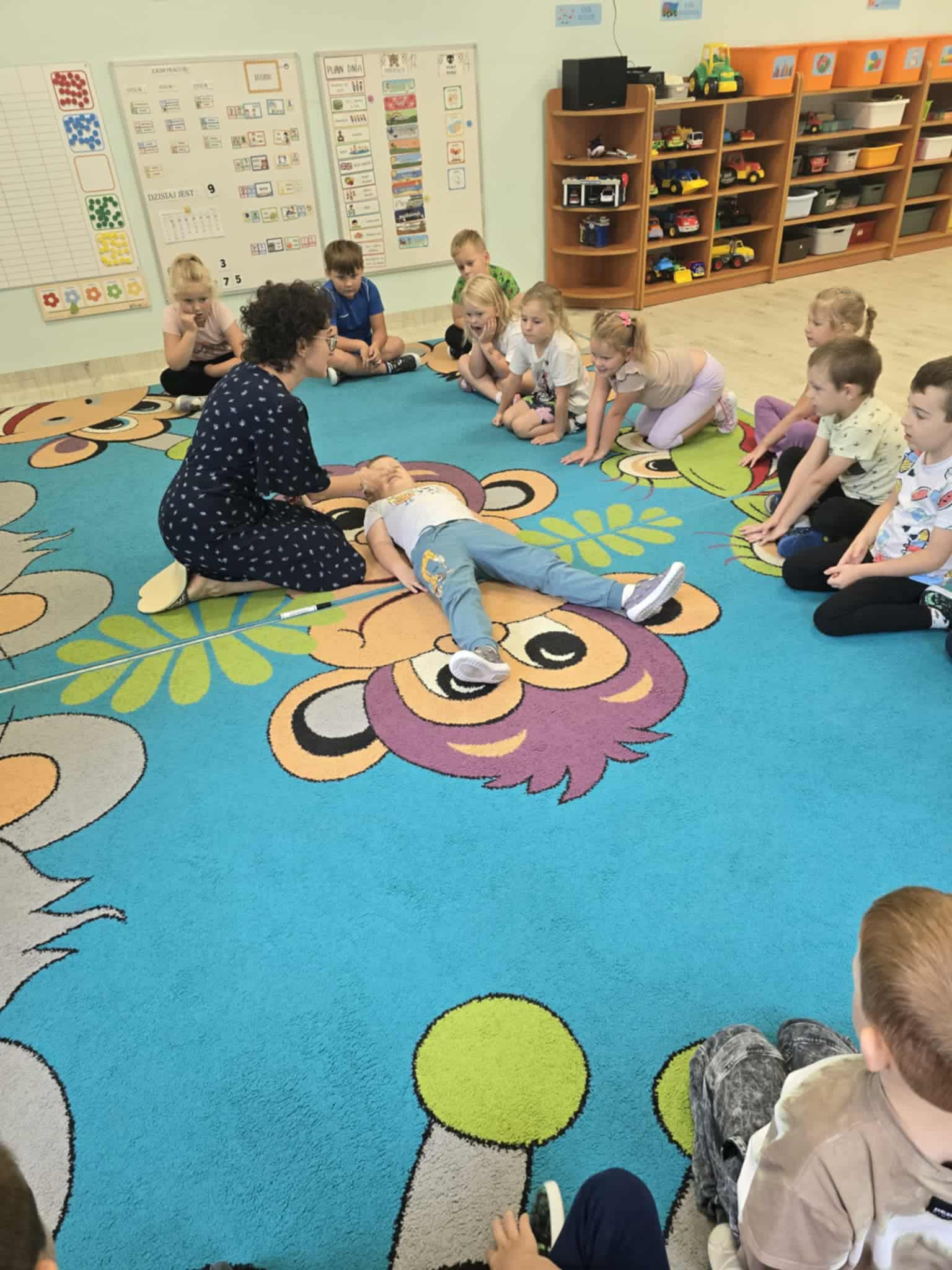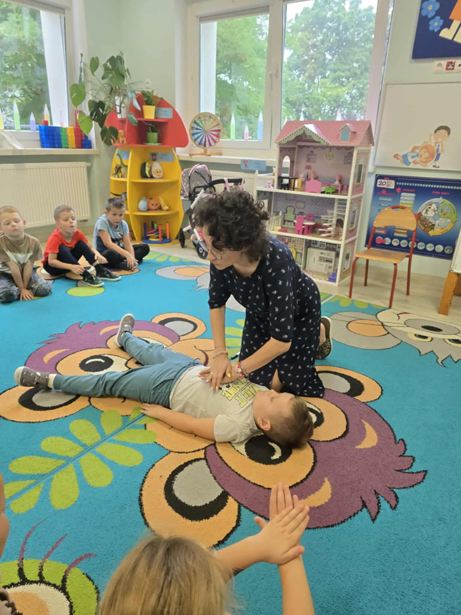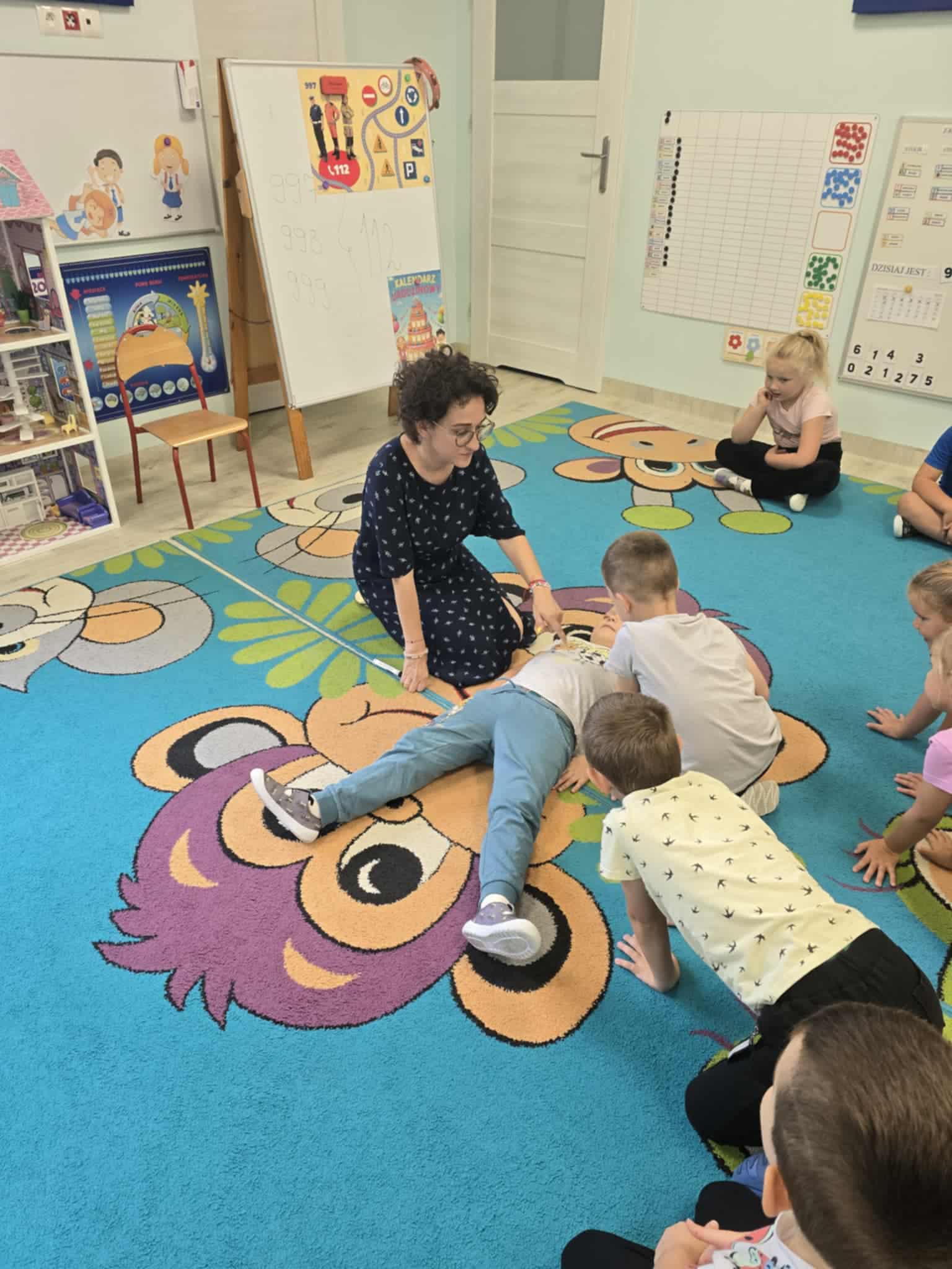 Na zajęciach utrwaliliśmy zasady pierwszej pomocy oraz zapoznaliśmy się z drogą ewakuacyjną w naszym przedszkolu.