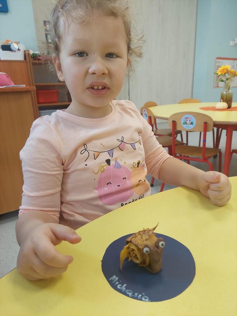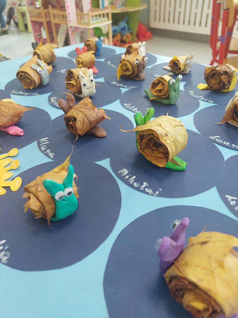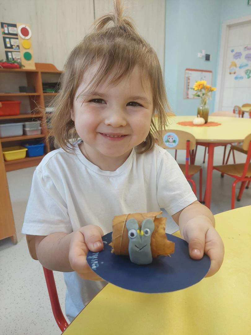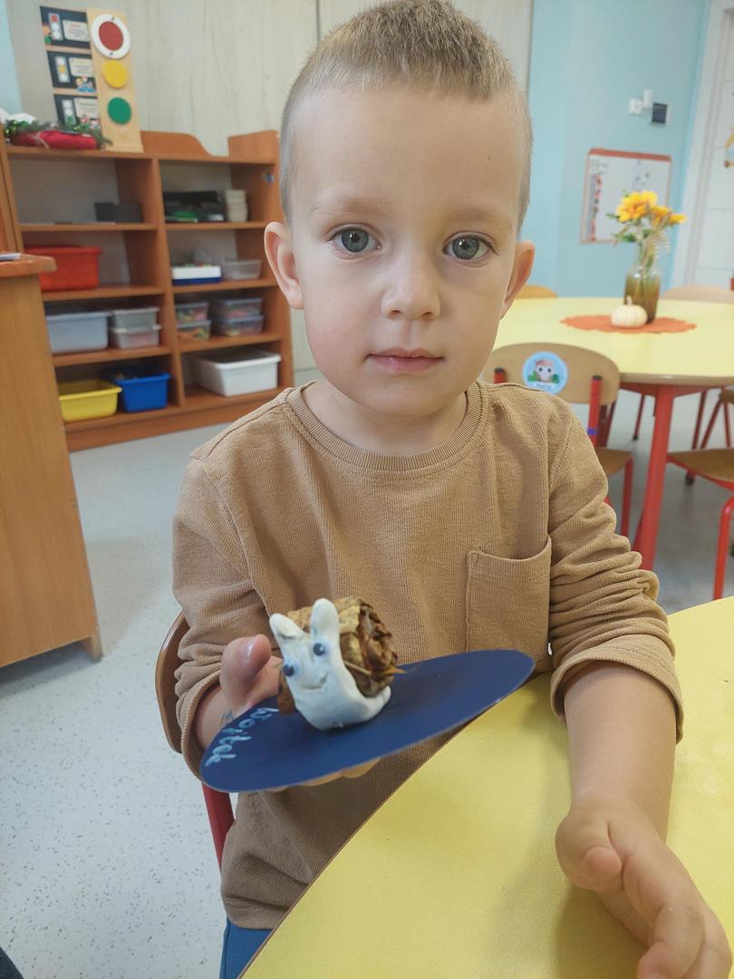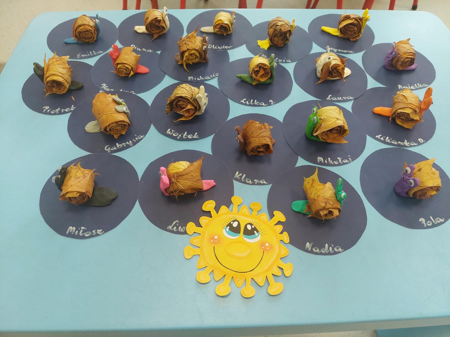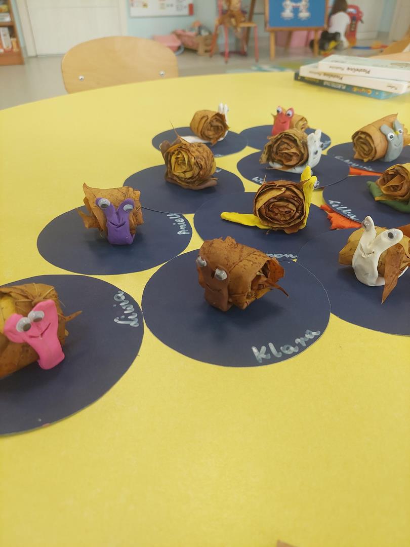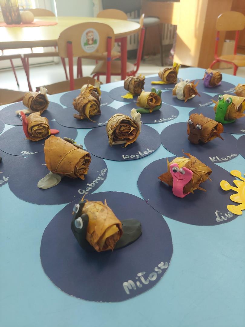 Rozmawiając o Naszej Małej Ojczyźnie wspomnieliśmy o różnych domach. Wykonaliśmy ślimaczki, które noszą swój domek przez cały czas. Do zrobienia domków użyliśmy jesiennych liści, pozbieranych przez dzieci. Sądzimy że są urocze.