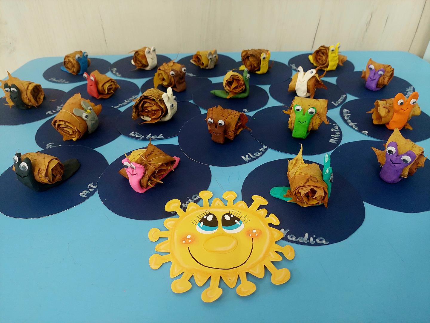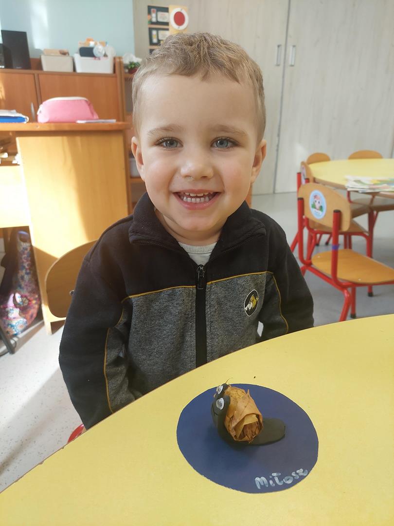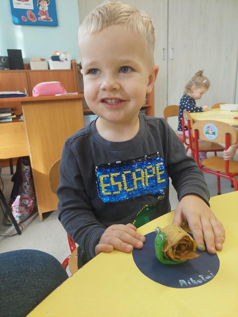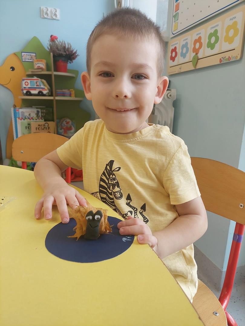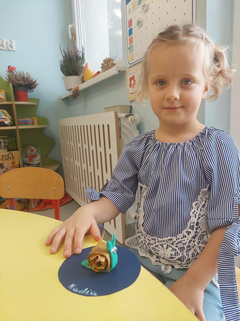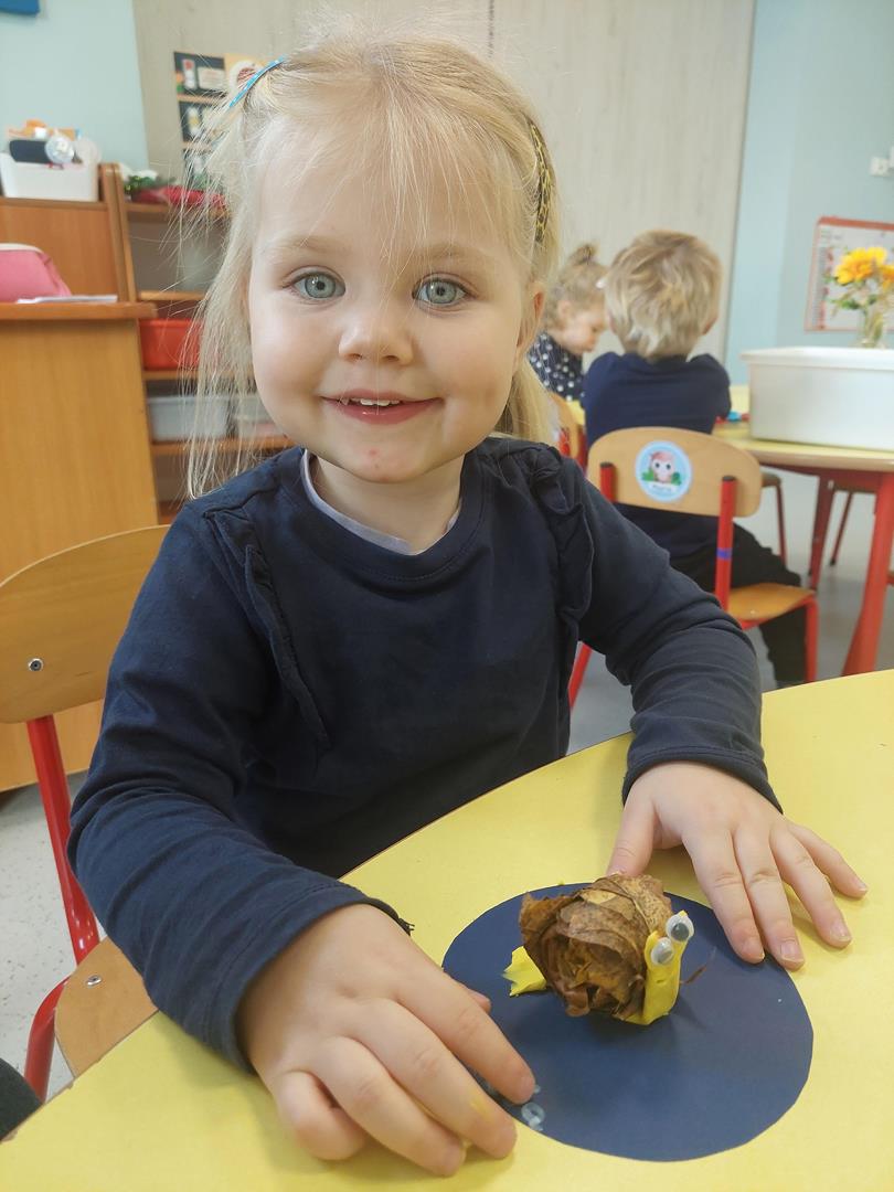 Rozmawiając o Naszej Małej Ojczyźnie wspomnieliśmy o różnych domach. Wykonaliśmy ślimaczki, które noszą swój domek przez cały czas. Do zrobienia domków użyliśmy jesiennych liści, pozbieranych przez dzieci. Sądzimy że są urocze.