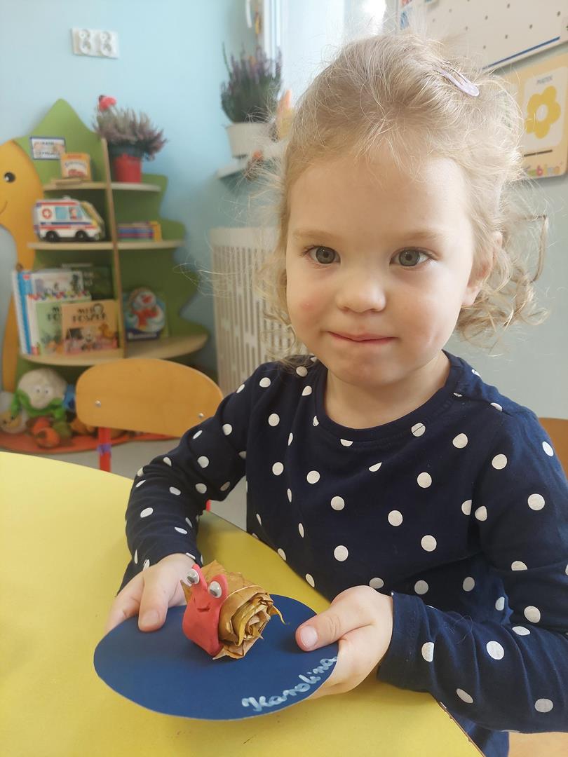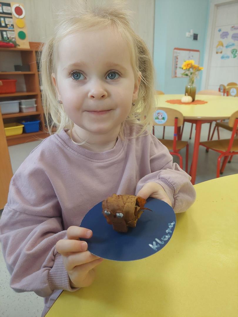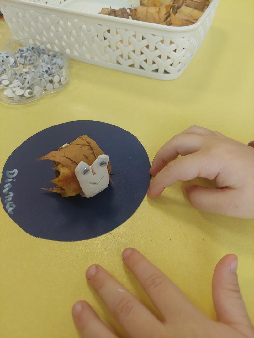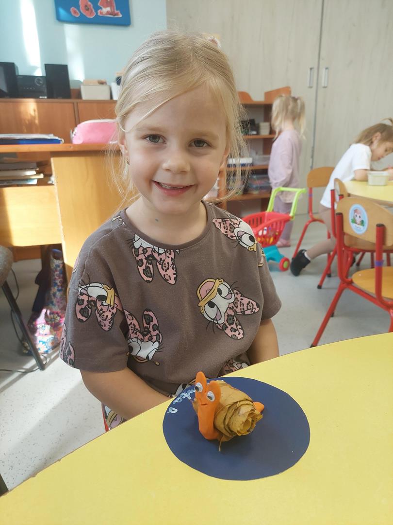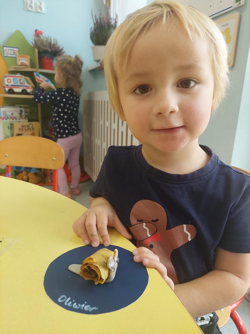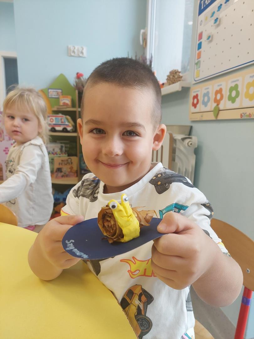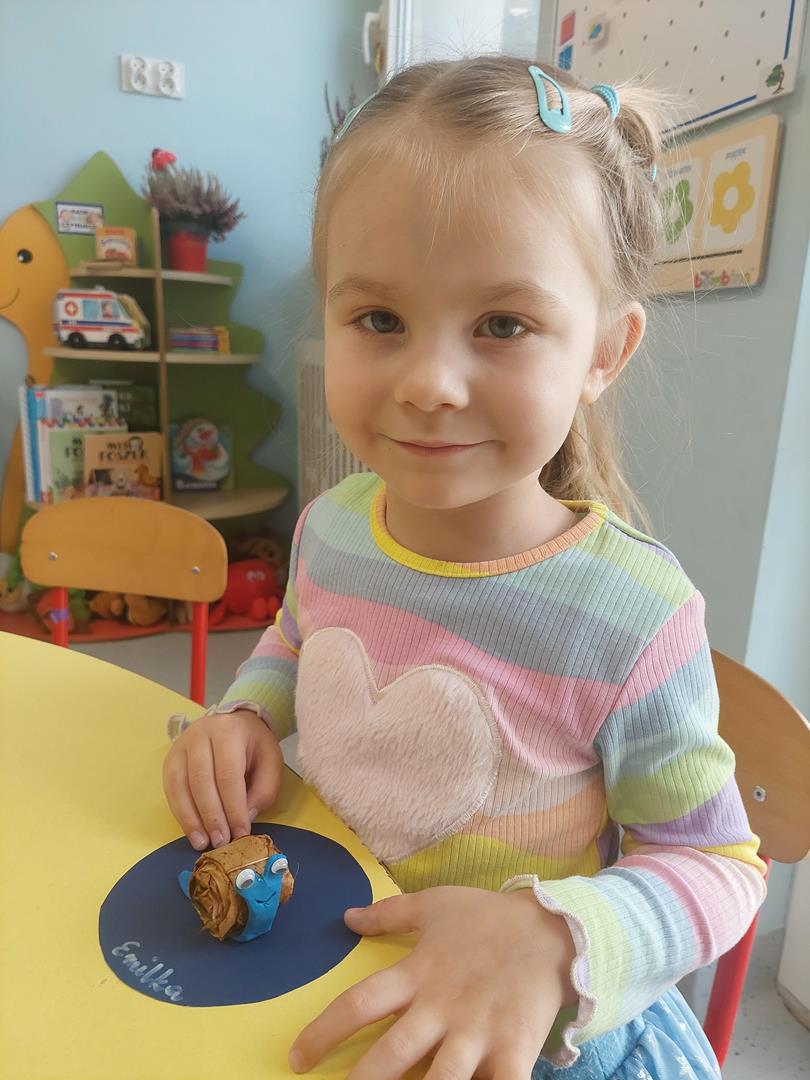 Rozmawiając o Naszej Małej Ojczyźnie wspomnieliśmy o różnych domach. Wykonaliśmy ślimaczki, które noszą swój domek przez cały czas. Do zrobienia domków użyliśmy jesiennych liści, pozbieranych przez dzieci. Sądzimy że są urocze.