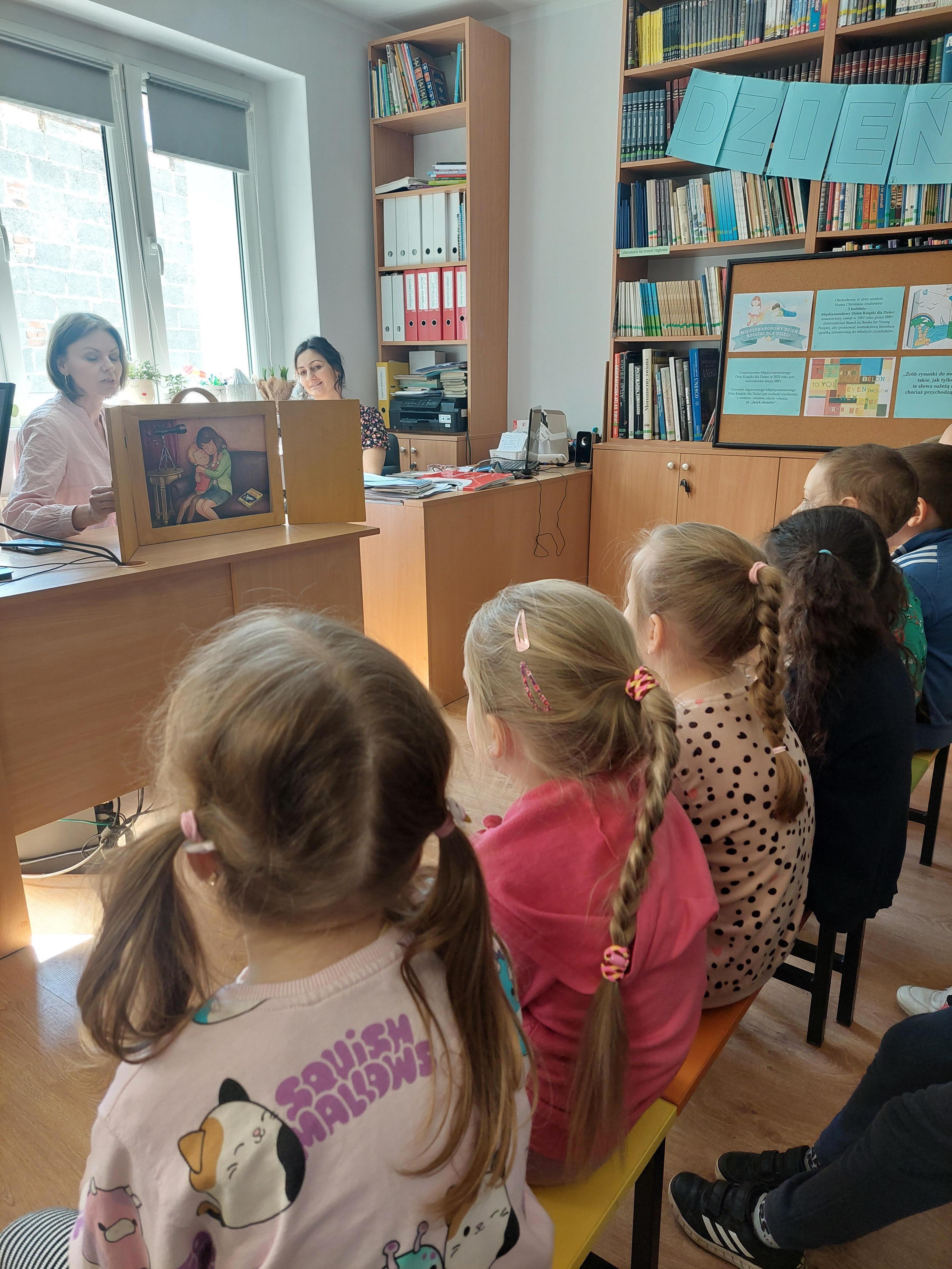 Dzieci odwiedziły bibliotekę szkolną. Szczególnie miło było spotkać się z panią Anią w bibliotece, gdyż zazwyczaj pani przychodzi do naszej grupy przedszkolnej. Pani Ania pokazała dzieciom książki i przypomniała o korzystaniu z nich. Dzieci wysłuchały odpowiadania magicznych słowach i poprosiła aby dzieci używały ich na codzień.