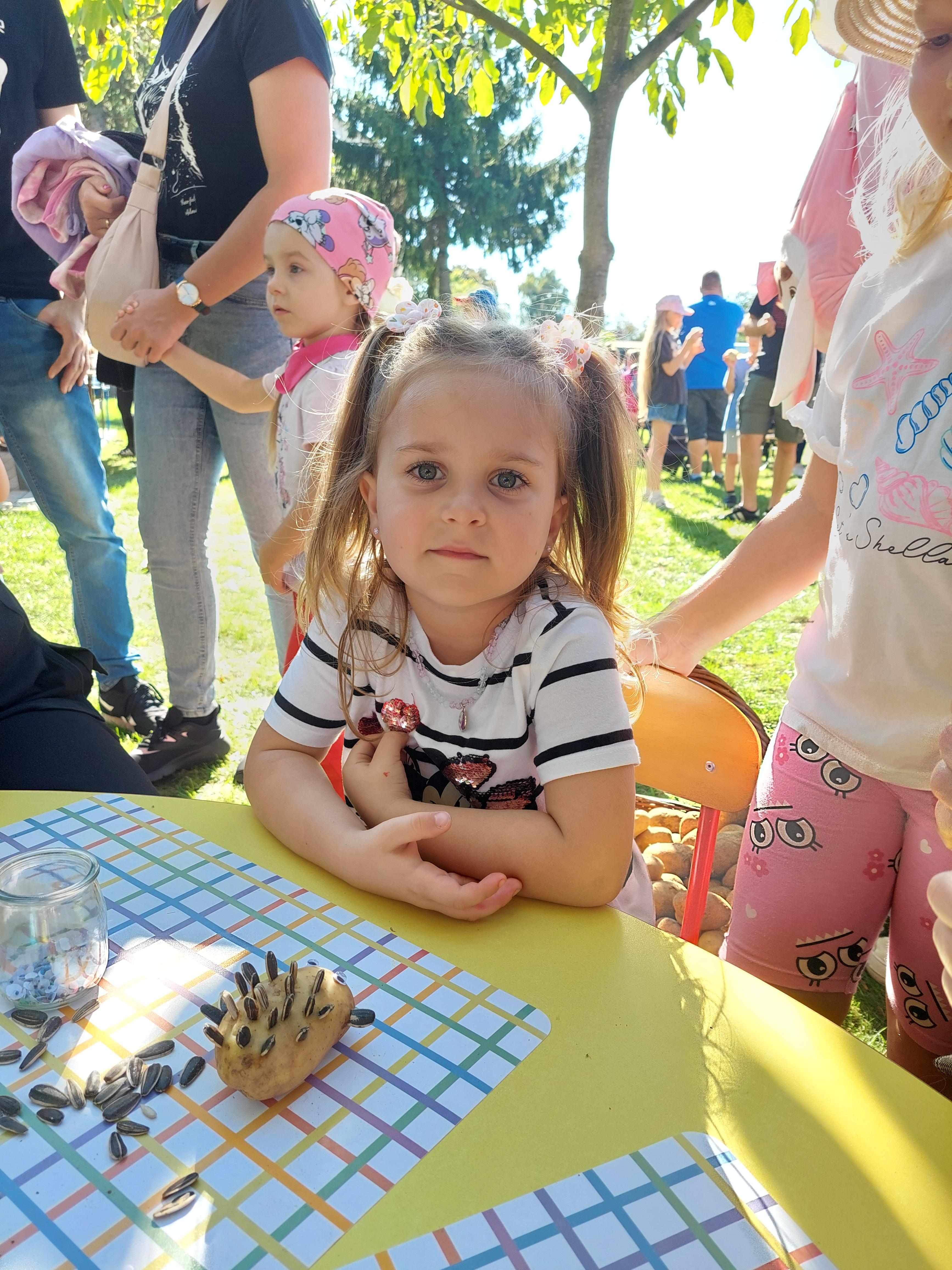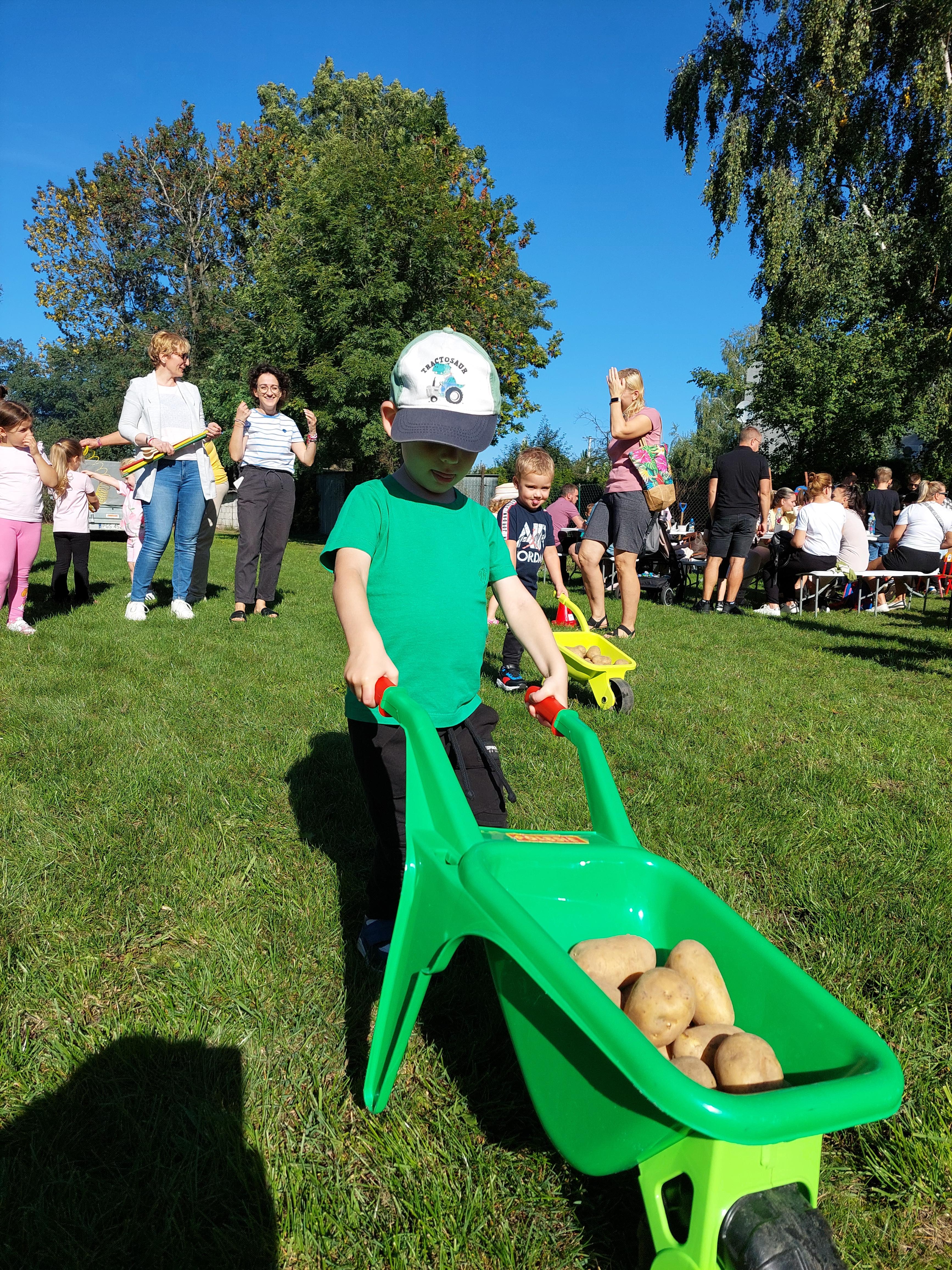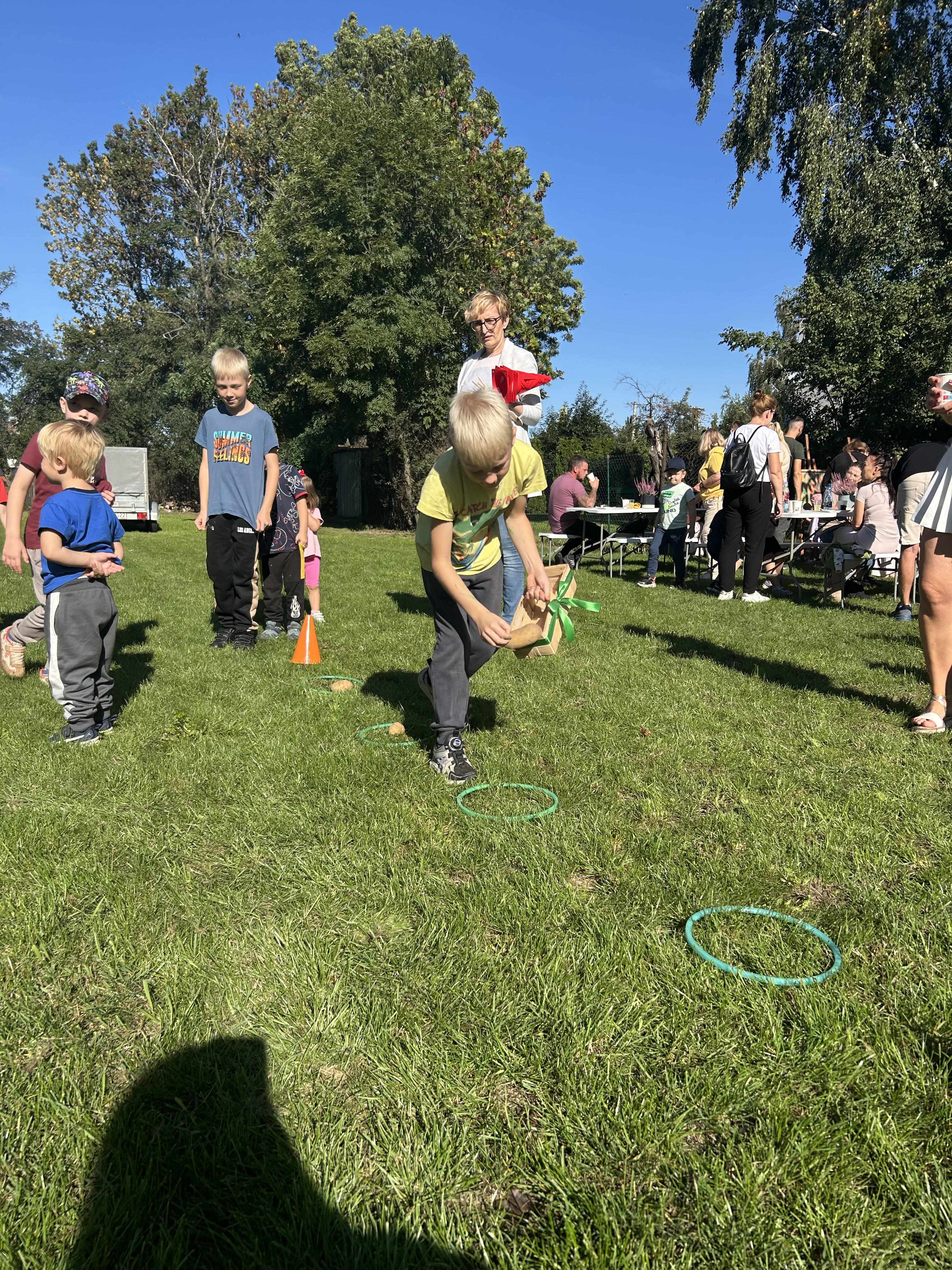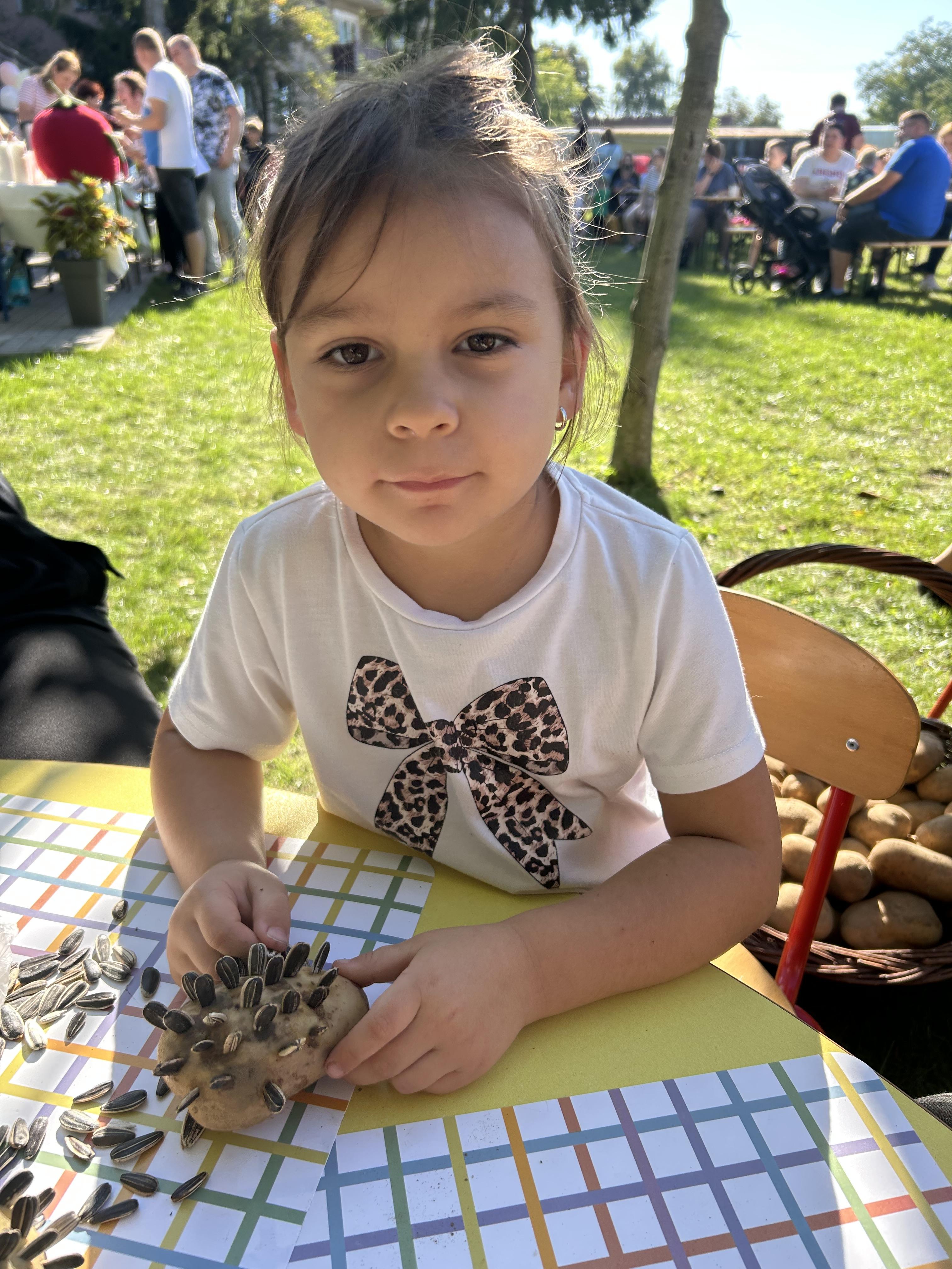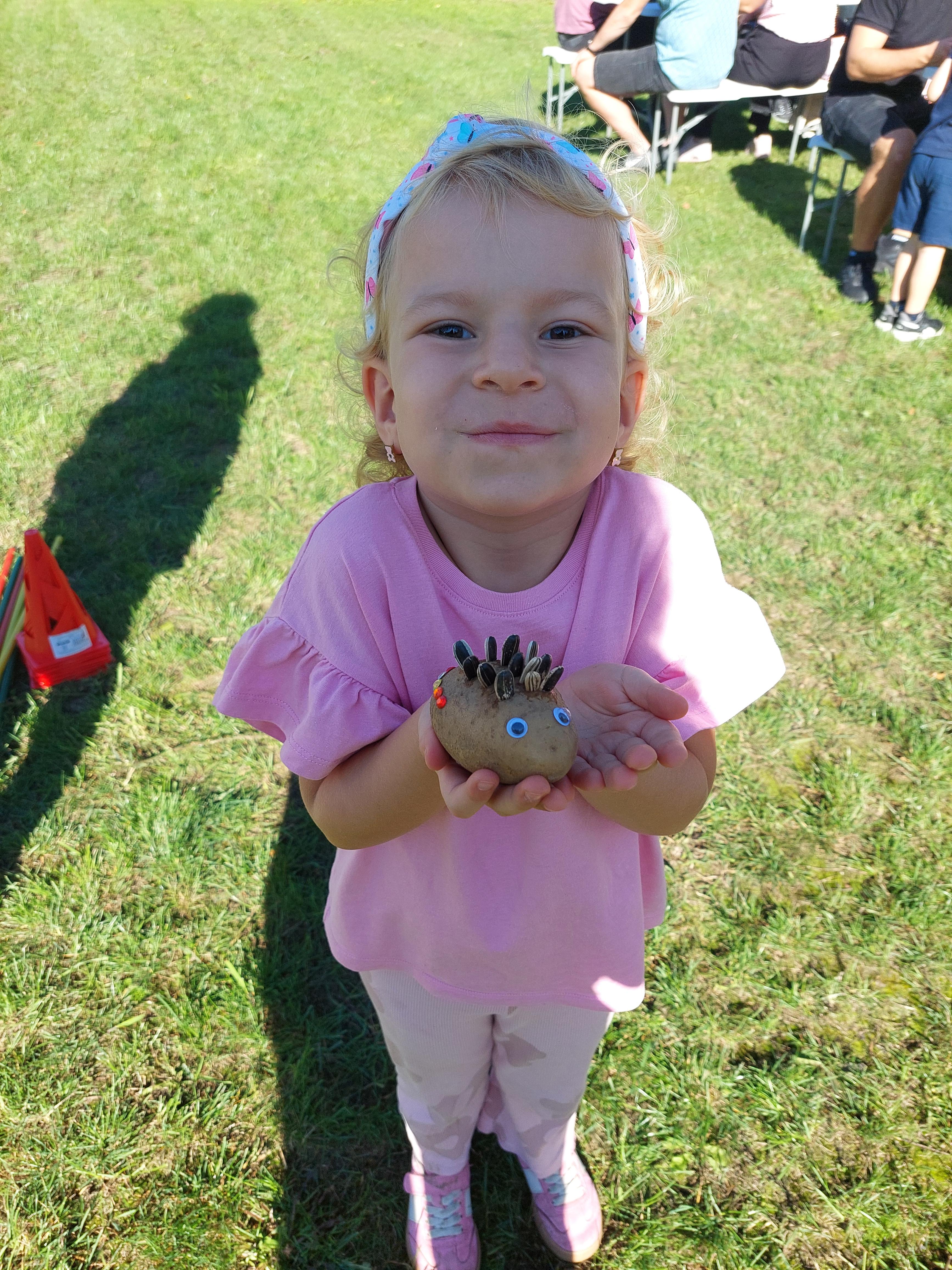 Wspólnie posadziliśmy drzewa, krzewy, zioła i kwiaty. Nie zabrakło też zabaw z głównym bohaterem ziemniakiem- Pyrkiem. Wielką atrakcją okazał się również radiowóz z KPP w Gostyniu, do którego dzieci z chęcią wchodziły i oglądały jego wyposażenie. W trakcie pikniku powstały śmieszne ziemniaczane jeżyki oraz cudowny obraz z pieczątek. Nasi milusińscy wraz ze swoimi rodzinami brali udział w wielu konkurencjach sportowych. Dla nikogo nie zabrakło pysznej zupy pomidoriwej, pieczonych ziemniaczków, lemoniady i ciasta.