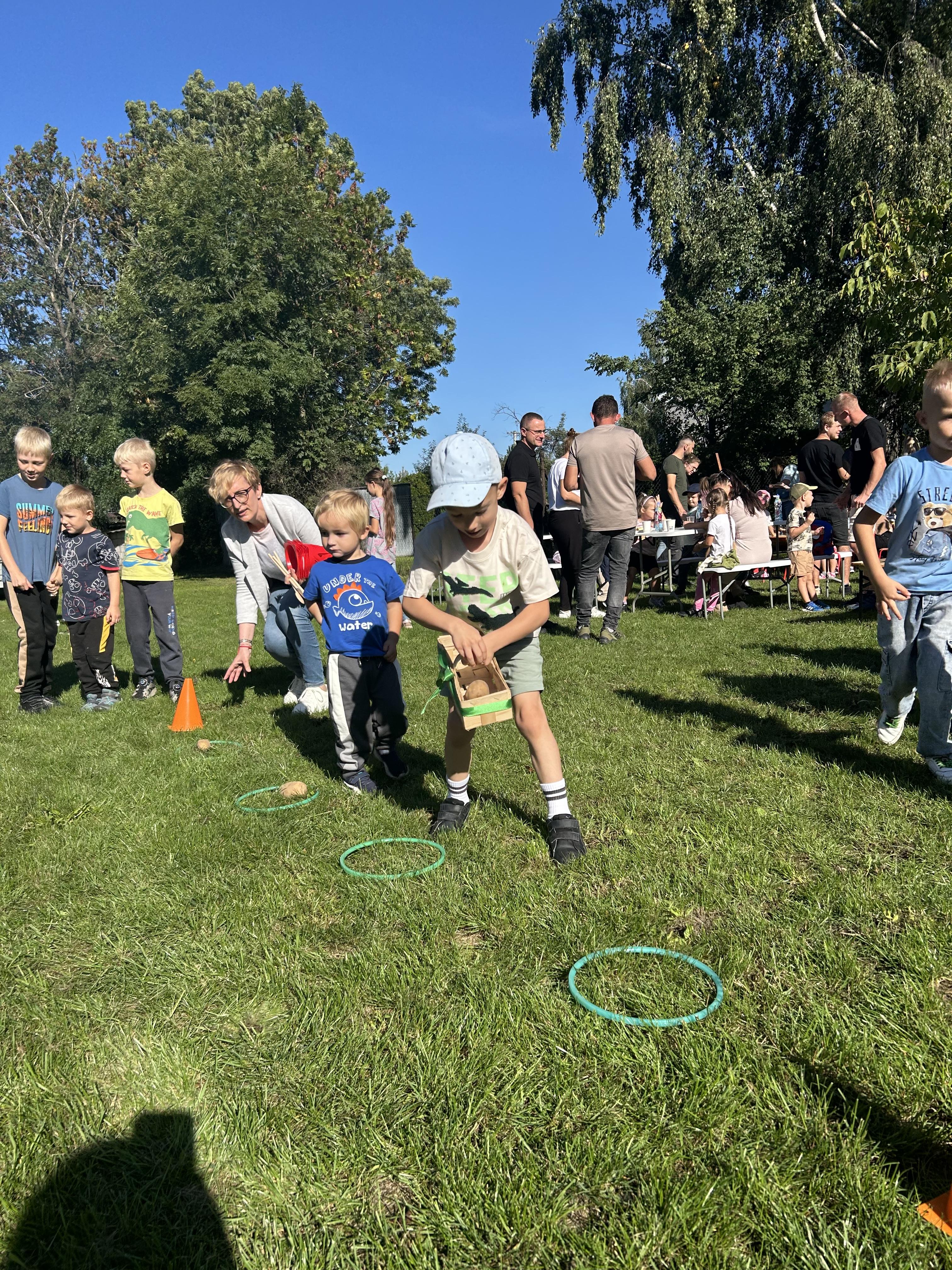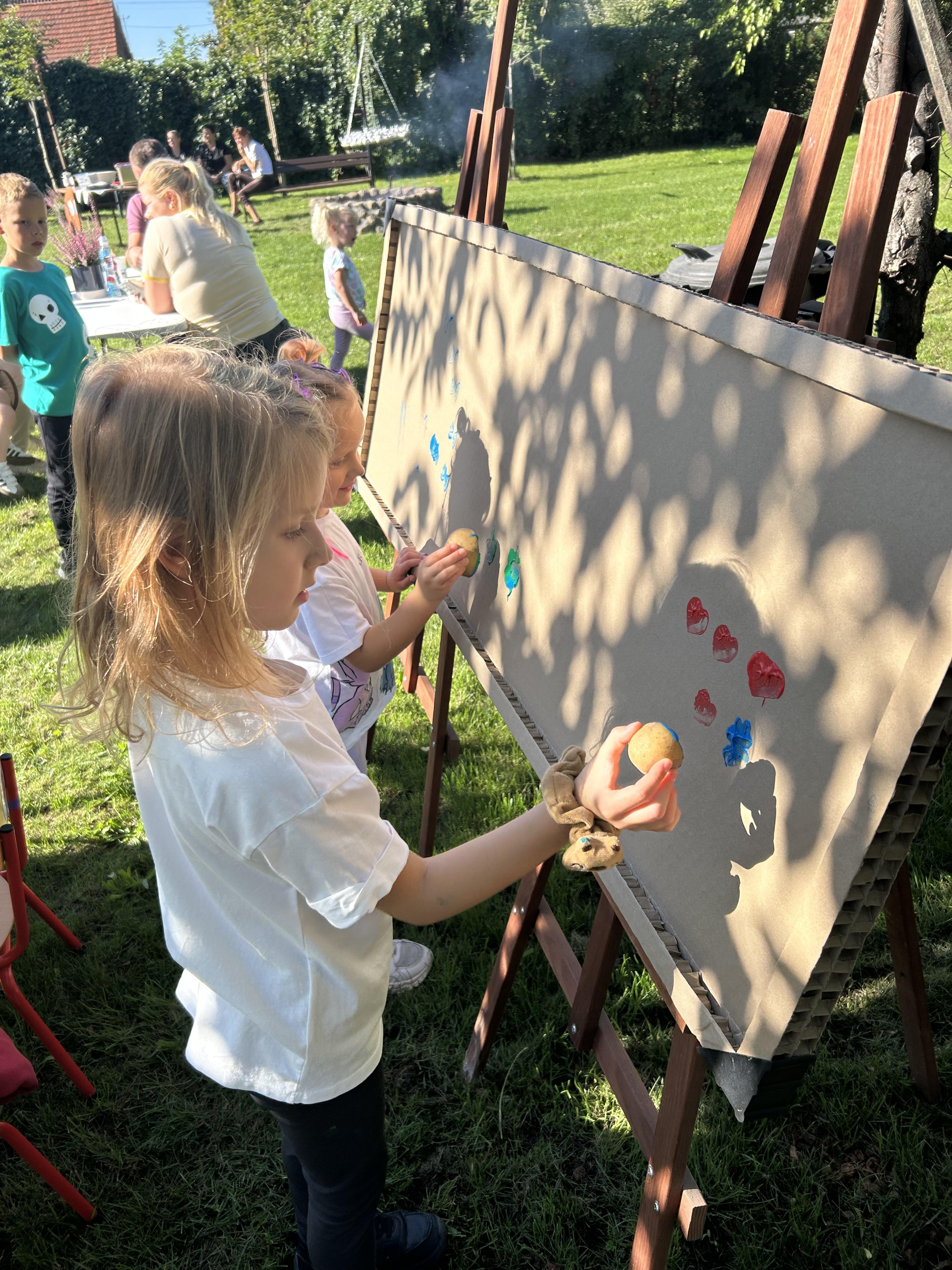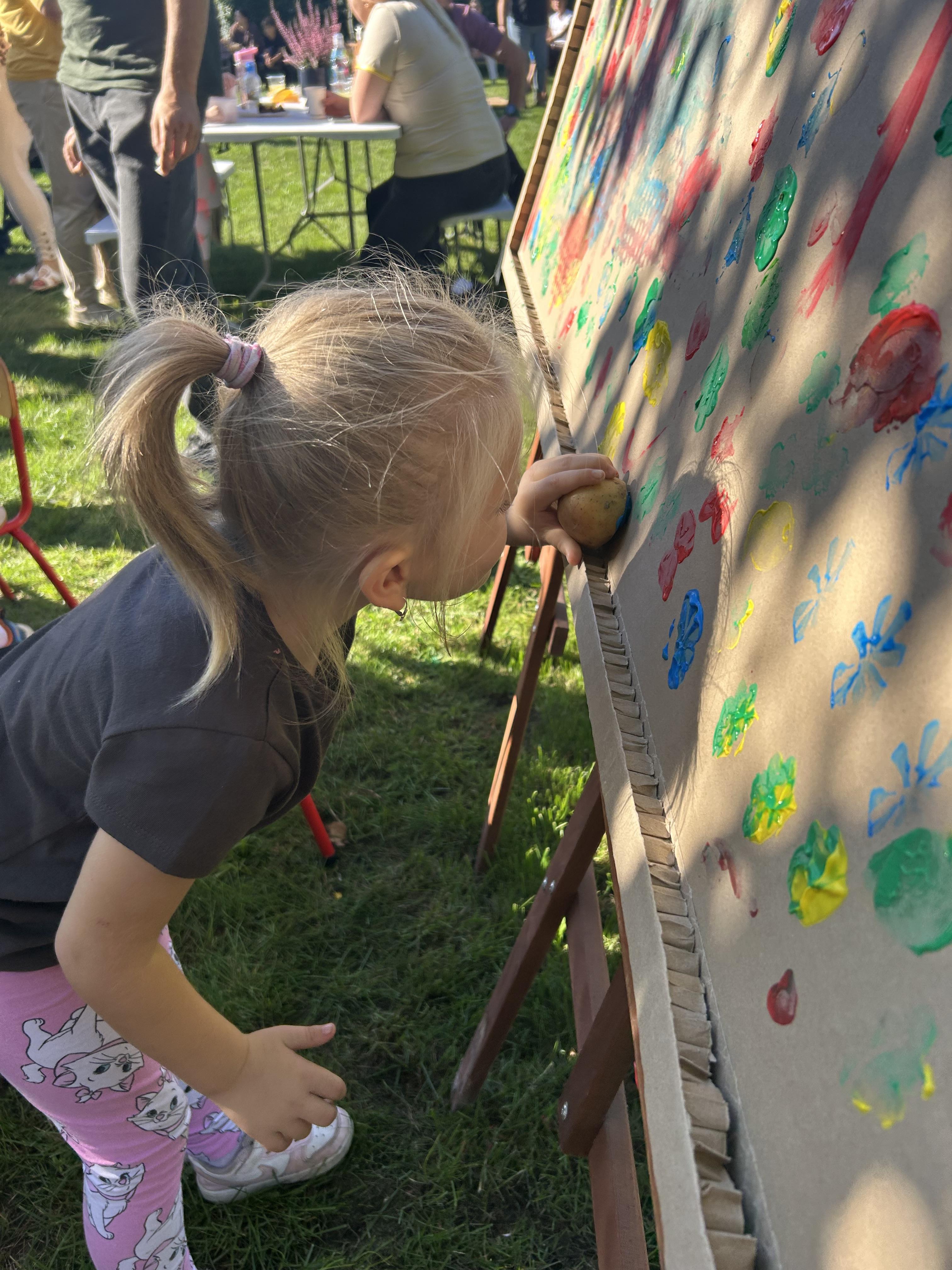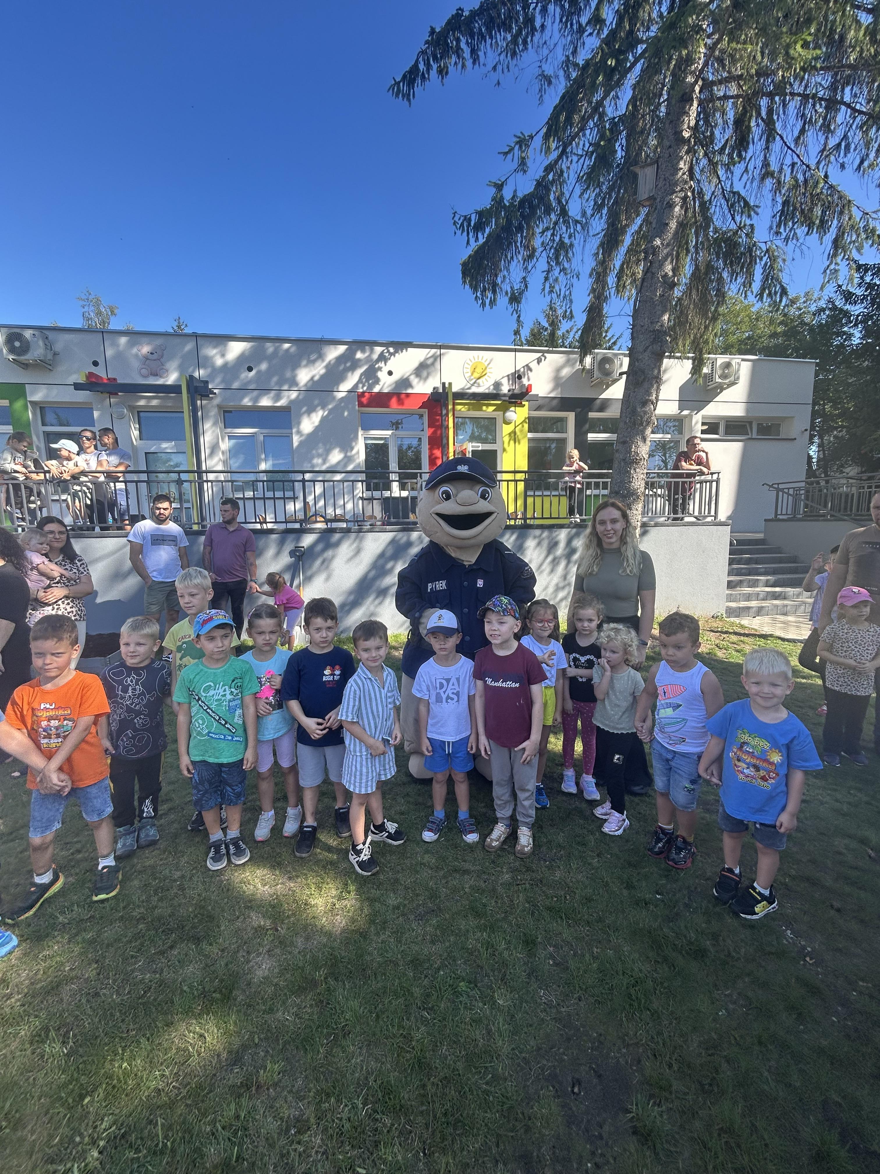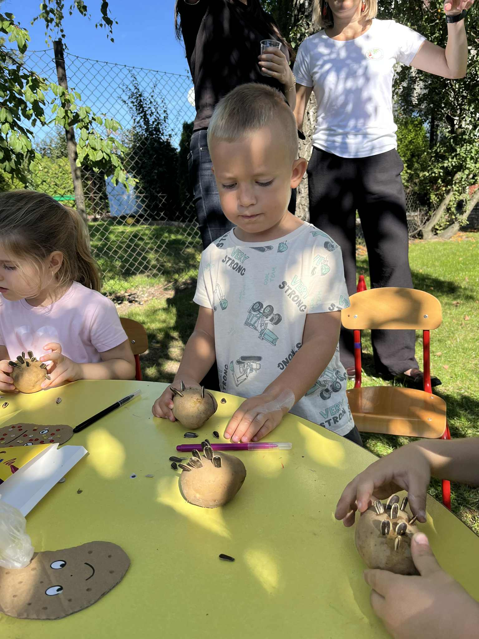 Wspólnie posadziliśmy drzewa, krzewy, zioła i kwiaty. Nie zabrakło też zabaw z głównym bohaterem ziemniakiem- Pyrkiem. Wielką atrakcją okazał się również radiowóz z KPP w Gostyniu, do którego dzieci z chęcią wchodziły i oglądały jego wyposażenie. W trakcie pikniku powstały śmieszne ziemniaczane jeżyki oraz cudowny obraz z pieczątek. Nasi milusińscy wraz ze swoimi rodzinami brali udział w wielu konkurencjach sportowych. Dla nikogo nie zabrakło pysznej zupy pomidoriwej, pieczonych ziemniaczków, lemoniady i ciasta.