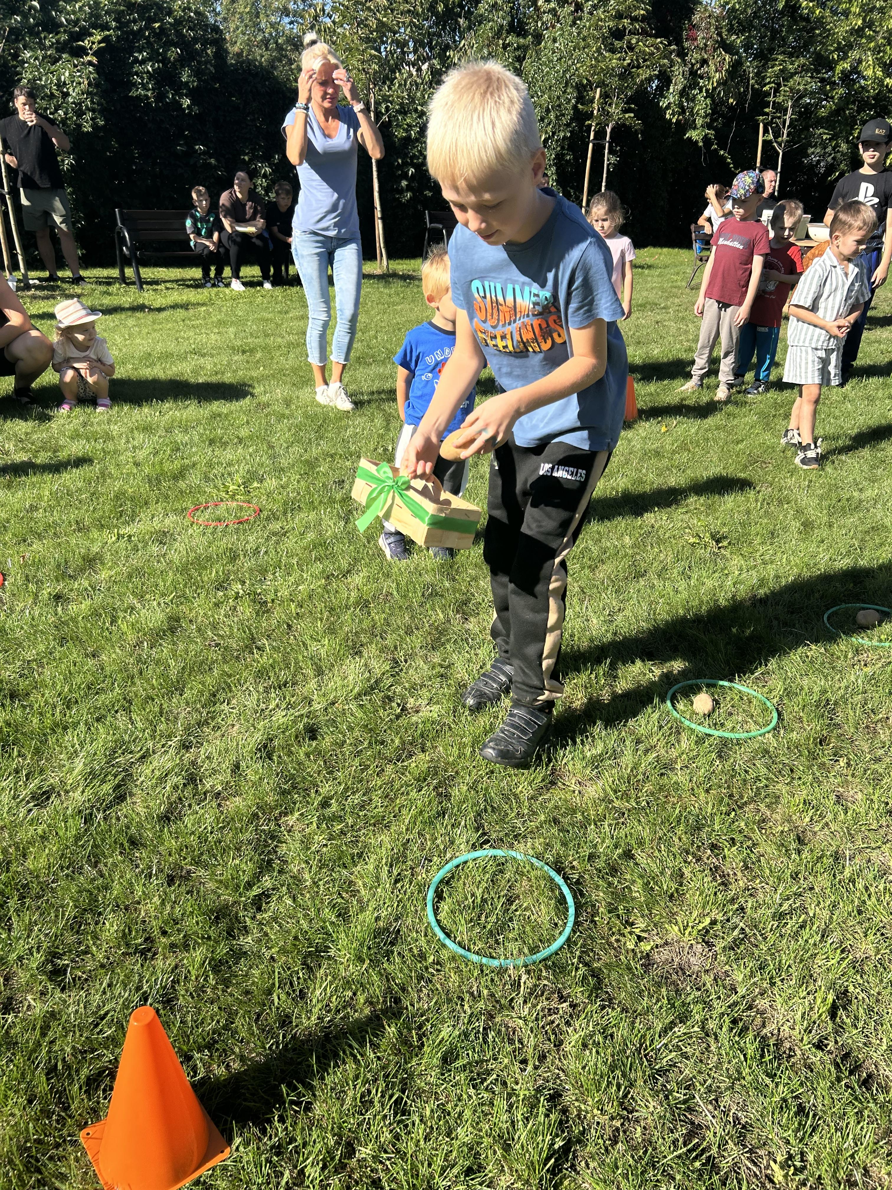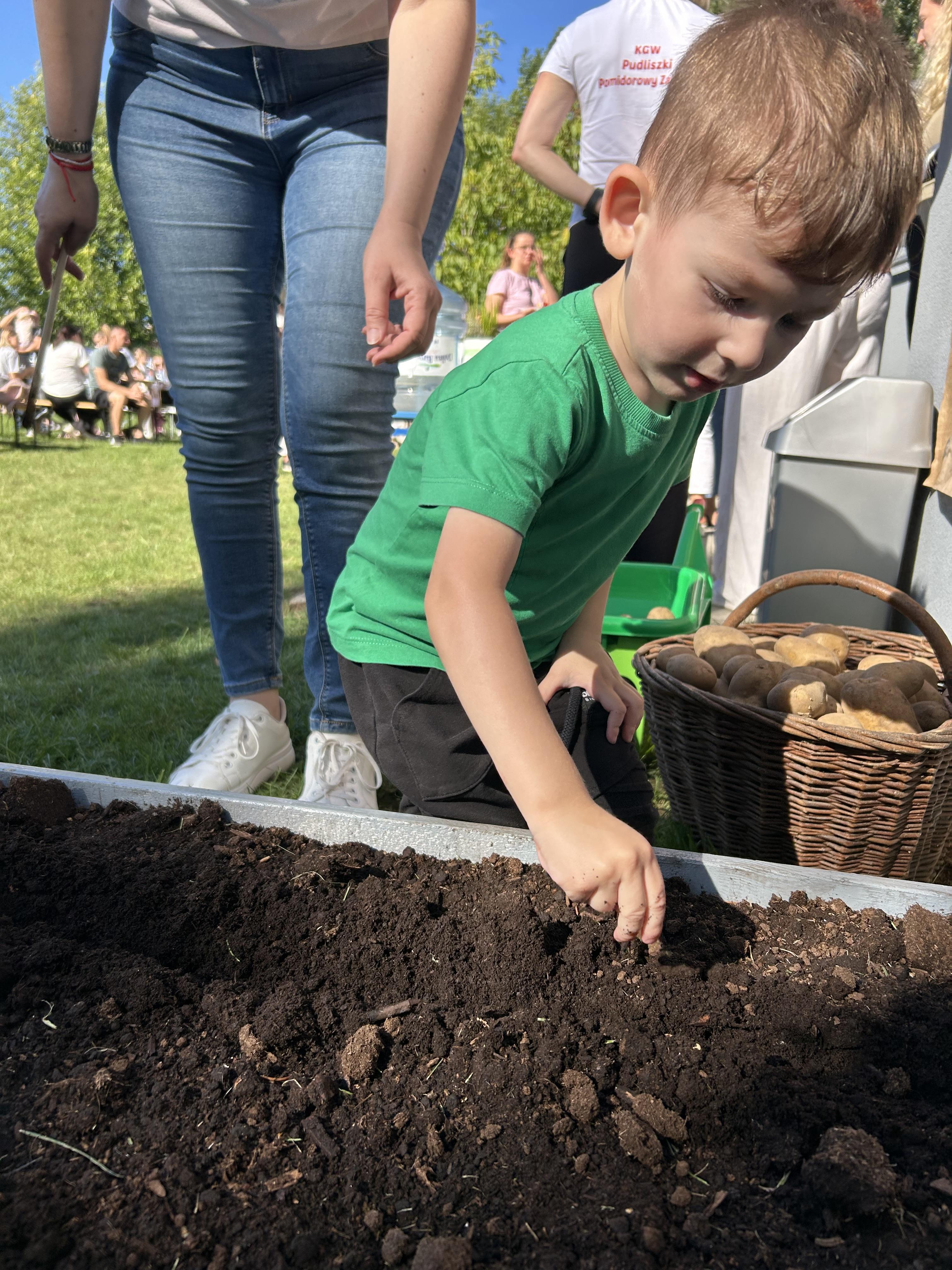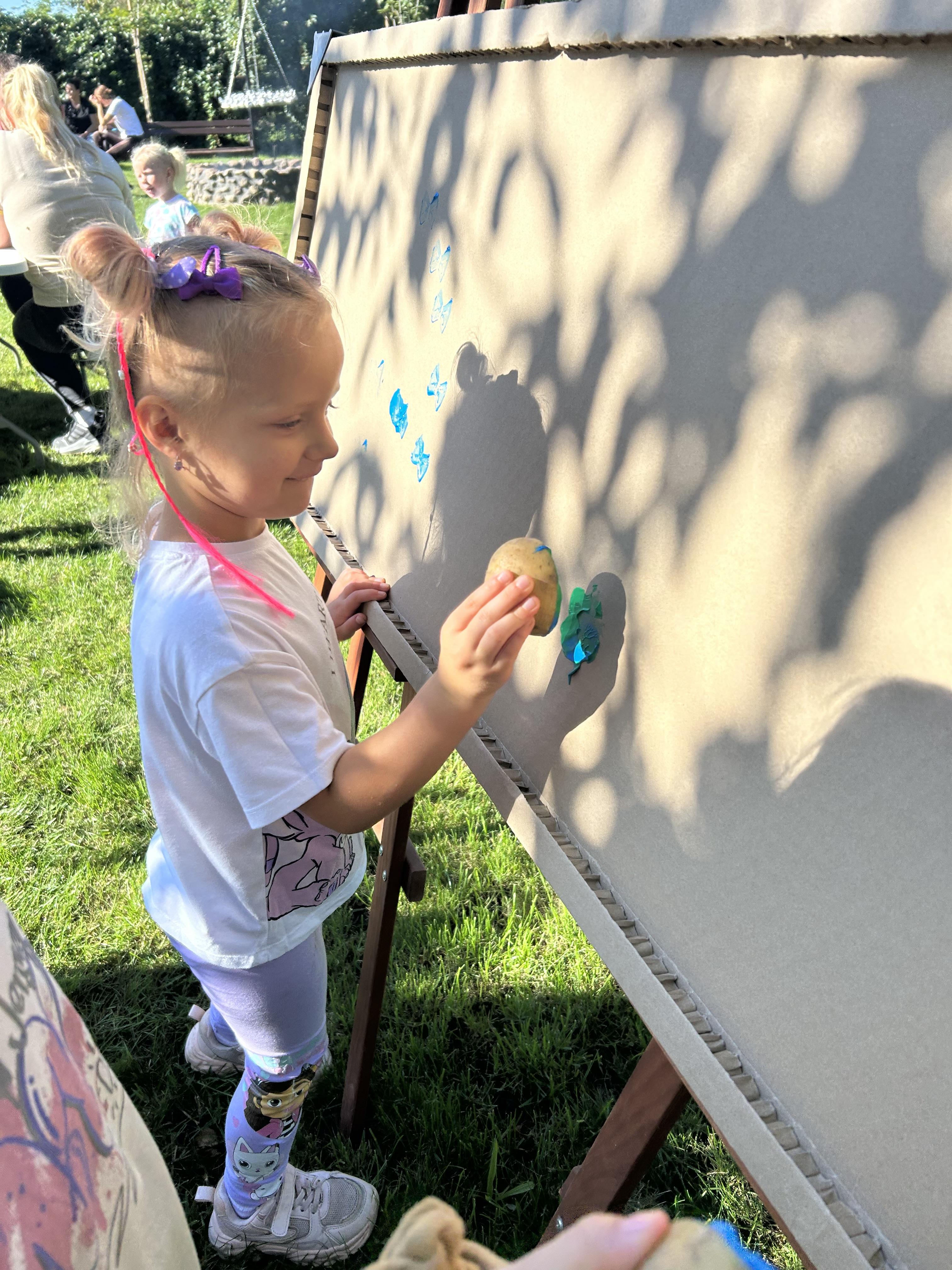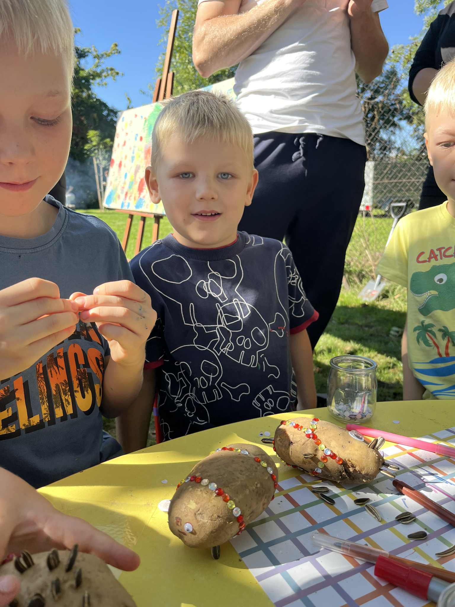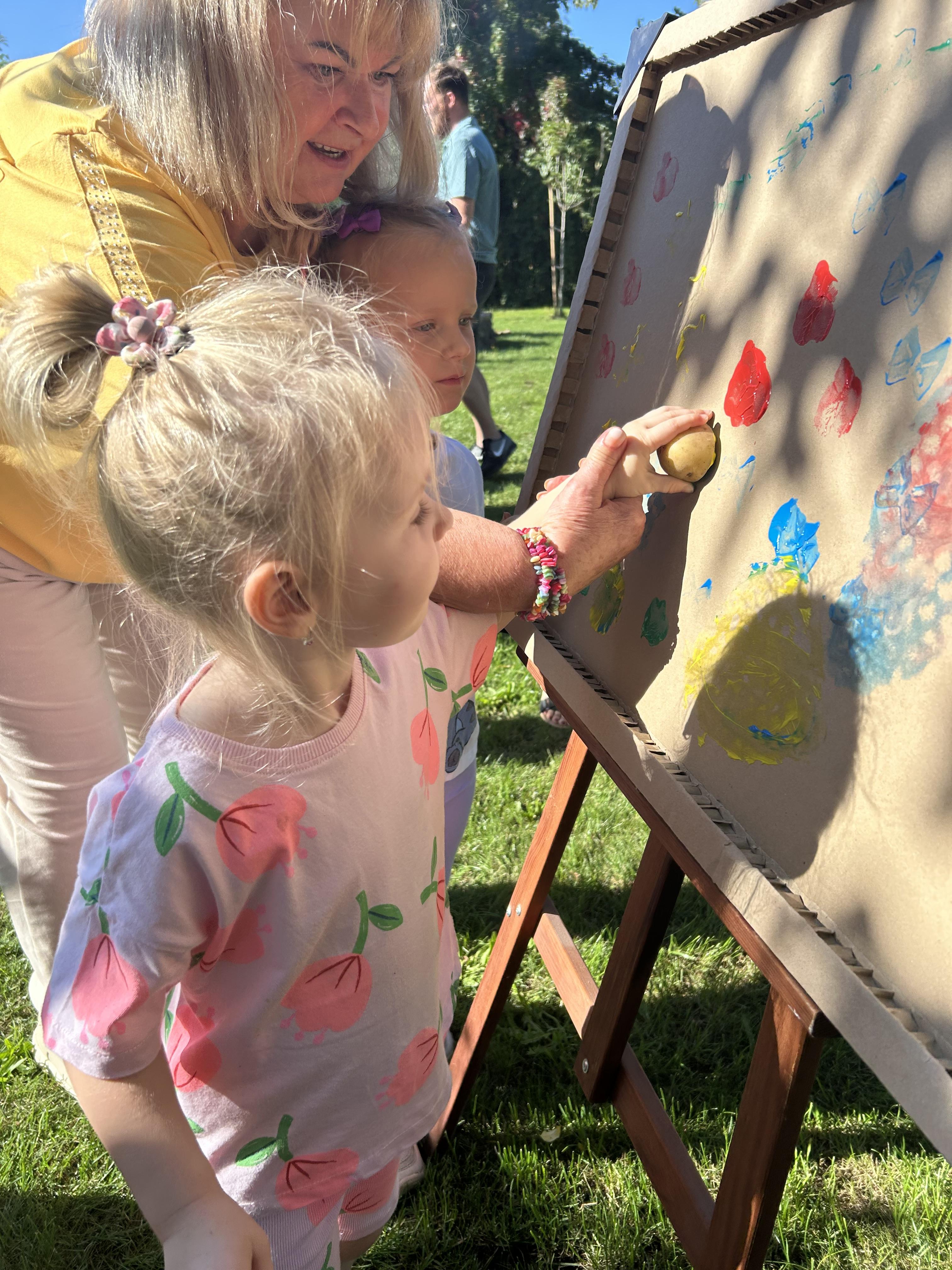 Wspólnie posadziliśmy drzewa, krzewy, zioła i kwiaty. Nie zabrakło też zabaw z głównym bohaterem ziemniakiem- Pyrkiem. Wielką atrakcją okazał się również radiowóz z KPP w Gostyniu, do którego dzieci z chęcią wchodziły i oglądały jego wyposażenie. W trakcie pikniku powstały śmieszne ziemniaczane jeżyki oraz cudowny obraz z pieczątek. Nasi milusińscy wraz ze swoimi rodzinami brali udział w wielu konkurencjach sportowych. Dla nikogo nie zabrakło pysznej zupy pomidoriwej, pieczonych ziemniaczków, lemoniady i ciasta.