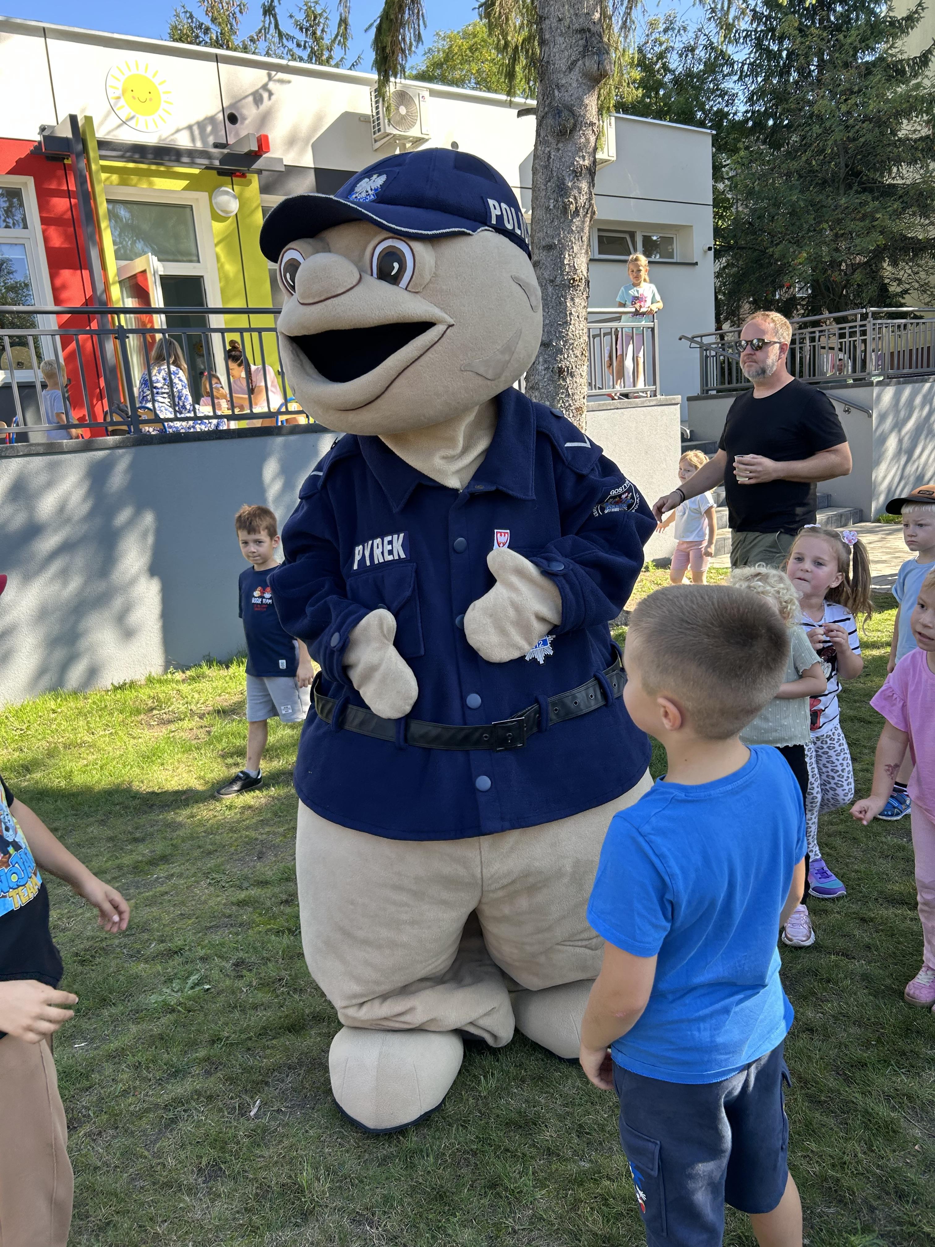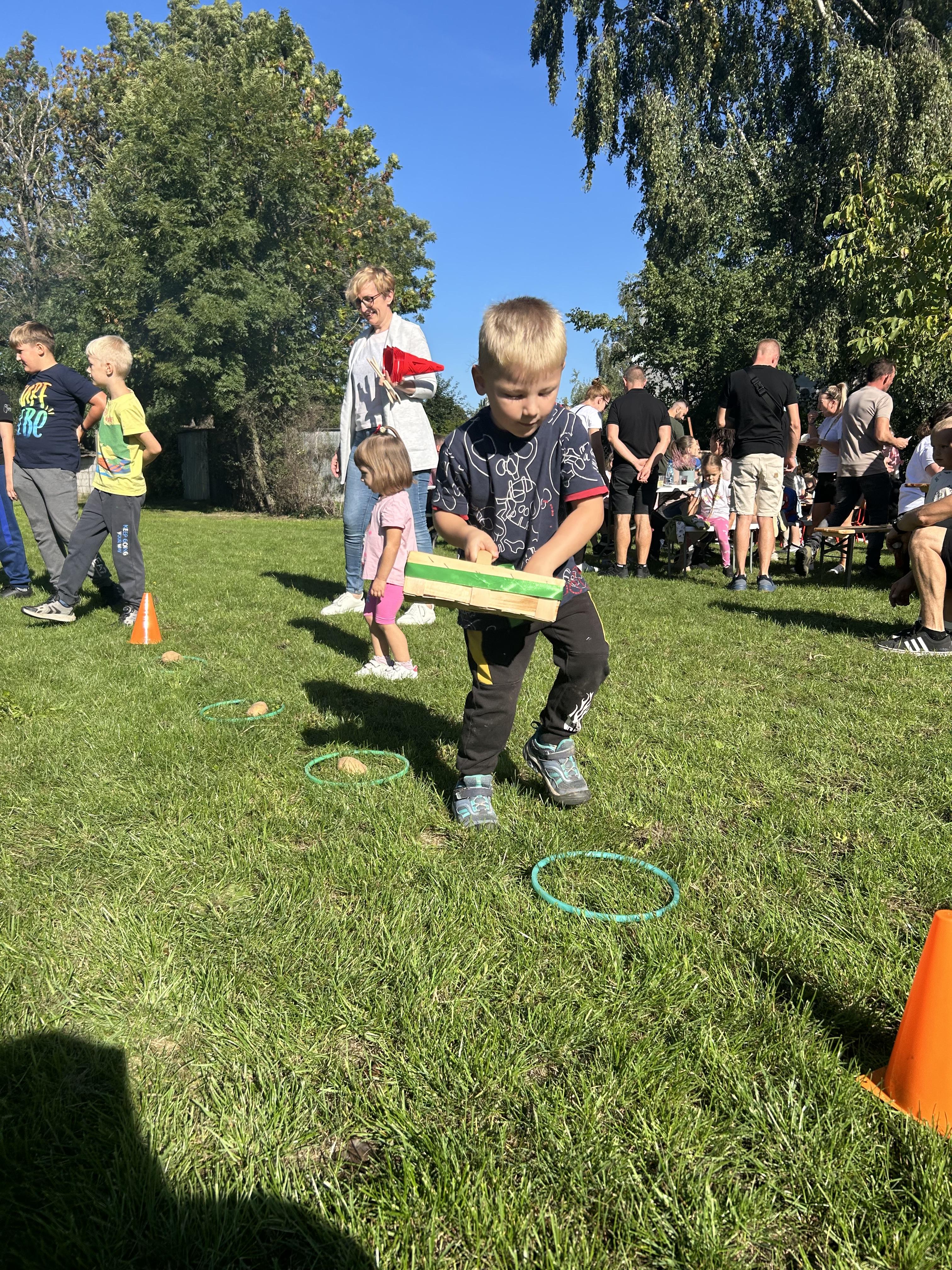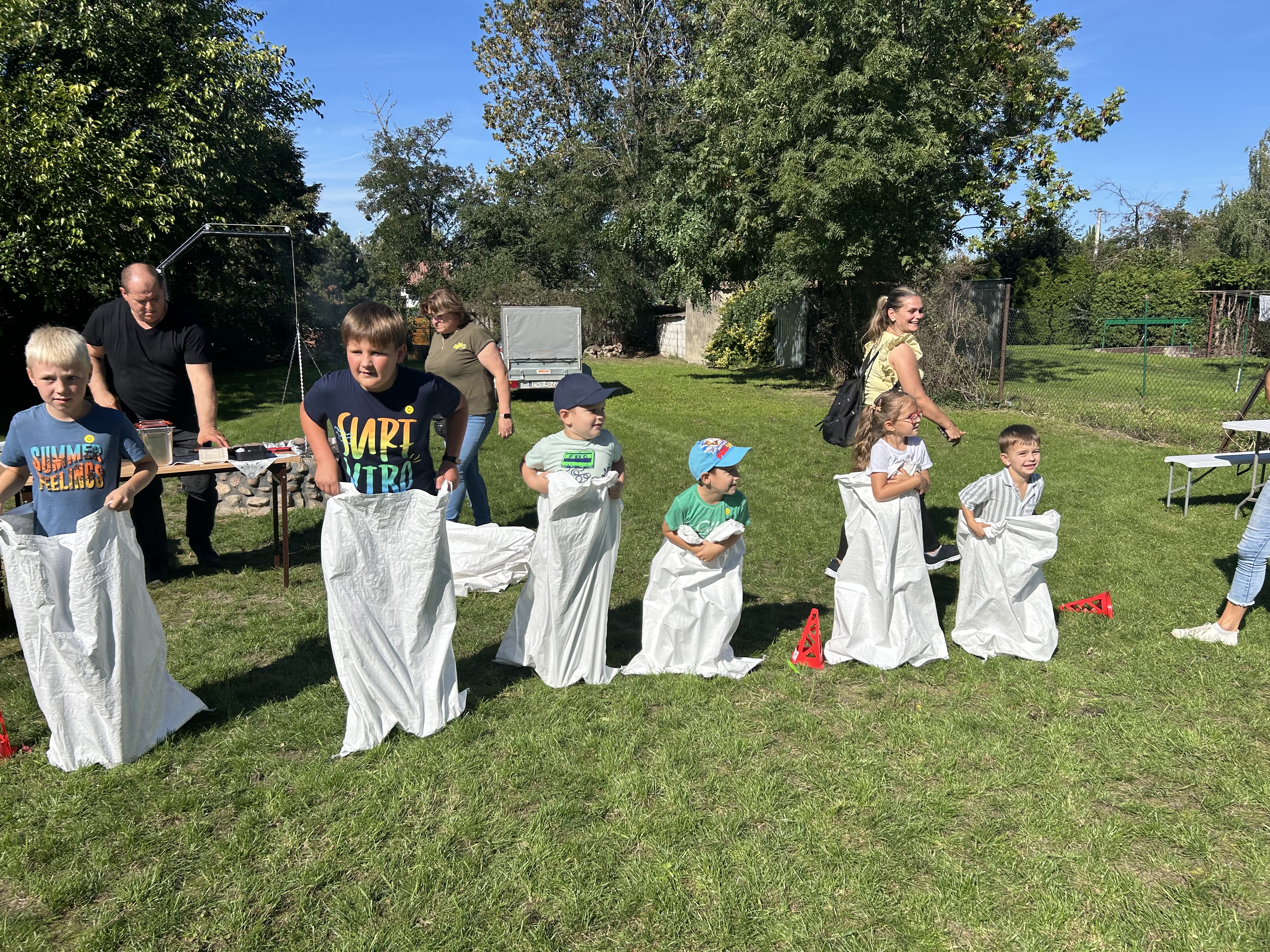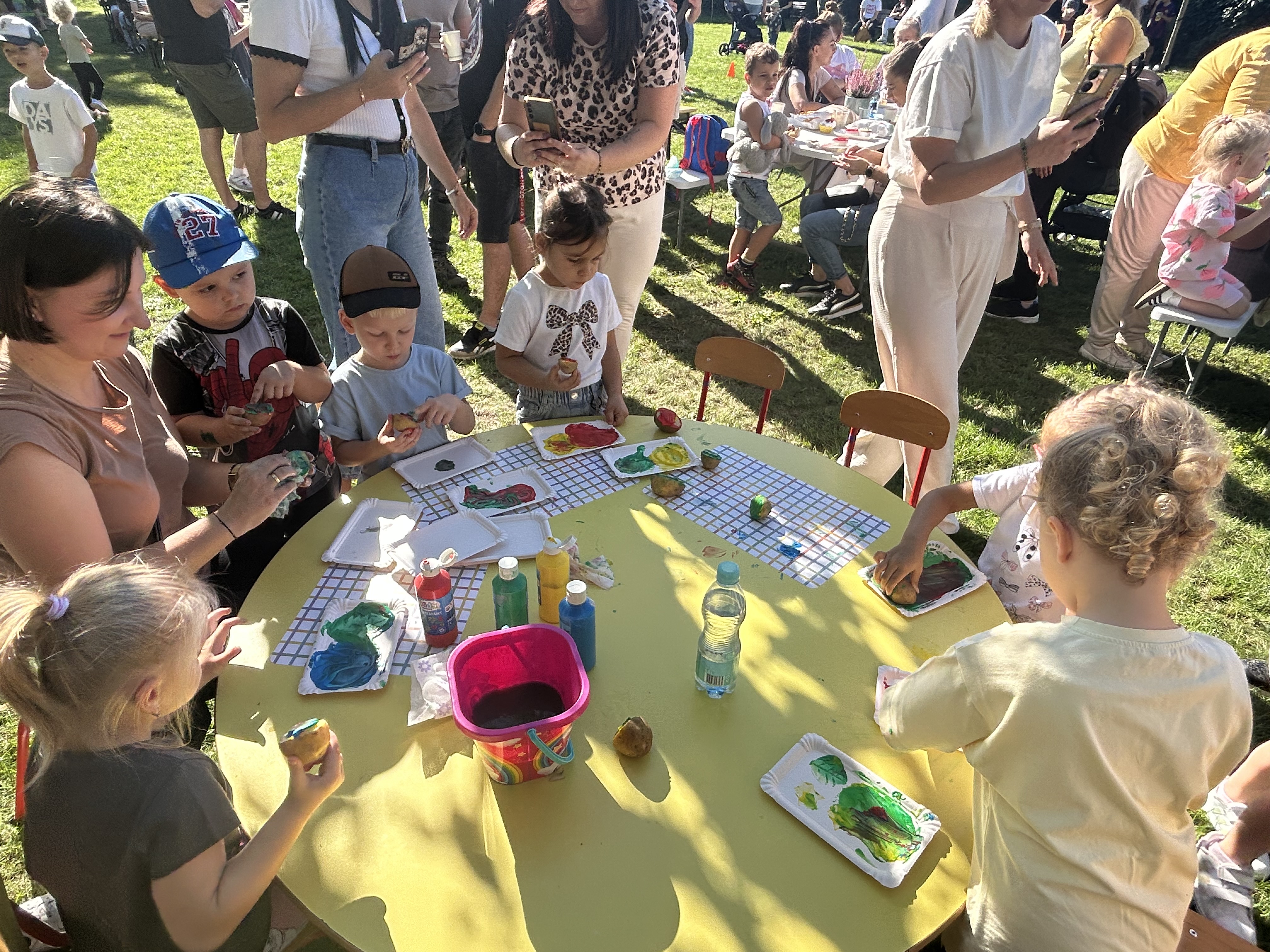 Wspólnie posadziliśmy drzewa, krzewy, zioła i kwiaty. Nie zabrakło też zabaw z głównym bohaterem ziemniakiem- Pyrkiem. Wielką atrakcją okazał się również radiowóz z KPP w Gostyniu, do którego dzieci z chęcią wchodziły i oglądały jego wyposażenie. W trakcie pikniku powstały śmieszne ziemniaczane jeżyki oraz cudowny obraz z pieczątek. Nasi milusińscy wraz ze swoimi rodzinami brali udział w wielu konkurencjach sportowych. Dla nikogo nie zabrakło pysznej zupy pomidoriwej, pieczonych ziemniaczków, lemoniady i ciasta.
