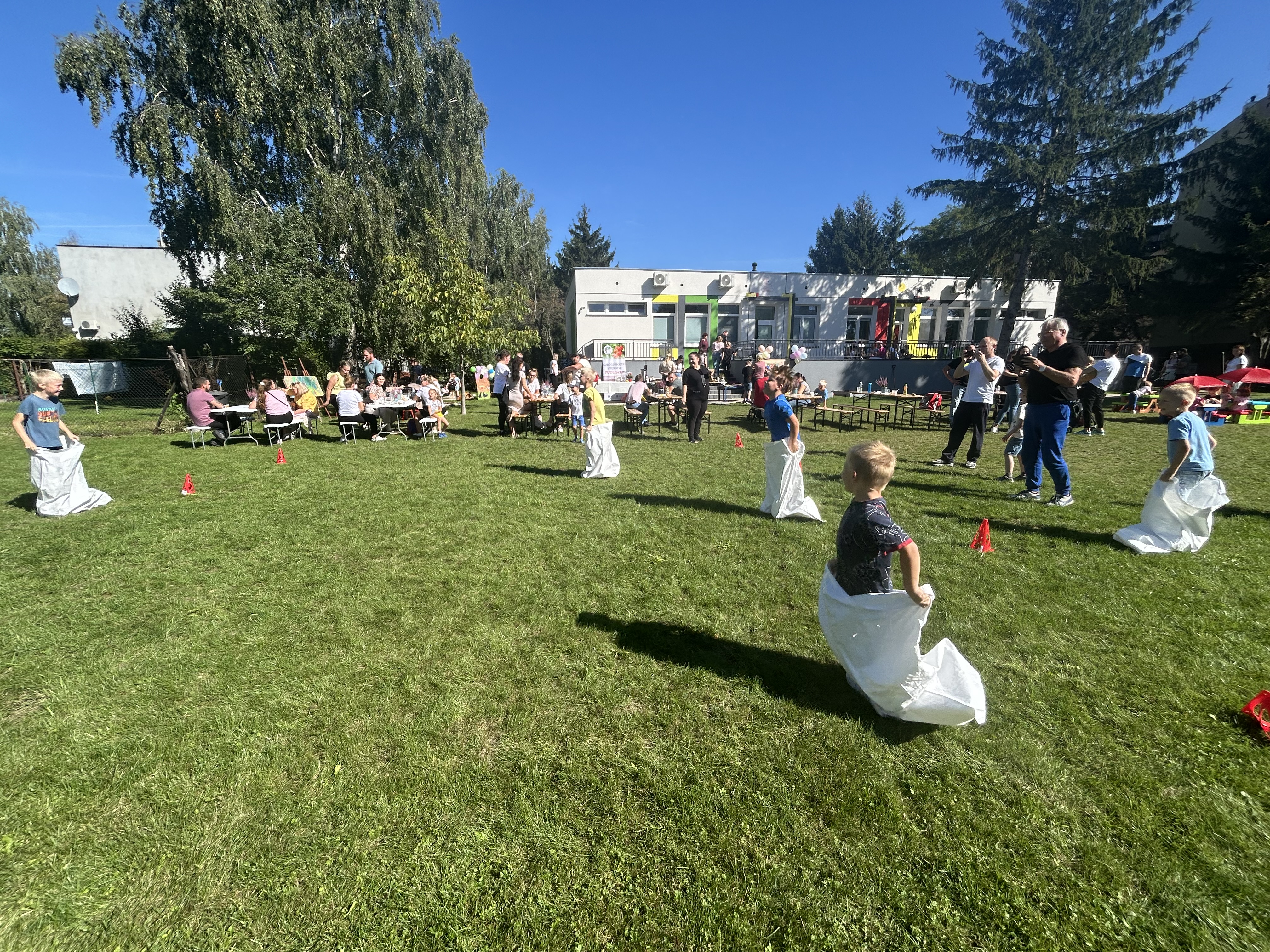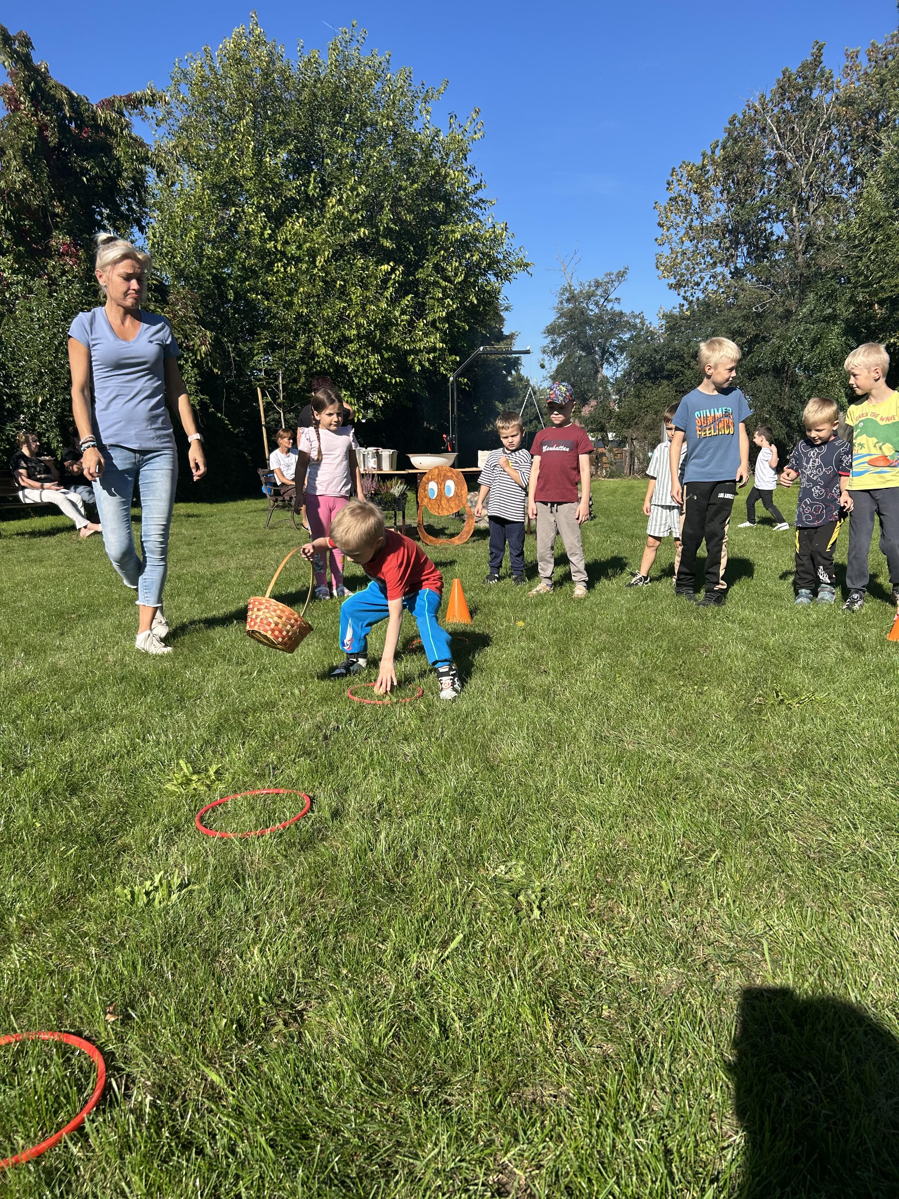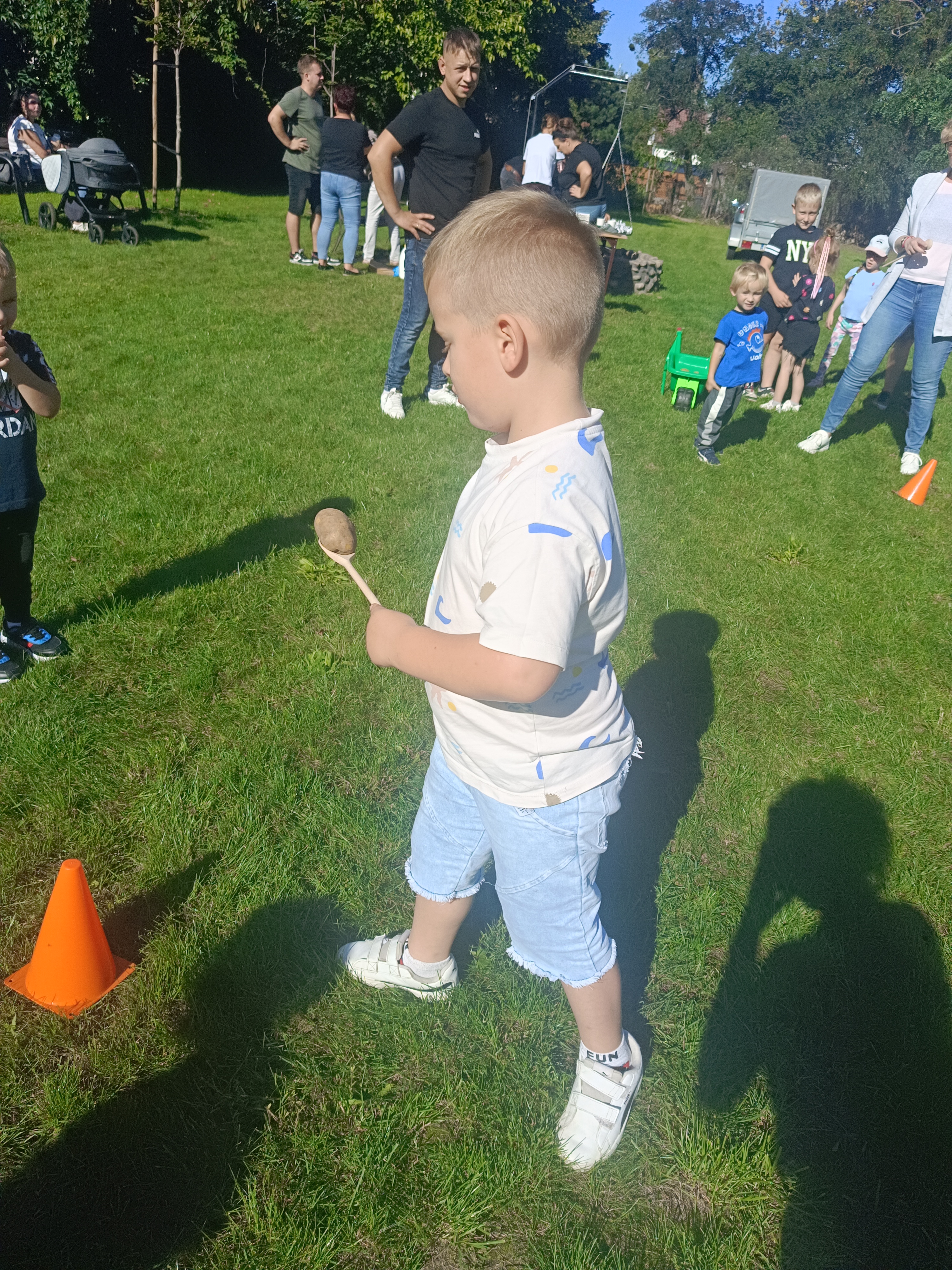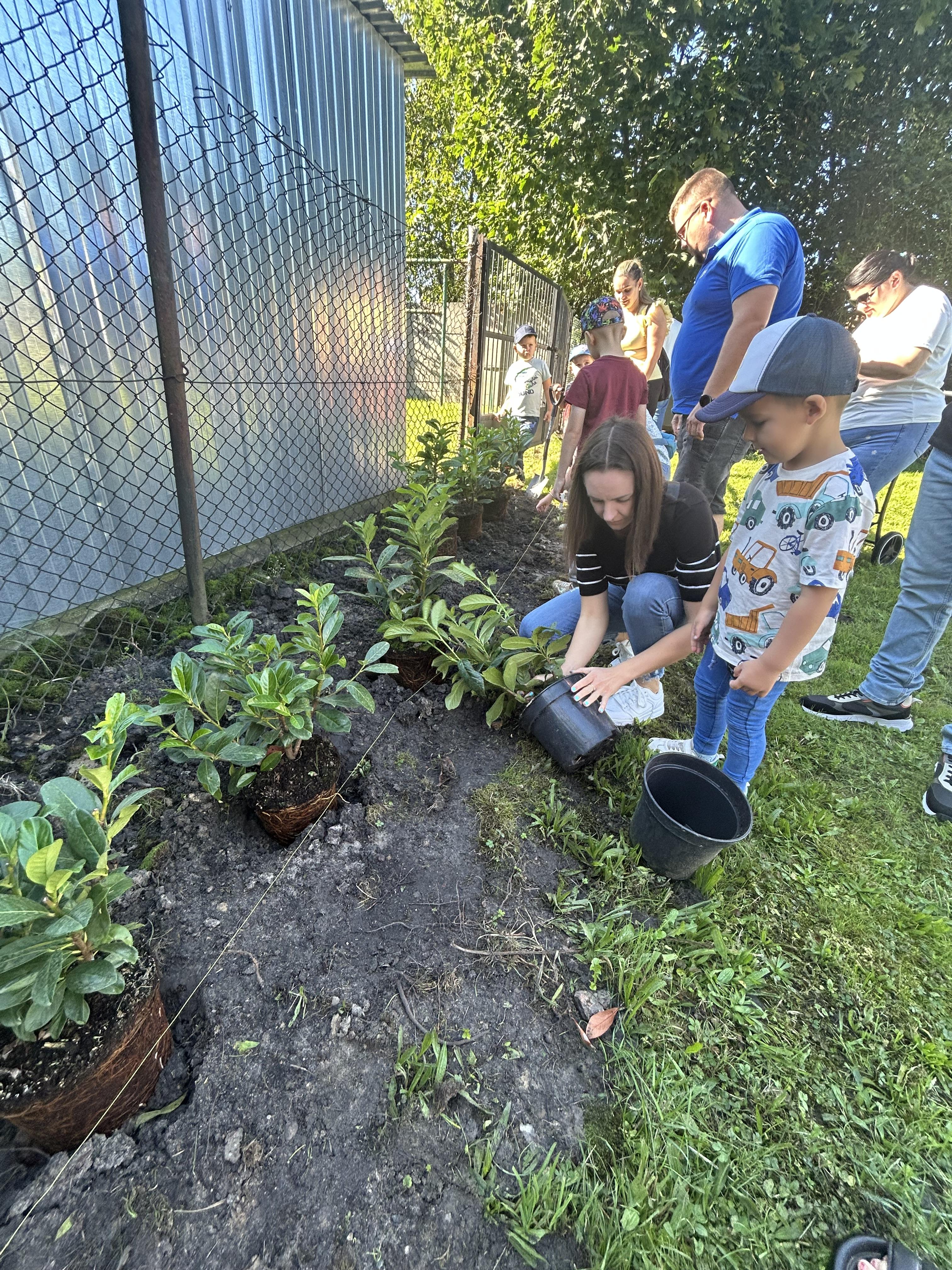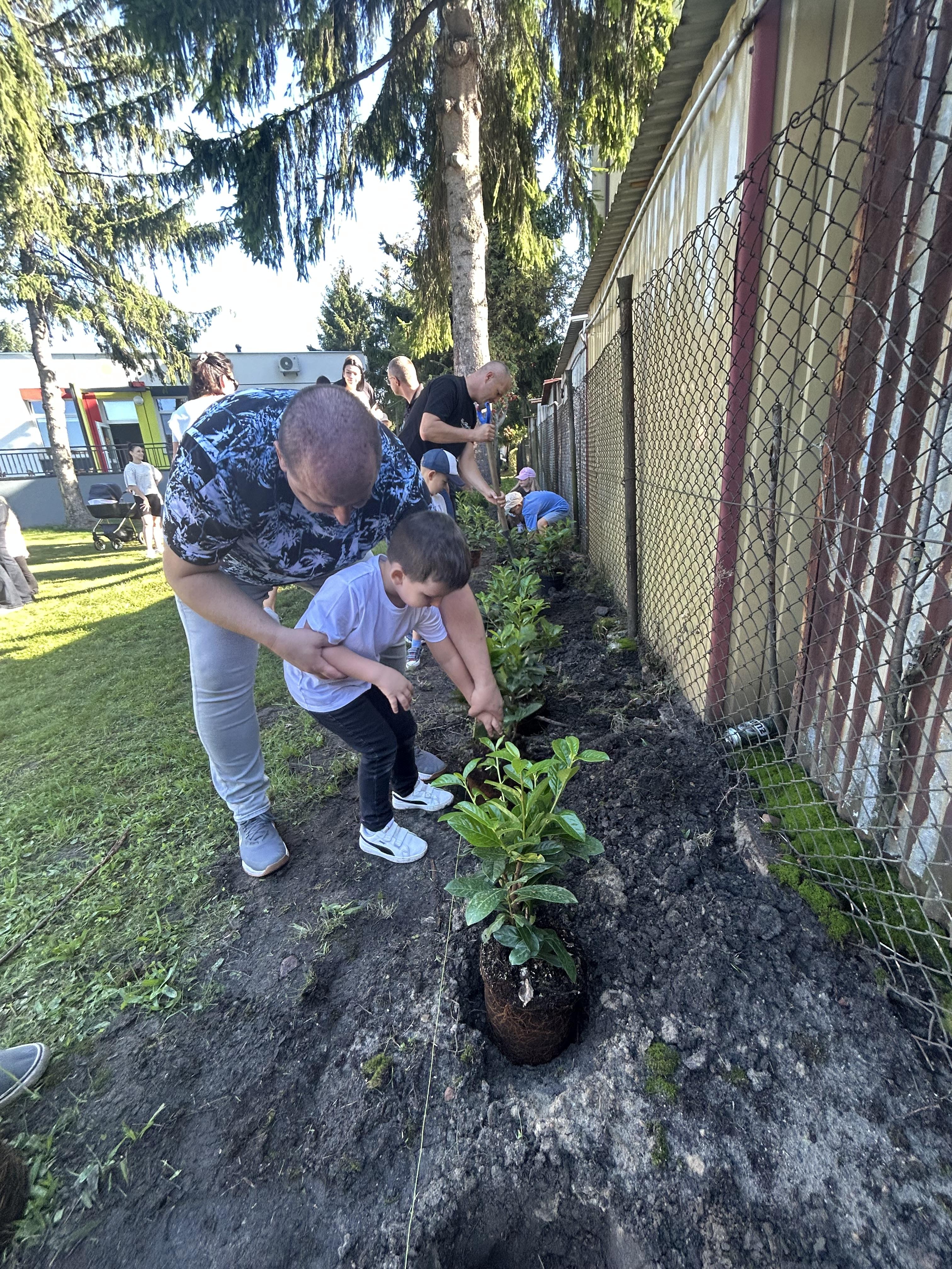 Wspólnie posadziliśmy drzewa, krzewy, zioła i kwiaty. Nie zabrakło też zabaw z głównym bohaterem ziemniakiem- Pyrkiem. Wielką atrakcją okazał się również radiowóz z KPP w Gostyniu, do którego dzieci z chęcią wchodziły i oglądały jego wyposażenie. W trakcie pikniku powstały śmieszne ziemniaczane jeżyki oraz cudowny obraz z pieczątek. Nasi milusińscy wraz ze swoimi rodzinami brali udział w wielu konkurencjach sportowych. Dla nikogo nie zabrakło pysznej zupy pomidoriwej, pieczonych ziemniaczków, lemoniady i ciasta.