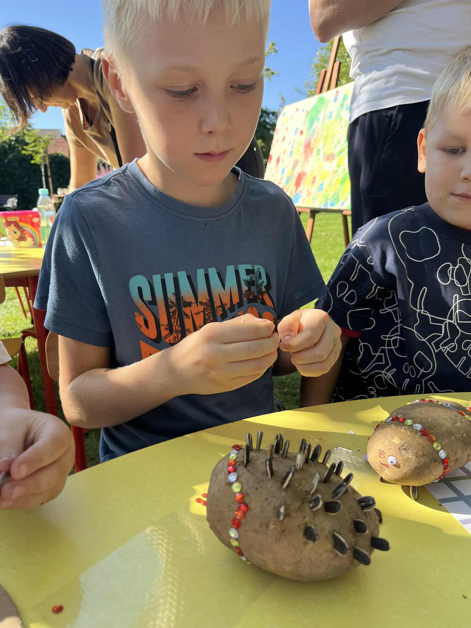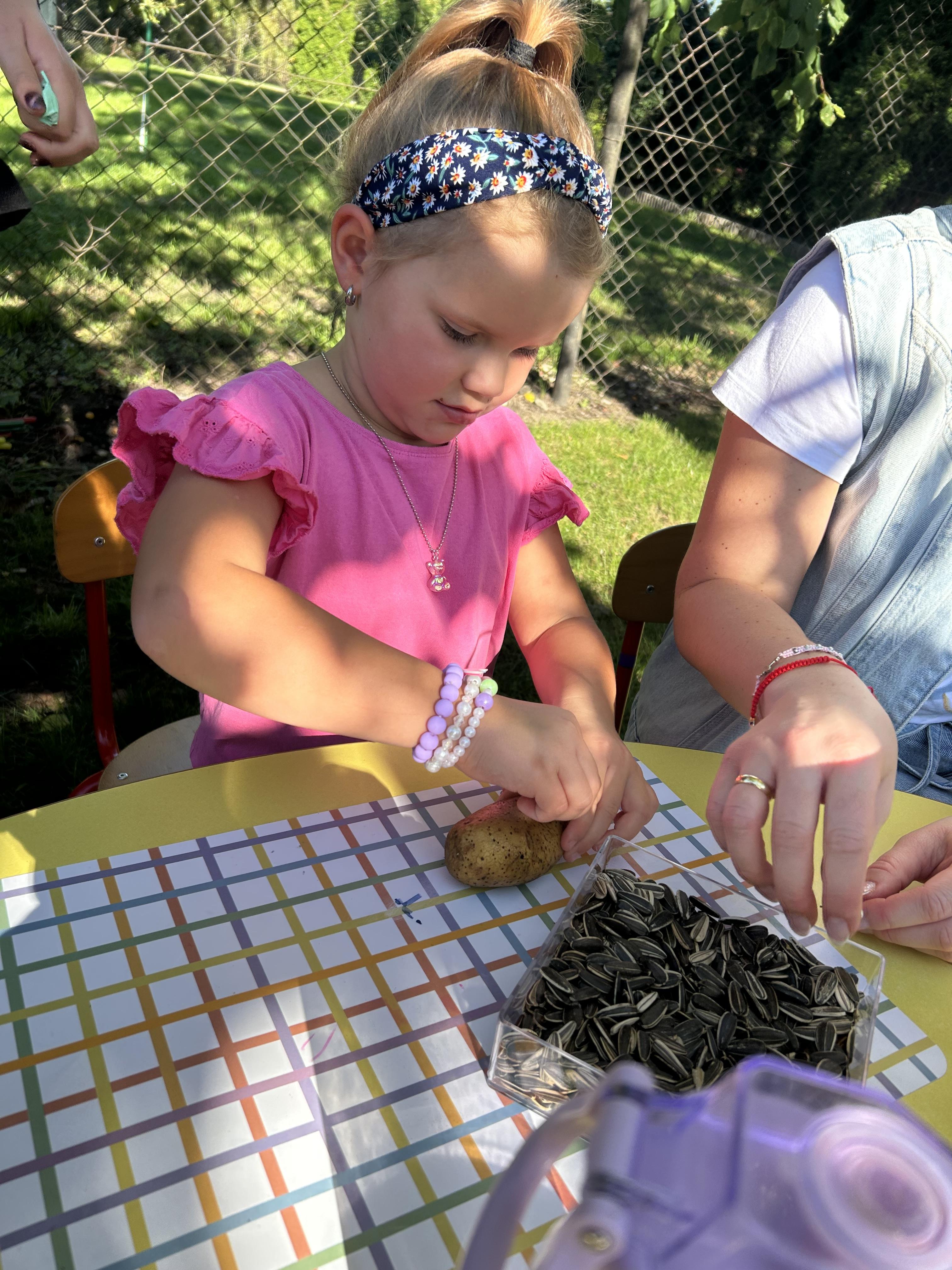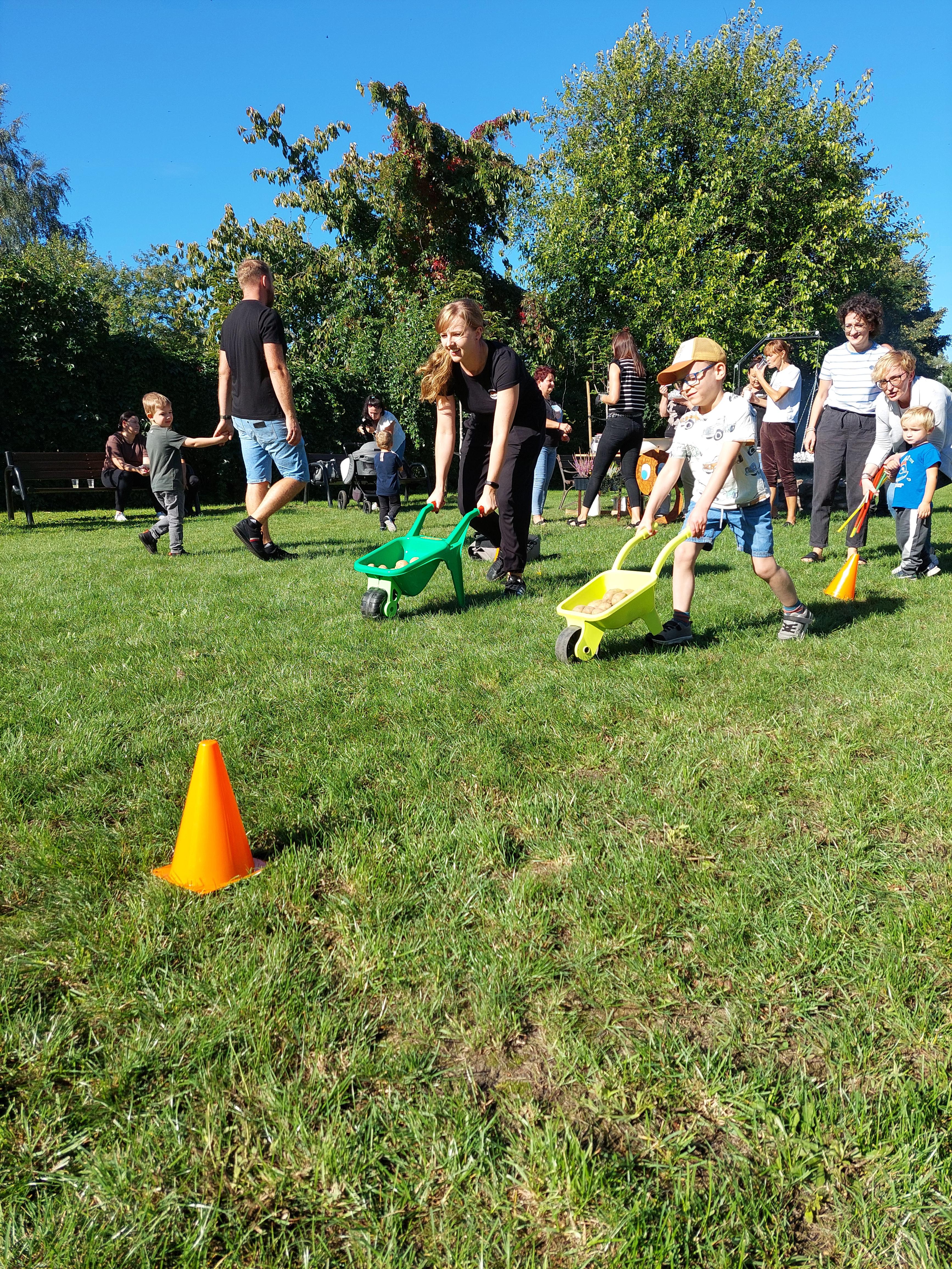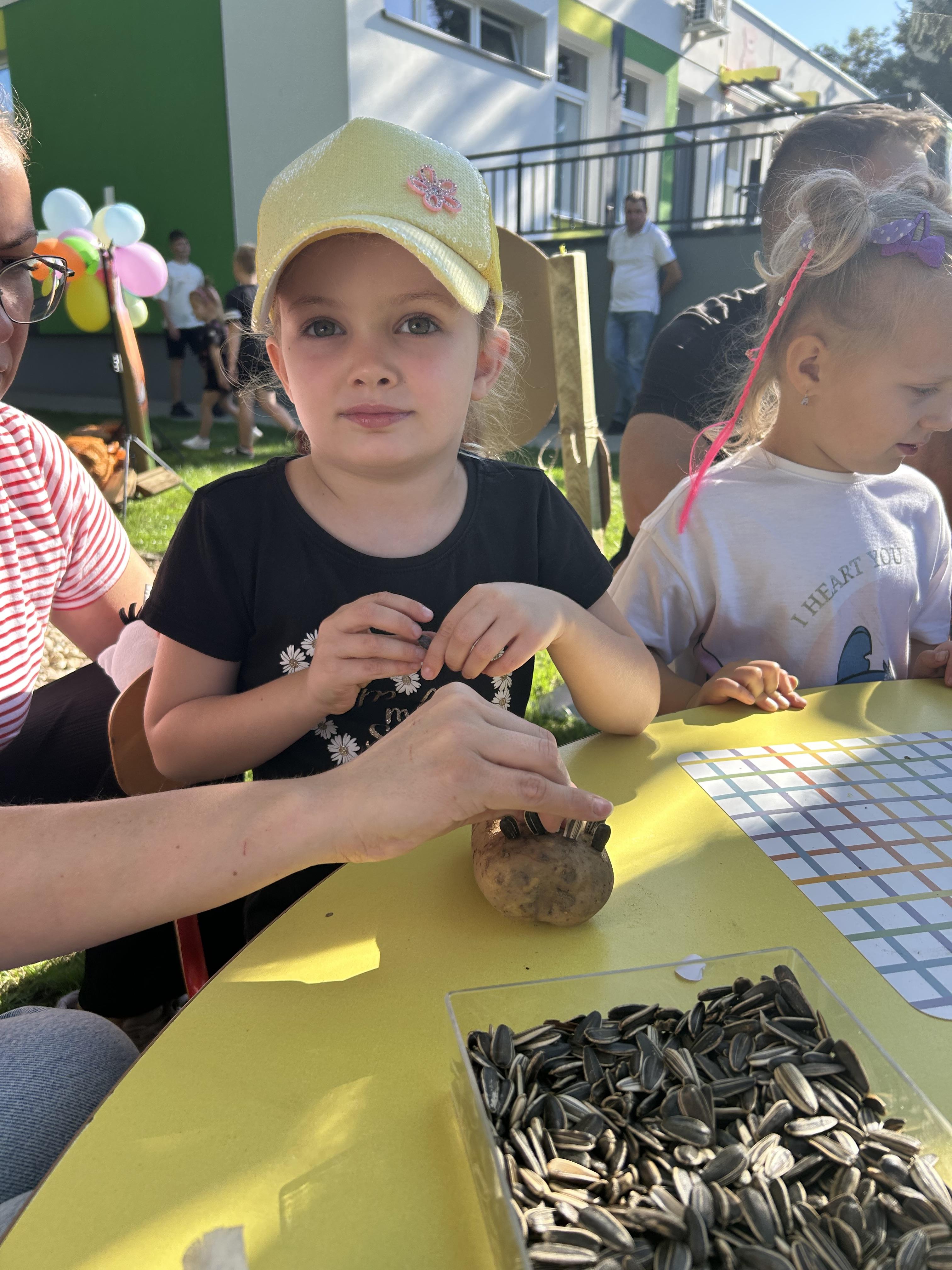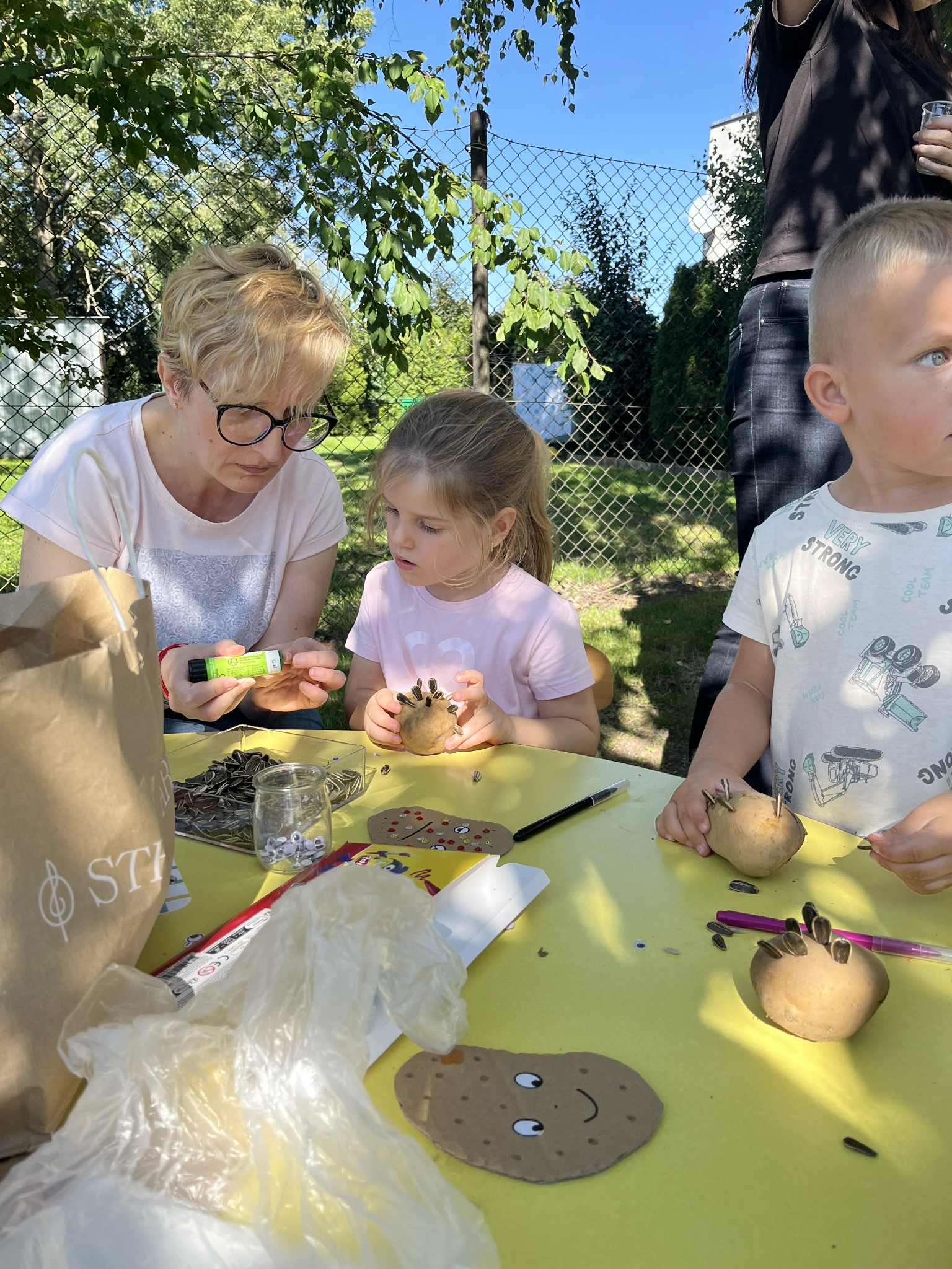 Wspólnie posadziliśmy drzewa, krzewy, zioła i kwiaty. Nie zabrakło też zabaw z głównym bohaterem ziemniakiem- Pyrkiem. Wielką atrakcją okazał się również radiowóz z KPP w Gostyniu, do którego dzieci z chęcią wchodziły i oglądały jego wyposażenie. W trakcie pikniku powstały śmieszne ziemniaczane jeżyki oraz cudowny obraz z pieczątek. Nasi milusińscy wraz ze swoimi rodzinami brali udział w wielu konkurencjach sportowych. Dla nikogo nie zabrakło pysznej zupy pomidoriwej, pieczonych ziemniaczków, lemoniady i ciasta.