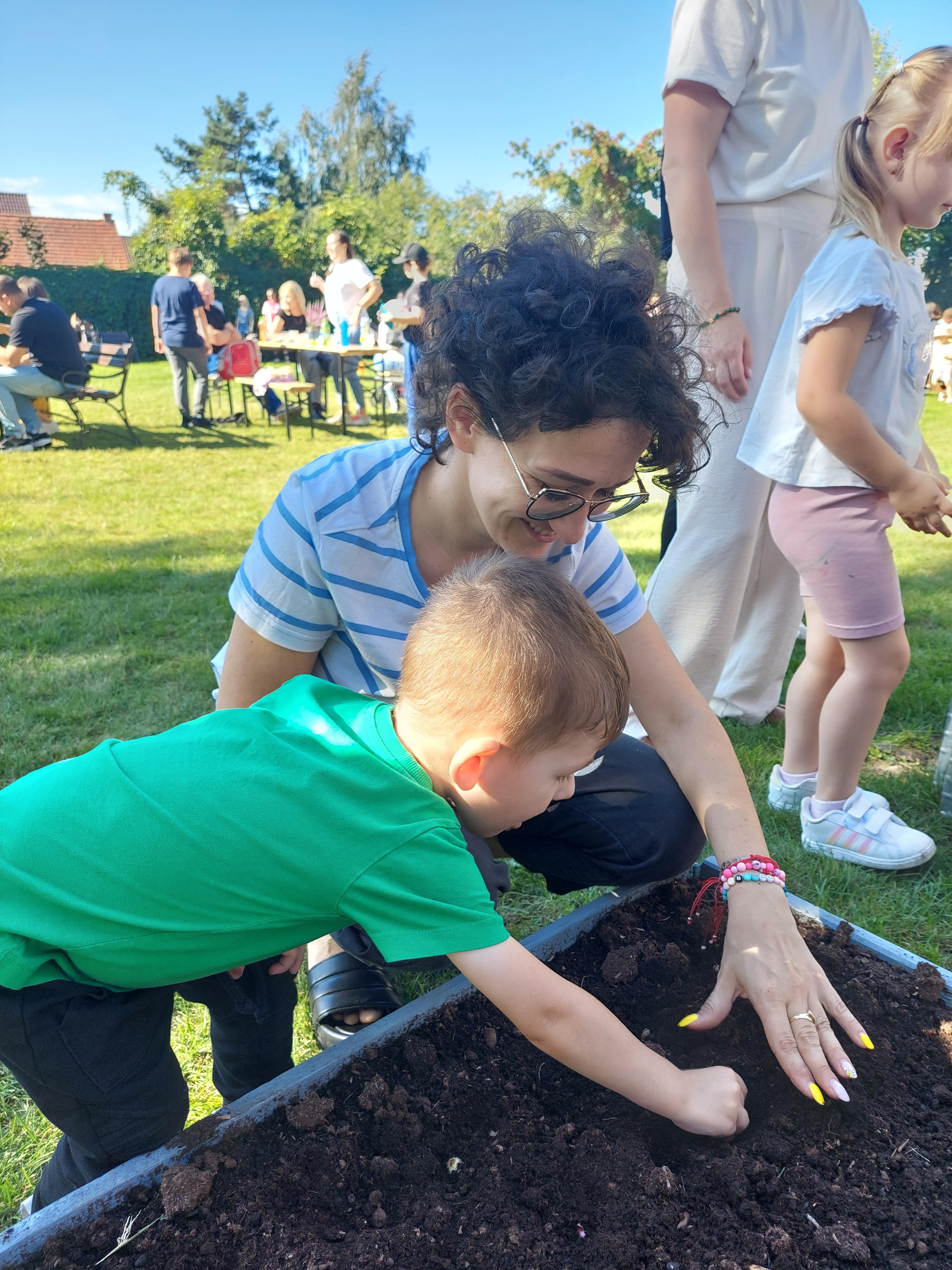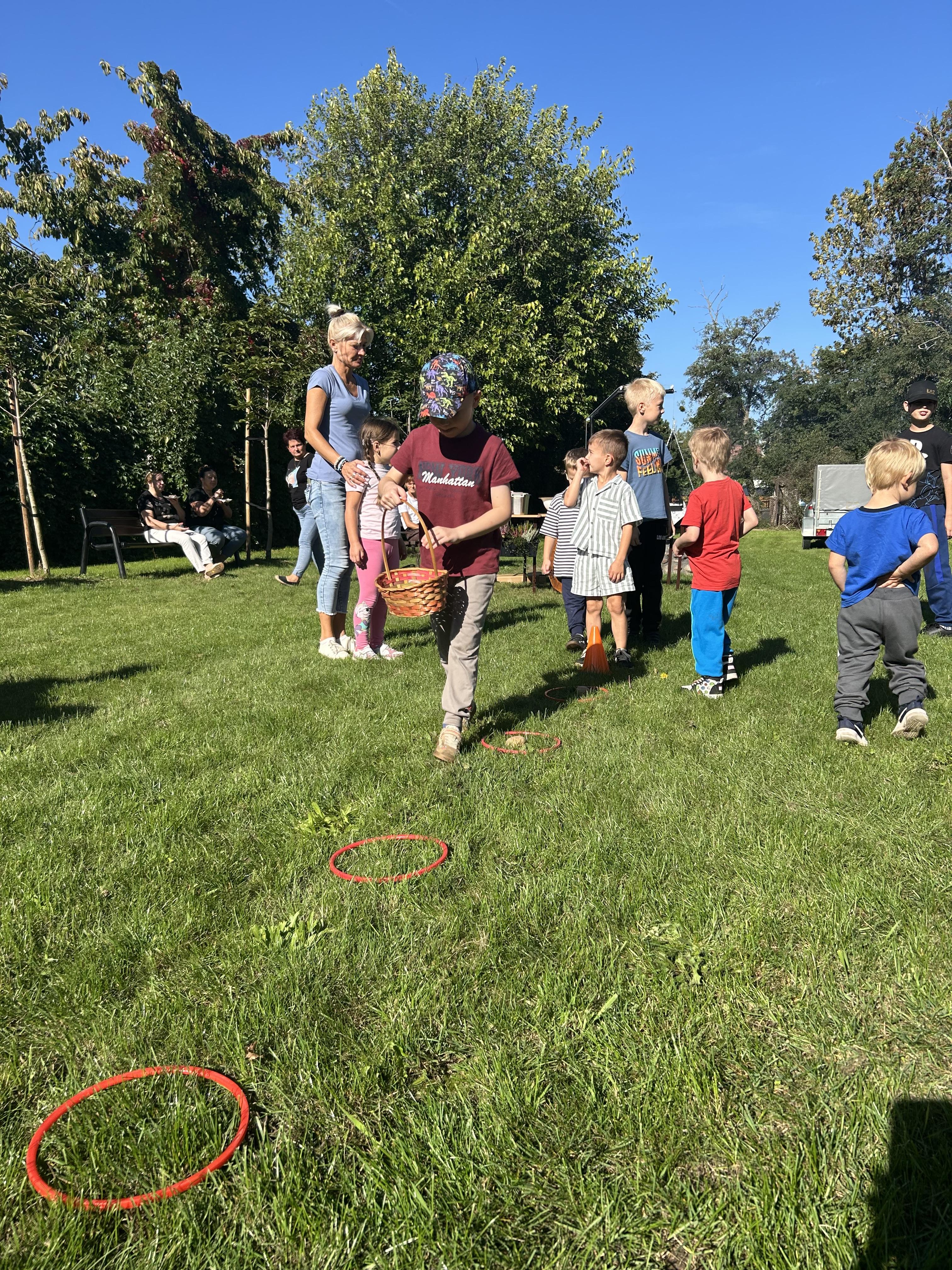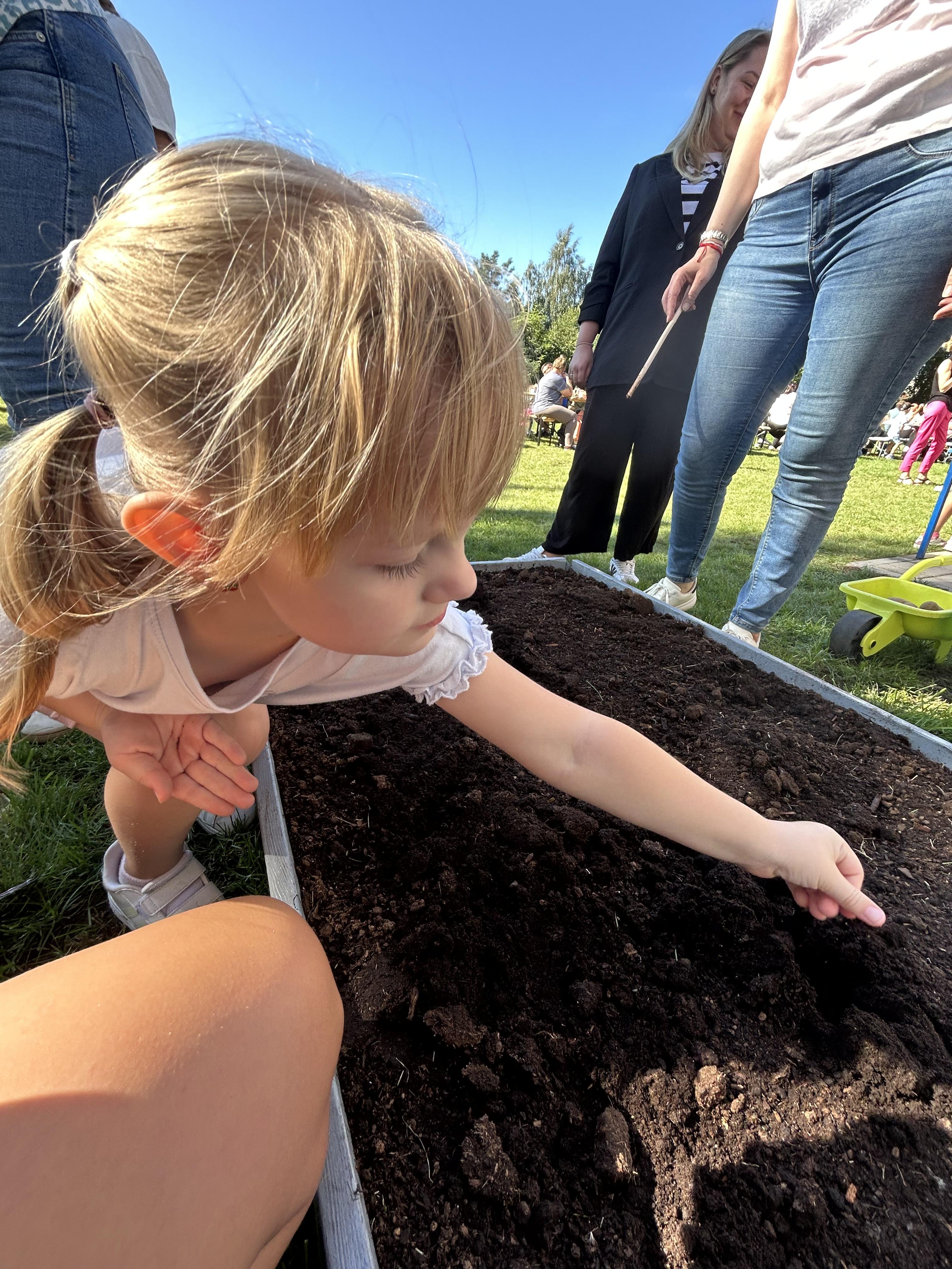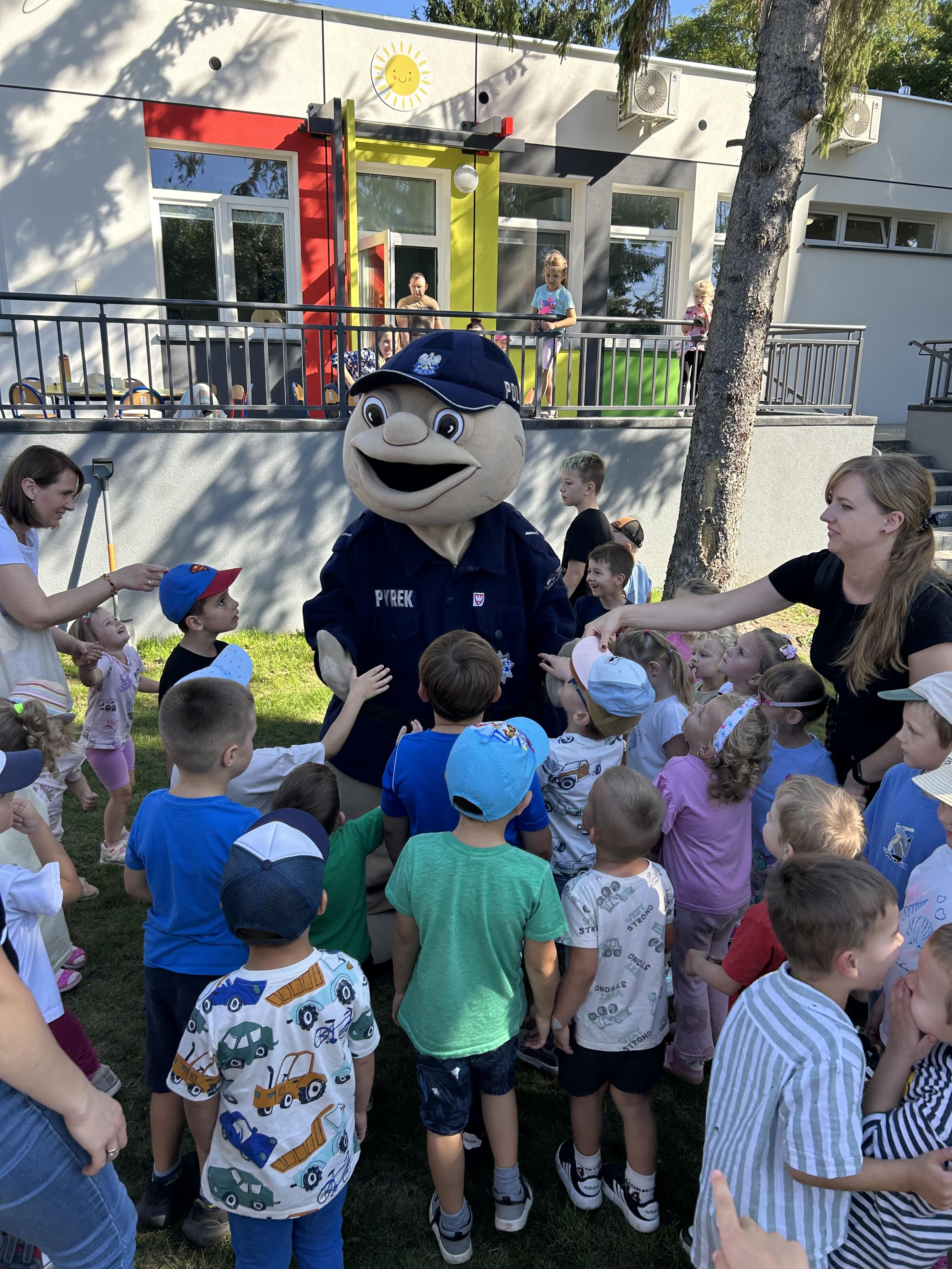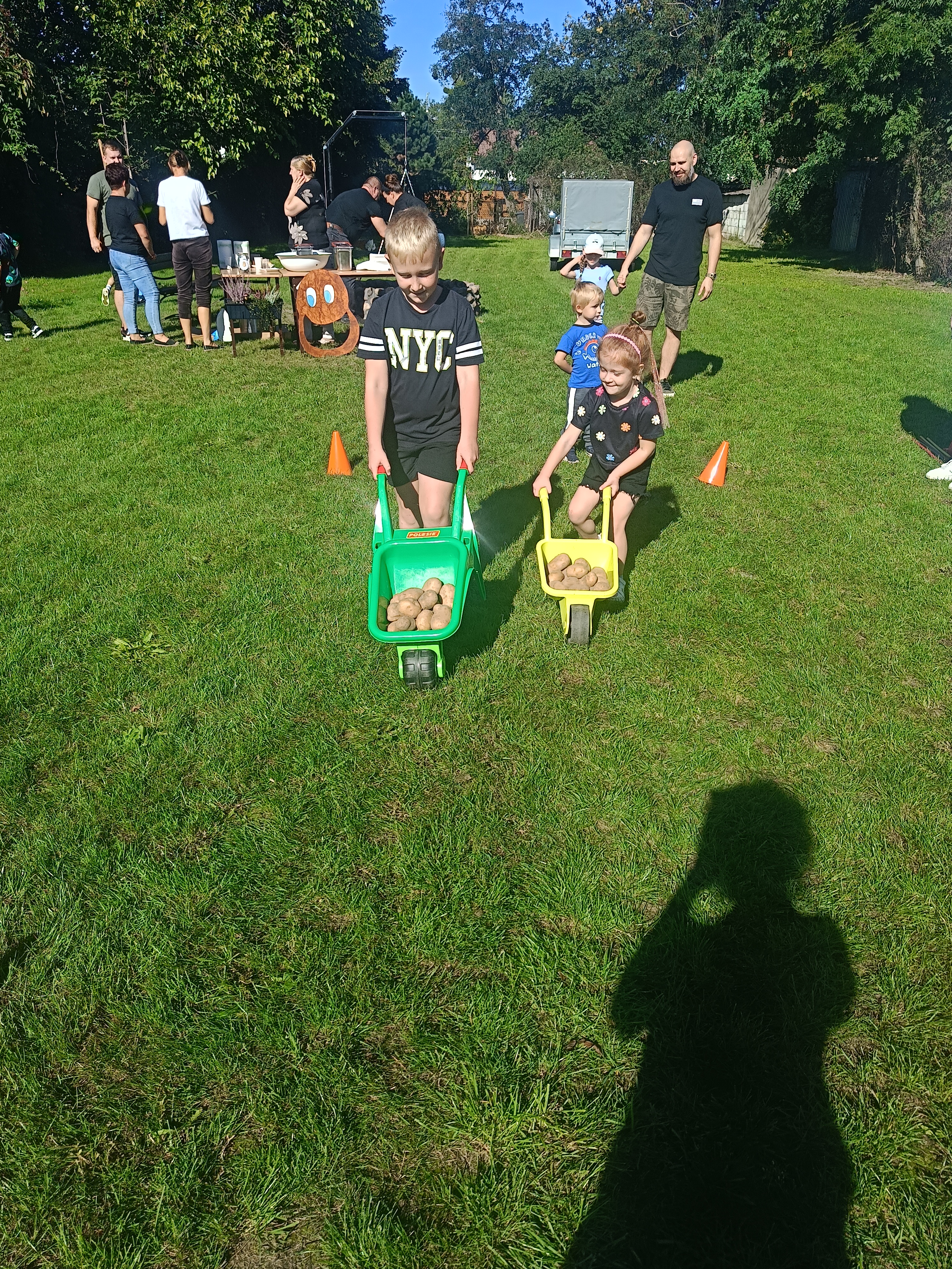 Wspólnie posadziliśmy drzewa, krzewy, zioła i kwiaty. Nie zabrakło też zabaw z głównym bohaterem ziemniakiem- Pyrkiem. Wielką atrakcją okazał się również radiowóz z KPP w Gostyniu, do którego dzieci z chęcią wchodziły i oglądały jego wyposażenie. W trakcie pikniku powstały śmieszne ziemniaczane jeżyki oraz cudowny obraz z pieczątek. Nasi milusińscy wraz ze swoimi rodzinami brali udział w wielu konkurencjach sportowych. Dla nikogo nie zabrakło pysznej zupy pomidoriwej, pieczonych ziemniaczków, lemoniady i ciasta.