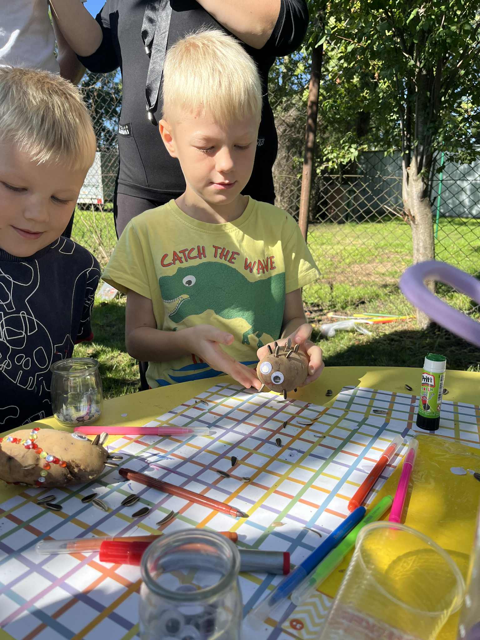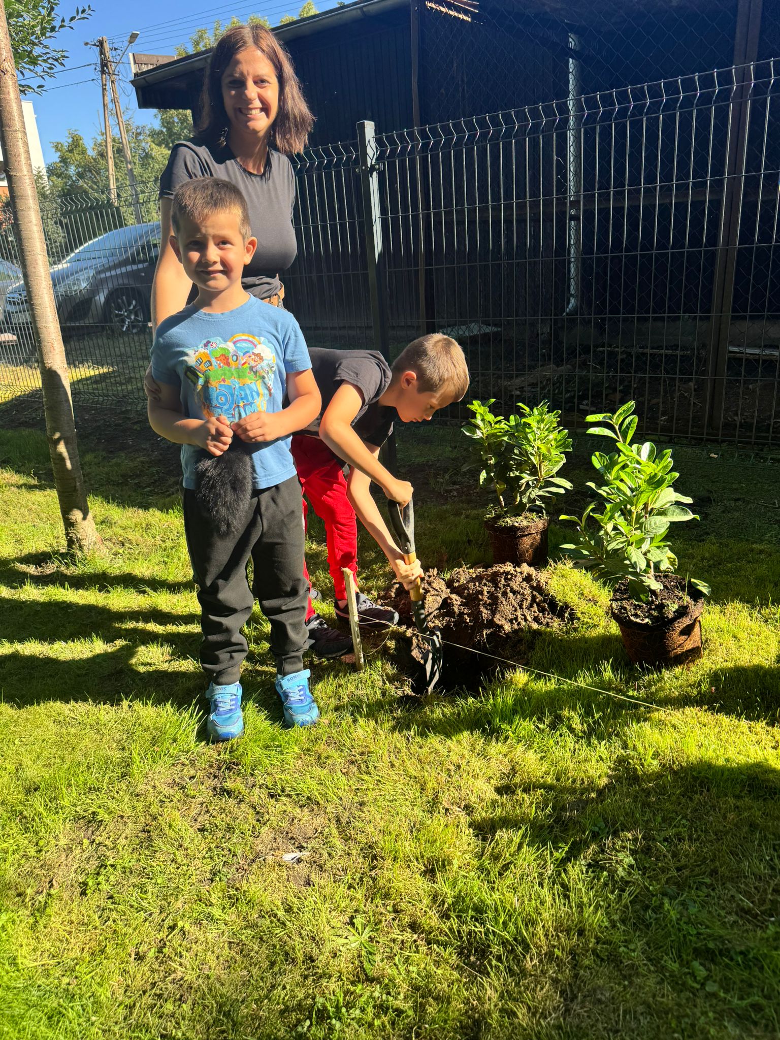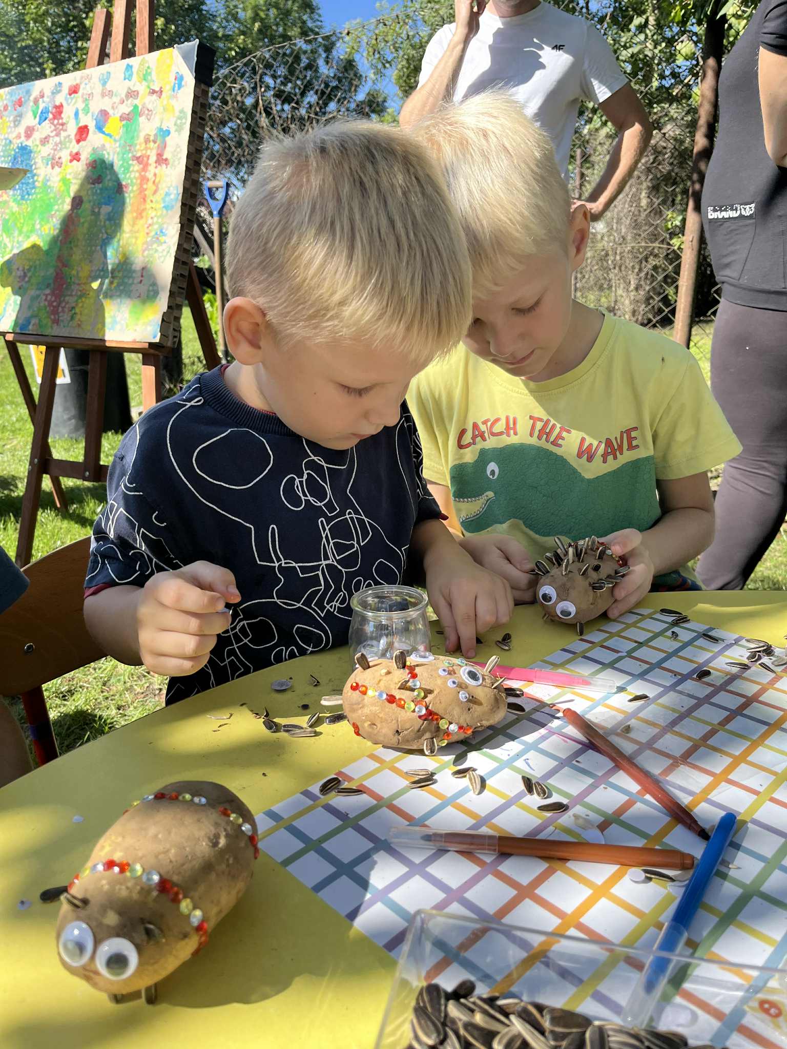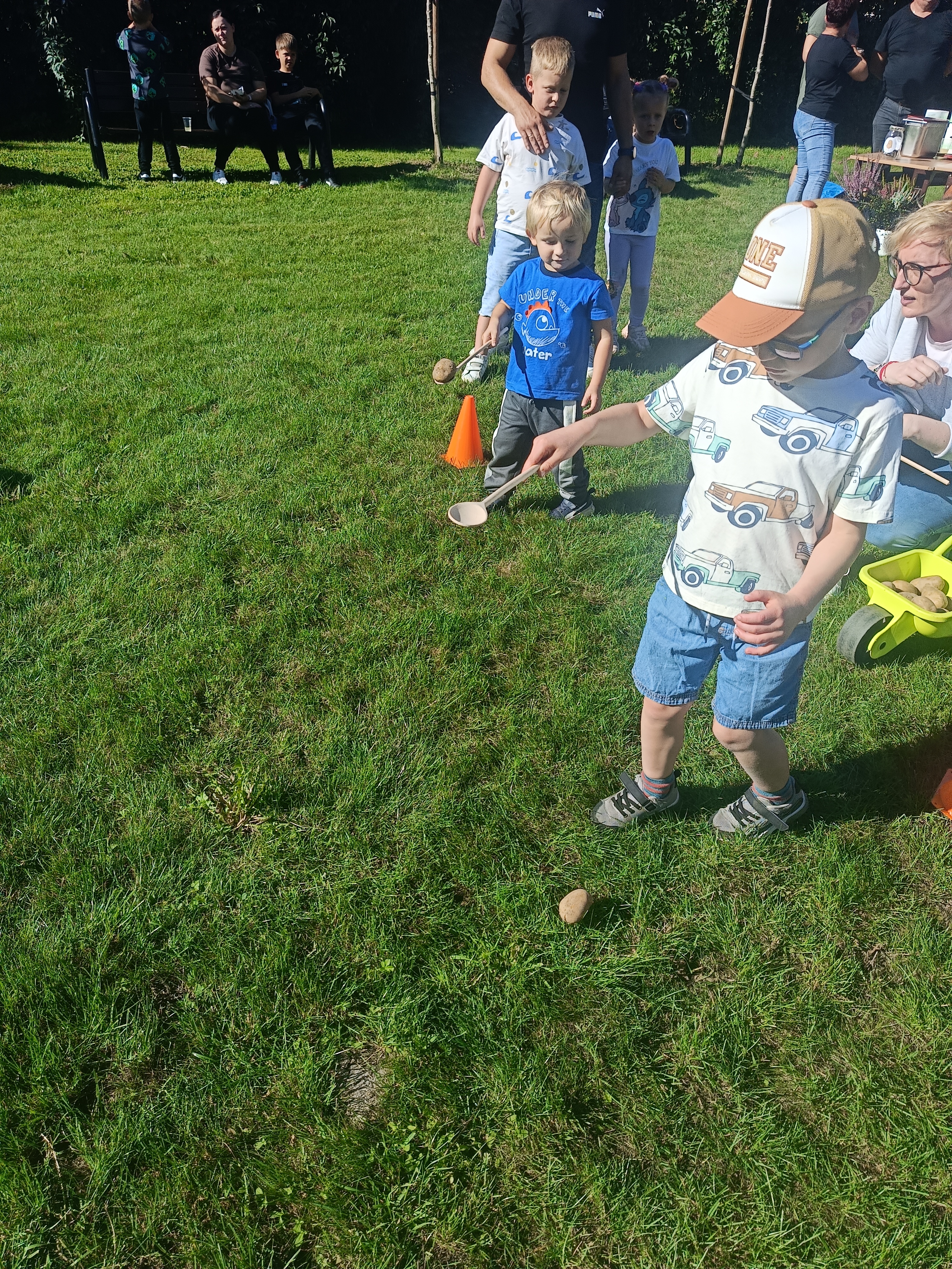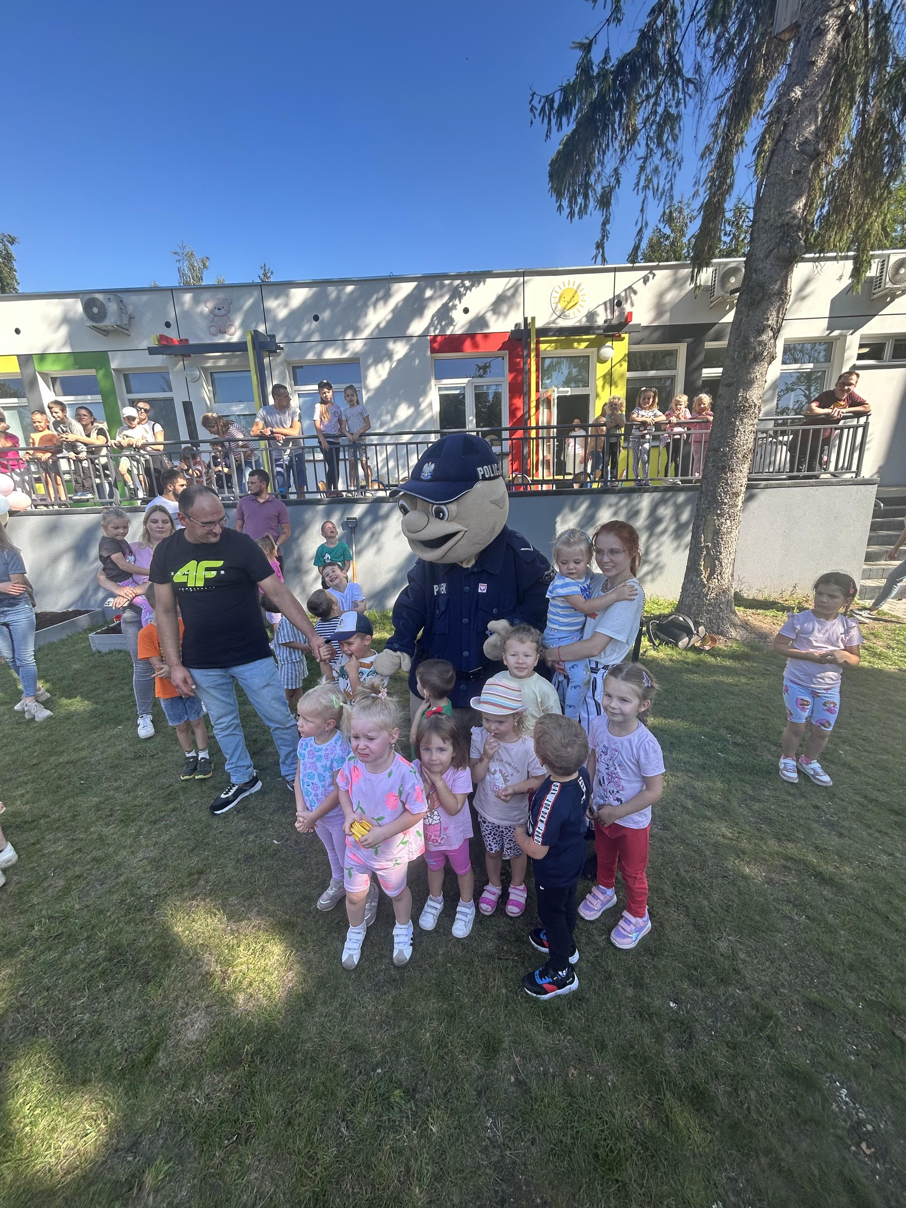 Wspólnie posadziliśmy drzewa, krzewy, zioła i kwiaty. Nie zabrakło też zabaw z głównym bohaterem ziemniakiem- Pyrkiem. Wielką atrakcją okazał się również radiowóz z KPP w Gostyniu, do którego dzieci z chęcią wchodziły i oglądały jego wyposażenie. W trakcie pikniku powstały śmieszne ziemniaczane jeżyki oraz cudowny obraz z pieczątek. Nasi milusińscy wraz ze swoimi rodzinami brali udział w wielu konkurencjach sportowych. Dla nikogo nie zabrakło pysznej zupy pomidoriwej, pieczonych ziemniaczków, lemoniady i ciasta.