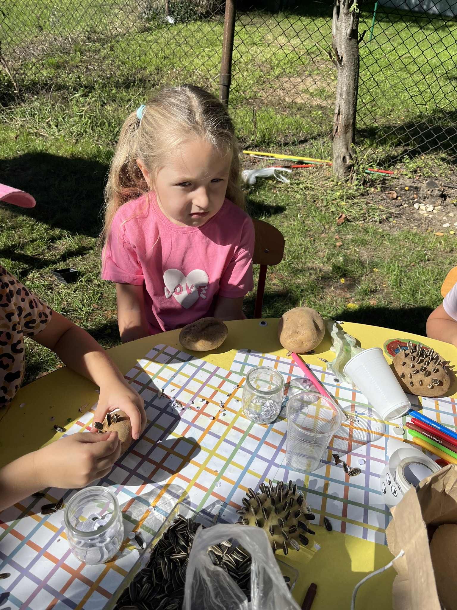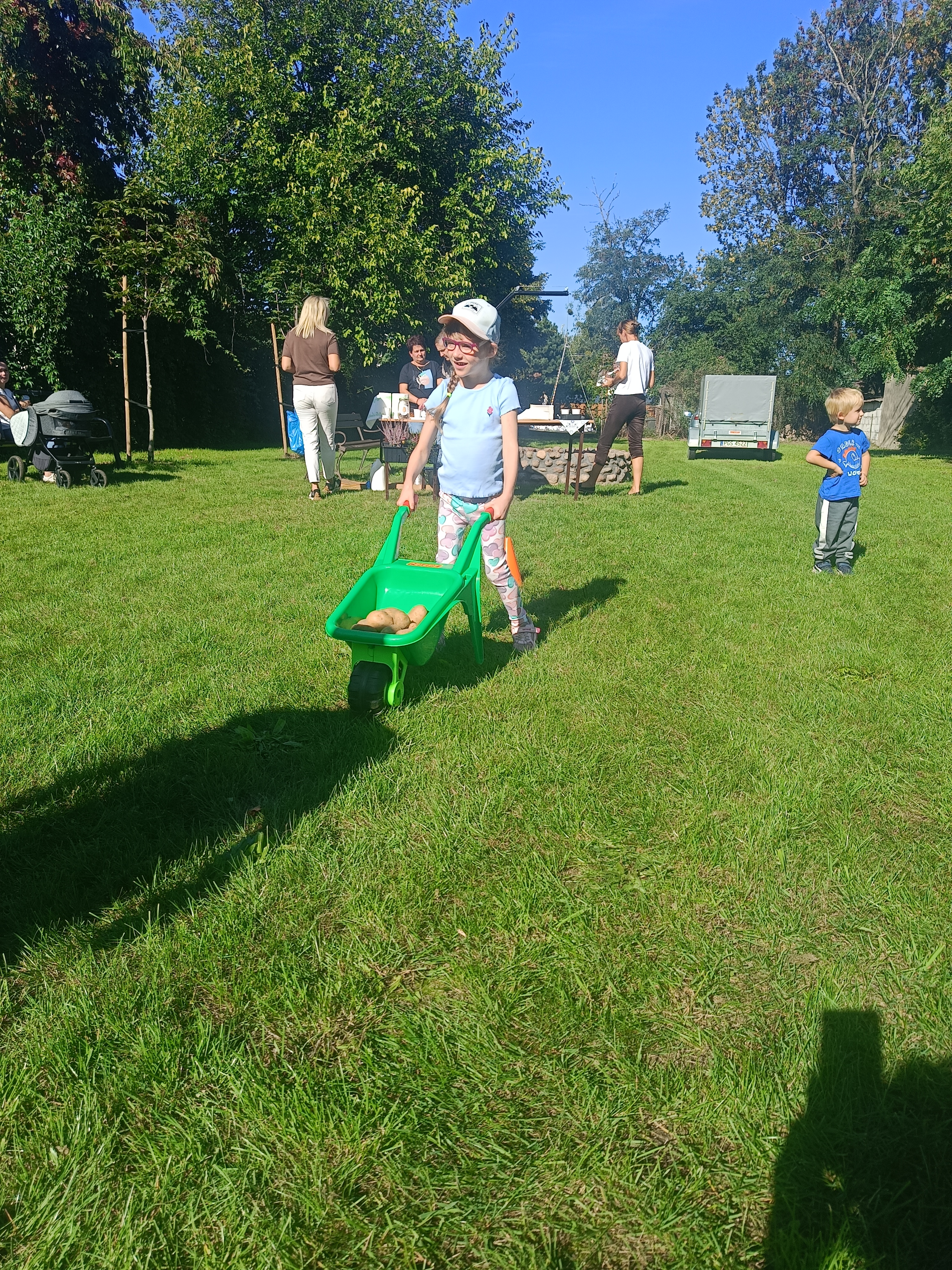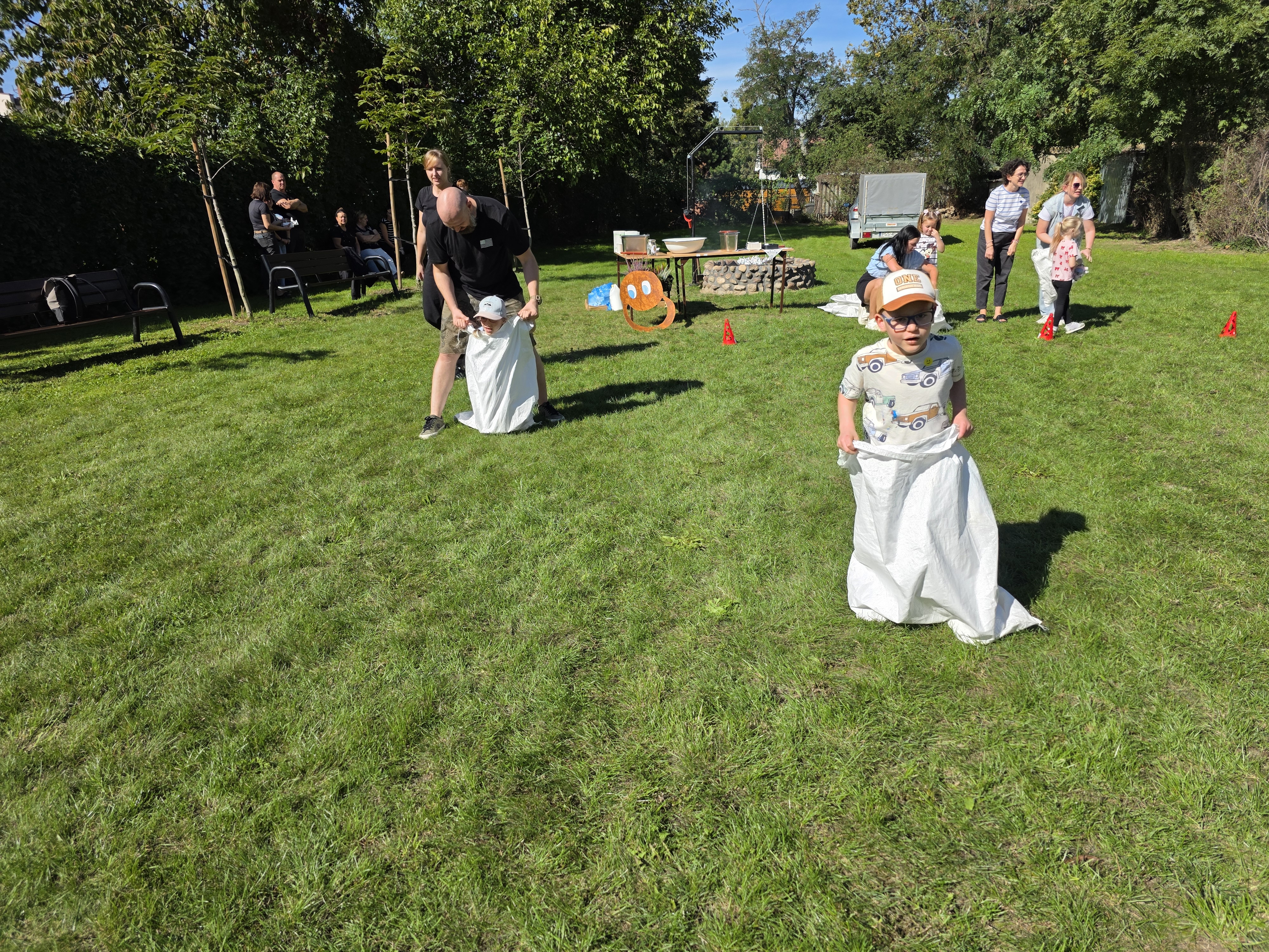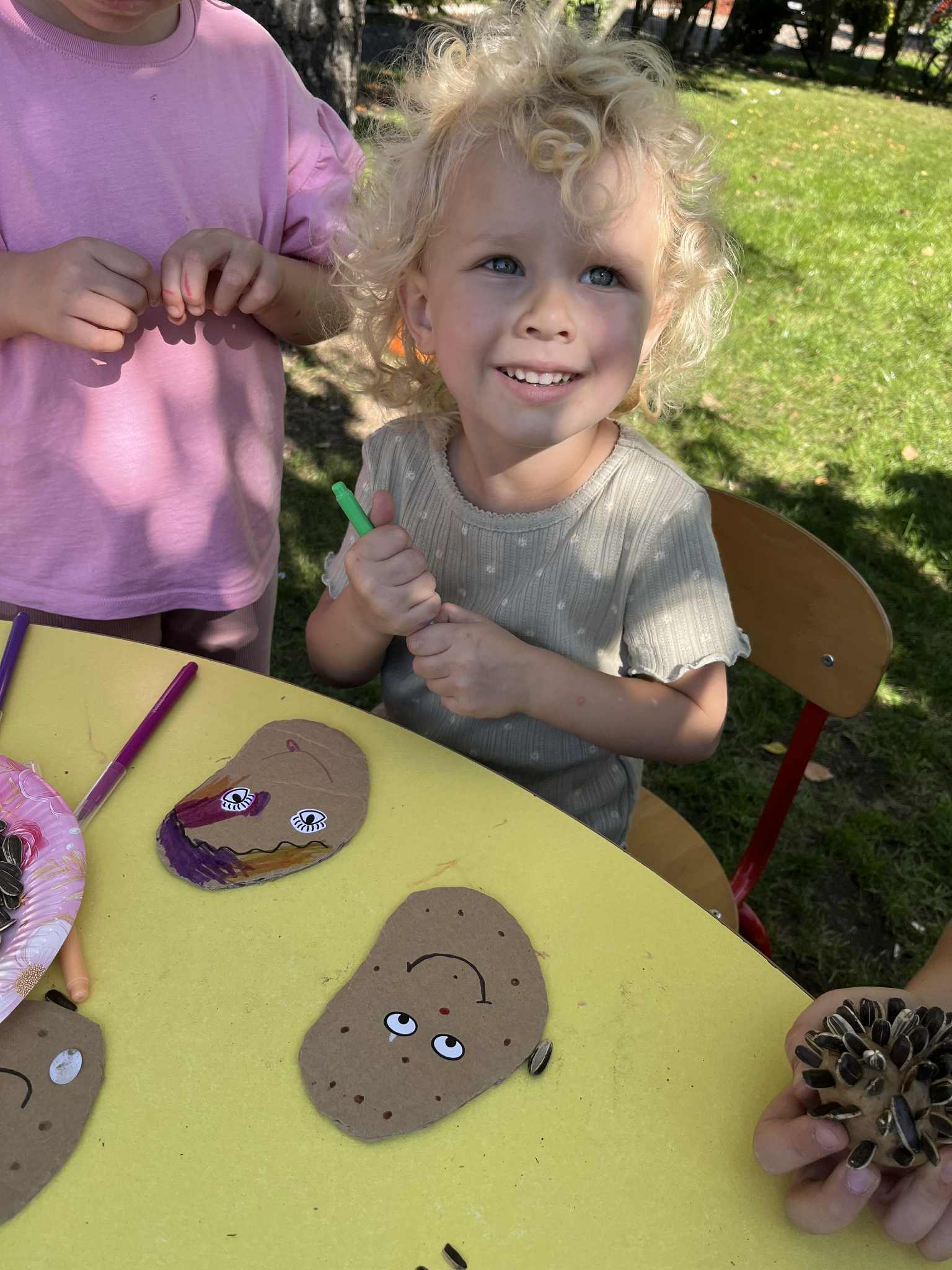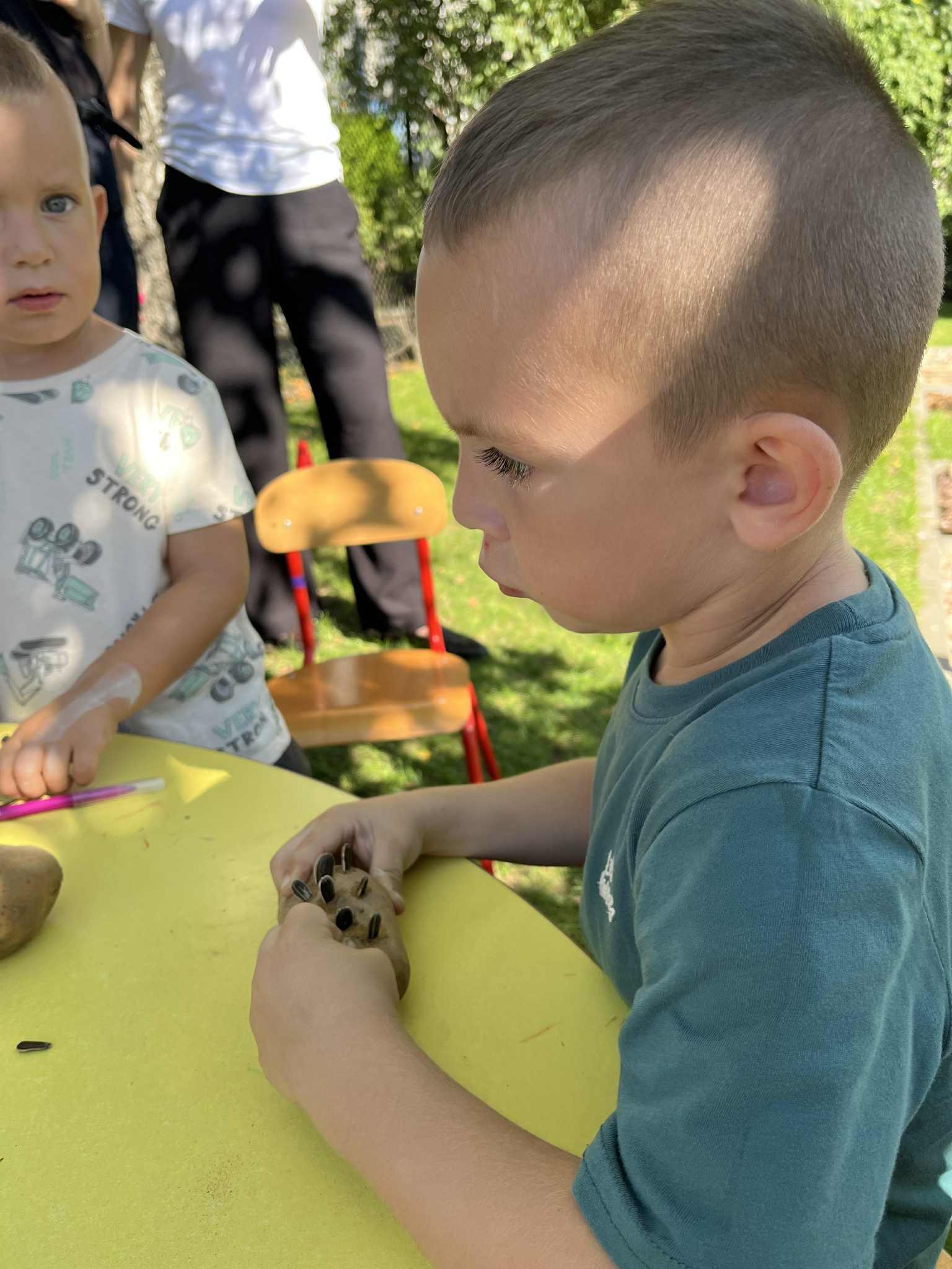 Wspólnie posadziliśmy drzewa, krzewy, zioła i kwiaty. Nie zabrakło też zabaw z głównym bohaterem ziemniakiem- Pyrkiem. Wielką atrakcją okazał się również radiowóz z KPP w Gostyniu, do którego dzieci z chęcią wchodziły i oglądały jego wyposażenie. W trakcie pikniku powstały śmieszne ziemniaczane jeżyki oraz cudowny obraz z pieczątek. Nasi milusińscy wraz ze swoimi rodzinami brali udział w wielu konkurencjach sportowych. Dla nikogo nie zabrakło pysznej zupy pomidoriwej, pieczonych ziemniaczków, lemoniady i ciasta.