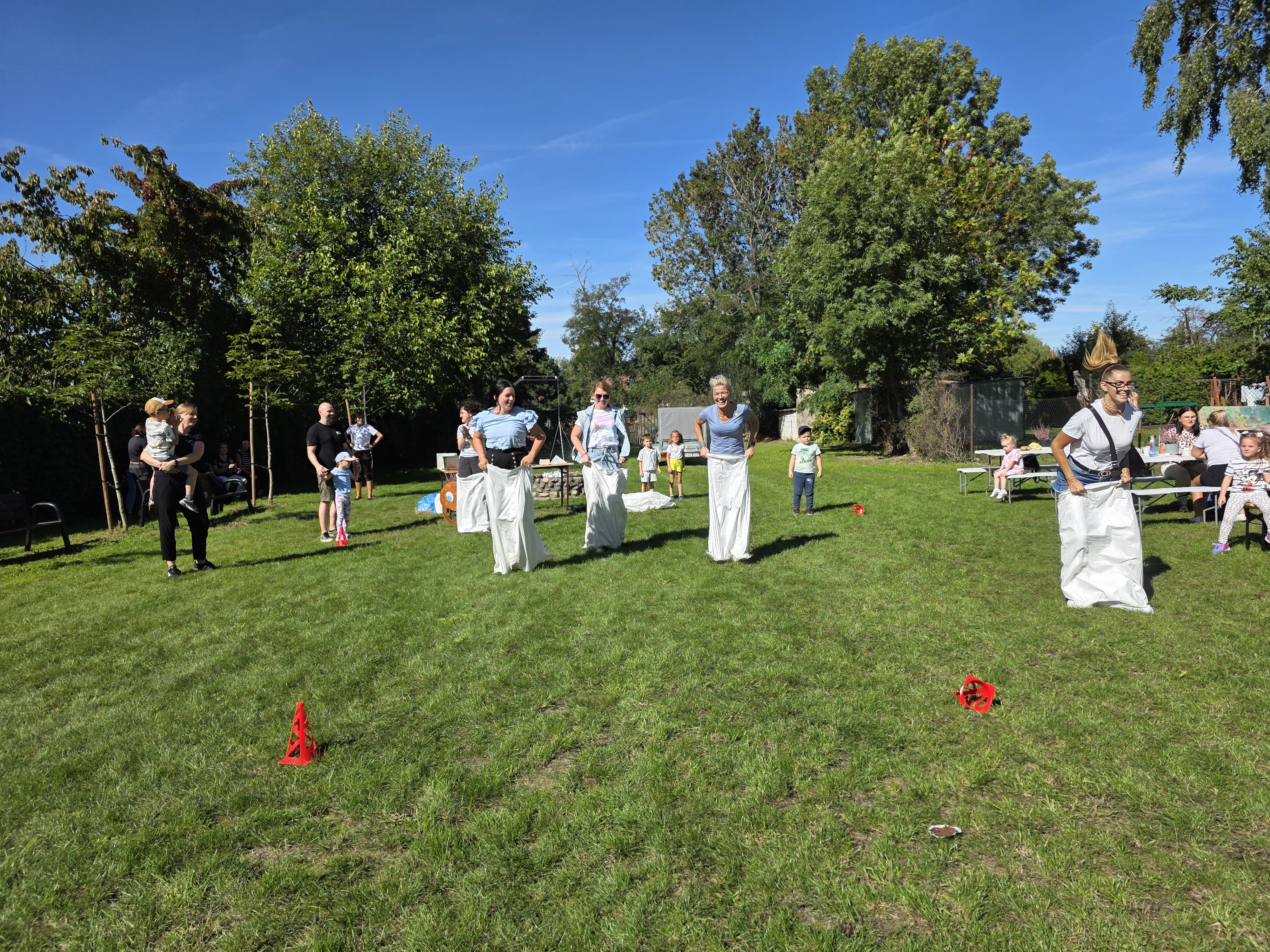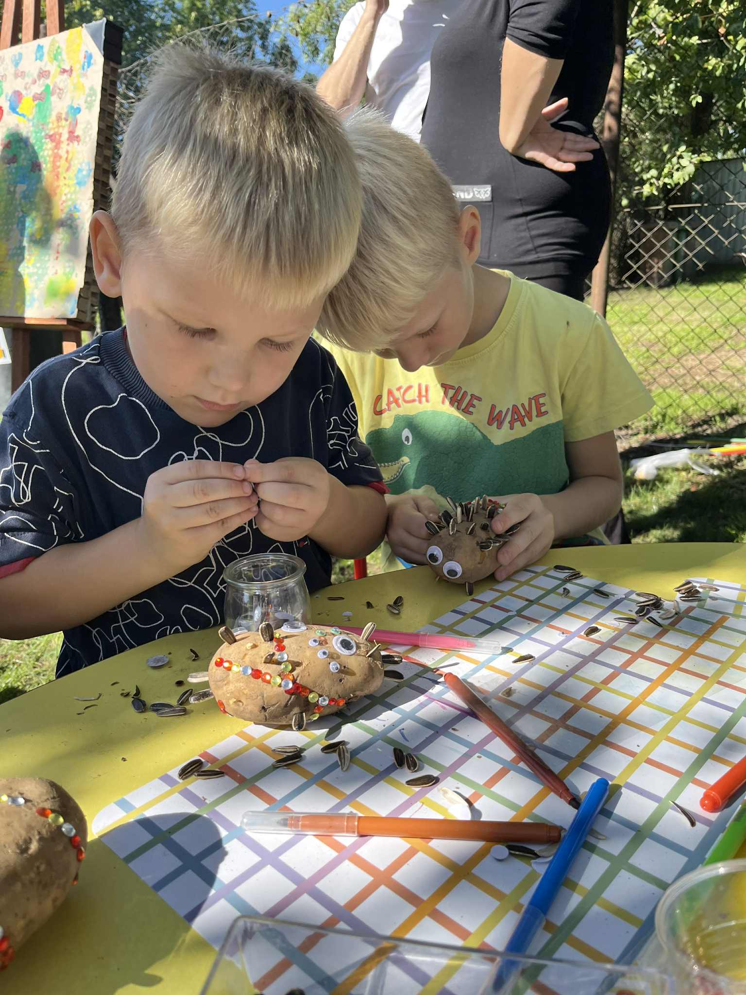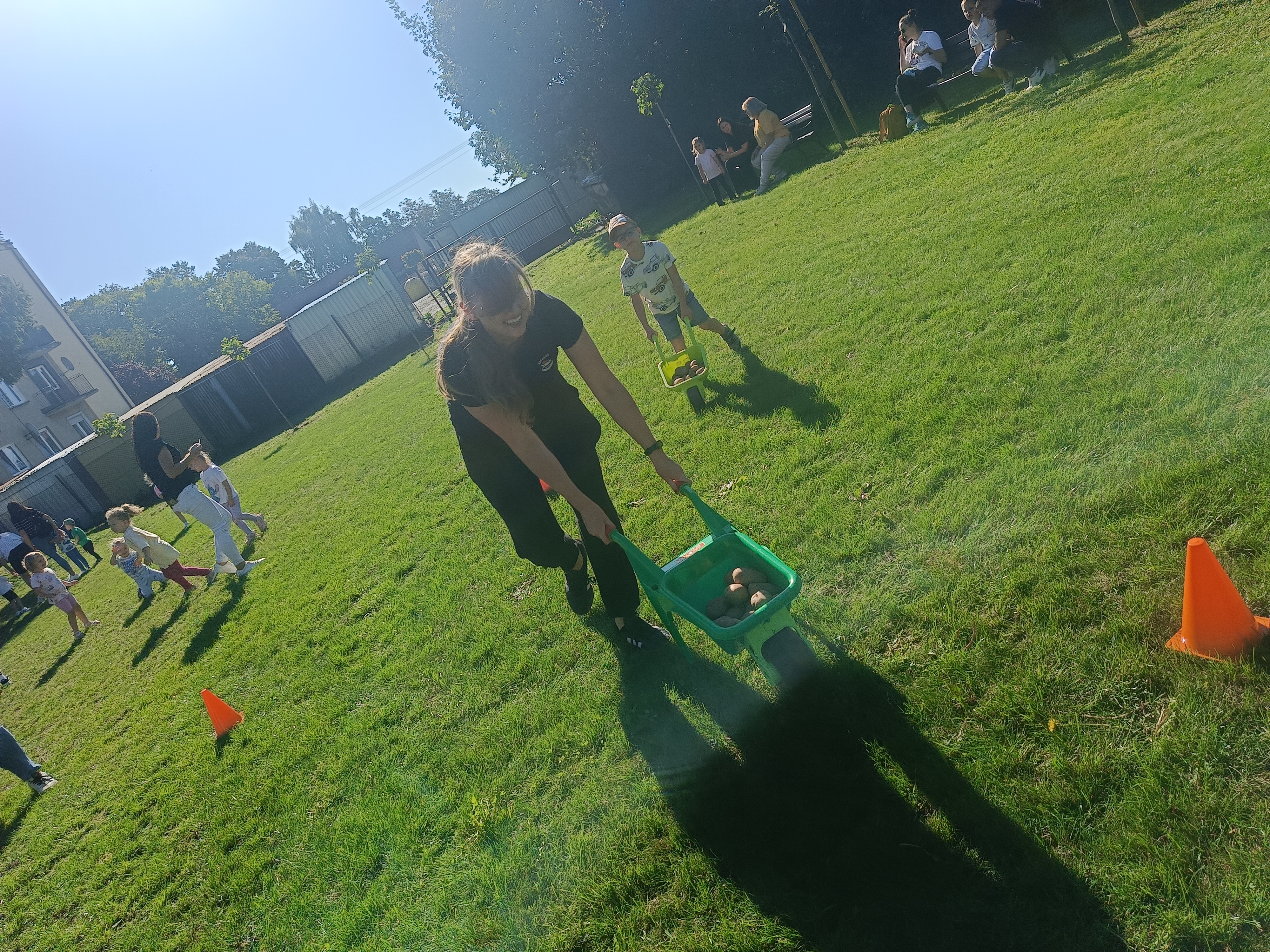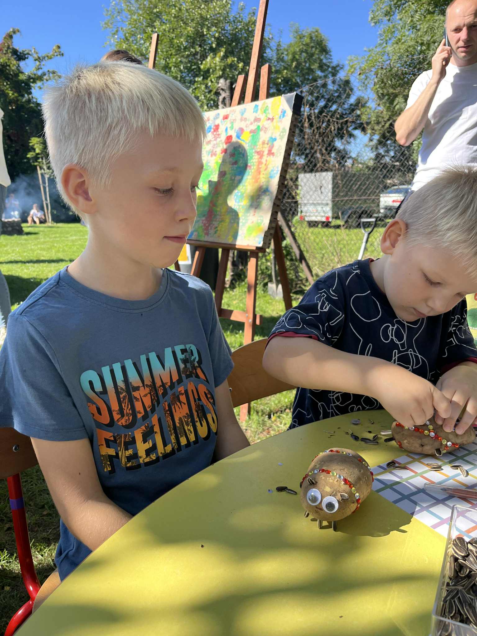 Wspólnie posadziliśmy drzewa, krzewy, zioła i kwiaty. Nie zabrakło też zabaw z głównym bohaterem ziemniakiem- Pyrkiem. Wielką atrakcją okazał się również radiowóz z KPP w Gostyniu, do którego dzieci z chęcią wchodziły i oglądały jego wyposażenie. W trakcie pikniku powstały śmieszne ziemniaczane jeżyki oraz cudowny obraz z pieczątek. Nasi milusińscy wraz ze swoimi rodzinami brali udział w wielu konkurencjach sportowych. Dla nikogo nie zabrakło pysznej zupy pomidoriwej, pieczonych ziemniaczków, lemoniady i ciasta.