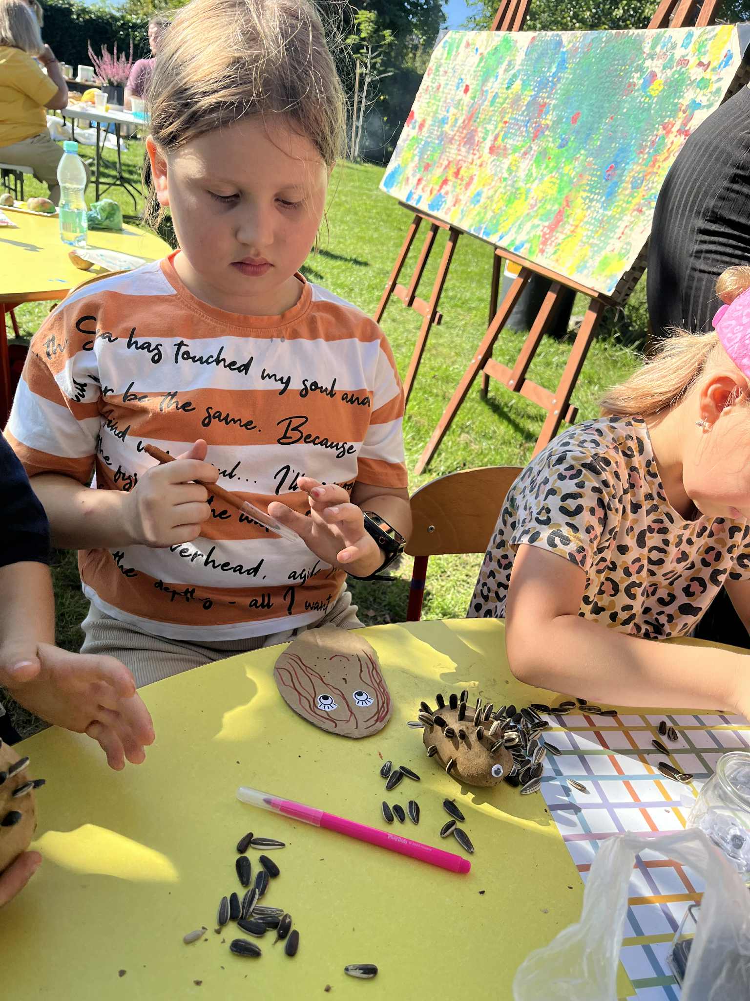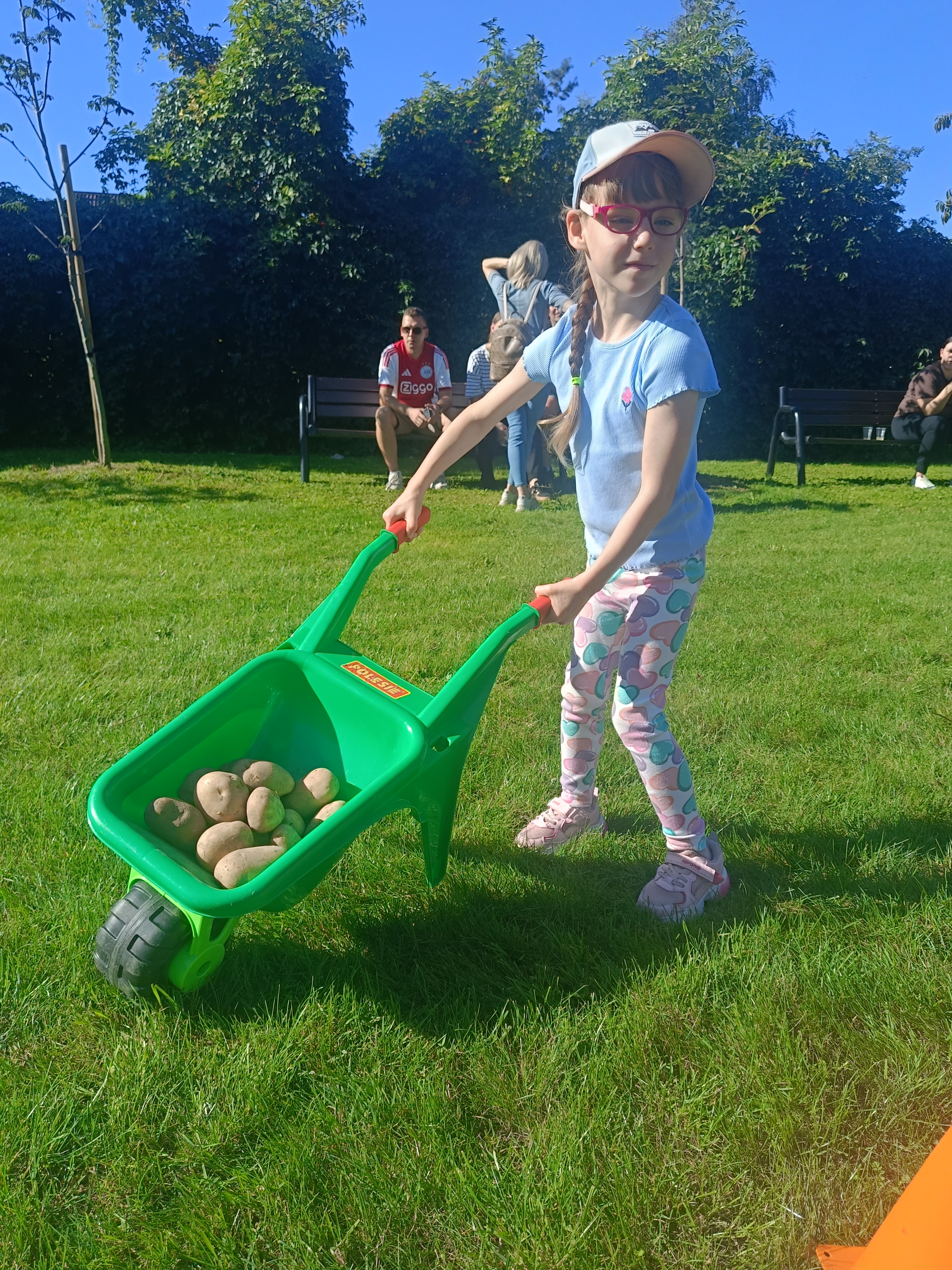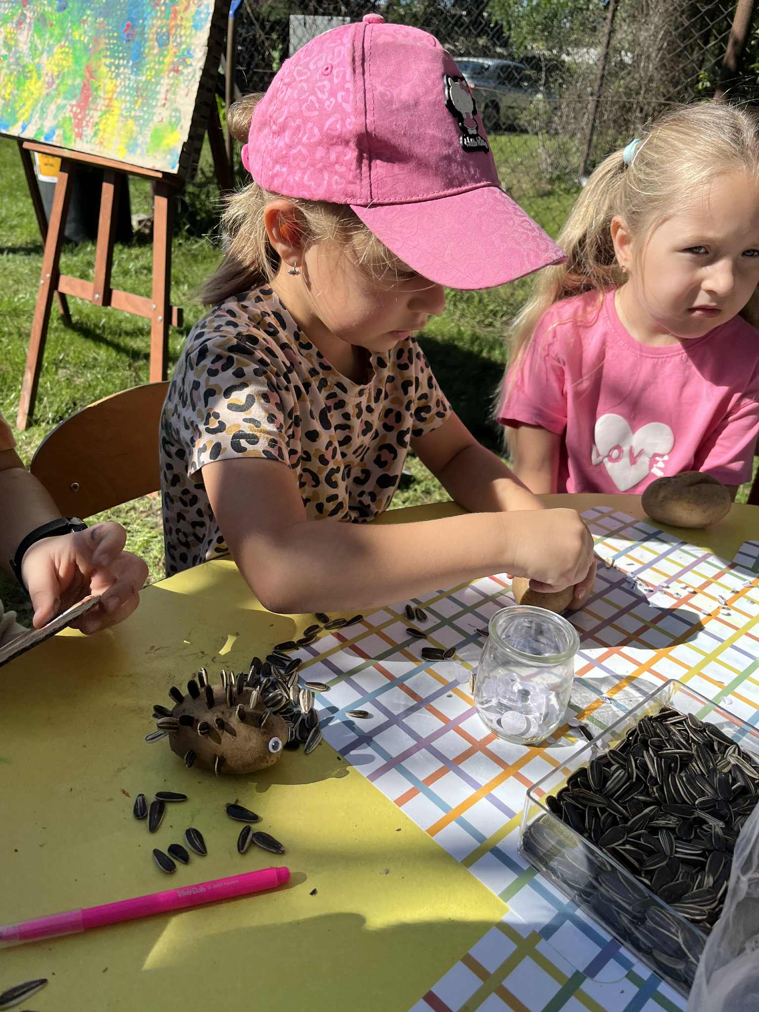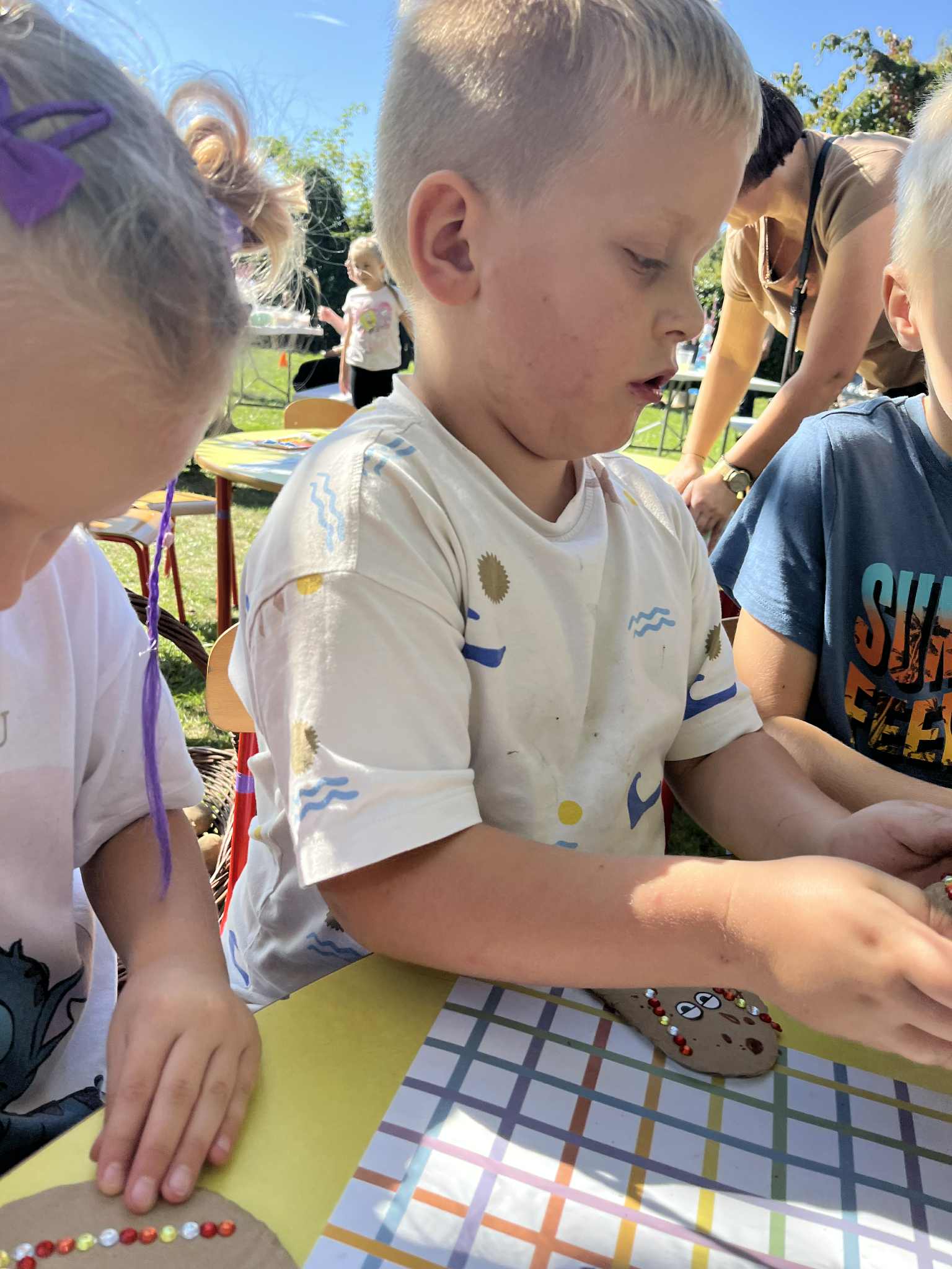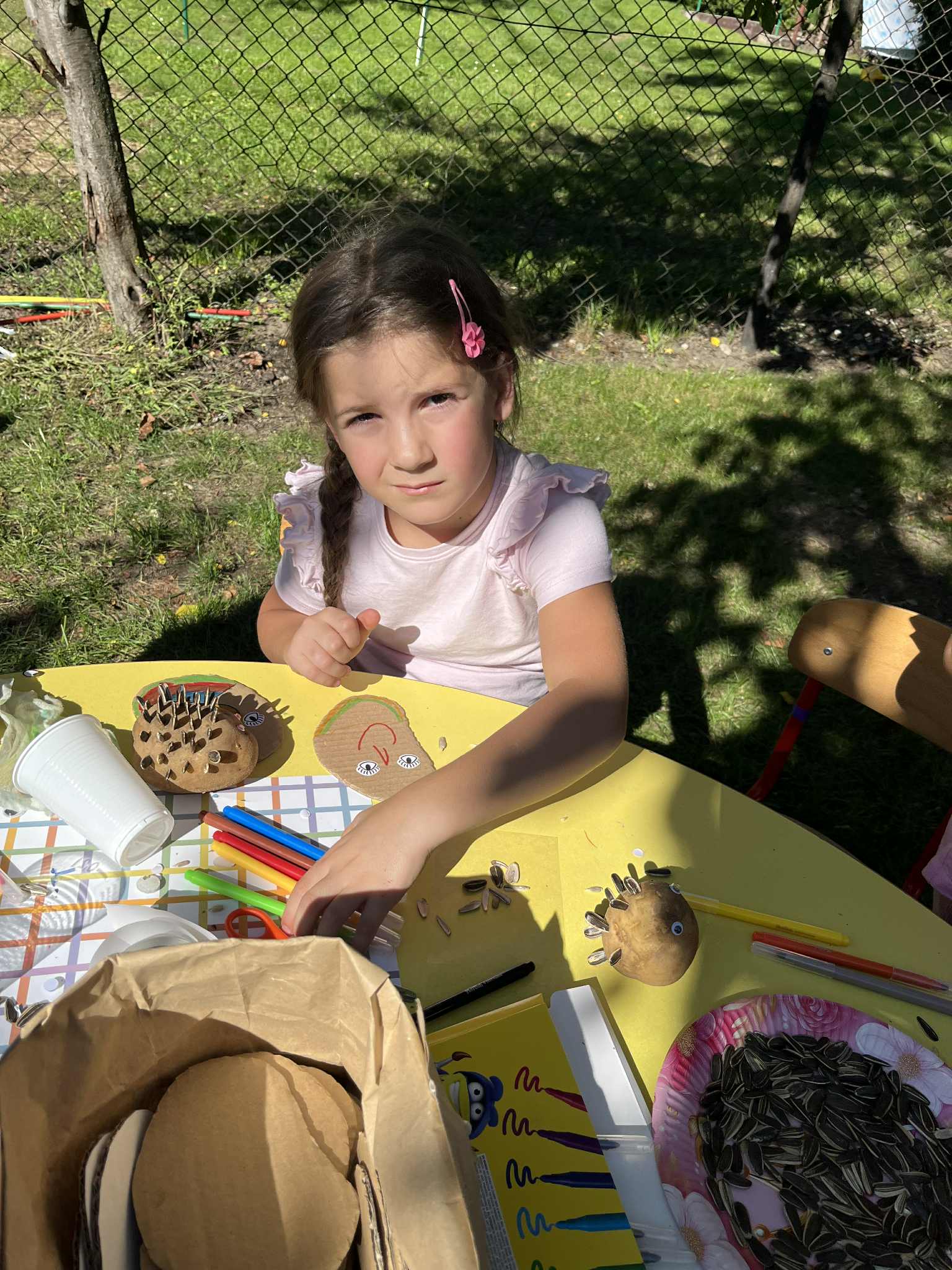 Wspólnie posadziliśmy drzewa, krzewy, zioła i kwiaty. Nie zabrakło też zabaw z głównym bohaterem ziemniakiem- Pyrkiem. Wielką atrakcją okazał się również radiowóz z KPP w Gostyniu, do którego dzieci z chęcią wchodziły i oglądały jego wyposażenie. W trakcie pikniku powstały śmieszne ziemniaczane jeżyki oraz cudowny obraz z pieczątek. Nasi milusińscy wraz ze swoimi rodzinami brali udział w wielu konkurencjach sportowych. Dla nikogo nie zabrakło pysznej zupy pomidoriwej, pieczonych ziemniaczków, lemoniady i ciasta.