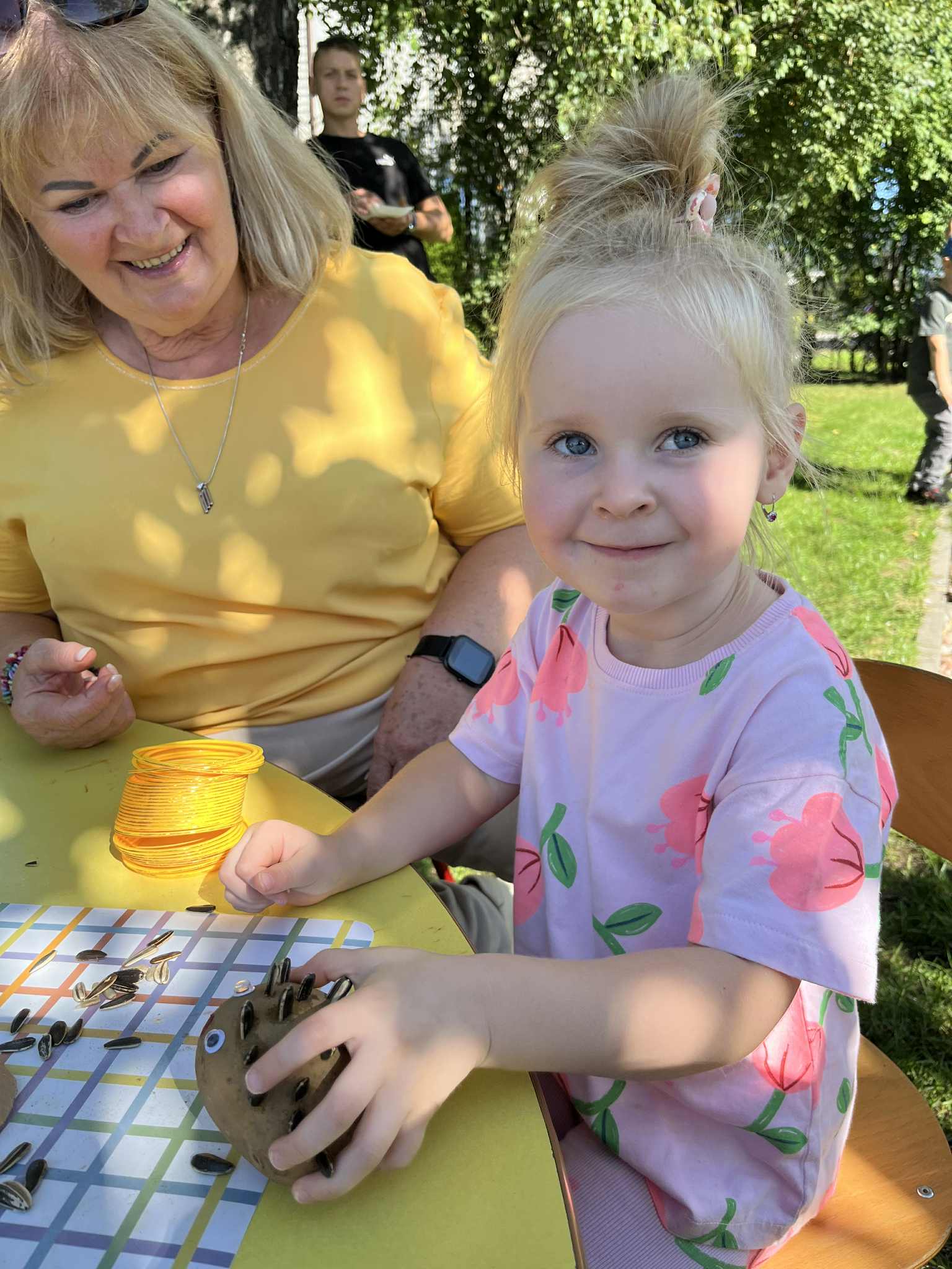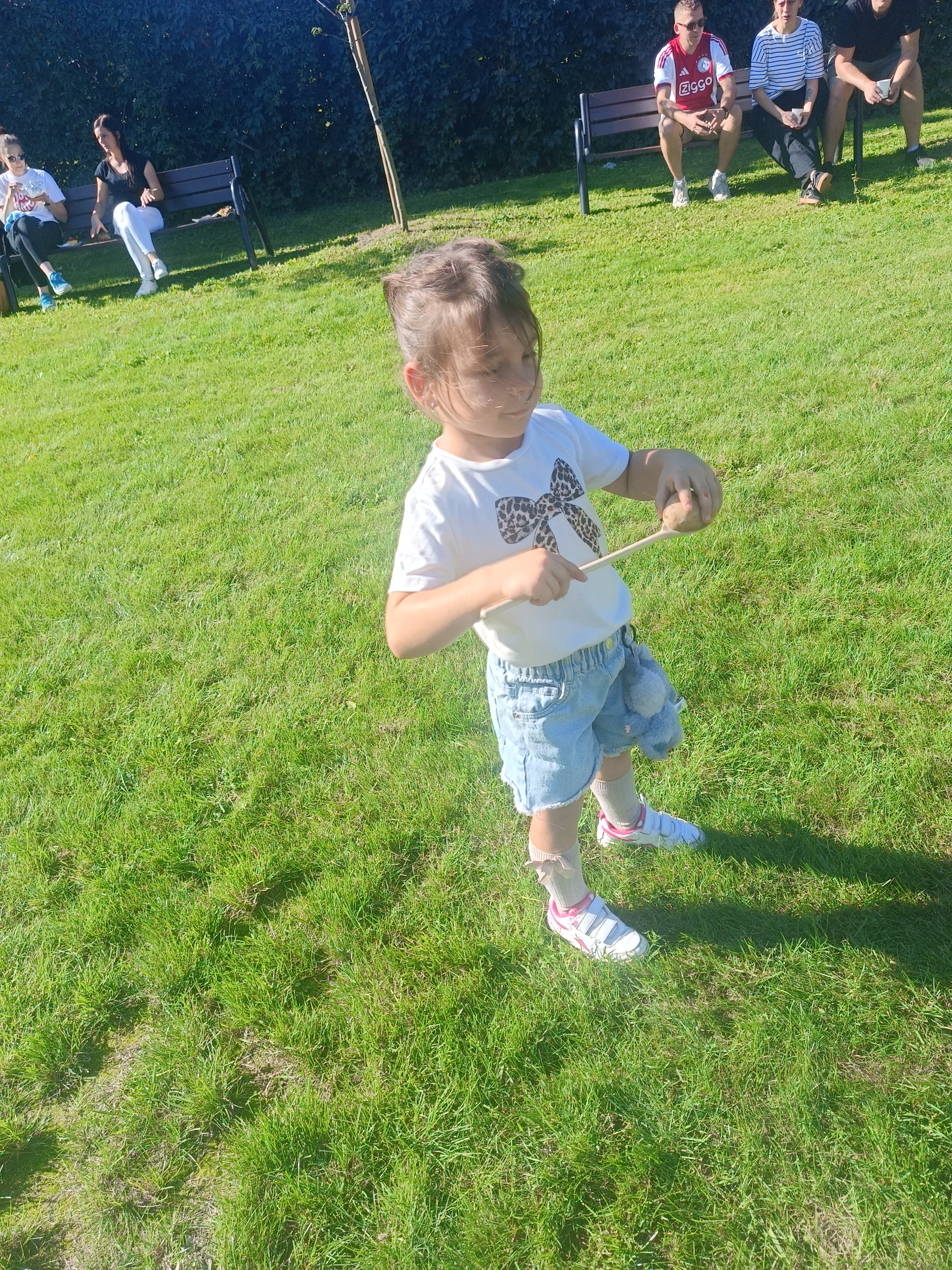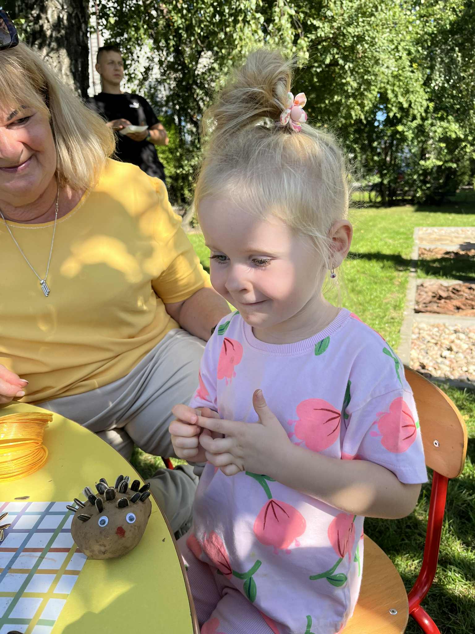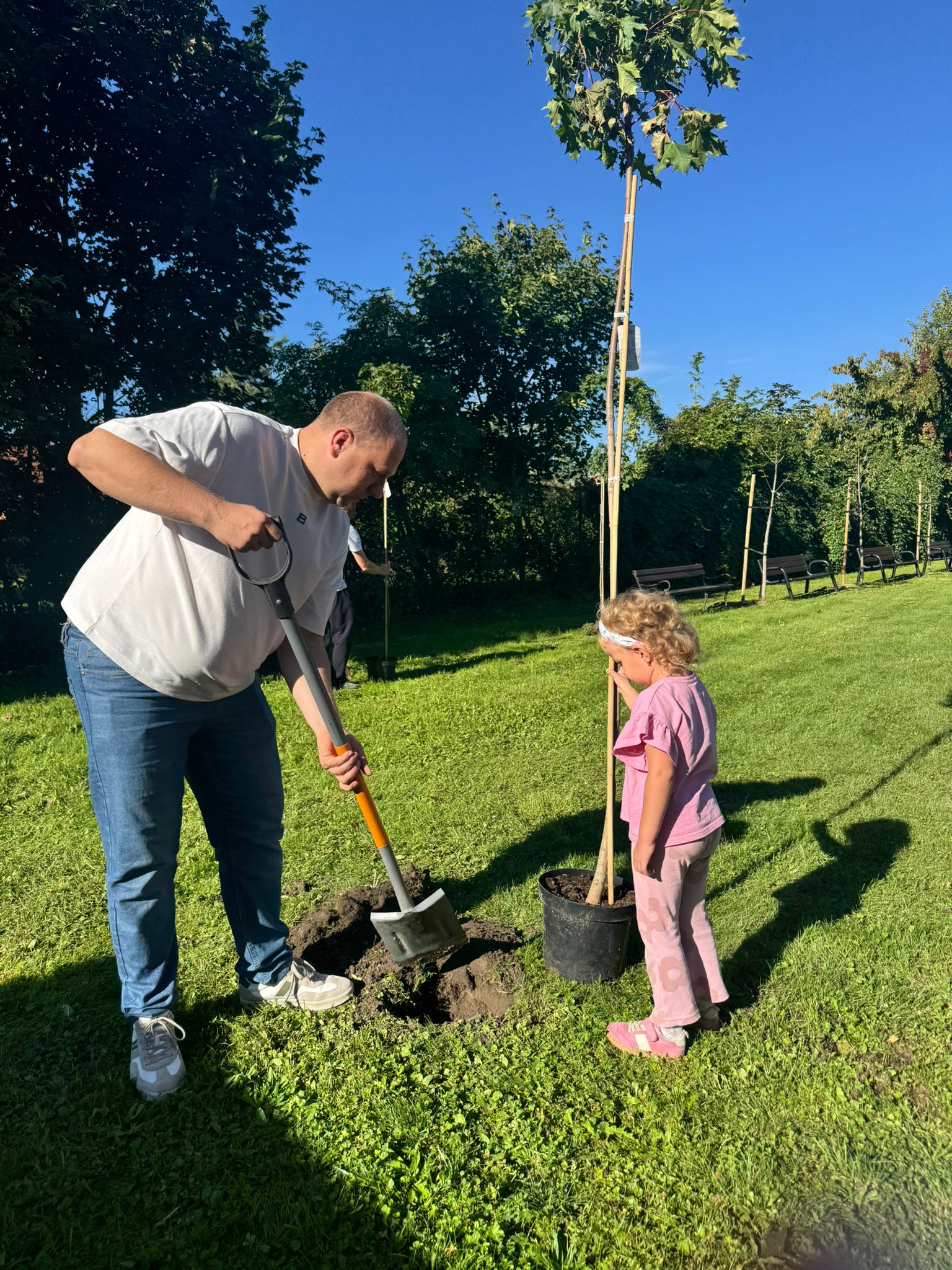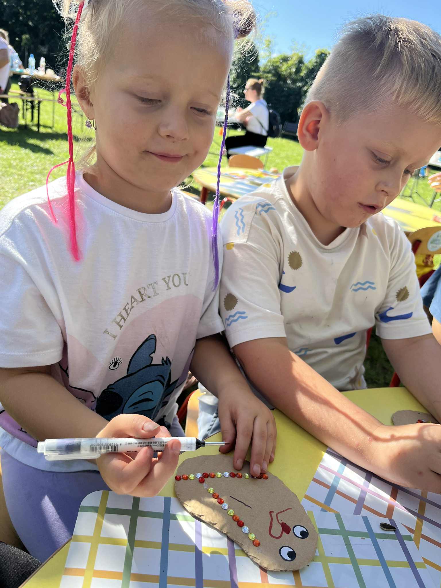 Wspólnie posadziliśmy drzewa, krzewy, zioła i kwiaty. Nie zabrakło też zabaw z głównym bohaterem ziemniakiem- Pyrkiem. Wielką atrakcją okazał się również radiowóz z KPP w Gostyniu, do którego dzieci z chęcią wchodziły i oglądały jego wyposażenie. W trakcie pikniku powstały śmieszne ziemniaczane jeżyki oraz cudowny obraz z pieczątek. Nasi milusińscy wraz ze swoimi rodzinami brali udział w wielu konkurencjach sportowych. Dla nikogo nie zabrakło pysznej zupy pomidoriwej, pieczonych ziemniaczków, lemoniady i ciasta.
