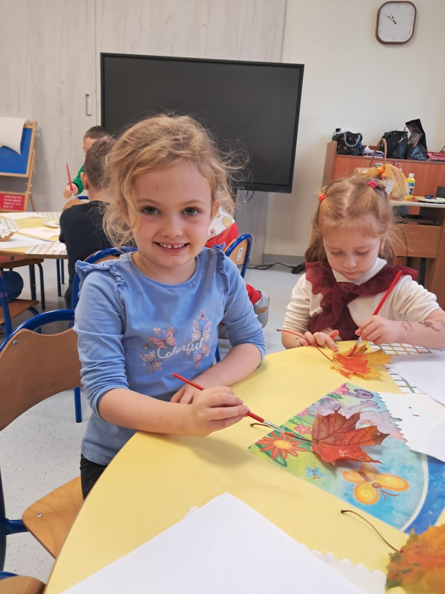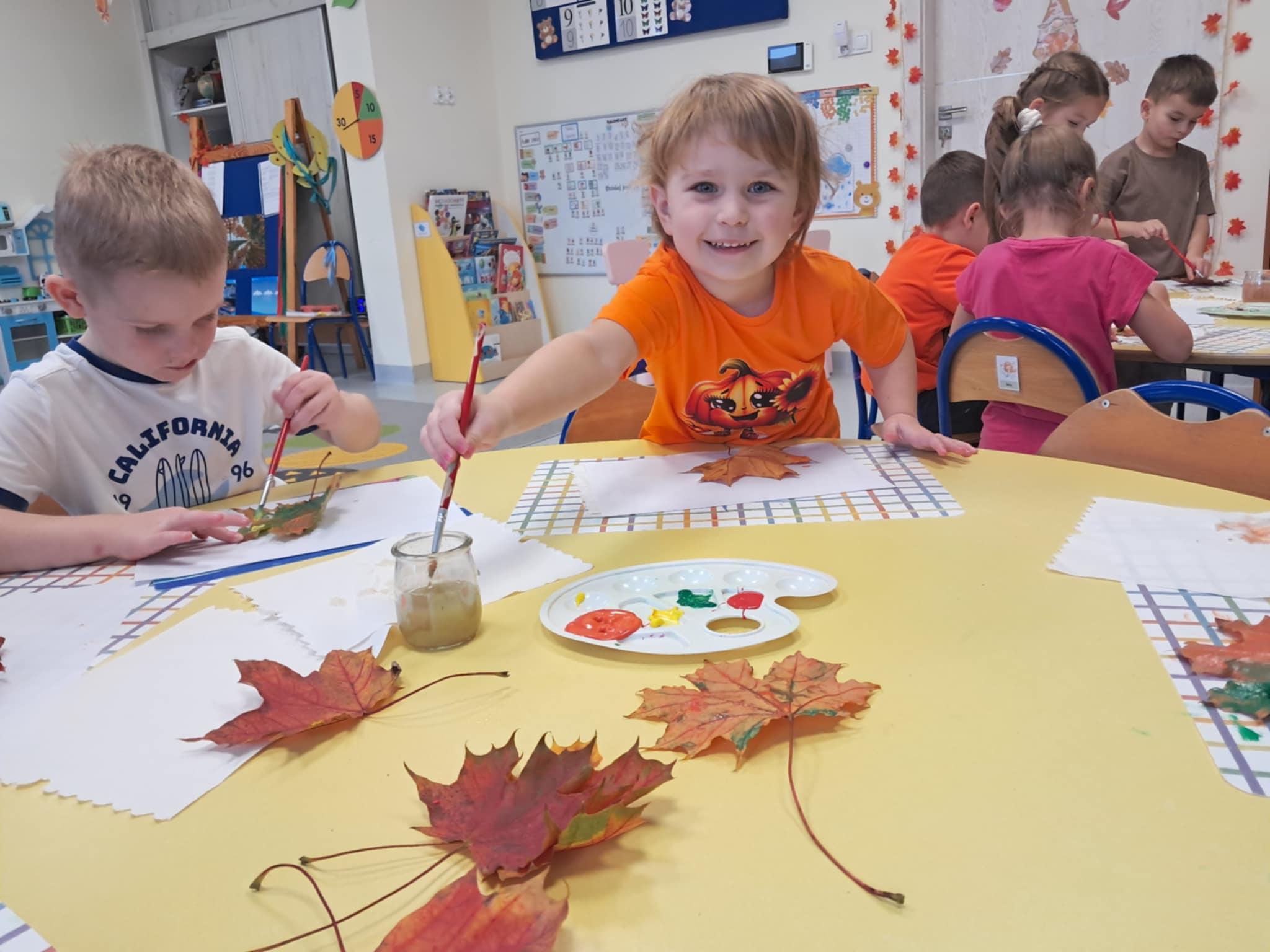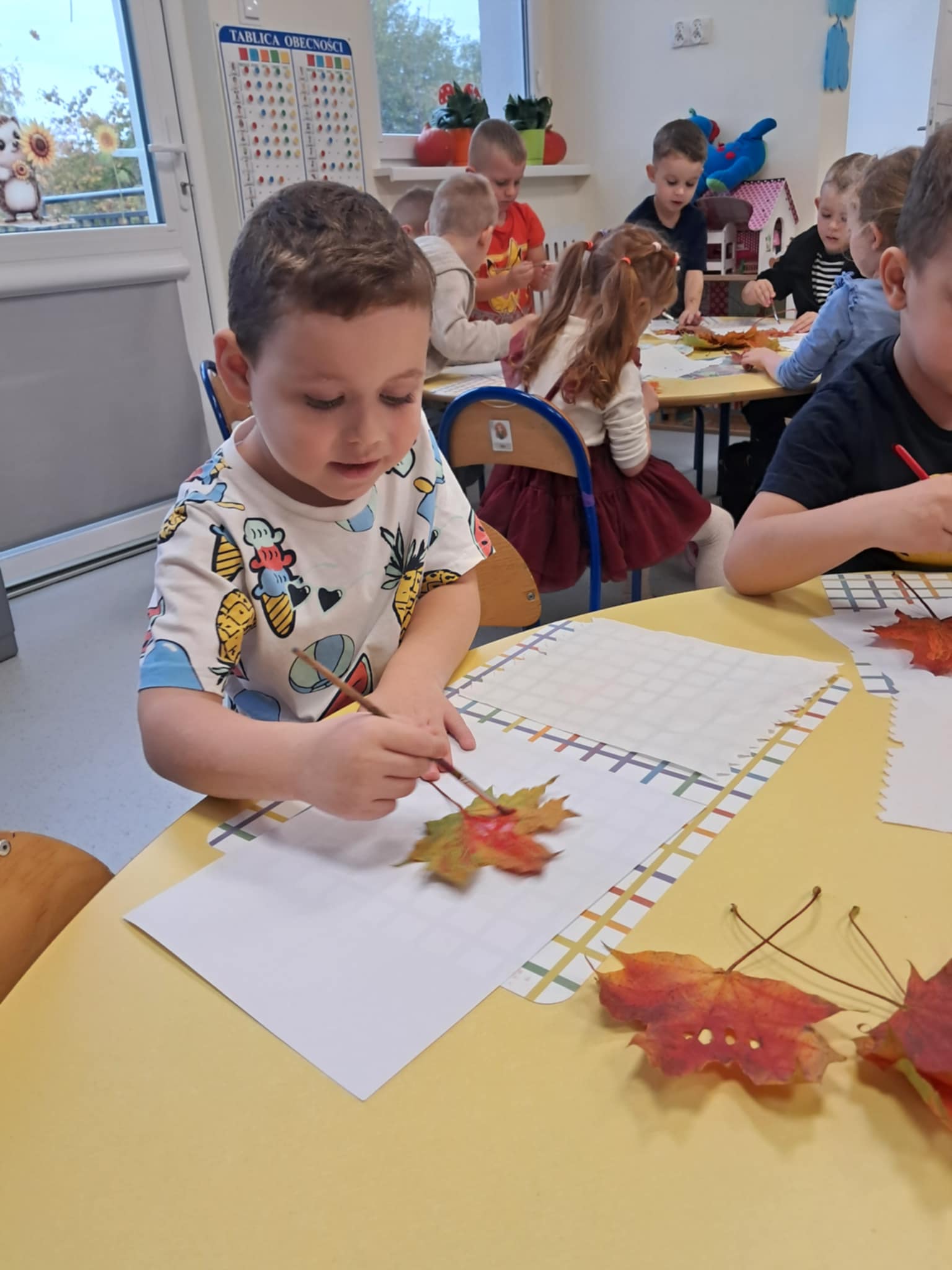 NastÄ™pnie wykonaliÅ›my pracÄ™ plastycznÄ… – malowaliÅ›my liÅ›cie farbami, a potem odbijaliÅ›my je na kartkach, tworzÄ…c jesienne obrazki. Dzieci pracowaÅ‚y z dużym zaangażowaniem, a efekty byÅ‚y naprawdÄ™ piÄ™kne!