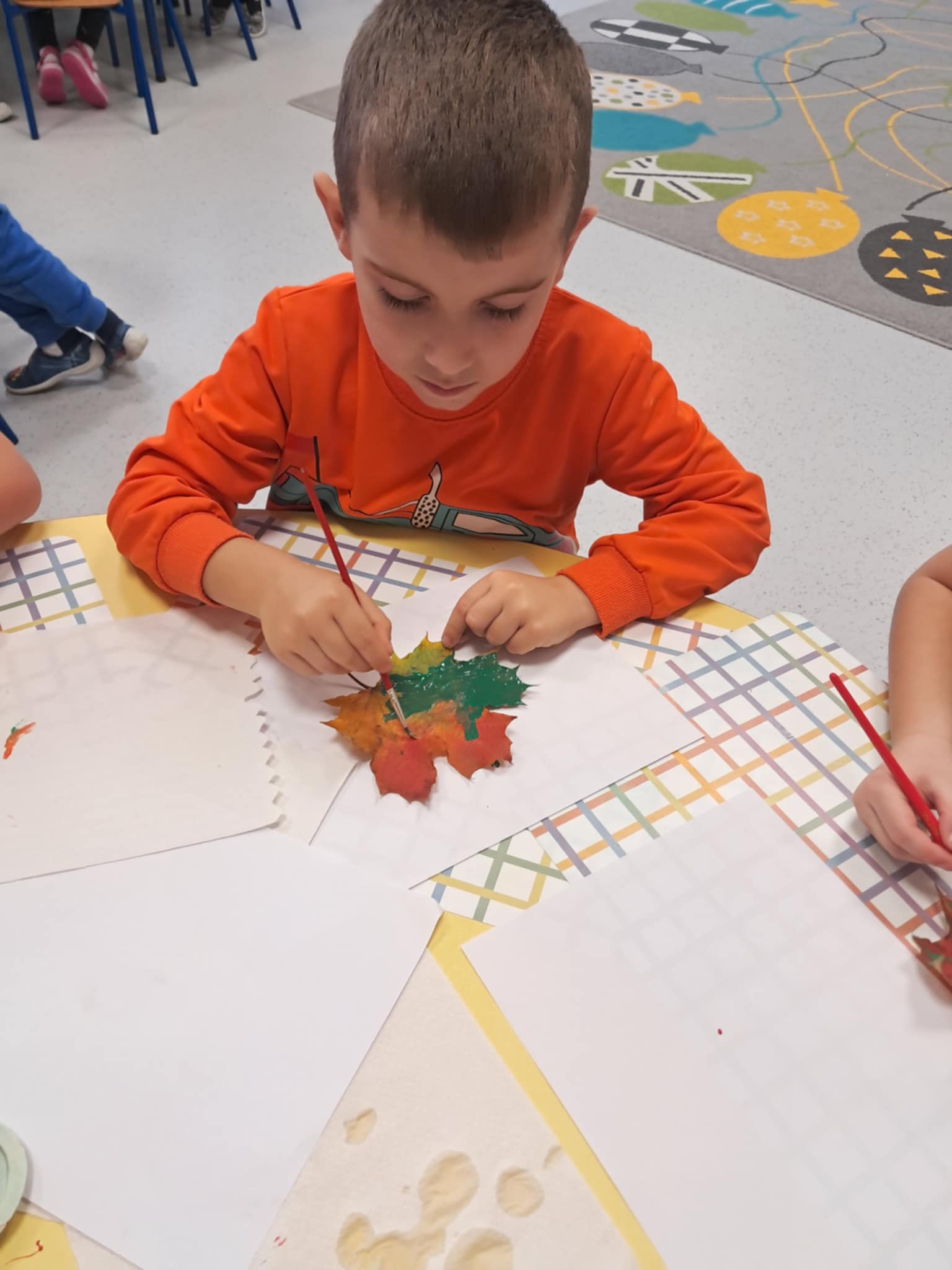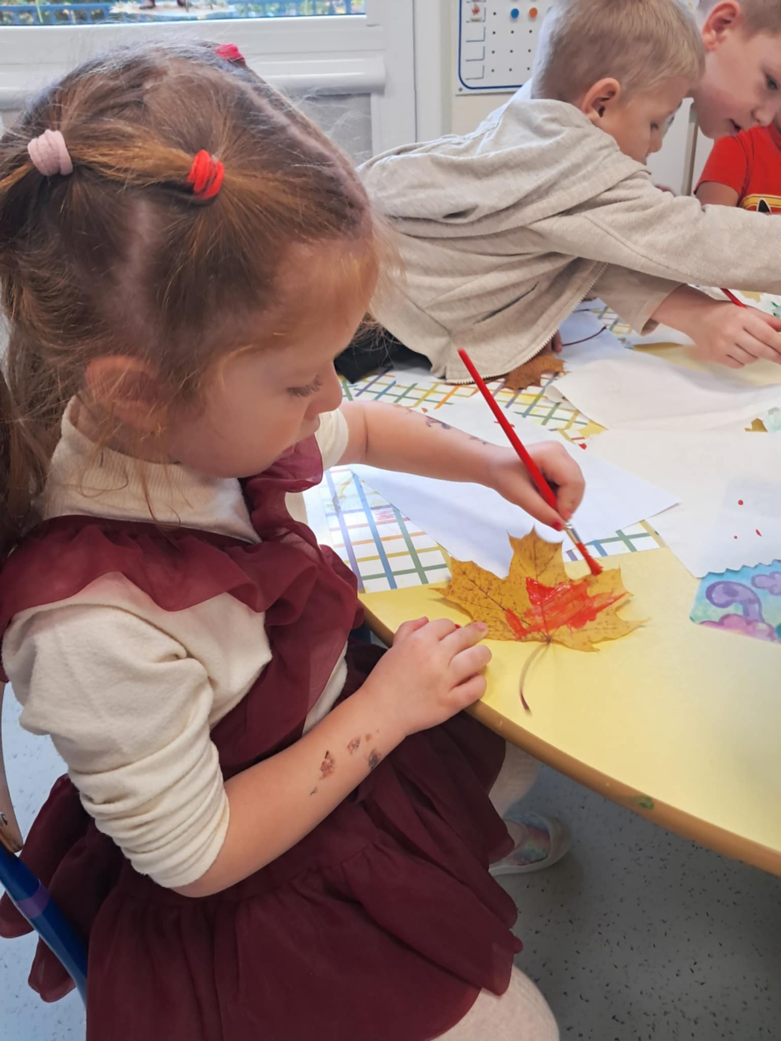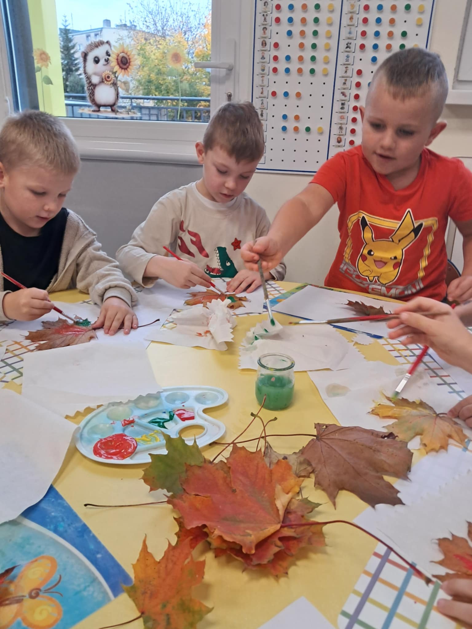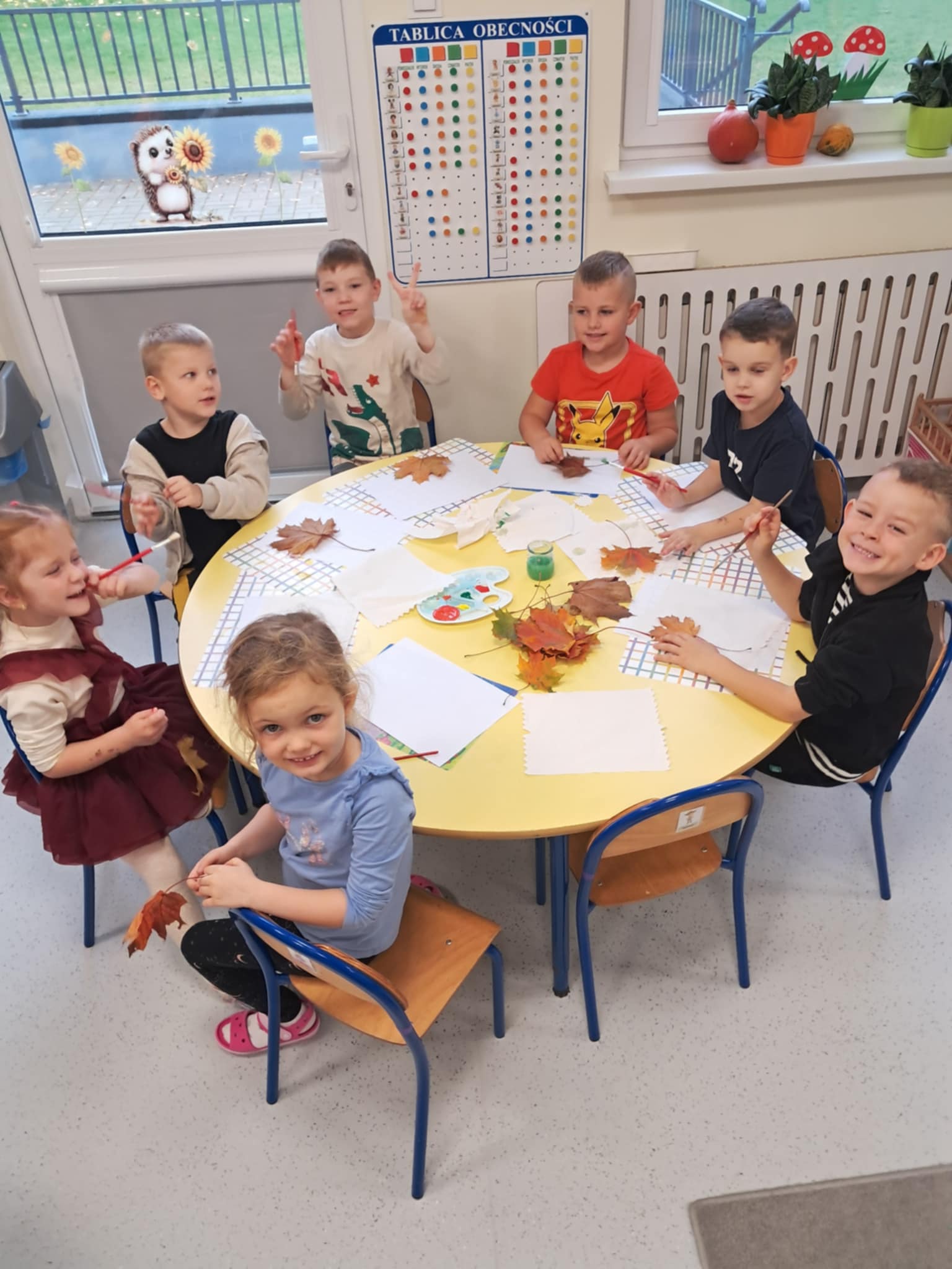 NastÄ™pnie wykonaliÅ›my pracÄ™ plastycznÄ… – malowaliÅ›my liÅ›cie farbami, a potem odbijaliÅ›my je na kartkach, tworzÄ…c jesienne obrazki. Dzieci pracowaÅ‚y z dużym zaangażowaniem, a efekty byÅ‚y naprawdÄ™ piÄ™kne!