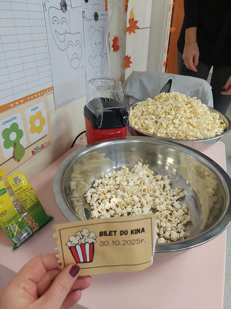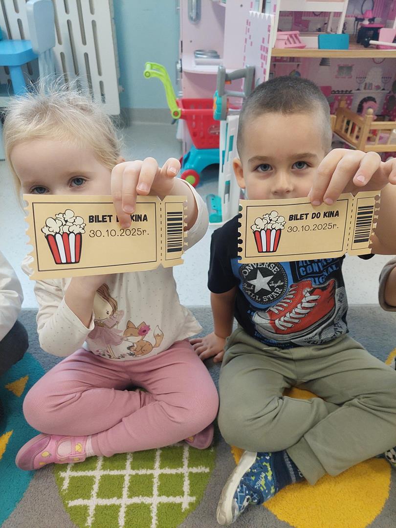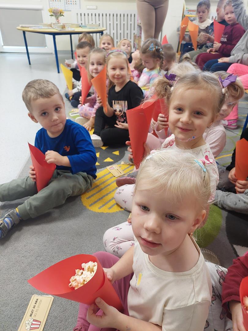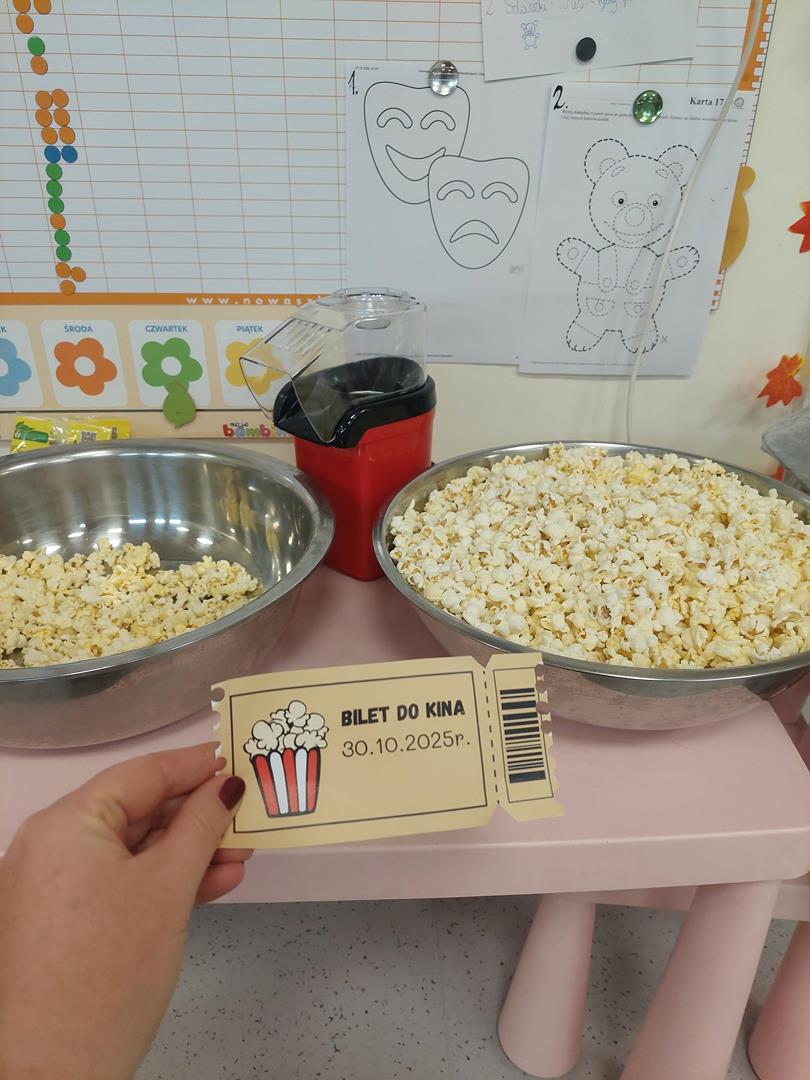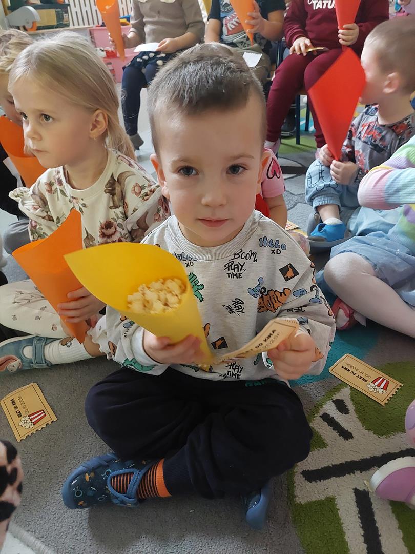 Wraz z grupą sąsiadującą wzięliśmy udział w seansie kinowym, oczywiście nie mogło zabraknąć biletów do kina i pysznego świeżego popcornu.
