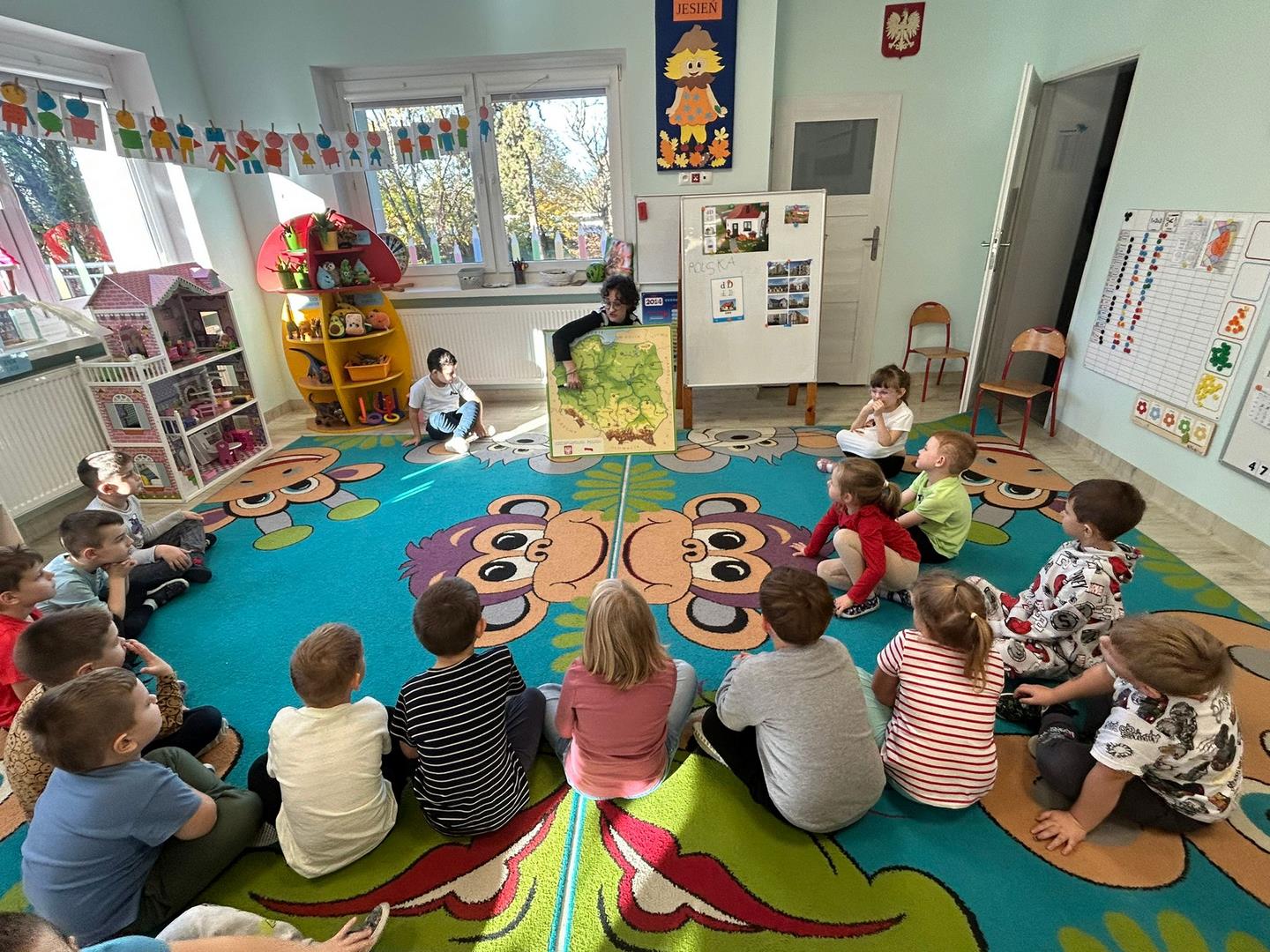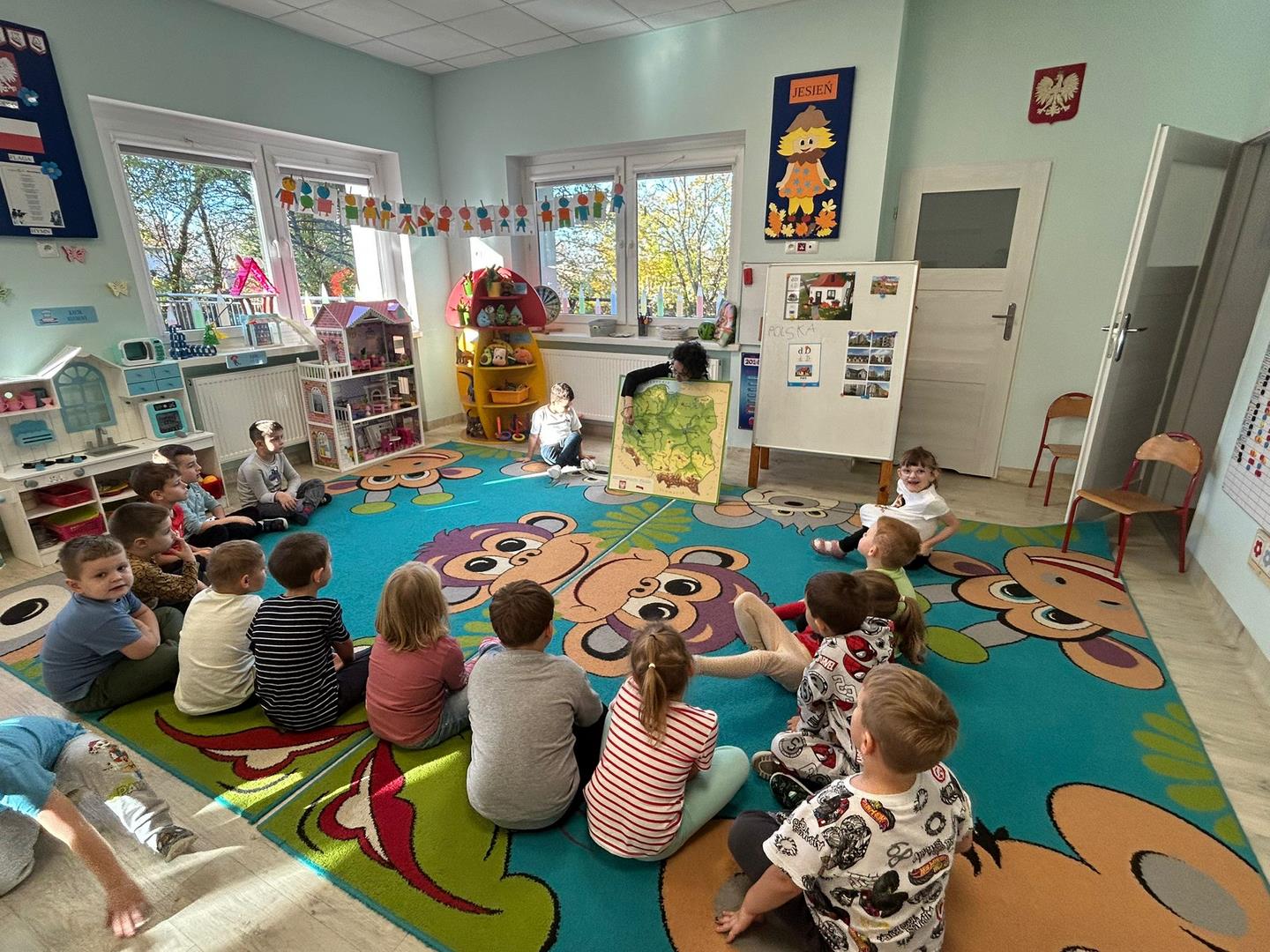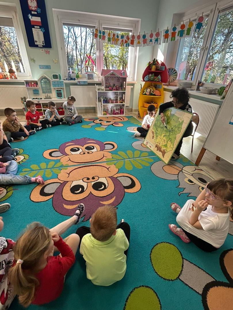 W naszej grupie odbywają się zajęcia dotyczące Polski. Dzieci poznały historię związaną z dniem 11 listopada. Pani pokazywała dzieciom na mapie, gdzie znajdują się góry, morze, niziny i wyżyny, a także opowiadała o naszych sąsiadach. Przedszkolaki z dużym zainteresowaniem słuchały i wskazywały poznane miejsca na mapie. Na zakończenie zajęć dzieci wykonały pracę plastyczną – pomalowały tekturowe liście w barwach biało-czerwonych, nawiązując do flagi naszego państwa. Zdobią naszą salę i przypominają nam, że jesteśmy patriotami i musimy pamiętać o wszystkich, którzy oddali życie za nasz kraj.