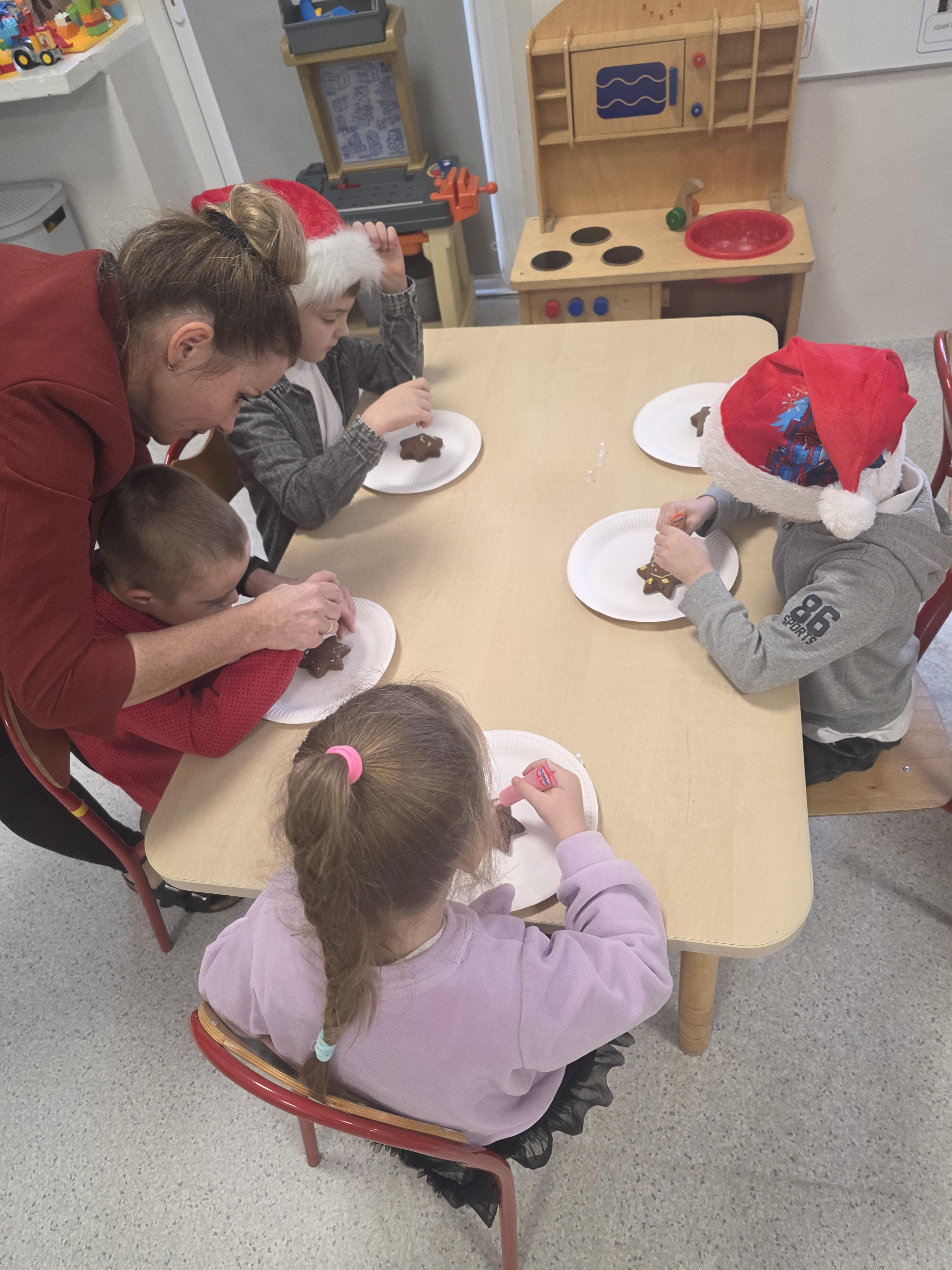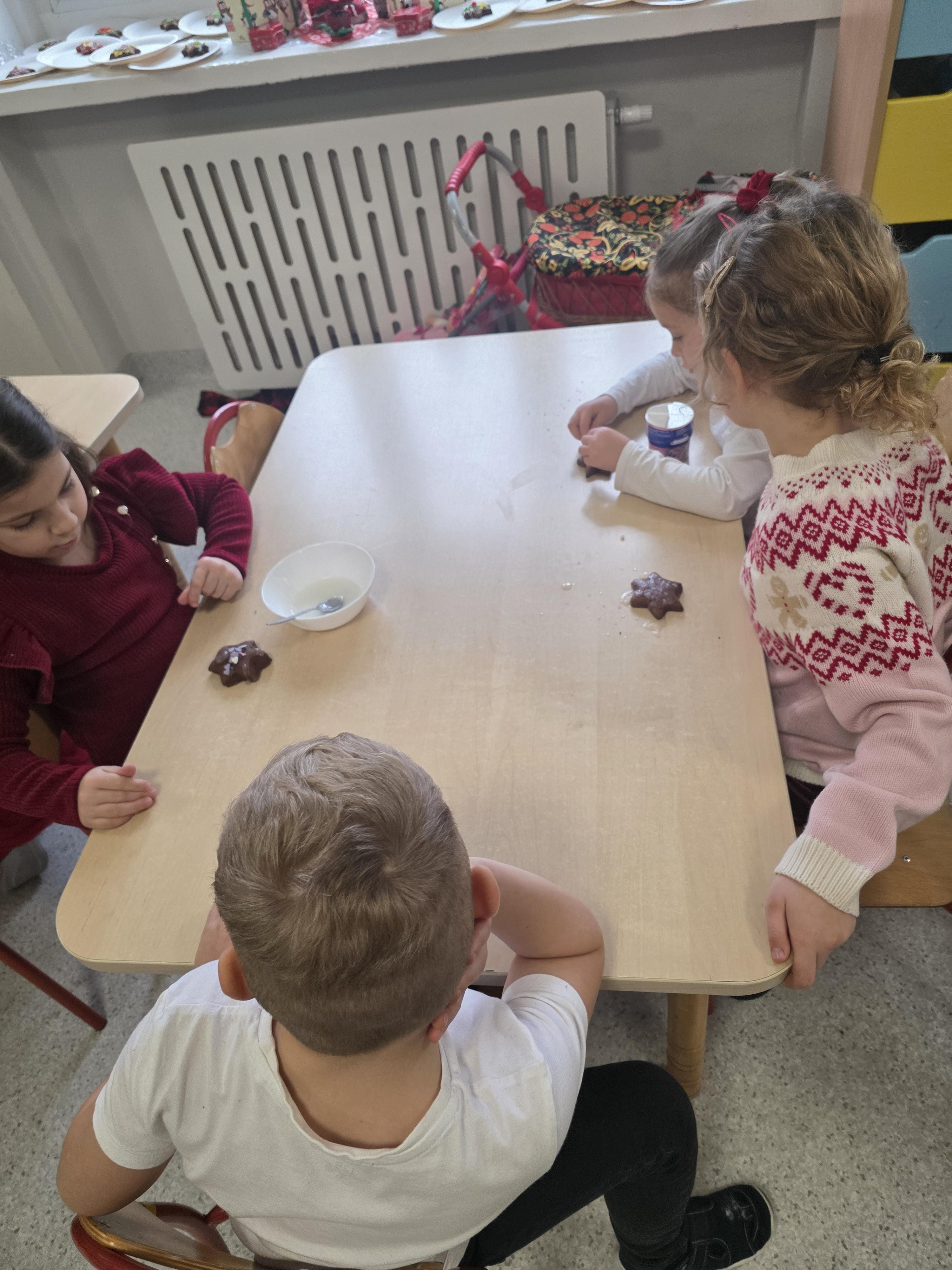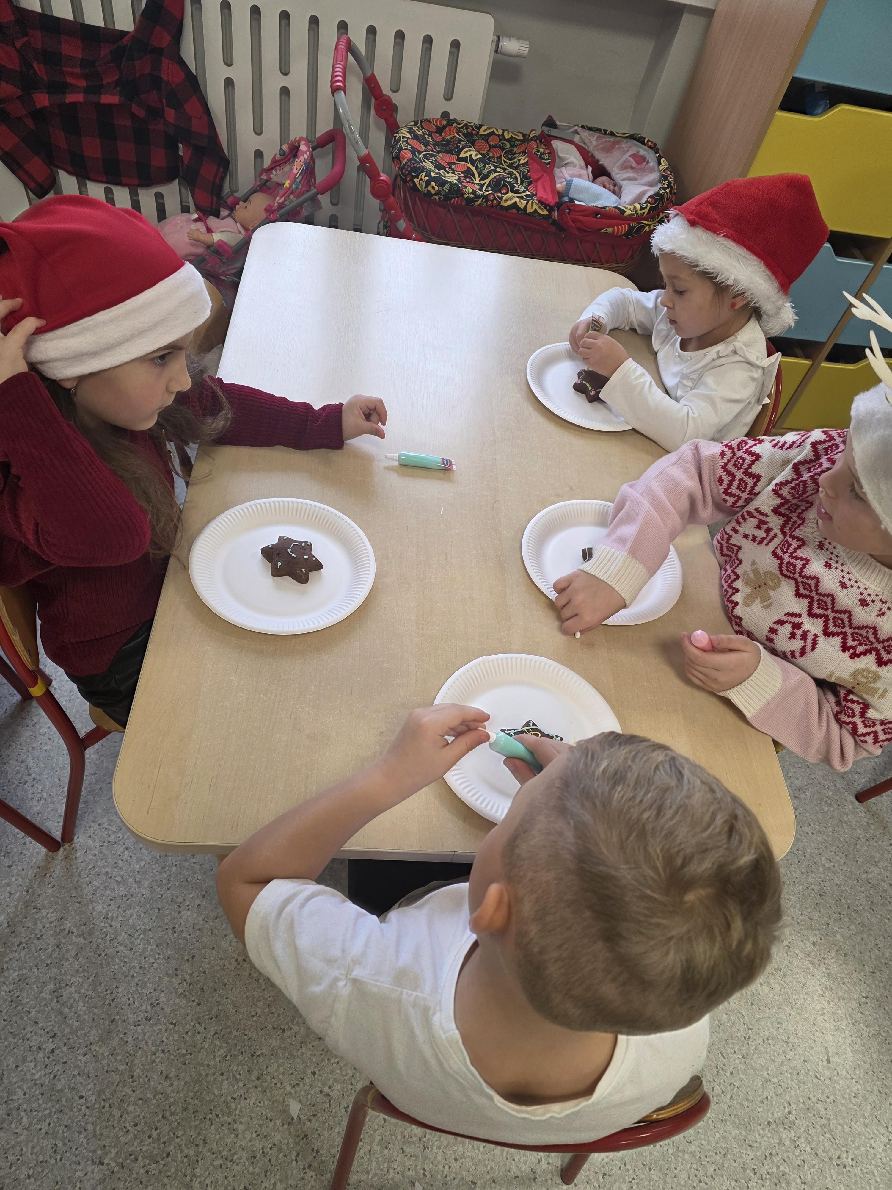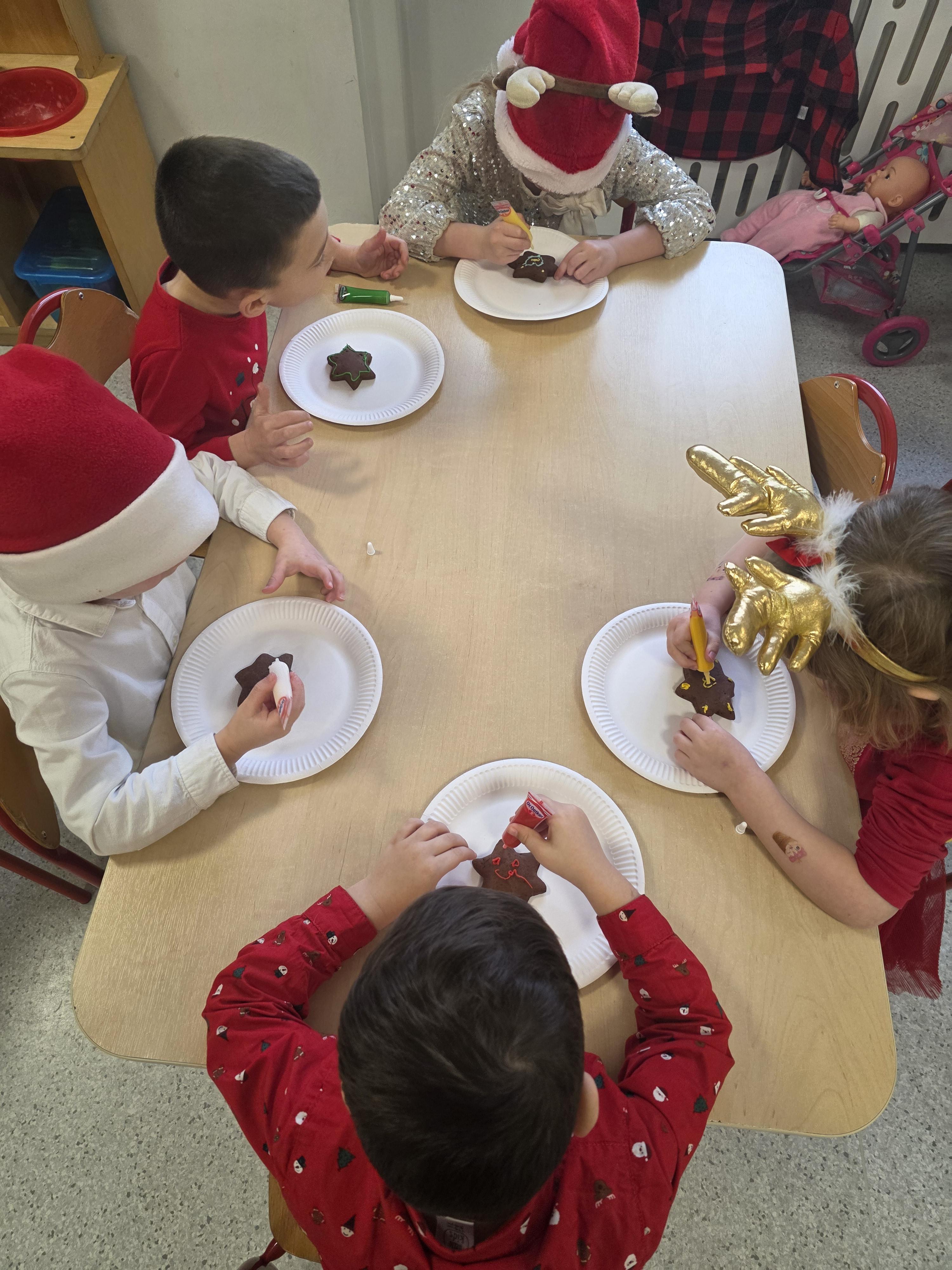 W naszej grupie przedszkolnej odbyły się radosne Mikołajki. Dzieci brały udział we wspólnych zabawach, śpiewały świąteczne piosenki, ozdabiały pierniczki posypkami i lukrem oraz z wielką radością przyjęły niespodzianki od św. Mikołaja. To był dzień pełen uśmiechów i świątecznej atmosfery.