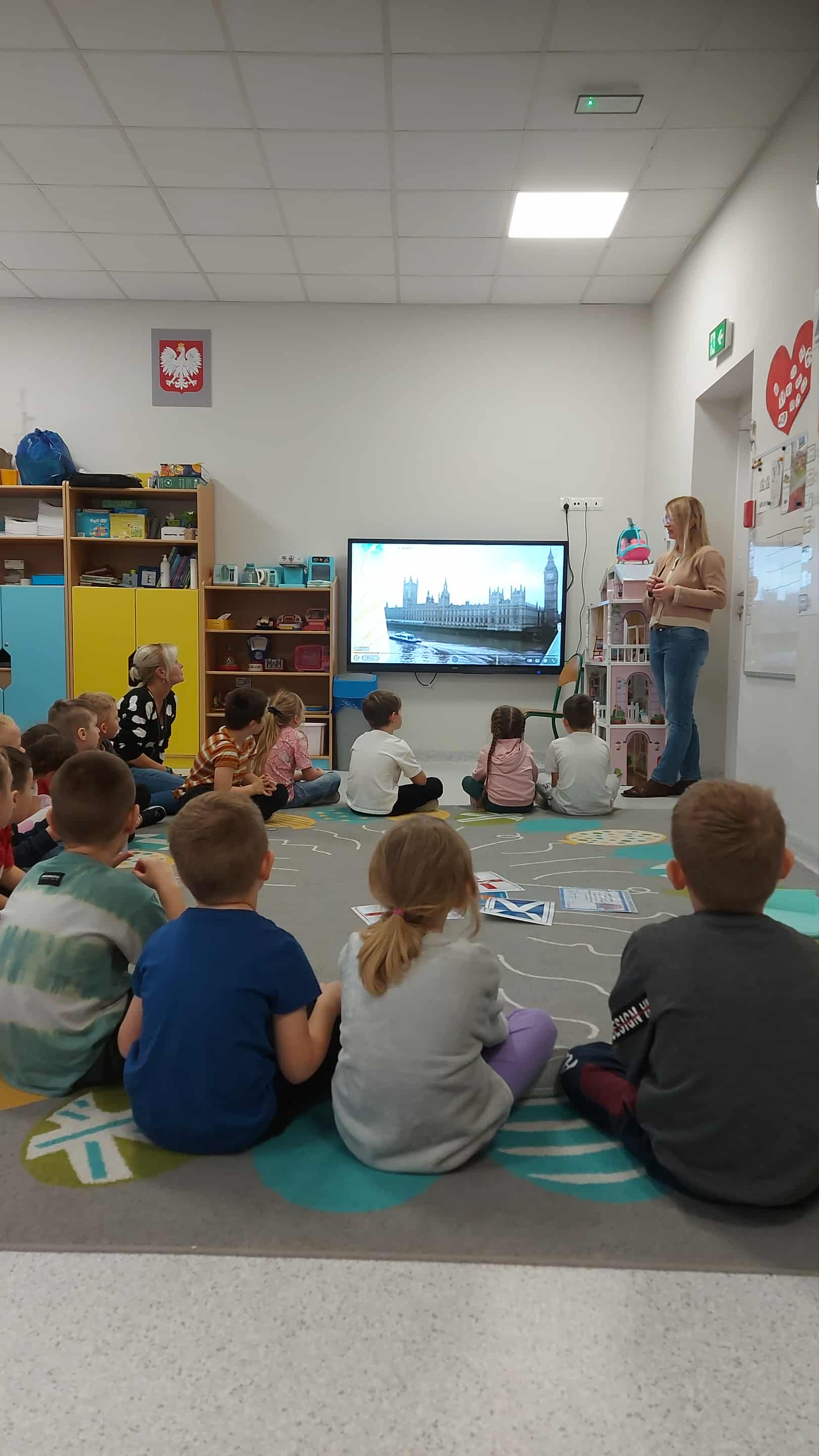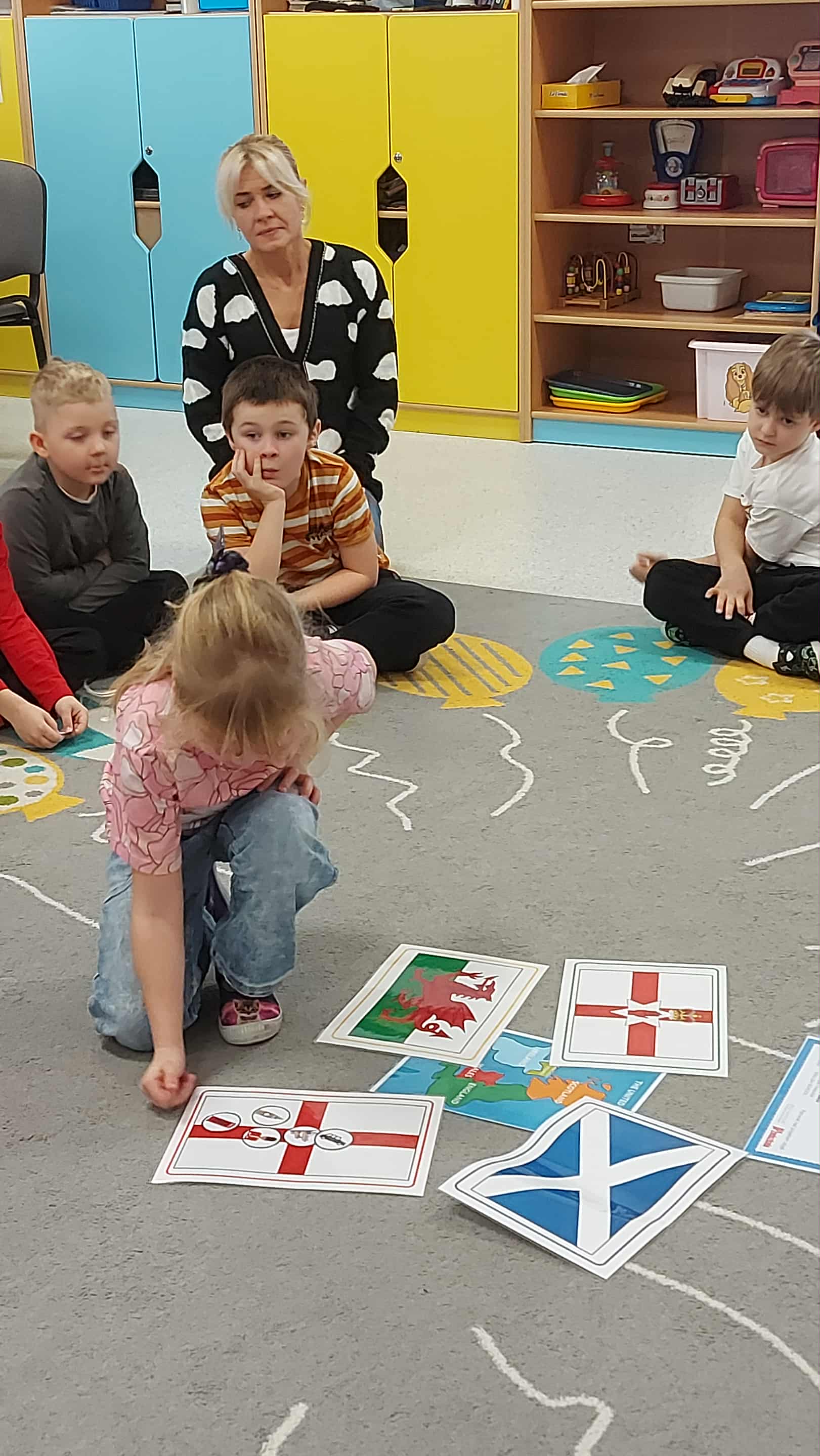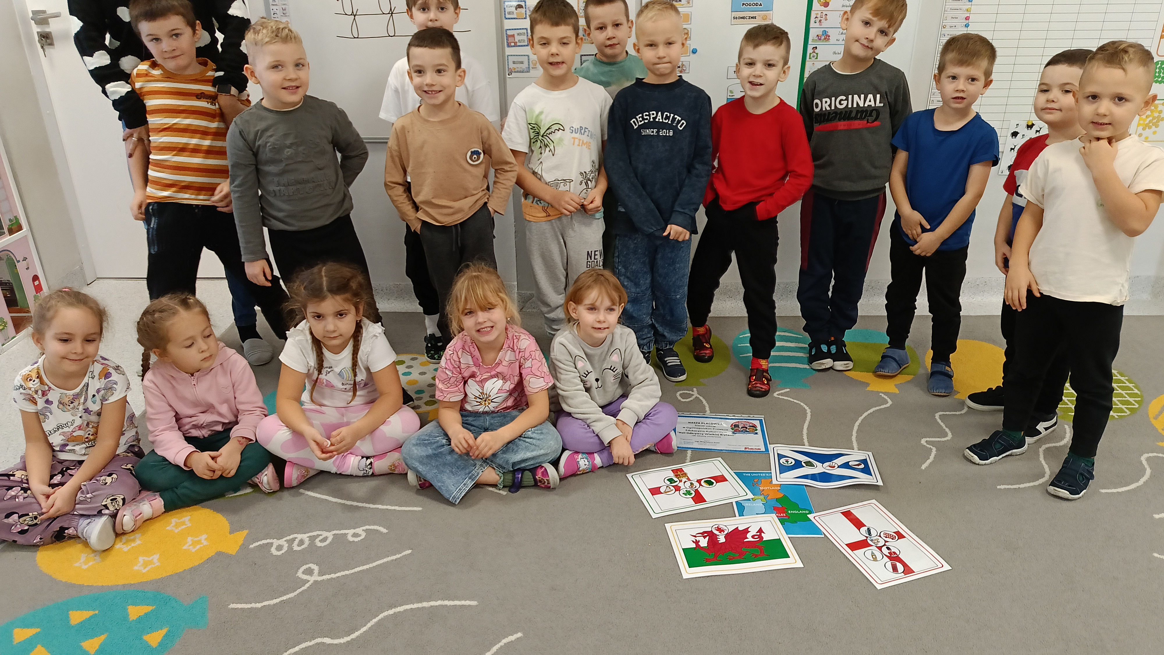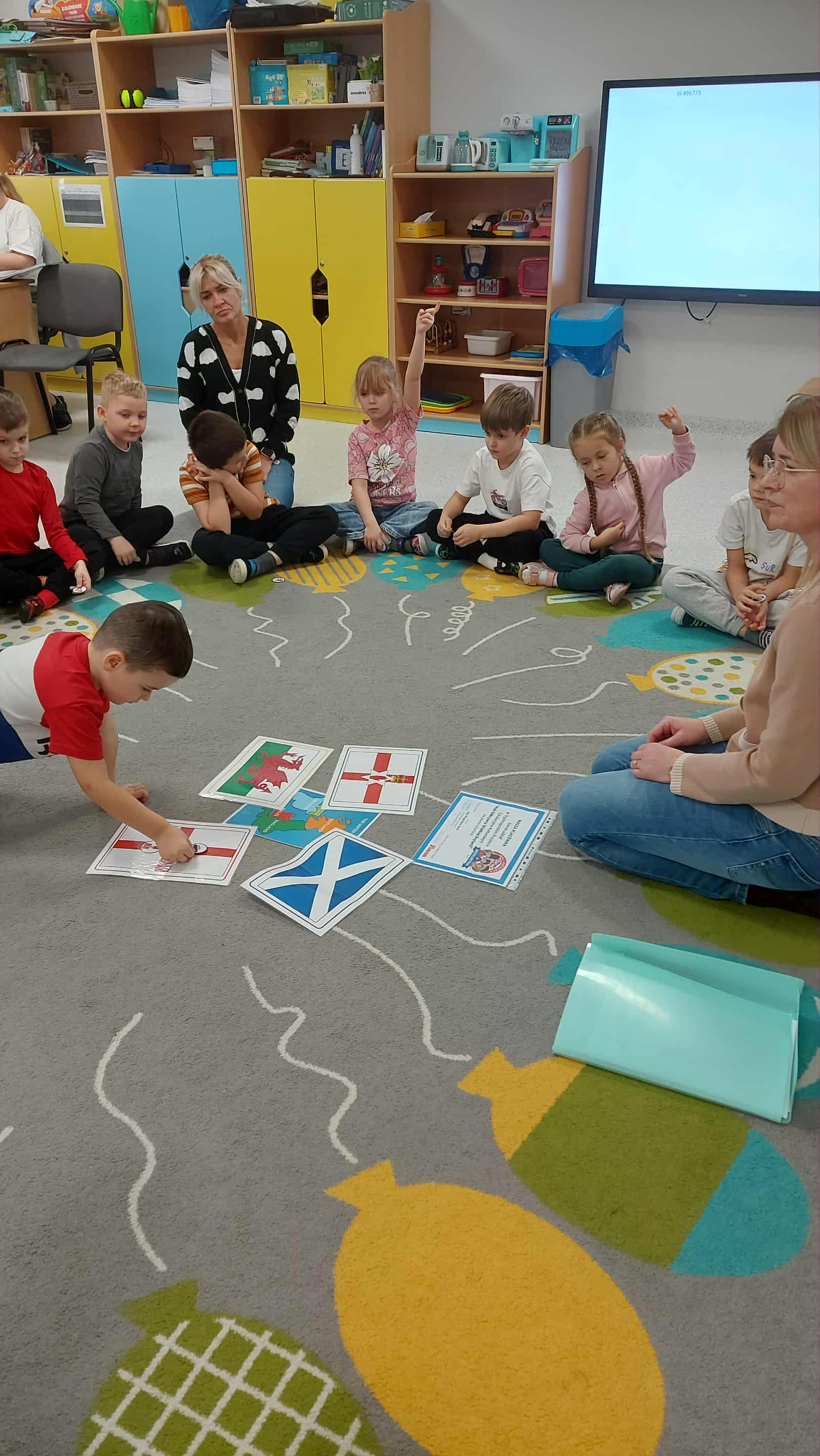 Dzieci z grupy Stokrotki podczas zajęć z języka angielskiego wykonały pierwsze zadanie z Ogólnopolskiego Projektu Edukacyjno -Kulturowego "Mali Odkrywcy Wielkiej Brytanii"- Map of the UK- zapoznanie z mapą Wielkiej Brytanii.