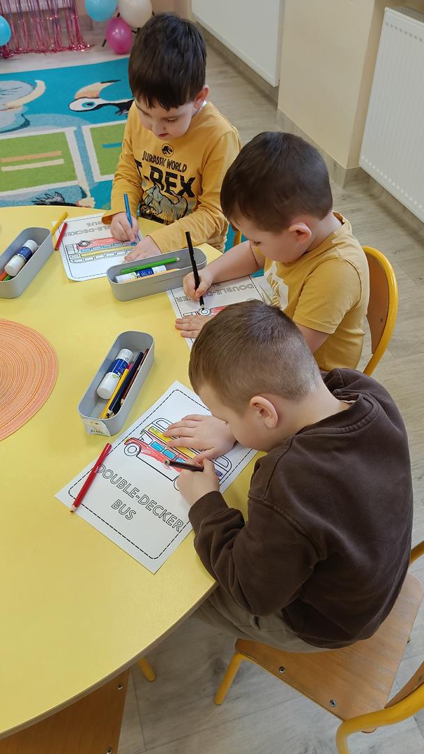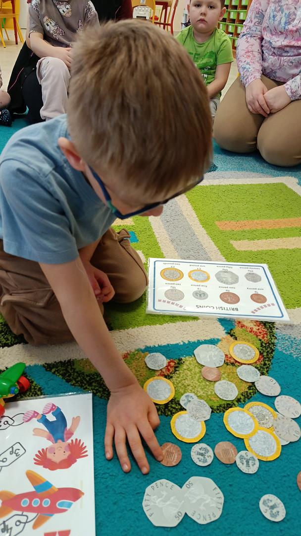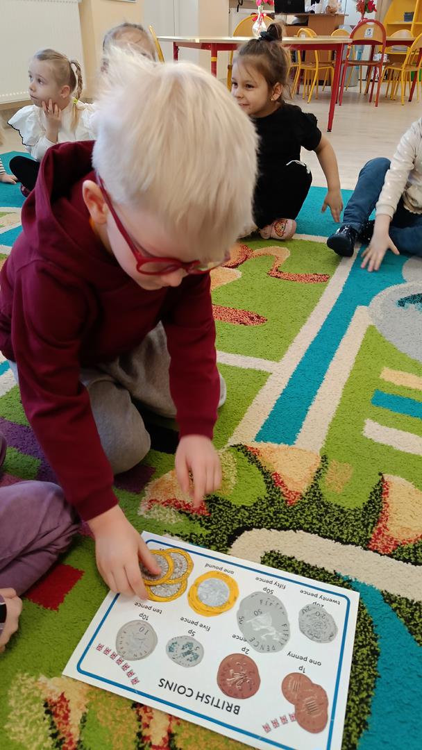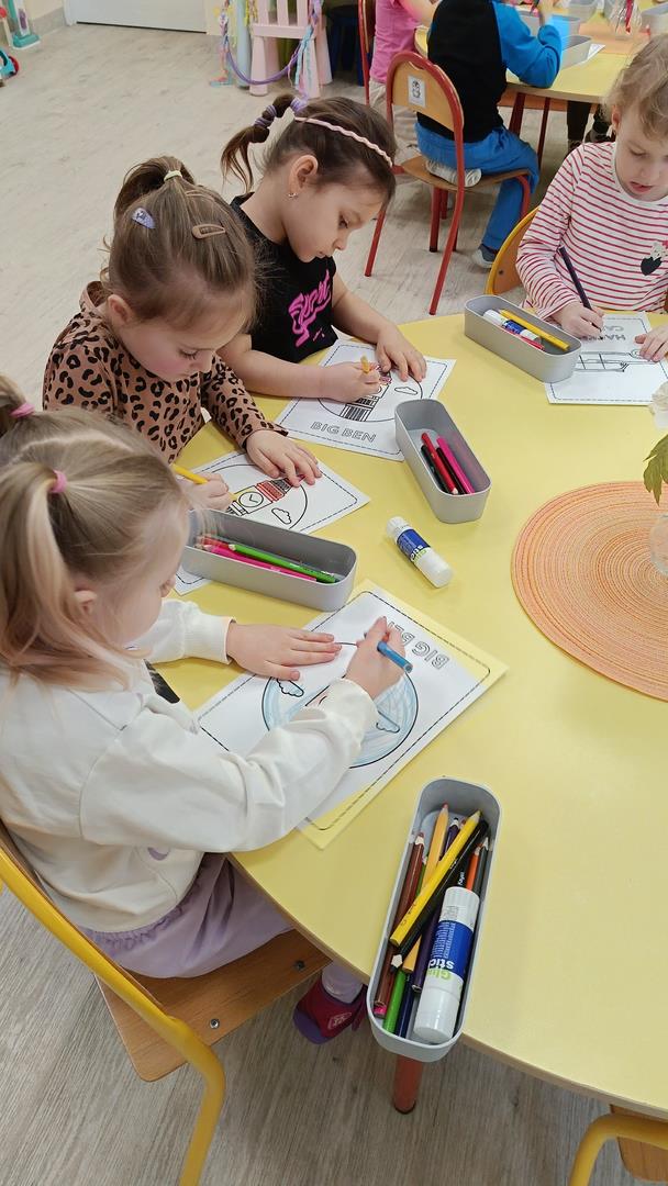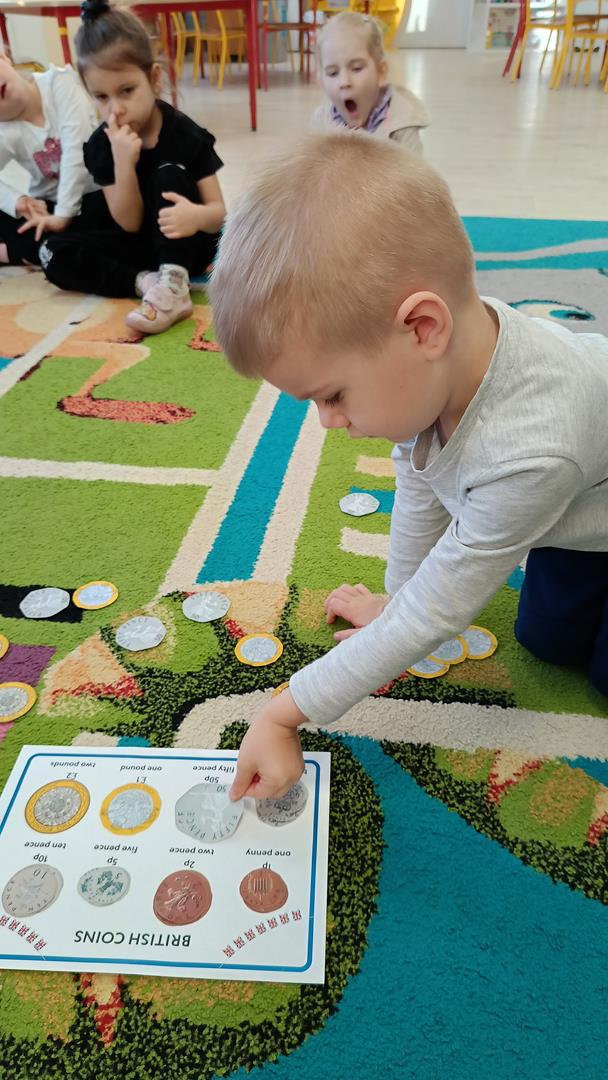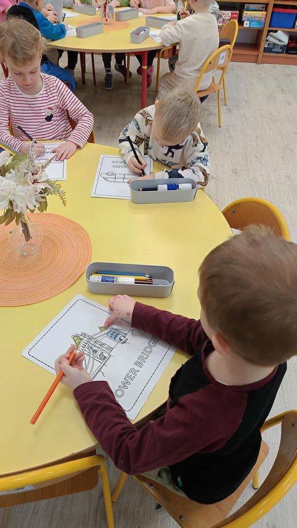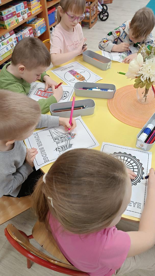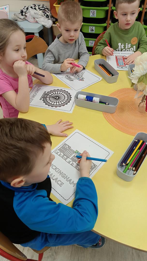 Podczas zajęć z języka angielskiego Przedszkolacy wykonują zadania z projektu "Mali Odkrywcy Wielkiej Brytanii": British Landmarks Coloring - stworzenie gazetki przedstawiającej znane brytyjskie zabytki, British Coins - zabawy z brytyjskimi monetami i banknotami, British Festiwal - poznanie zwyczaju Dnia Świętego Patryka.