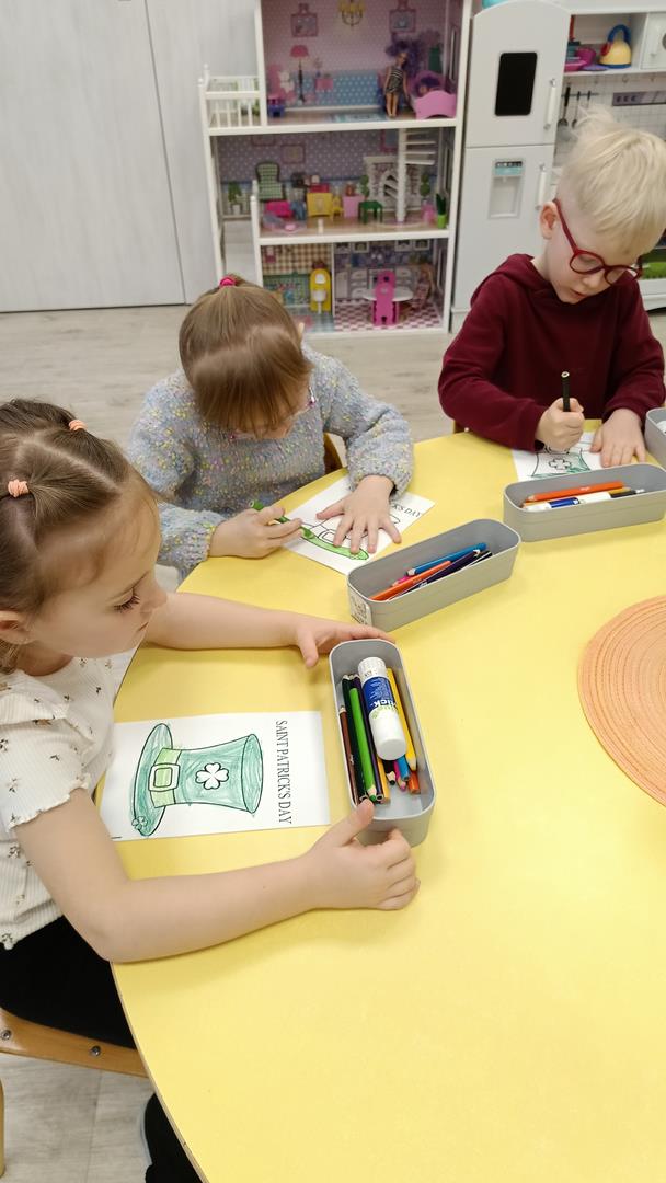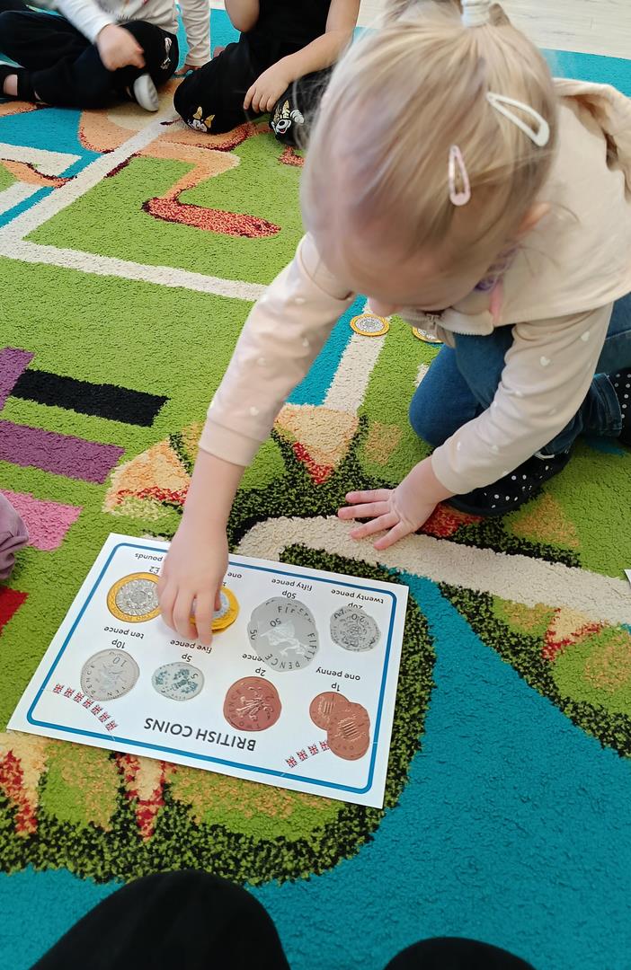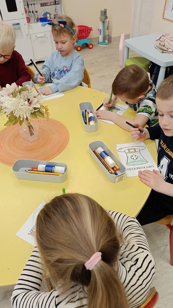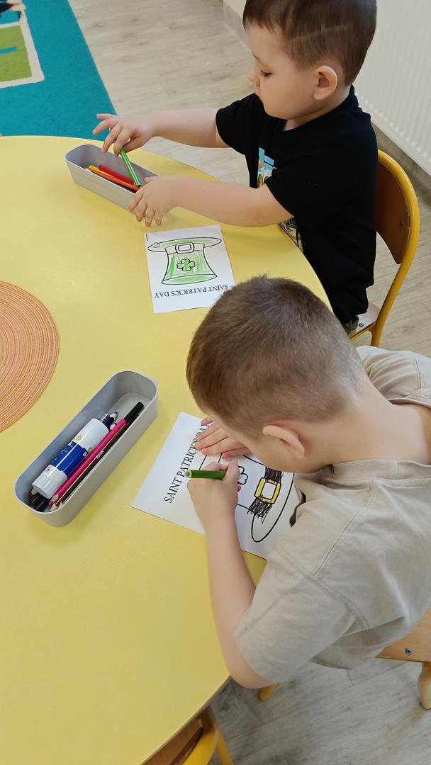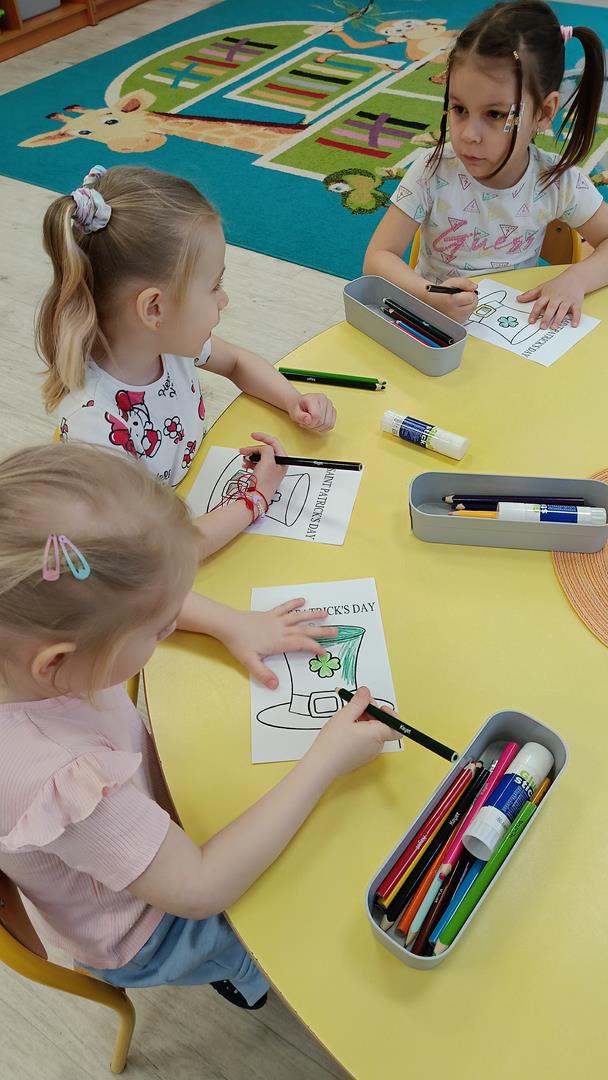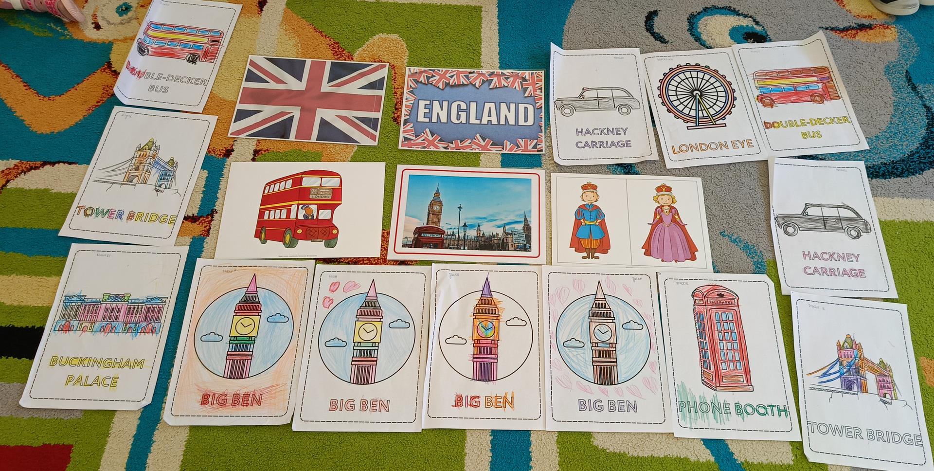 Podczas zajęć z języka angielskiego Przedszkolacy wykonują zadania z projektu "Mali Odkrywcy Wielkiej Brytanii": British Landmarks Coloring - stworzenie gazetki przedstawiającej znane brytyjskie zabytki, British Coins - zabawy z brytyjskimi monetami i banknotami, British Festiwal - poznanie zwyczaju Dnia Świętego Patryka.