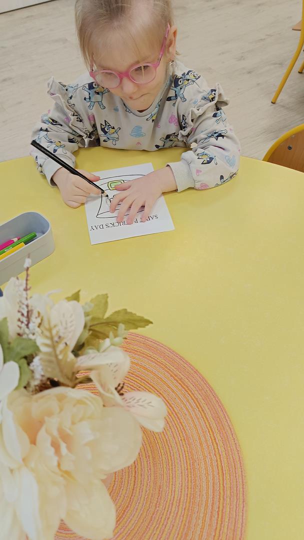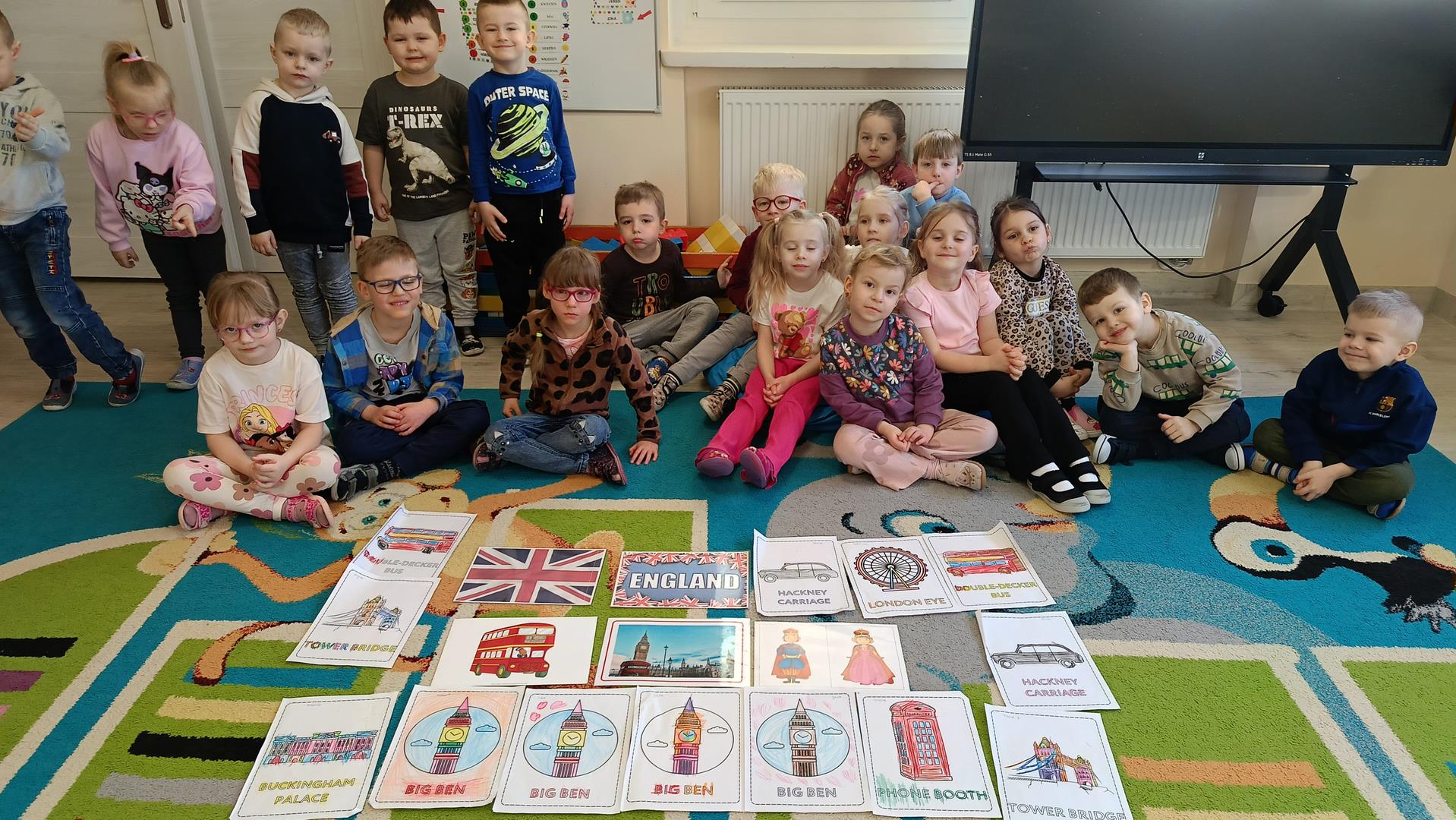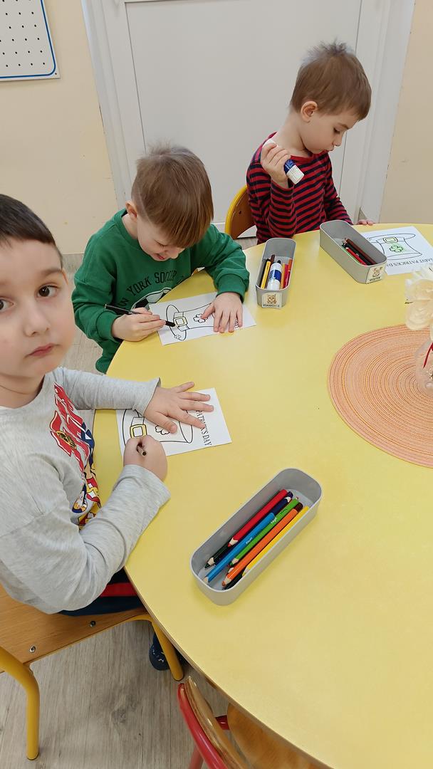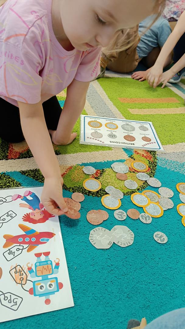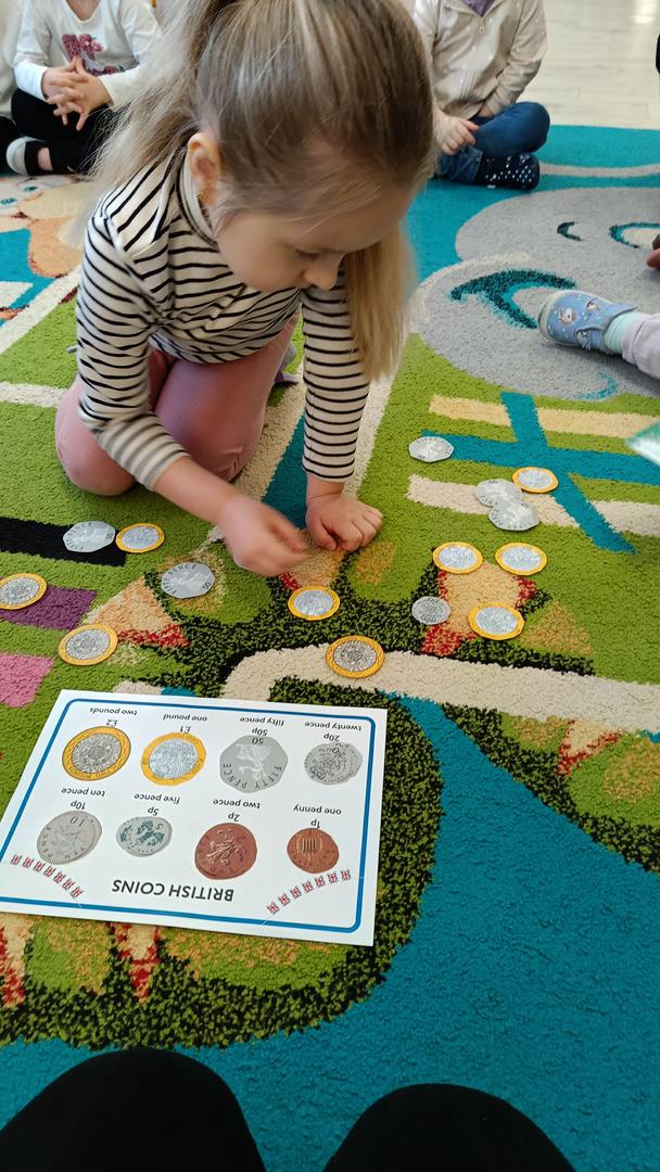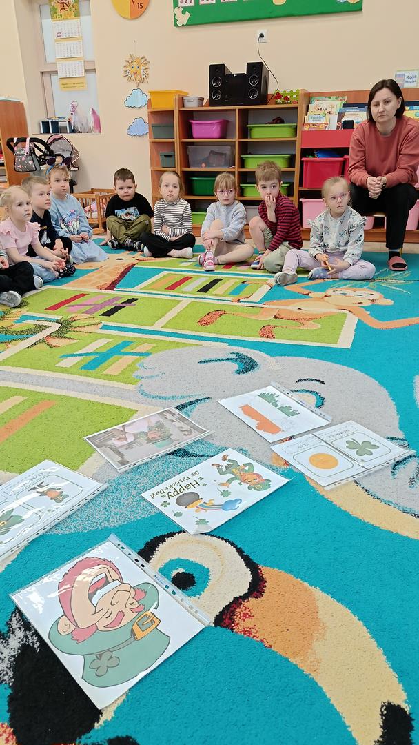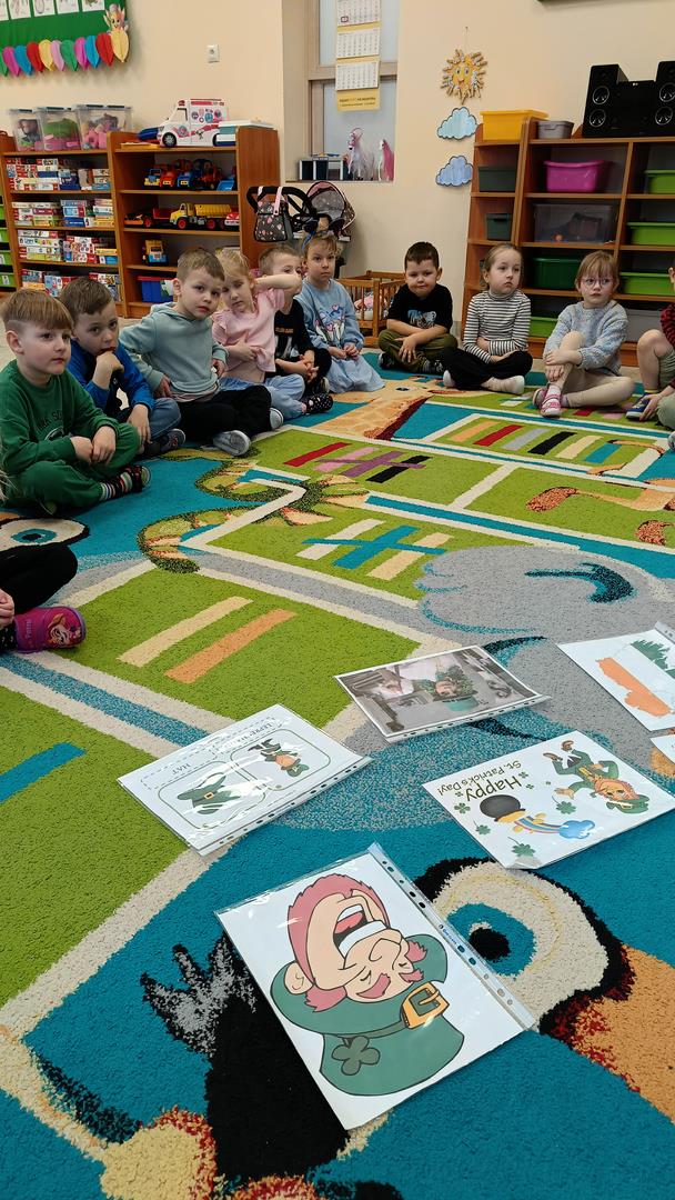 Podczas zajęć z języka angielskiego Przedszkolacy wykonują zadania z projektu "Mali Odkrywcy Wielkiej Brytanii": British Landmarks Coloring - stworzenie gazetki przedstawiającej znane brytyjskie zabytki, British Coins - zabawy z brytyjskimi monetami i banknotami, British Festiwal - poznanie zwyczaju Dnia Świętego Patryka.