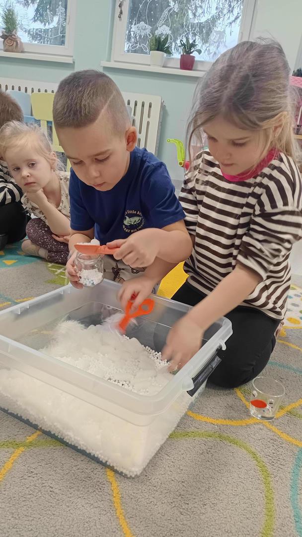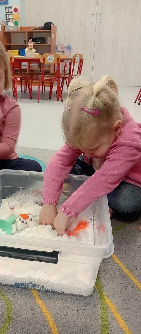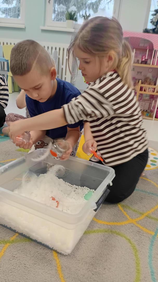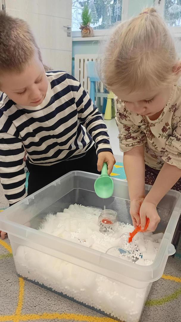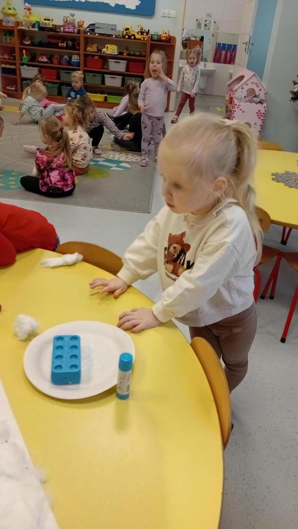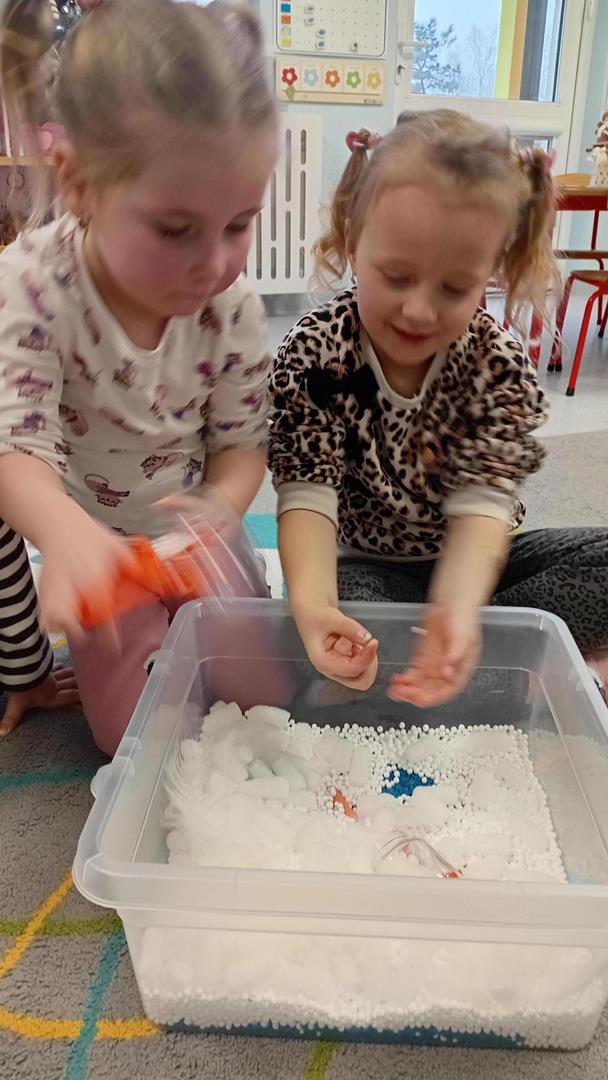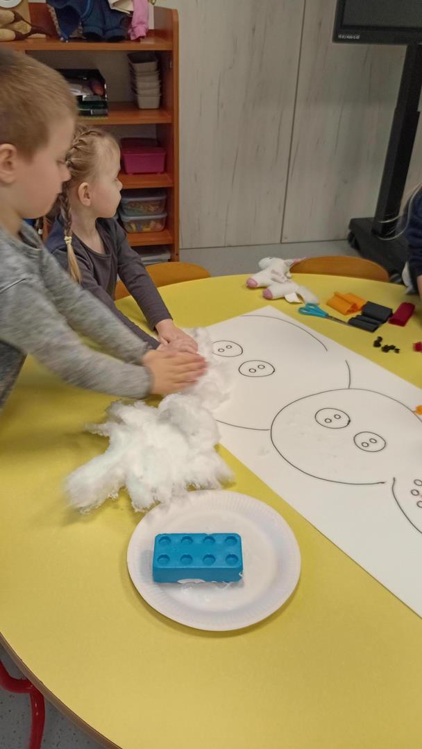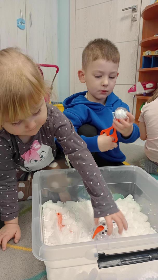 Dzieci uczestniczyły w zabawach sensorycznych z wykorzystaniem kuleczek styropianowych oraz niebieskiego ryżu. Przesypywały materiały, dotykały ich dłońmi oraz porównywały różne faktury. Zabawy sprzyjały rozwijaniu motoryki małej, koncentracji. Wykonały grupową pracę plastyczną pt. „Bałwanek z waty”. Przyklejały watę na kartkę, tworząc wspólną postać bałwanka, a następnie ozdabiały go dodatkowymi elementami. Praca rozwijała sprawność manualną oraz kreatywność dzieci jak również współpracę.