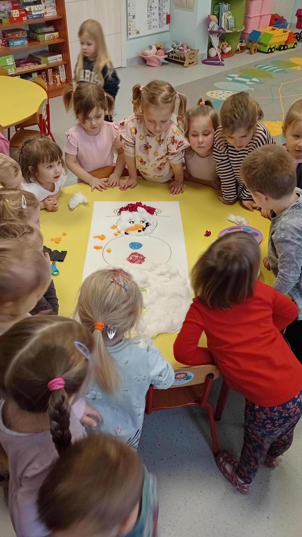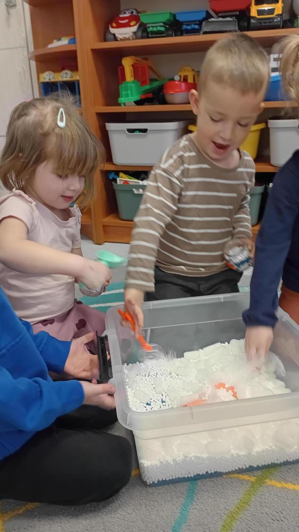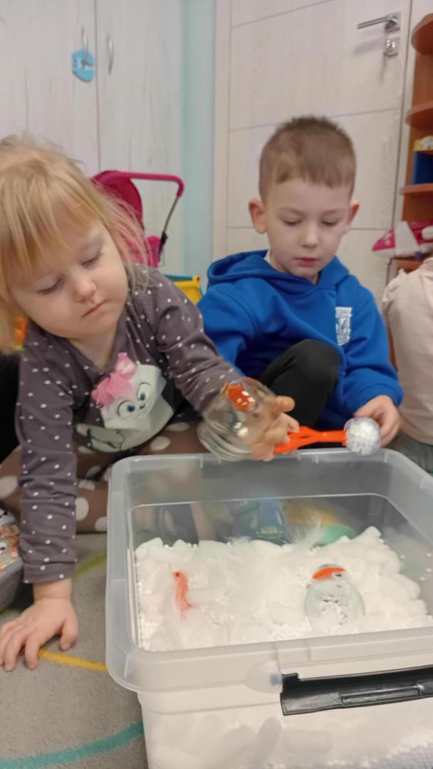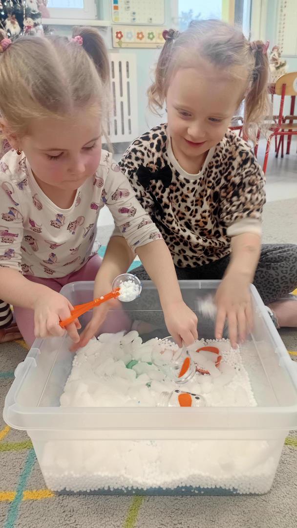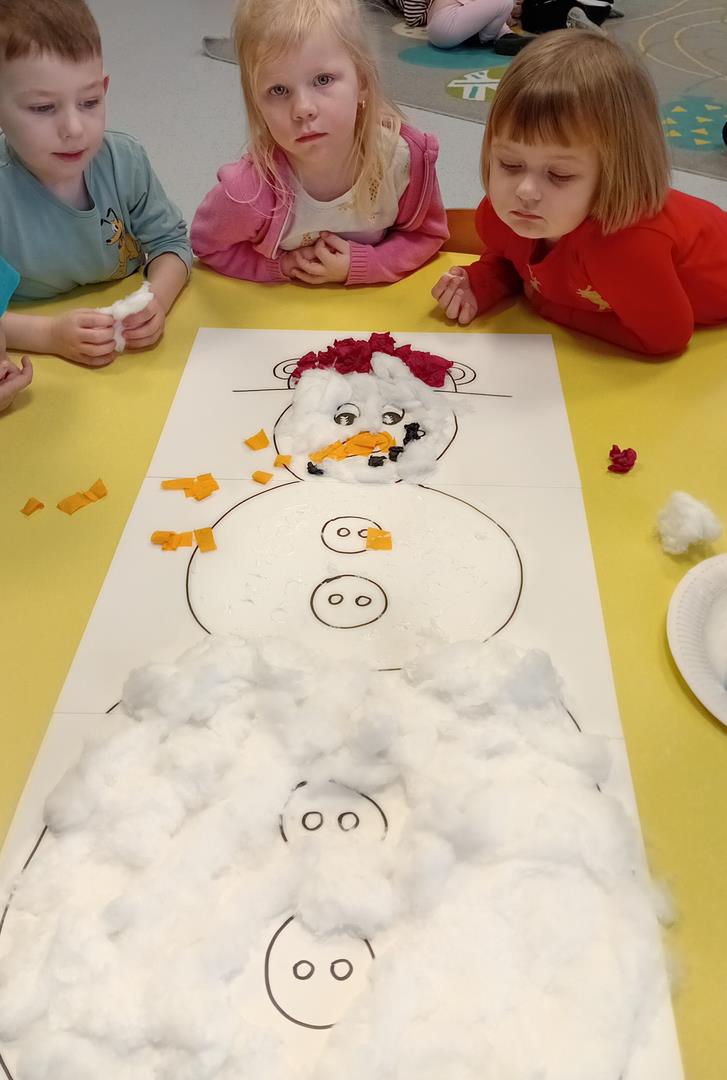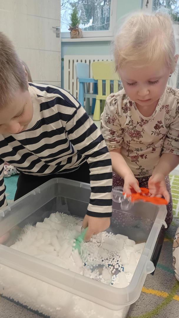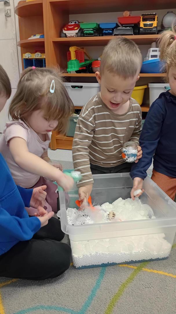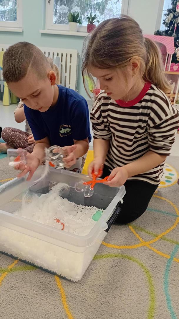 Dzieci uczestniczyły w zabawach sensorycznych z wykorzystaniem kuleczek styropianowych oraz niebieskiego ryżu. Przesypywały materiały, dotykały ich dłońmi oraz porównywały różne faktury. Zabawy sprzyjały rozwijaniu motoryki małej, koncentracji. Wykonały grupową pracę plastyczną pt. „Bałwanek z waty”. Przyklejały watę na kartkę, tworząc wspólną postać bałwanka, a następnie ozdabiały go dodatkowymi elementami. Praca rozwijała sprawność manualną oraz kreatywność dzieci jak również współpracę.
