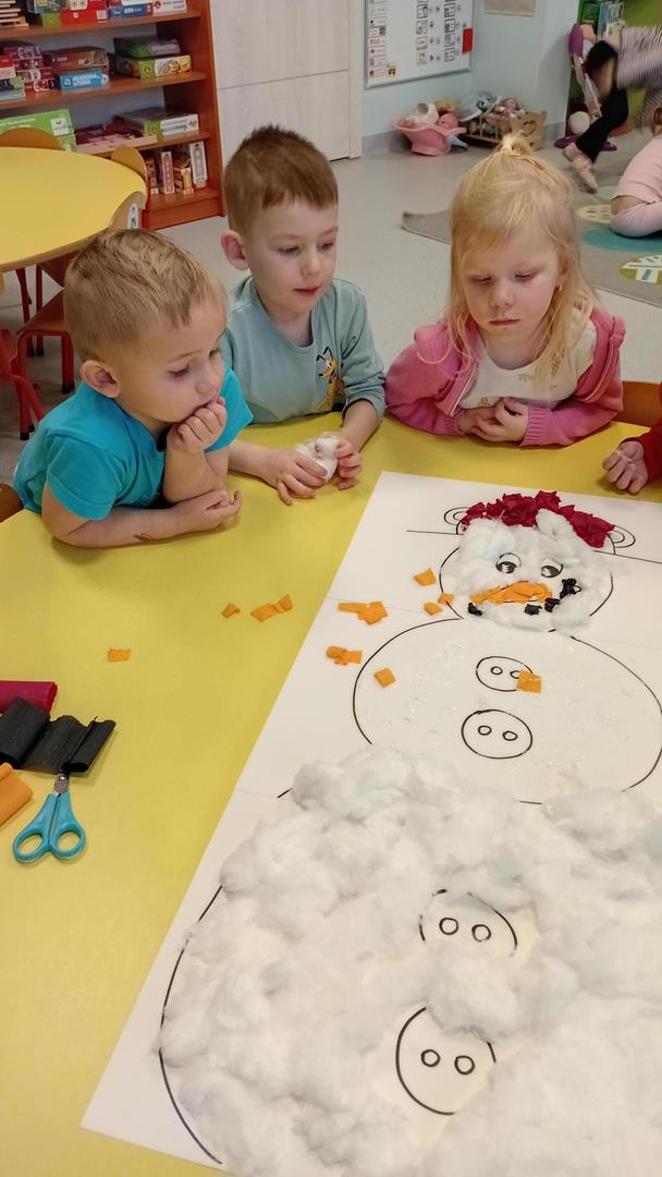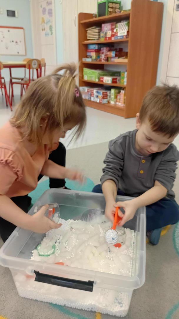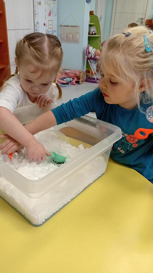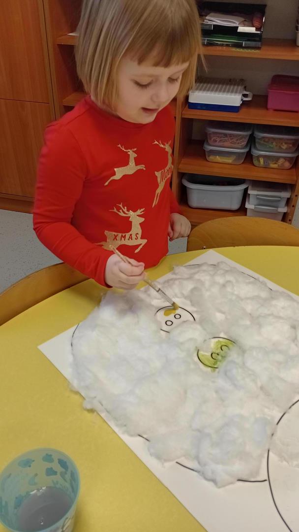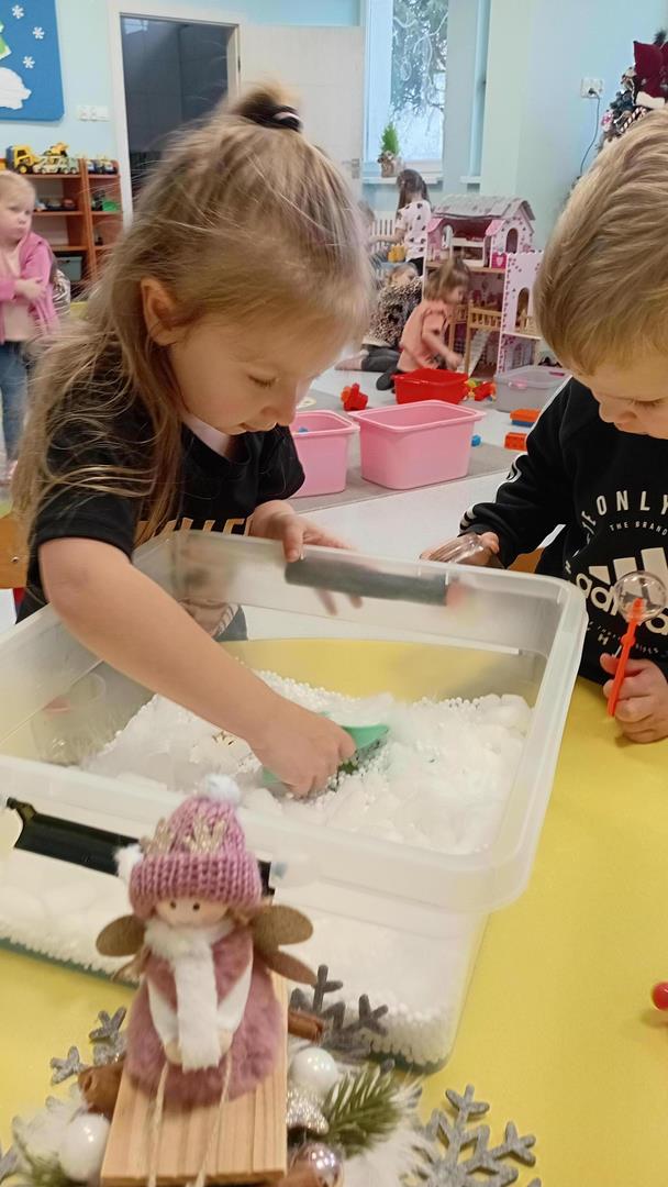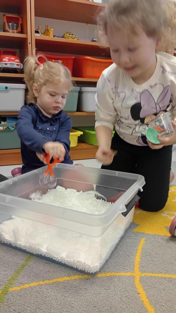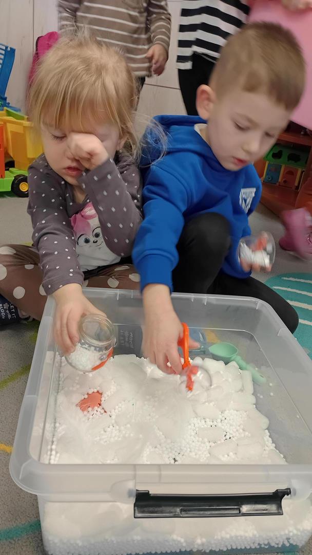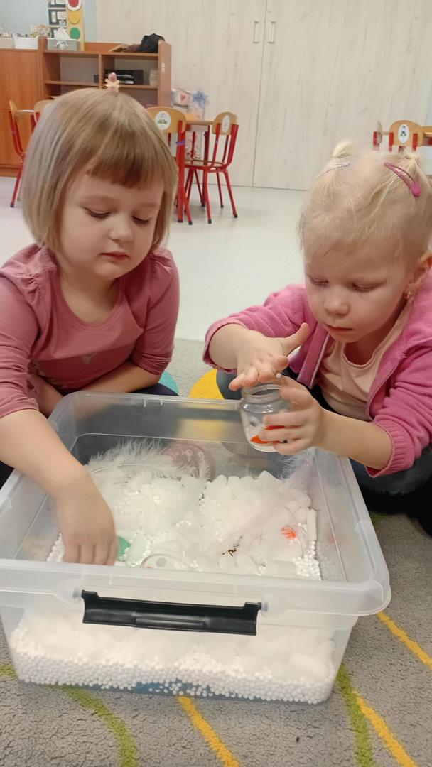 Dzieci uczestniczyły w zabawach sensorycznych z wykorzystaniem kuleczek styropianowych oraz niebieskiego ryżu. Przesypywały materiały, dotykały ich dłońmi oraz porównywały różne faktury. Zabawy sprzyjały rozwijaniu motoryki małej, koncentracji. Wykonały grupową pracę plastyczną pt. „Bałwanek z waty”. Przyklejały watę na kartkę, tworząc wspólną postać bałwanka, a następnie ozdabiały go dodatkowymi elementami. Praca rozwijała sprawność manualną oraz kreatywność dzieci jak również współpracę.