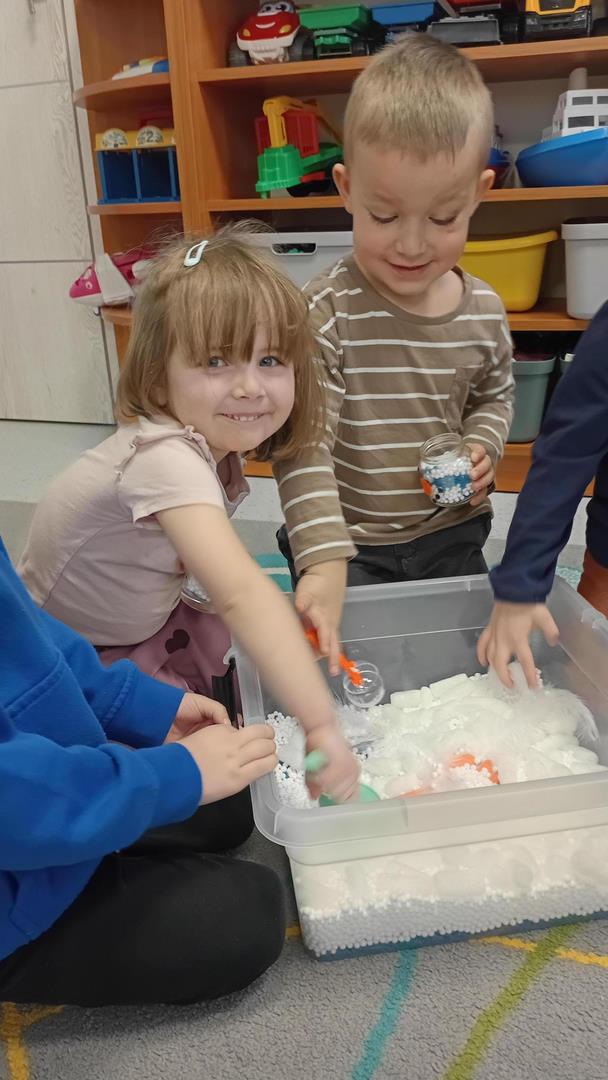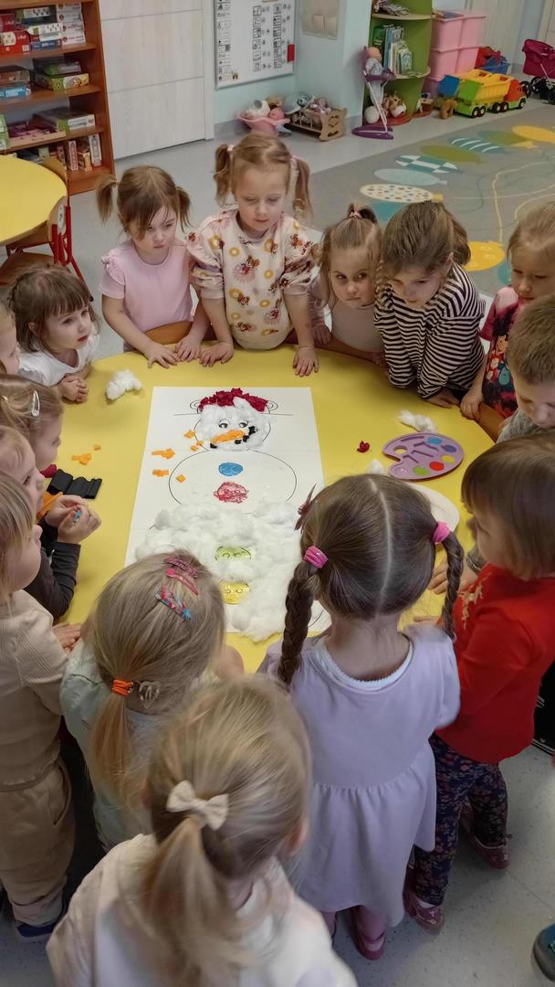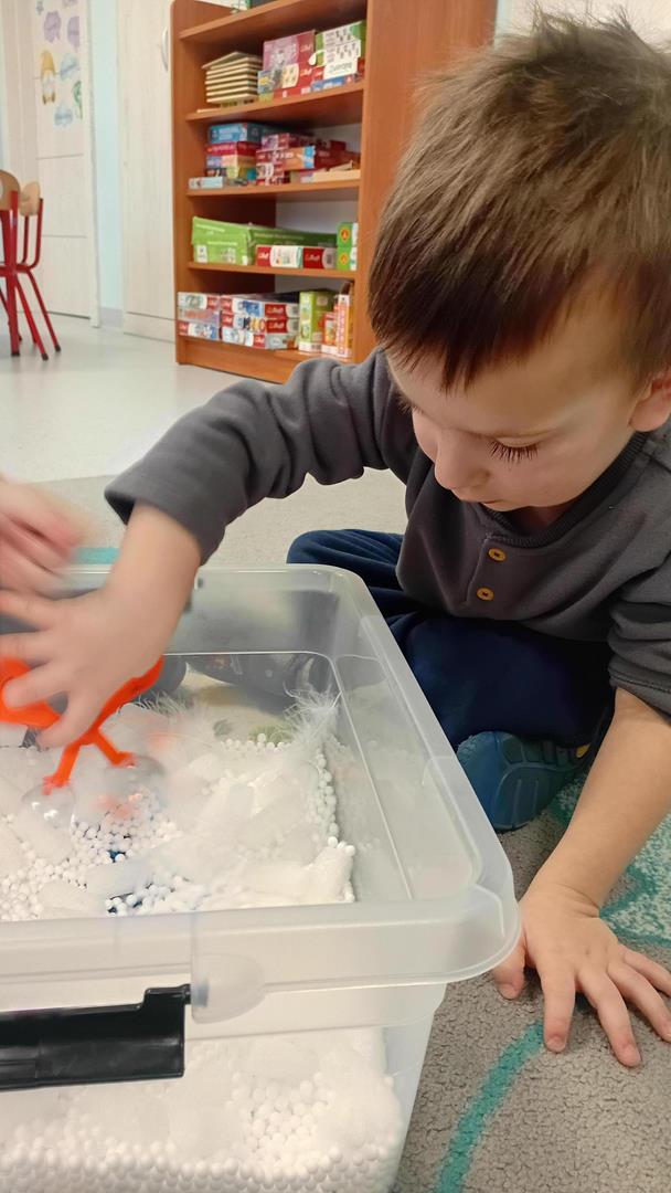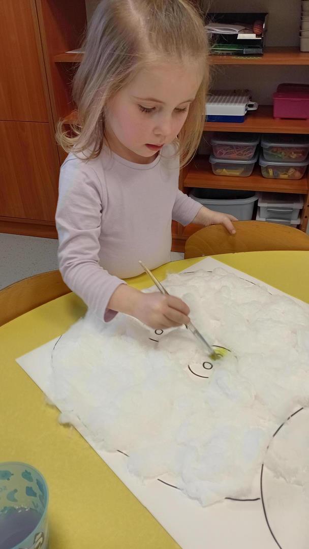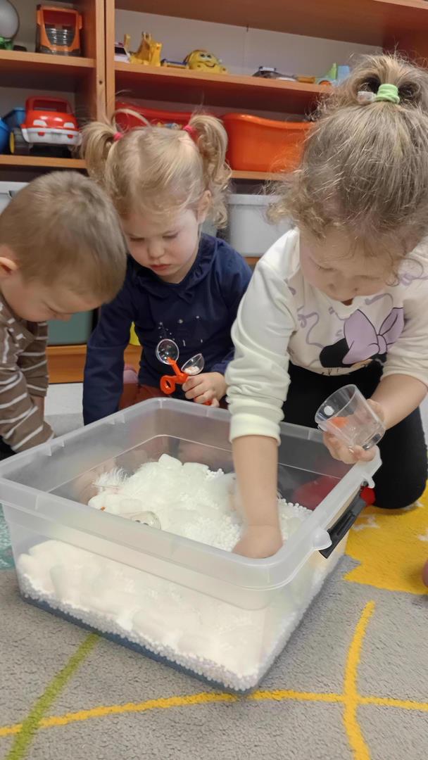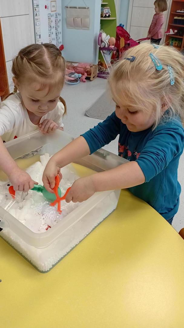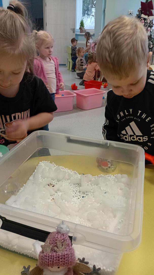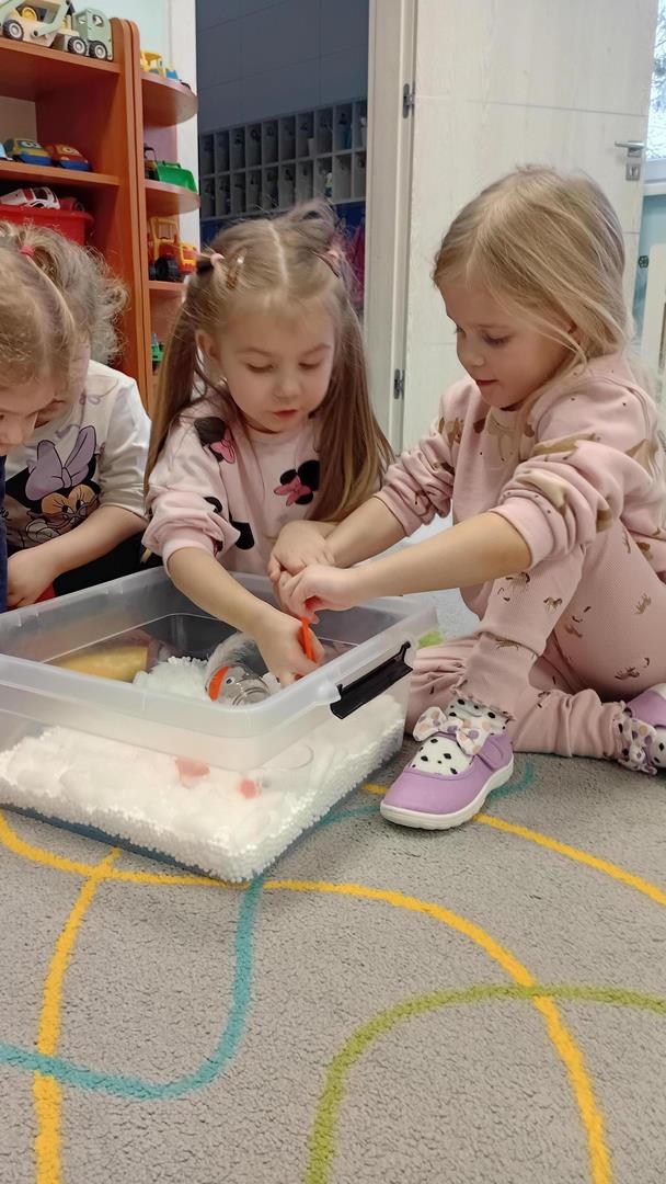 Dzieci uczestniczyły w zabawach sensorycznych z wykorzystaniem kuleczek styropianowych oraz niebieskiego ryżu. Przesypywały materiały, dotykały ich dłońmi oraz porównywały różne faktury. Zabawy sprzyjały rozwijaniu motoryki małej, koncentracji. Wykonały grupową pracę plastyczną pt. „Bałwanek z waty”. Przyklejały watę na kartkę, tworząc wspólną postać bałwanka, a następnie ozdabiały go dodatkowymi elementami. Praca rozwijała sprawność manualną oraz kreatywność dzieci jak również współpracę.