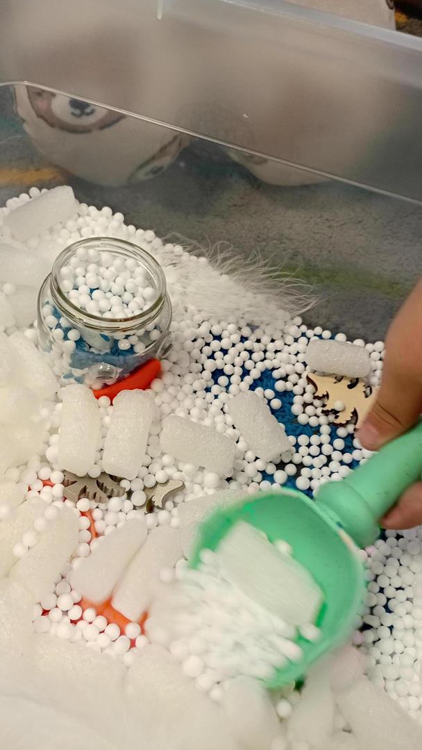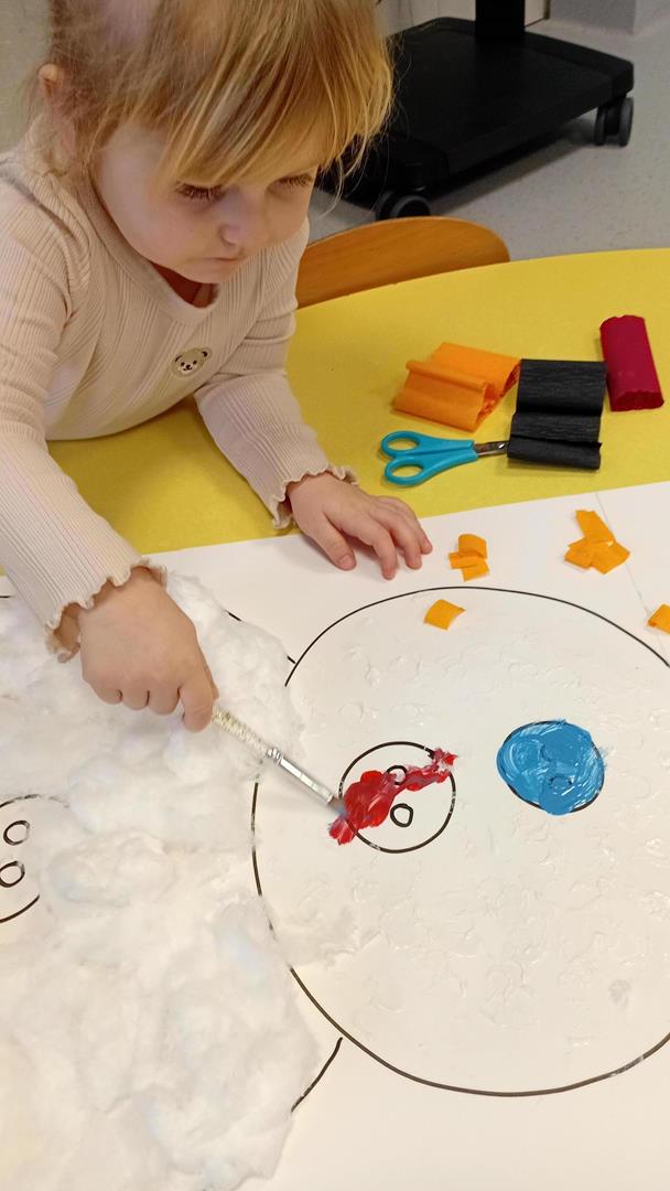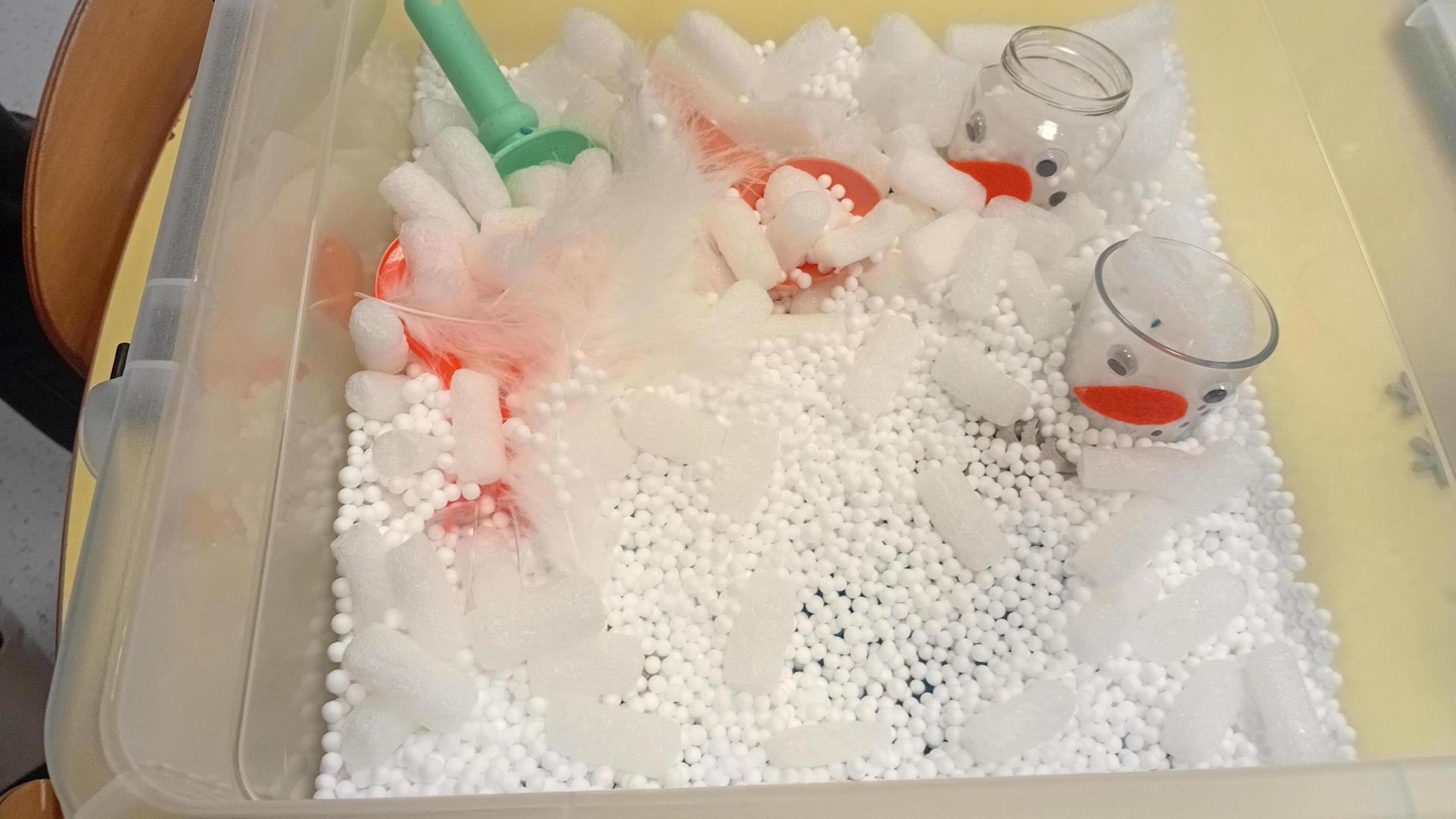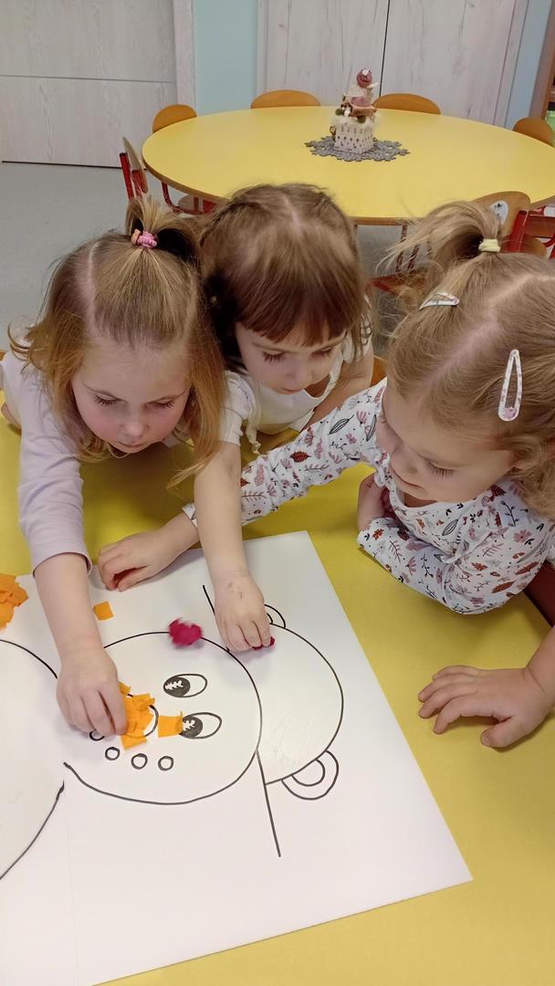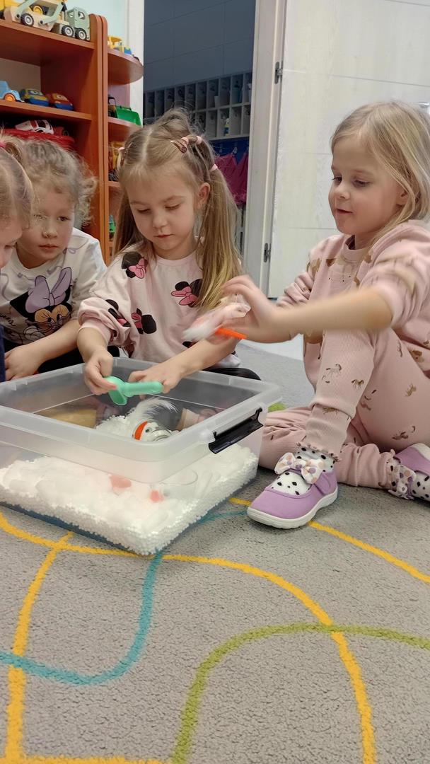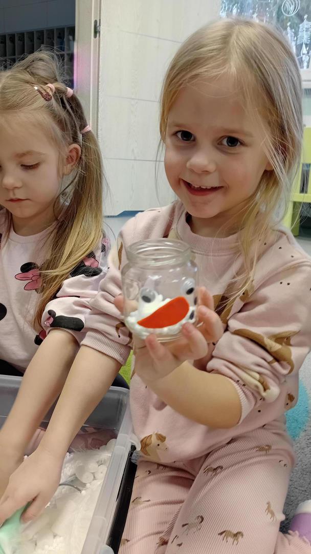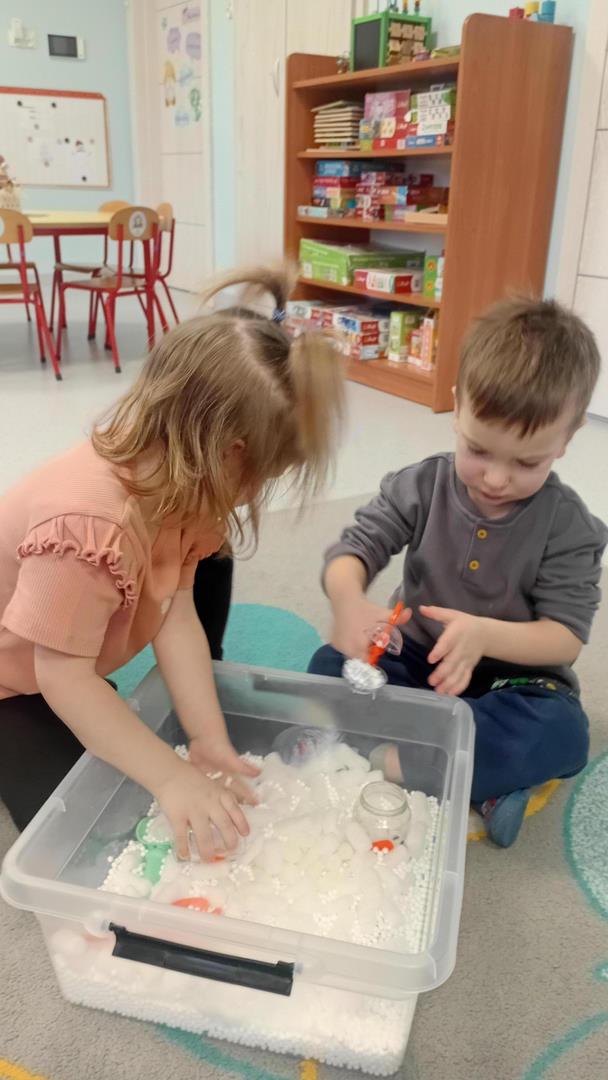 Dzieci uczestniczyły w zabawach sensorycznych z wykorzystaniem kuleczek styropianowych oraz niebieskiego ryżu. Przesypywały materiały, dotykały ich dłońmi oraz porównywały różne faktury. Zabawy sprzyjały rozwijaniu motoryki małej, koncentracji. Wykonały grupową pracę plastyczną pt. „Bałwanek z waty”. Przyklejały watę na kartkę, tworząc wspólną postać bałwanka, a następnie ozdabiały go dodatkowymi elementami. Praca rozwijała sprawność manualną oraz kreatywność dzieci jak również współpracę.