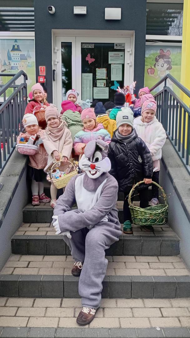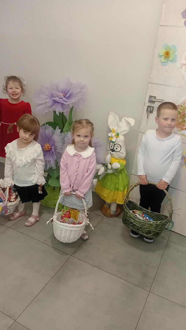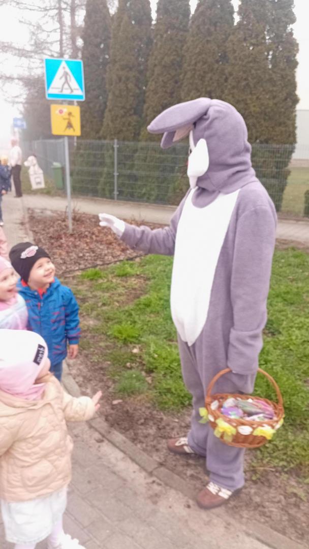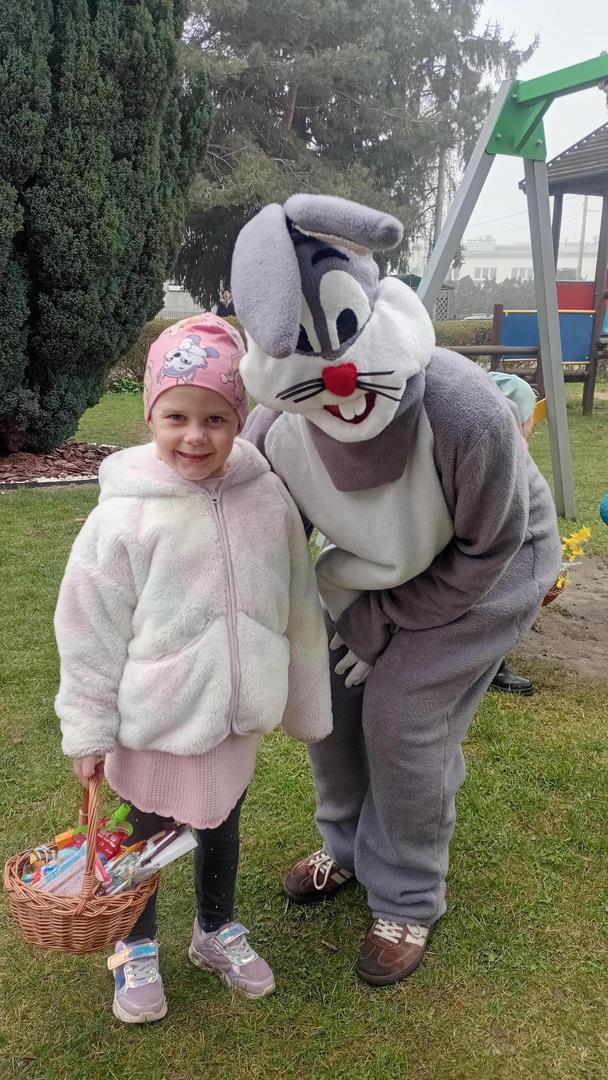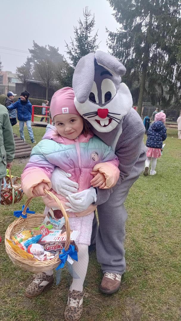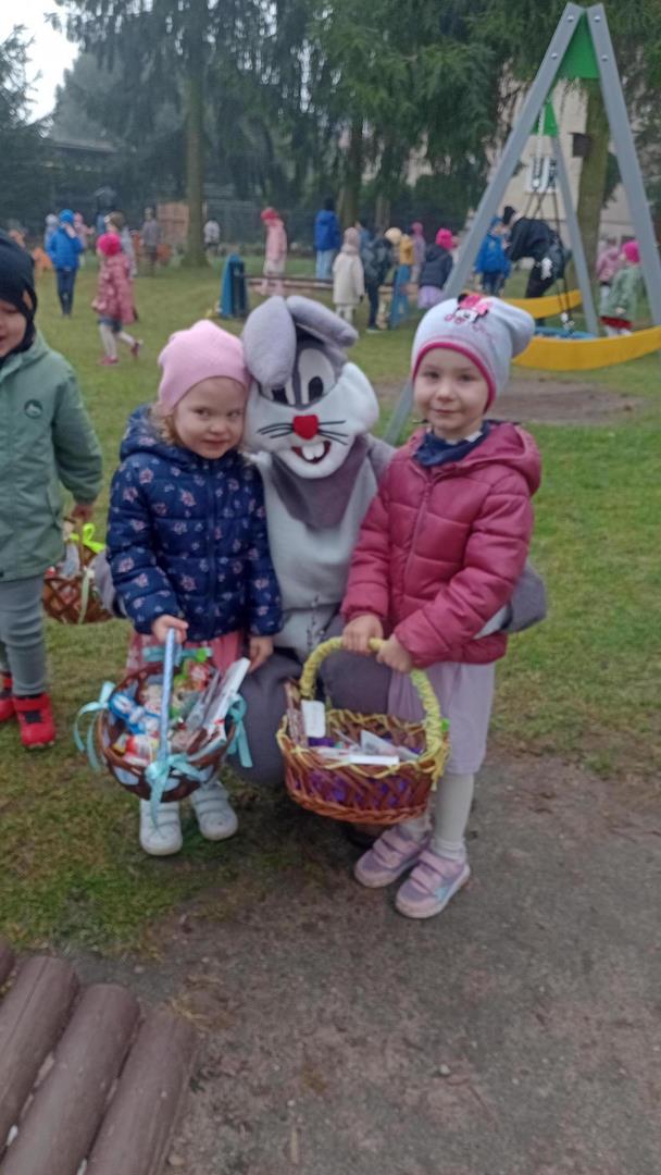 Po śniadaniu na dzieci czekała niespodzianka – poszukiwanie Zajączka Wielkanocnego. Dzieci z ogromnym zaangażowaniem szukały ukrytych upominków w ogrodzie przedszkolnym. Zabawa dostarczyła wszystkim wiele radości i uśmiechu.