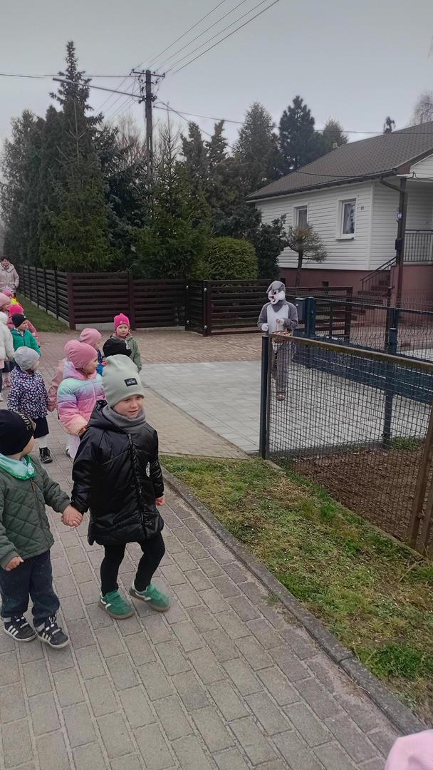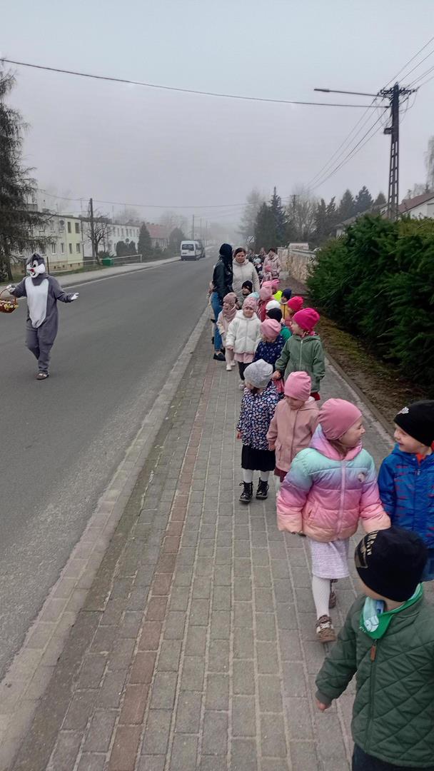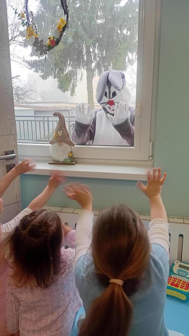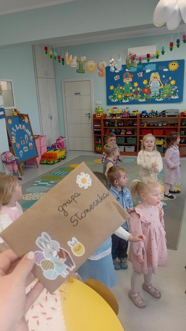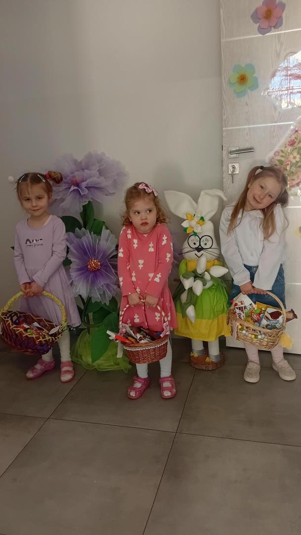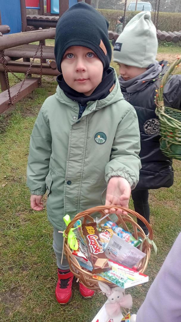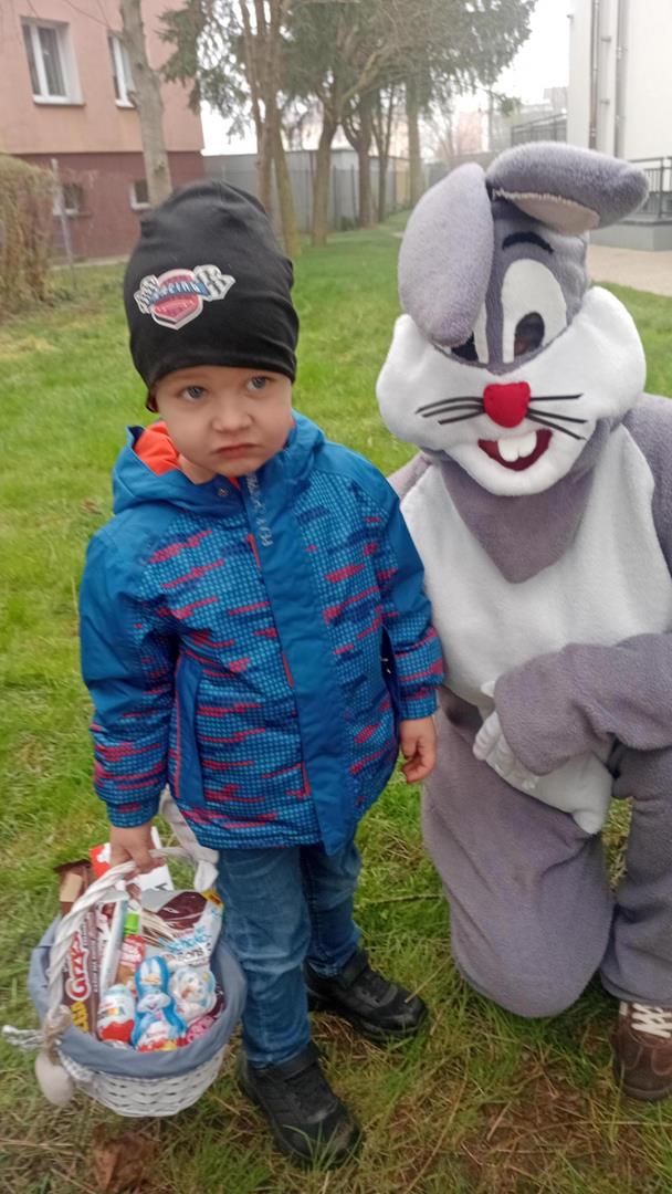 Po śniadaniu na dzieci czekała niespodzianka – poszukiwanie Zajączka Wielkanocnego. Dzieci z ogromnym zaangażowaniem szukały ukrytych upominków w ogrodzie przedszkolnym. Zabawa dostarczyła wszystkim wiele radości i uśmiechu.