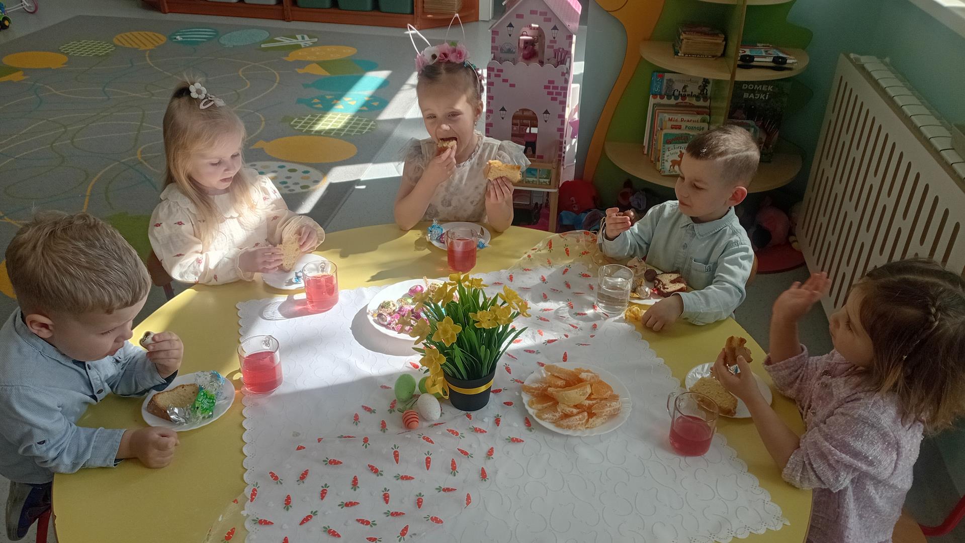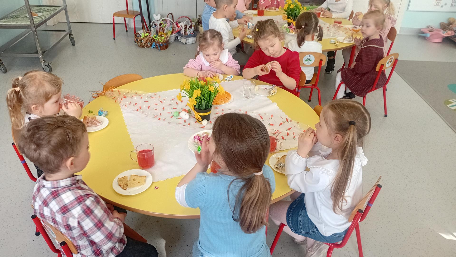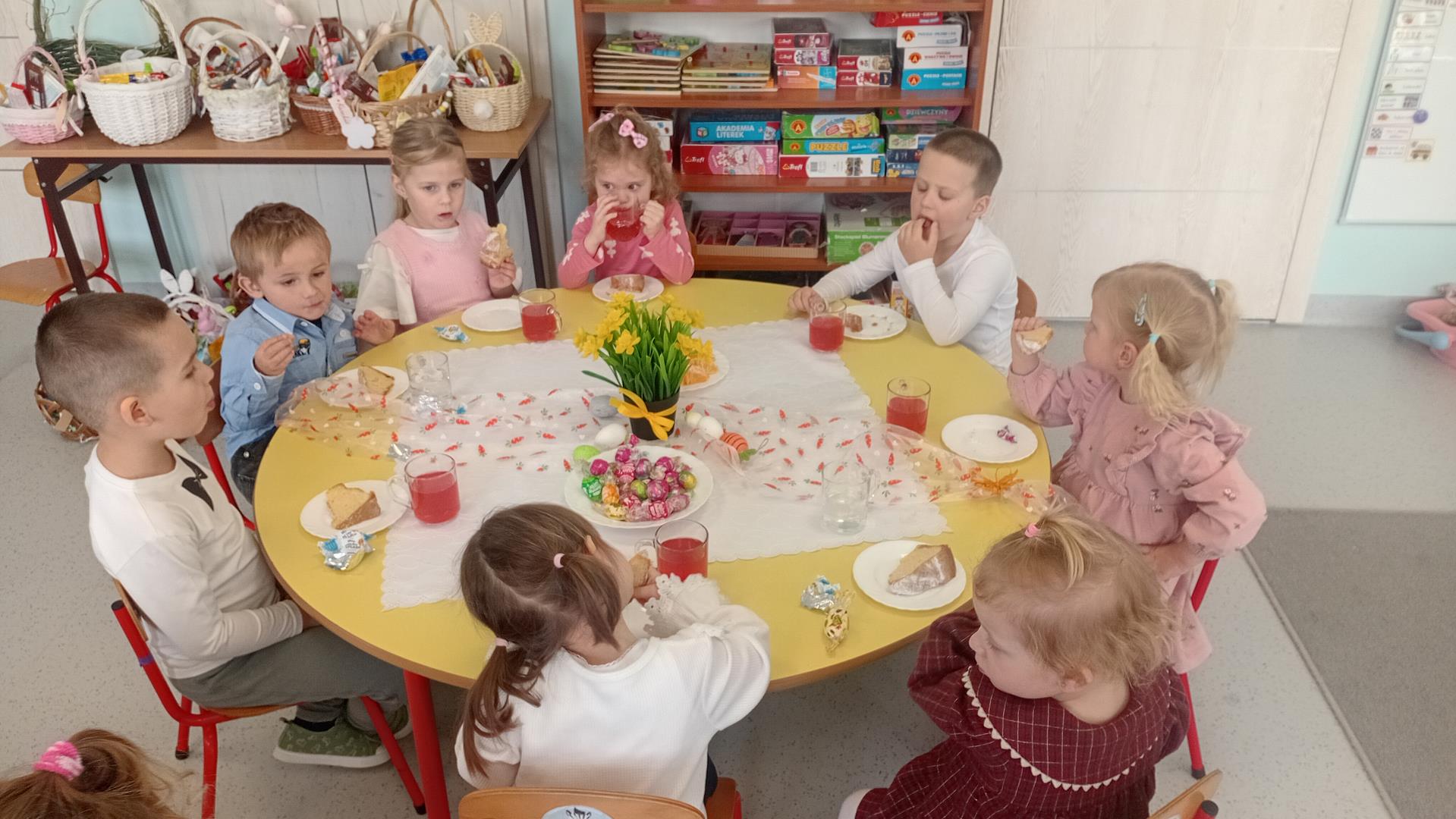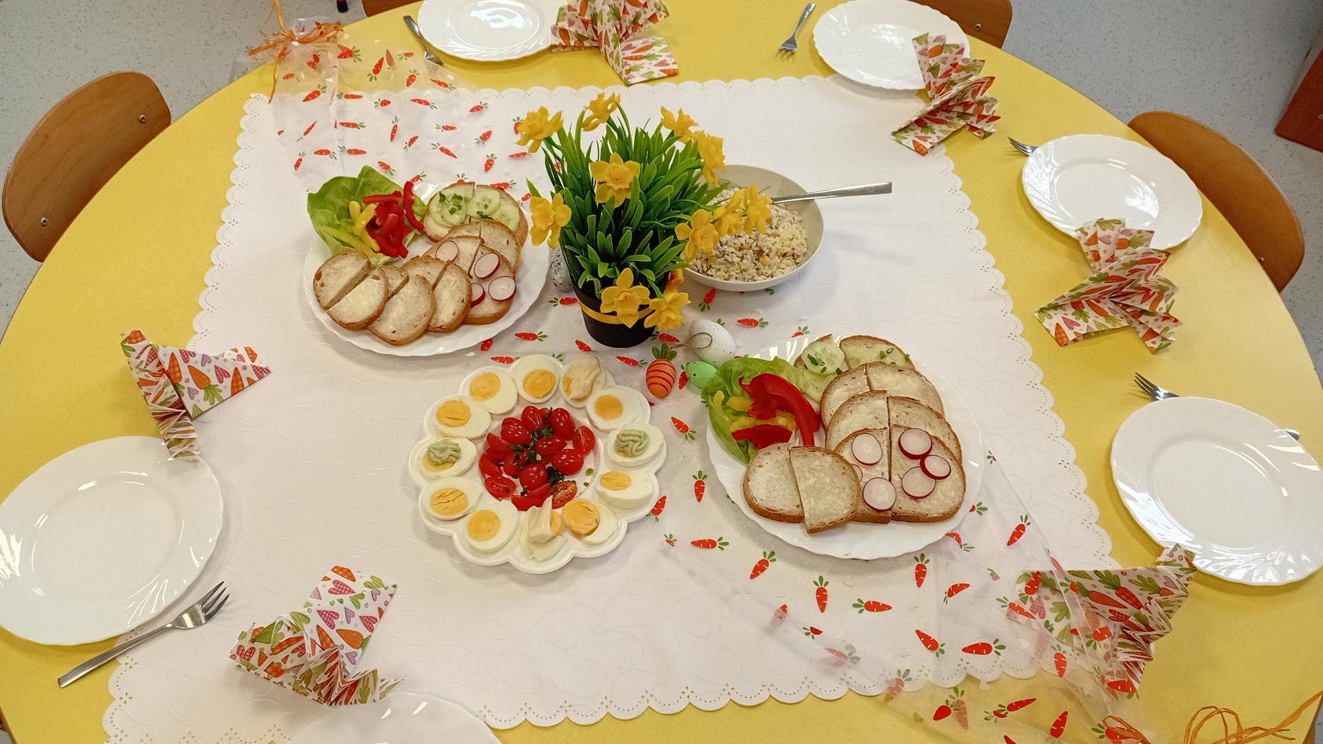Dzieci wspólnie zasiadły do pięknie udekorowanego stołu, na którym nie zabrakło tradycyjnych wielkanocnych potraw. Była to doskonała okazja do rozmów o zwyczajach i tradycjach związanych z Wielkanocą.
