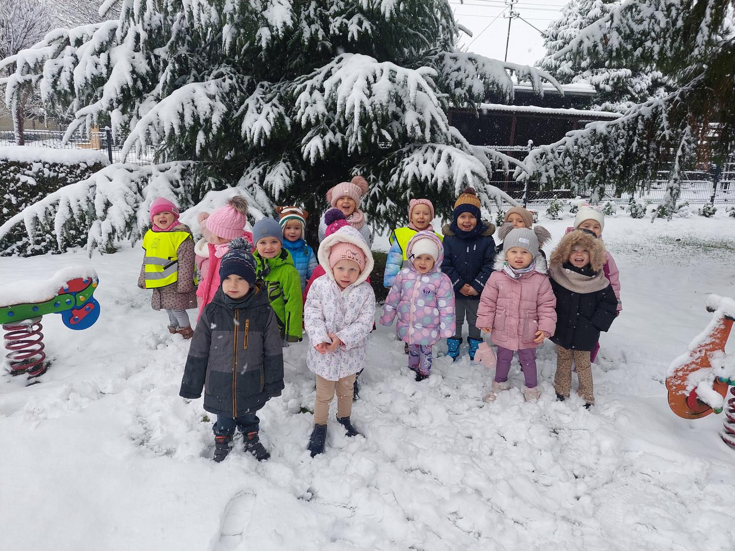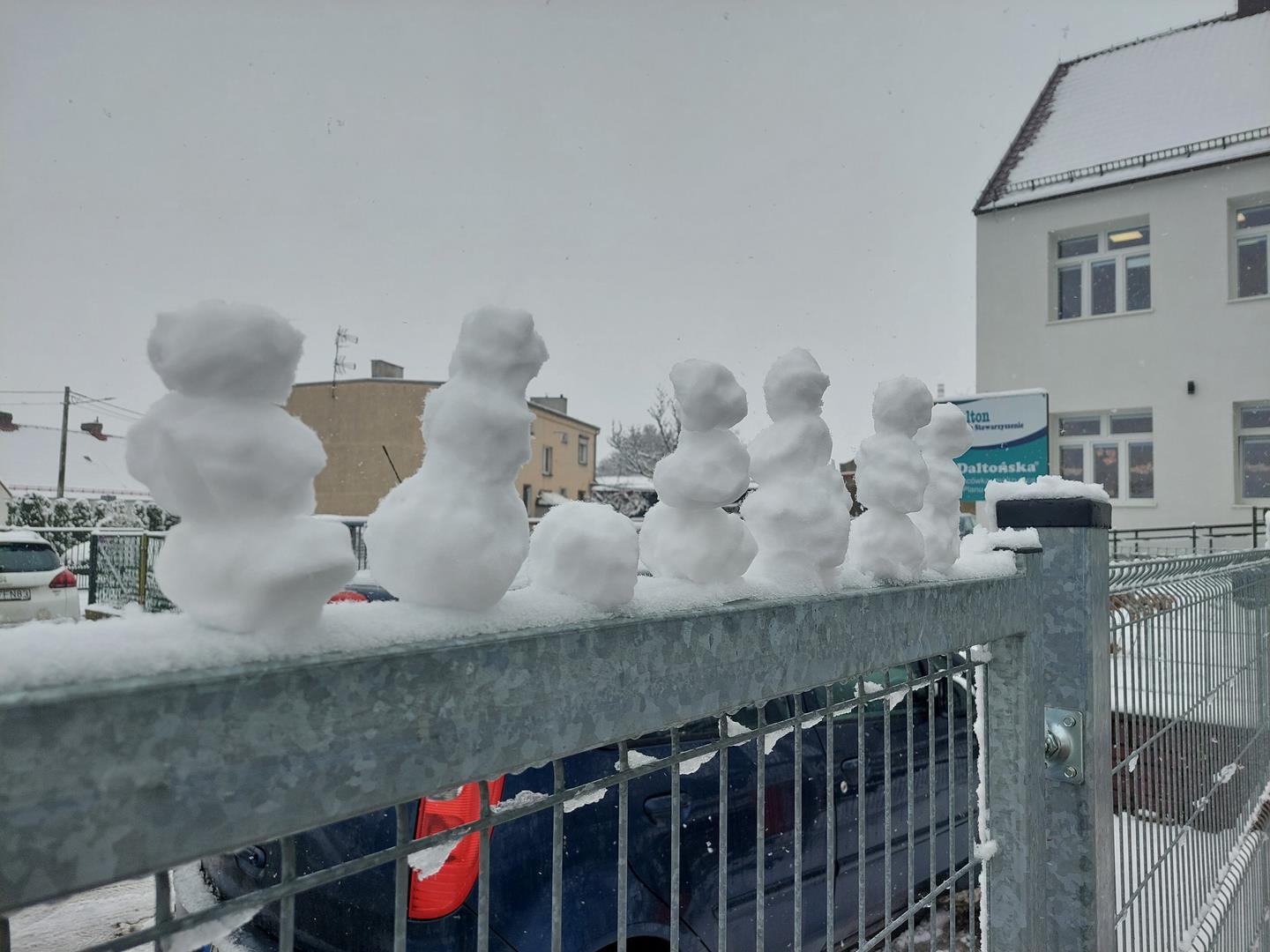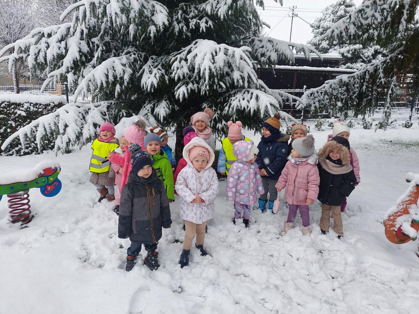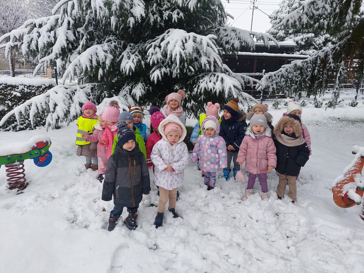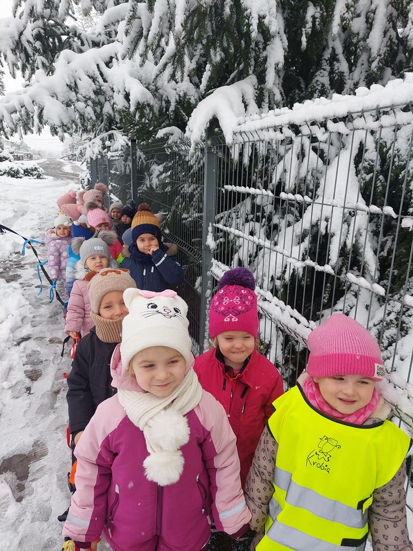 Korzystając z zimowej pogodowej niespodzianki wybraliśmy się na spacerek. Podziwialiśmy opadające na nas płatki śniegu. Śnieg sprawił nam wiele radości.