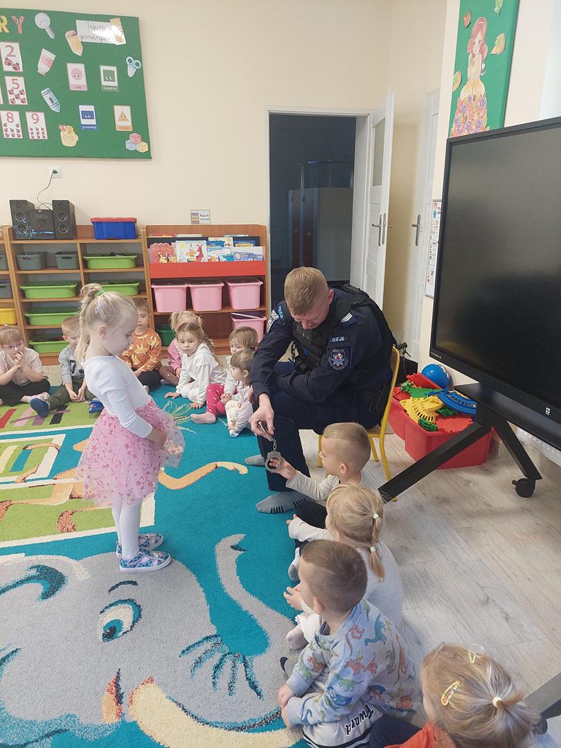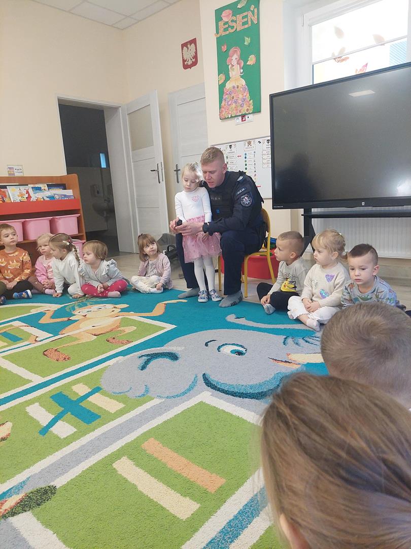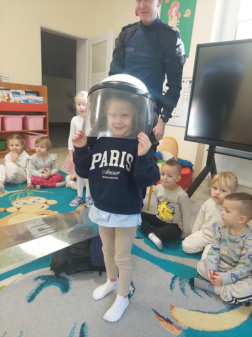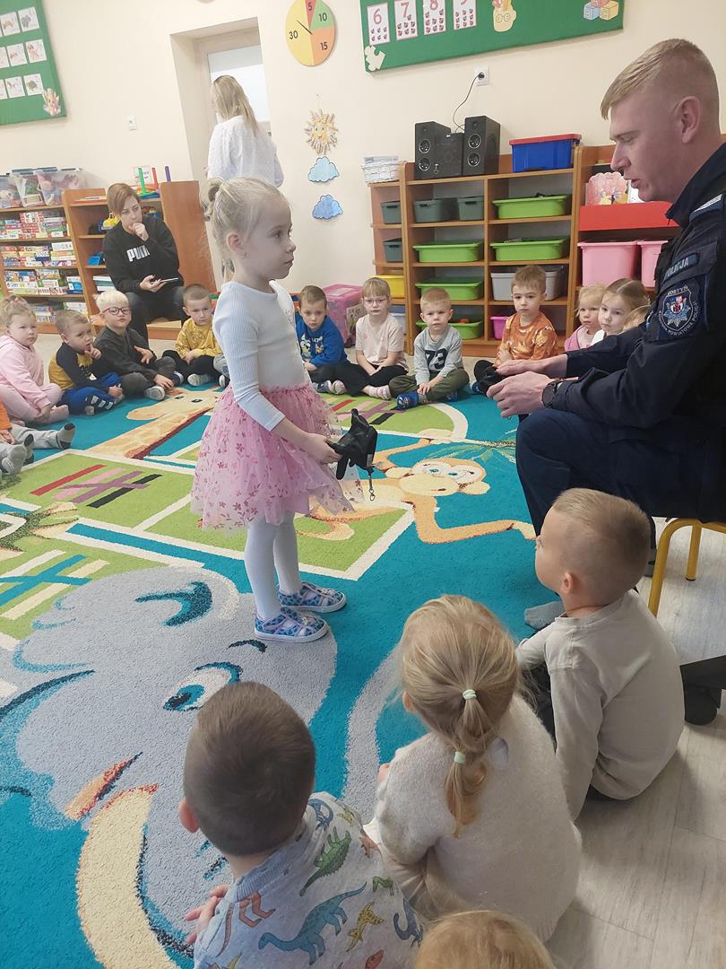 Dzieci uczestniczyły w spotkaniu z policjantem. Miały okazję poznać zawód policjanta oraz potrzebny sprzęt w codziennej pracy. Zapoznały się także z niebezpieczeństwami tego zawodu. Utrwaliły zasady prawidłowego przejścia przez ulicę, zachowanie w spotkaniu z agresywnym psem. Dowiedziały się, że należy zakładać kask zawsze wtedy kiedy wybierają się na wycieczkę rowerową. Spotkanie było cenną lekcją nie tylko dla dzieci.