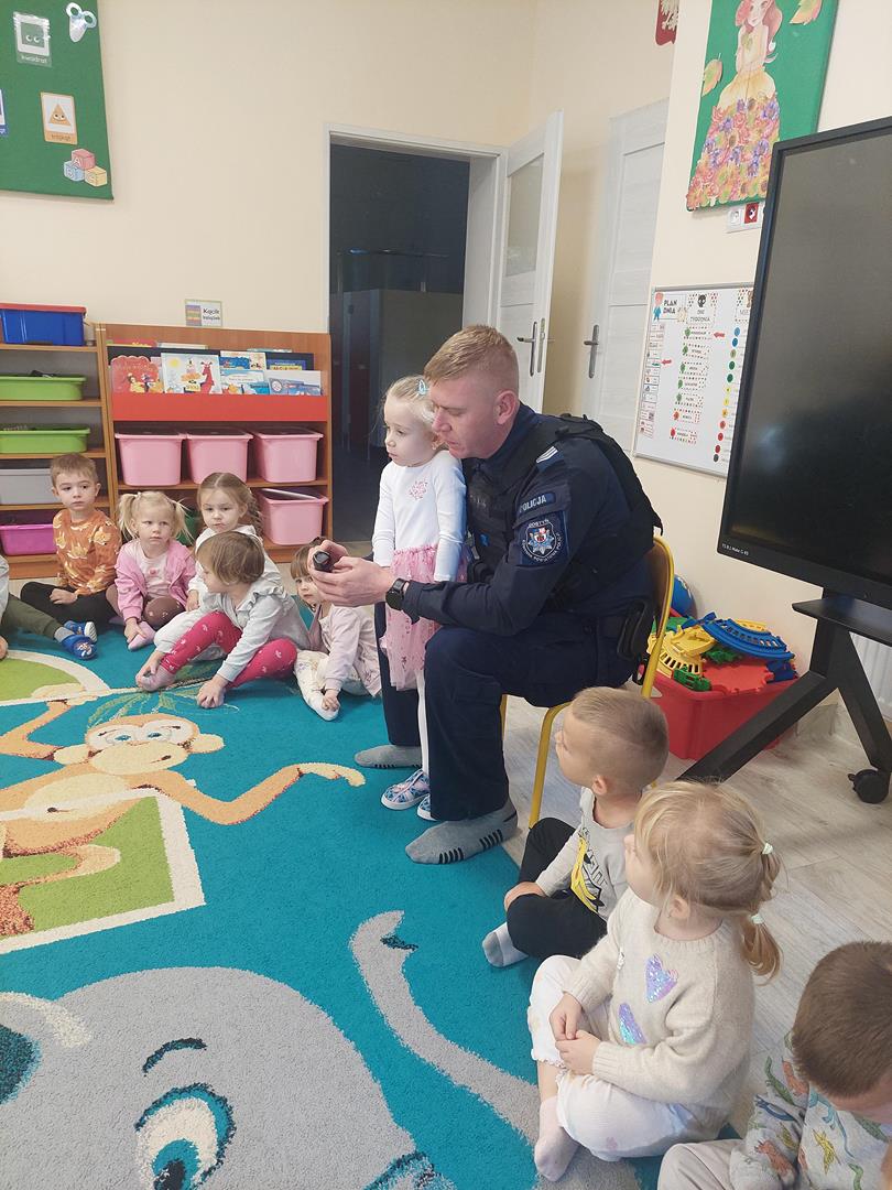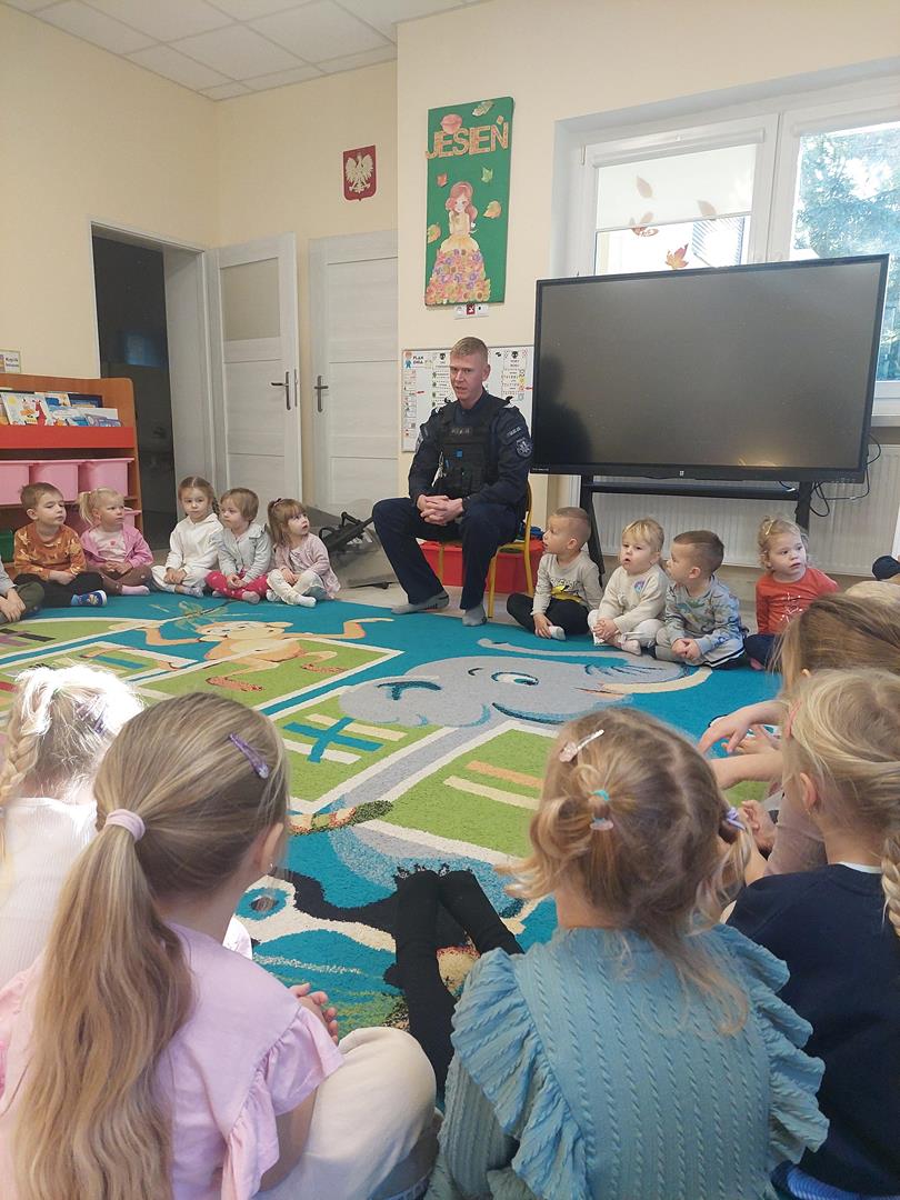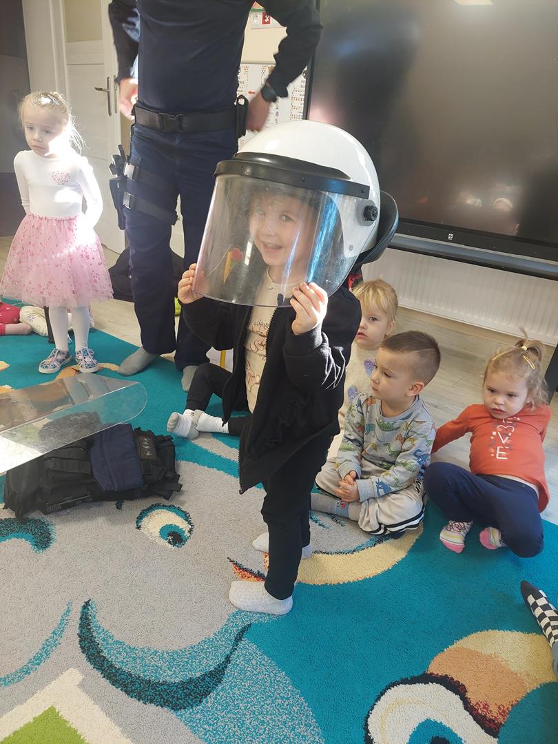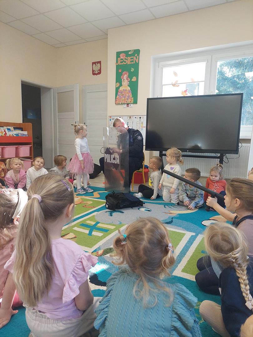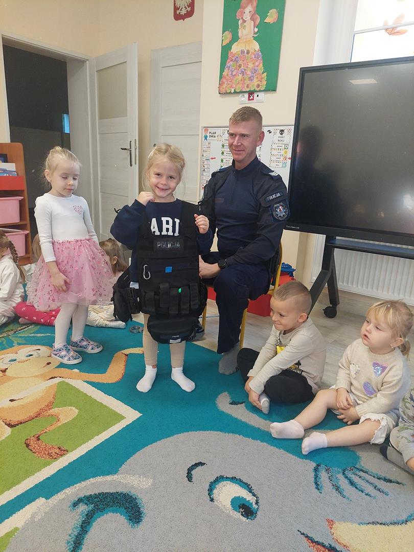 Dzieci uczestniczyły w spotkaniu z policjantem. Miały okazję poznać zawód policjanta oraz potrzebny sprzęt w codziennej pracy. Zapoznały się także z niebezpieczeństwami tego zawodu. Utrwaliły zasady prawidłowego przejścia przez ulicę, zachowanie w spotkaniu z agresywnym psem. Dowiedziały się, że należy zakładać kask zawsze wtedy kiedy wybierają się na wycieczkę rowerową. Spotkanie było cenną lekcją nie tylko dla dzieci.