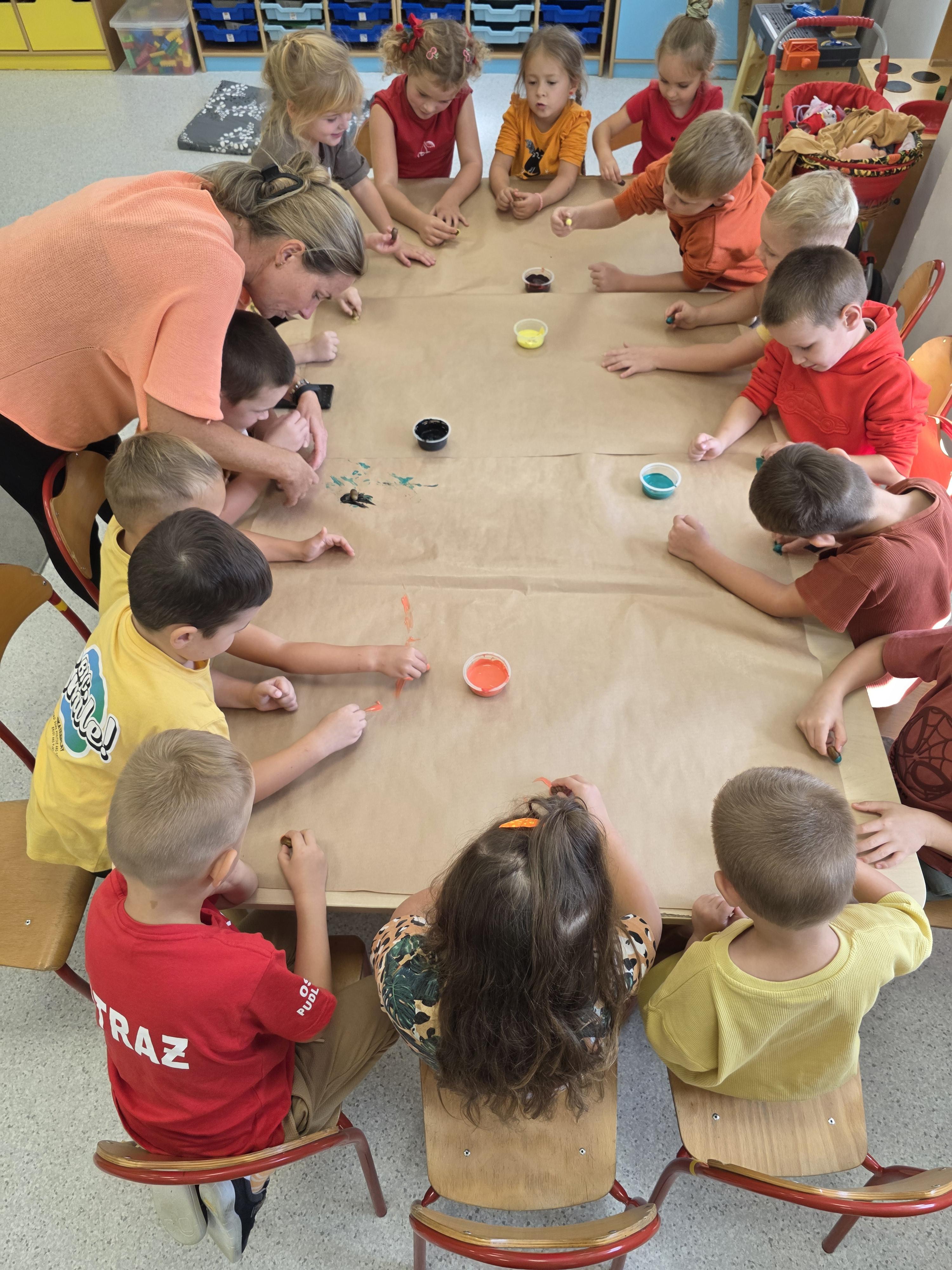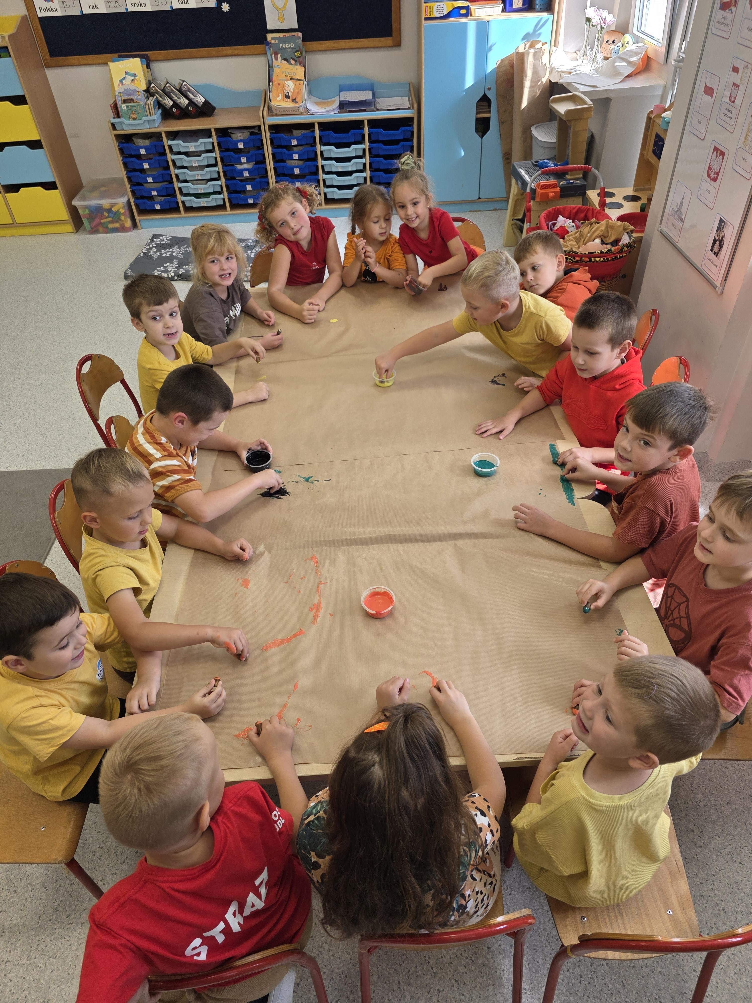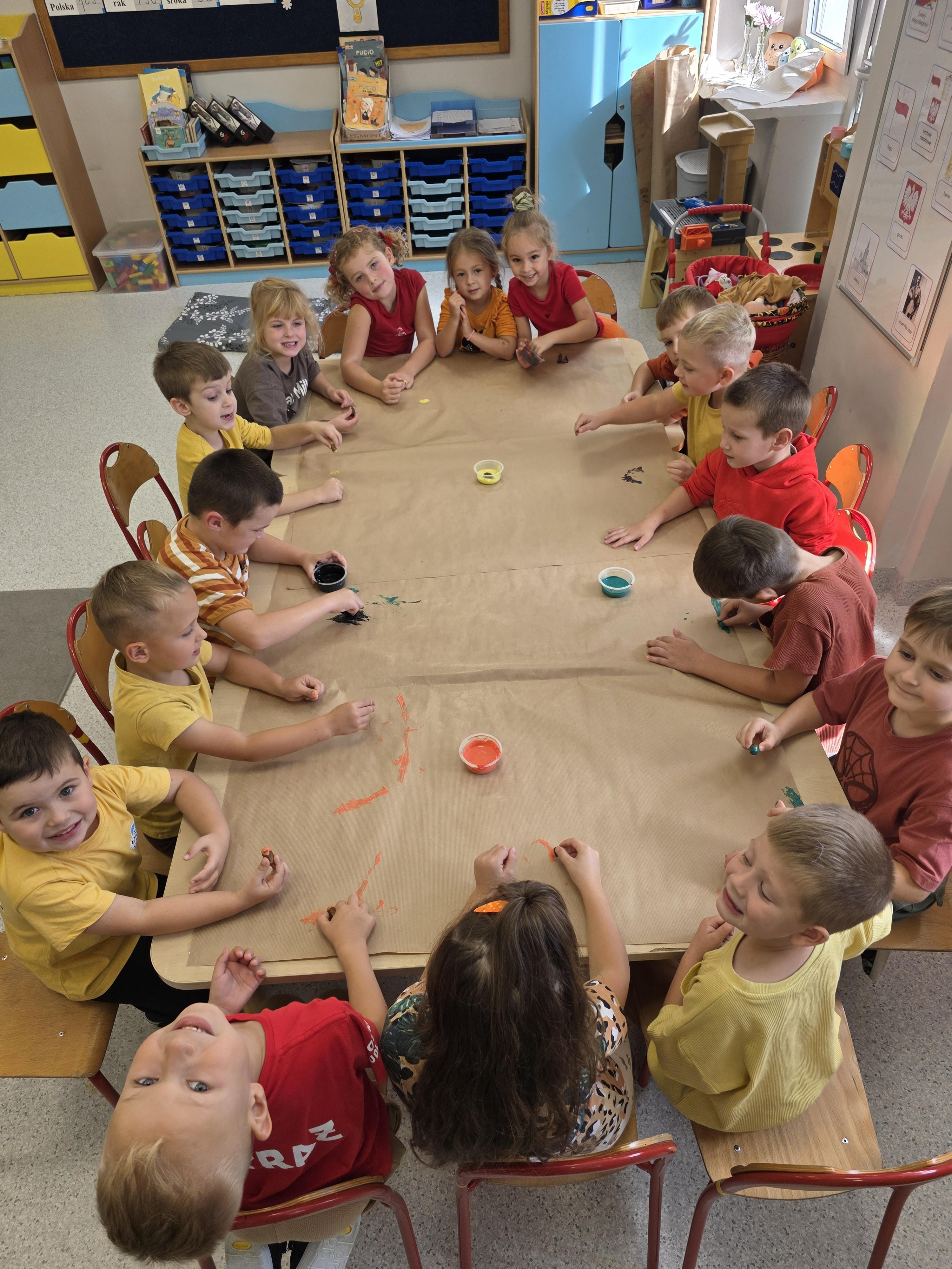 We wtorek, 23 września grupa Stokrotki witała jesień. Dzień zaczęliśmy od przyniesienia darów jesieni, z których później zrobiliśmy wystawę zdobiącą Nasz parapet. W ciągu dnia rozmawialiśmy o oznakach jesieni, których później szukaliśmy spacerując po parku. Uczyliśmy się piosenki, braliśmy udział w sesji zdjęciowej oraz tworzyliśmy jesienny obraz malując żołędziami.