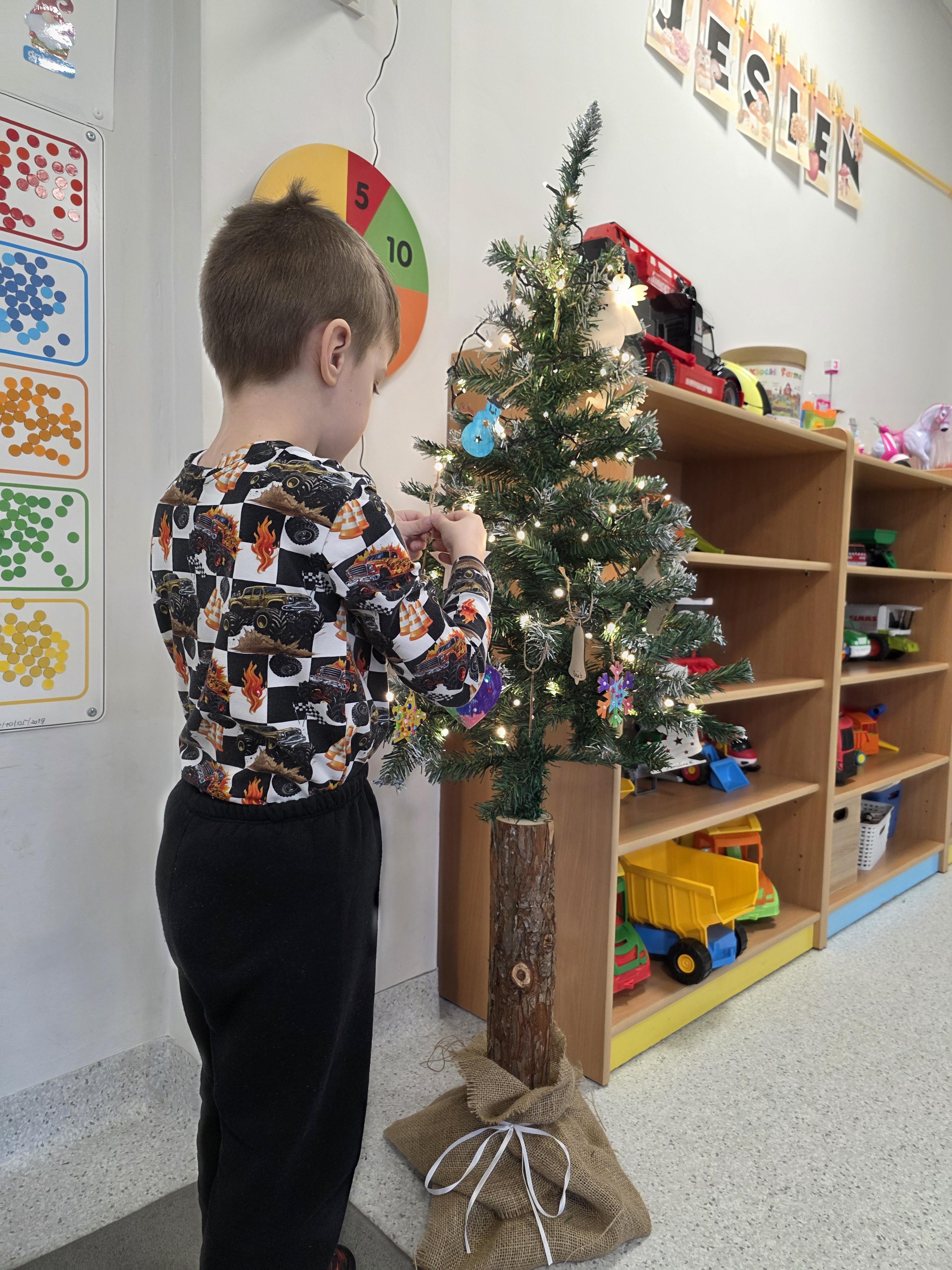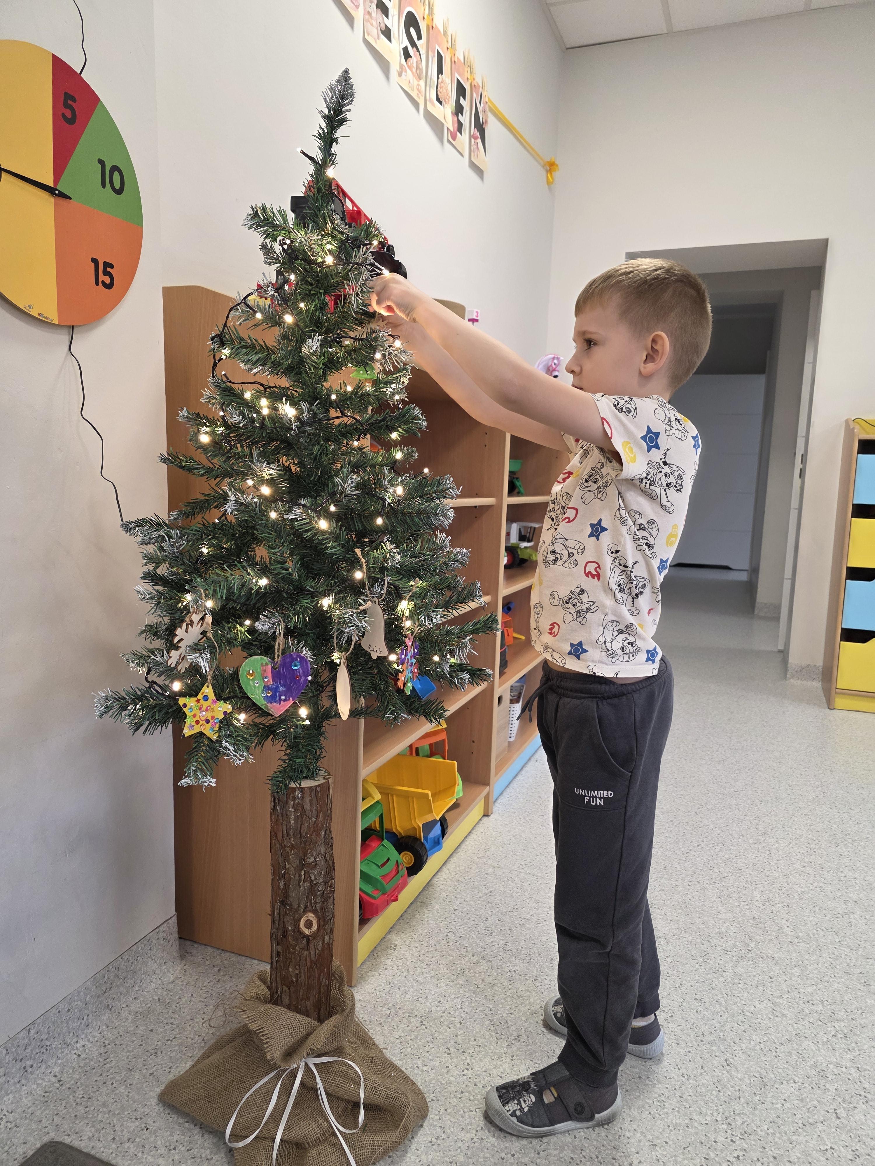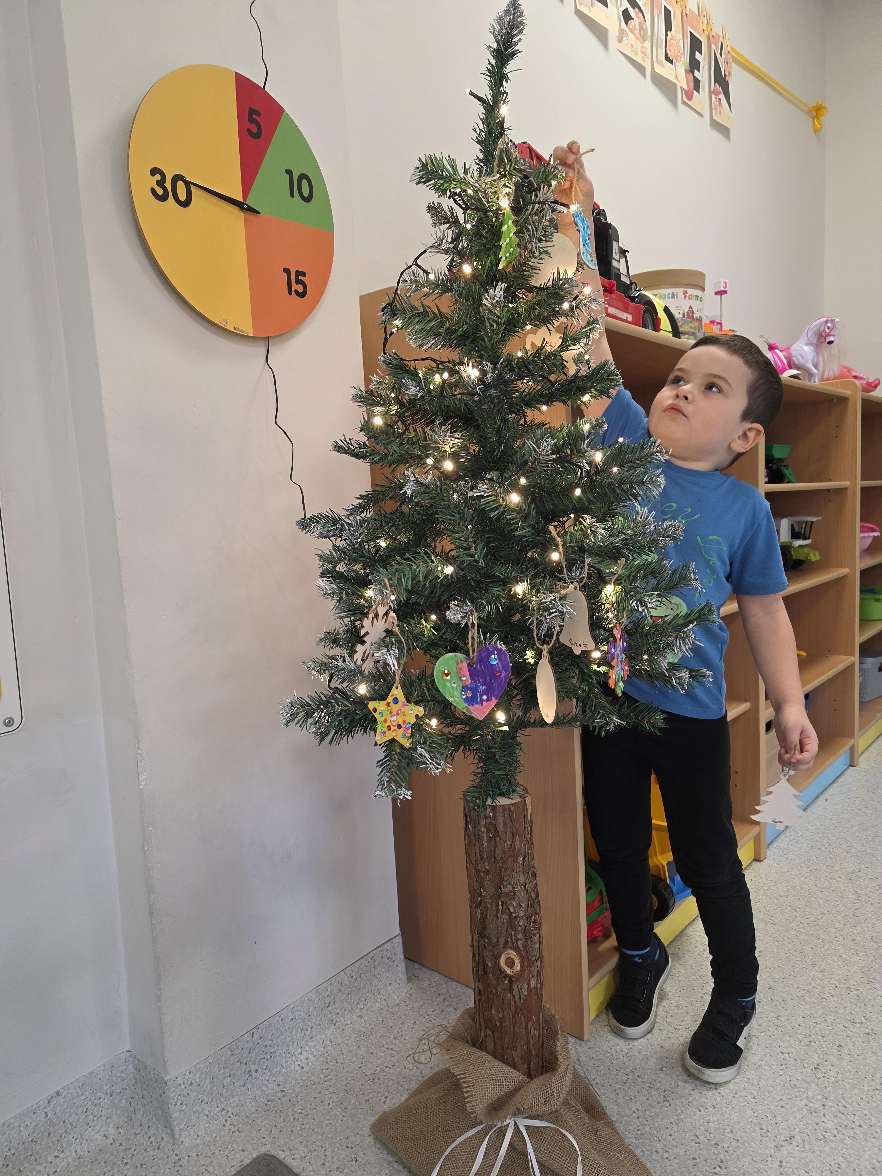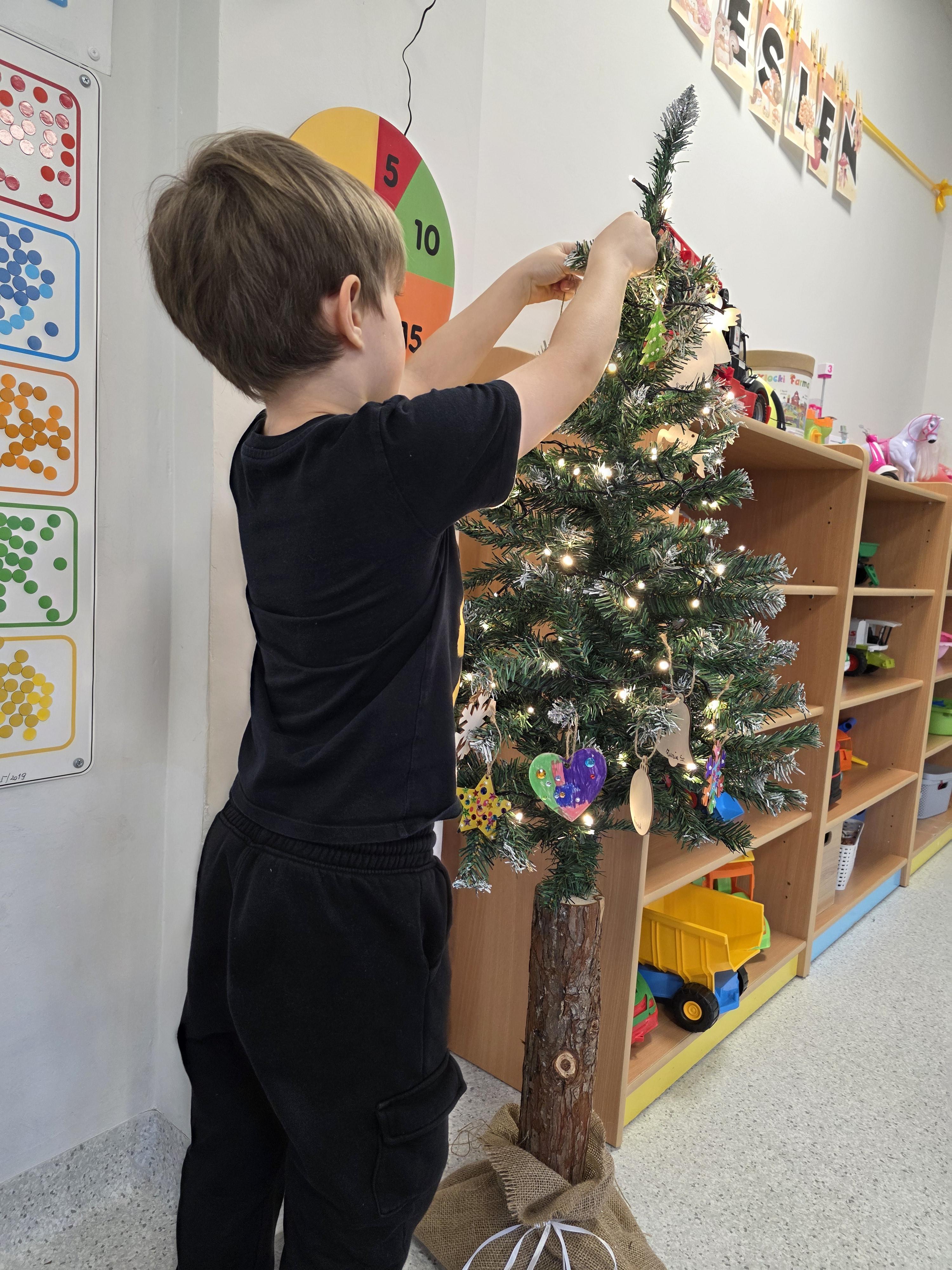 W naszej przedszkolnej grupie zapanował świąteczny nastrój podczas wspólnego ubierania choinki. Dzieci z ogromnym zaangażowaniem wieszały własnoręcznie wykonane ozdoby. Każdy przedszkolak miał okazję zawiesić na drzewku coś od siebie, dzięki czemu choinka stała się wyjątkowa i jedyna w swoim rodzaju. Wspólne ubieranie choinki wprowadziło wszystkich w magiczny klimat nadchodzących świąt.