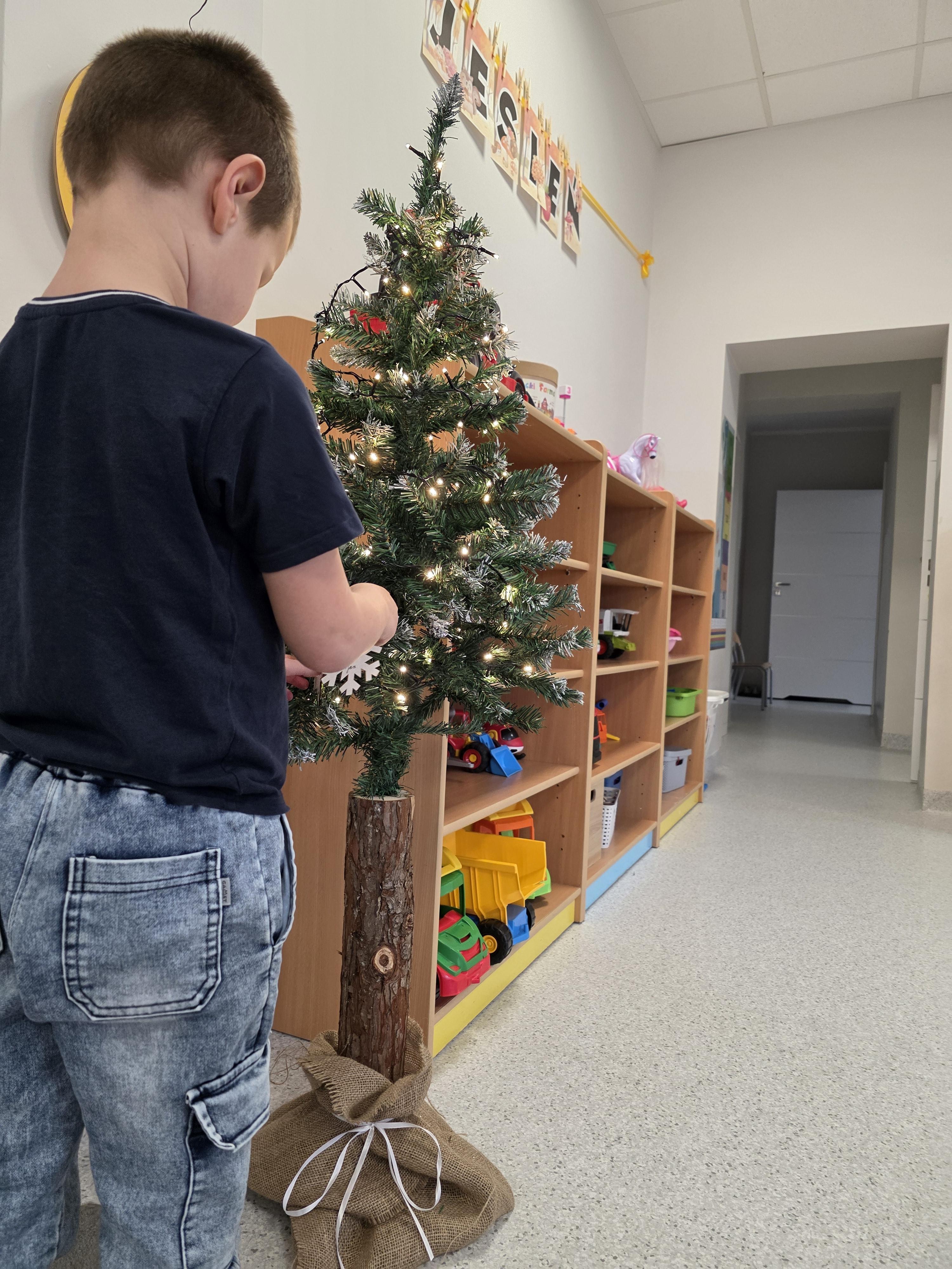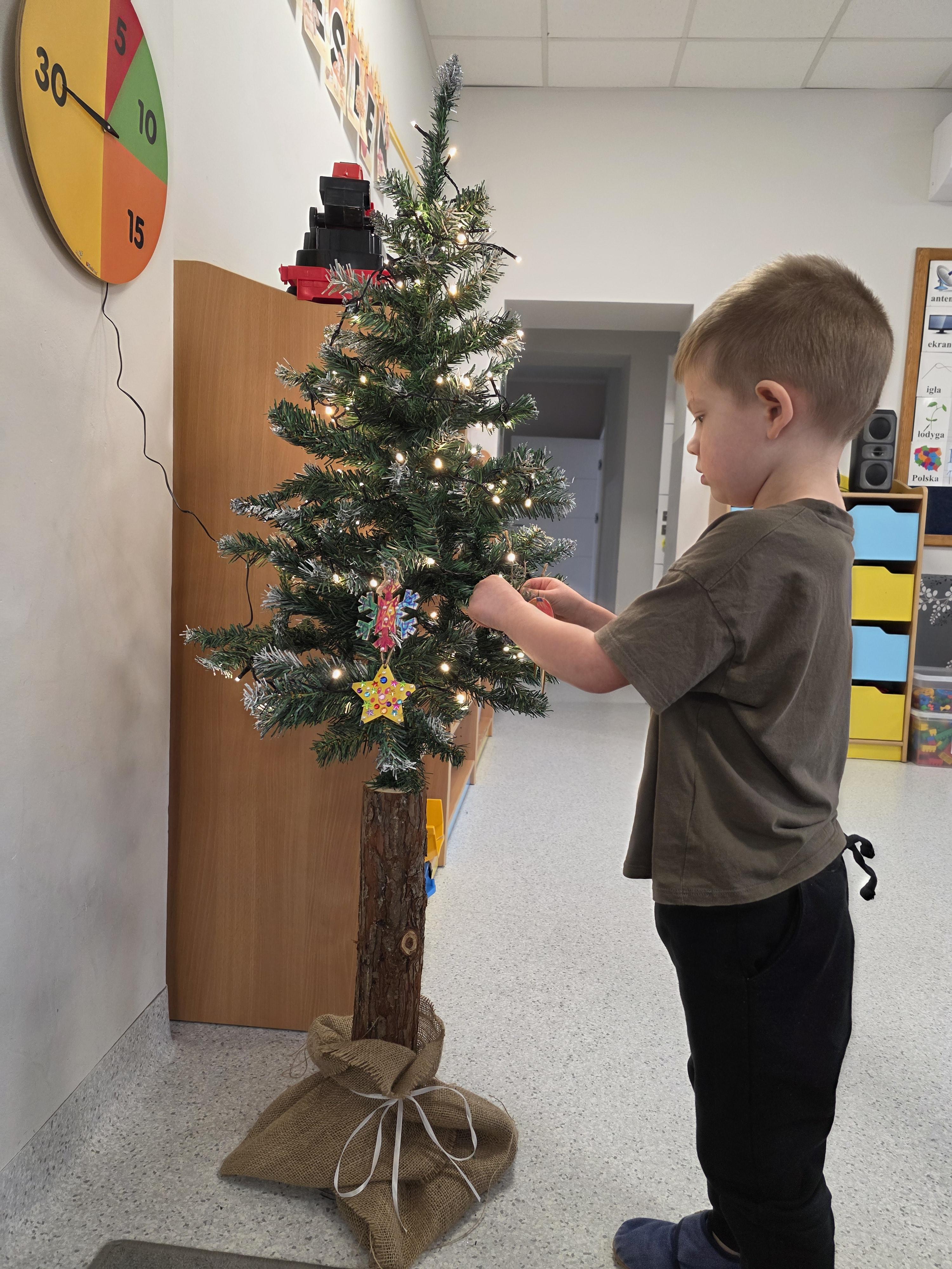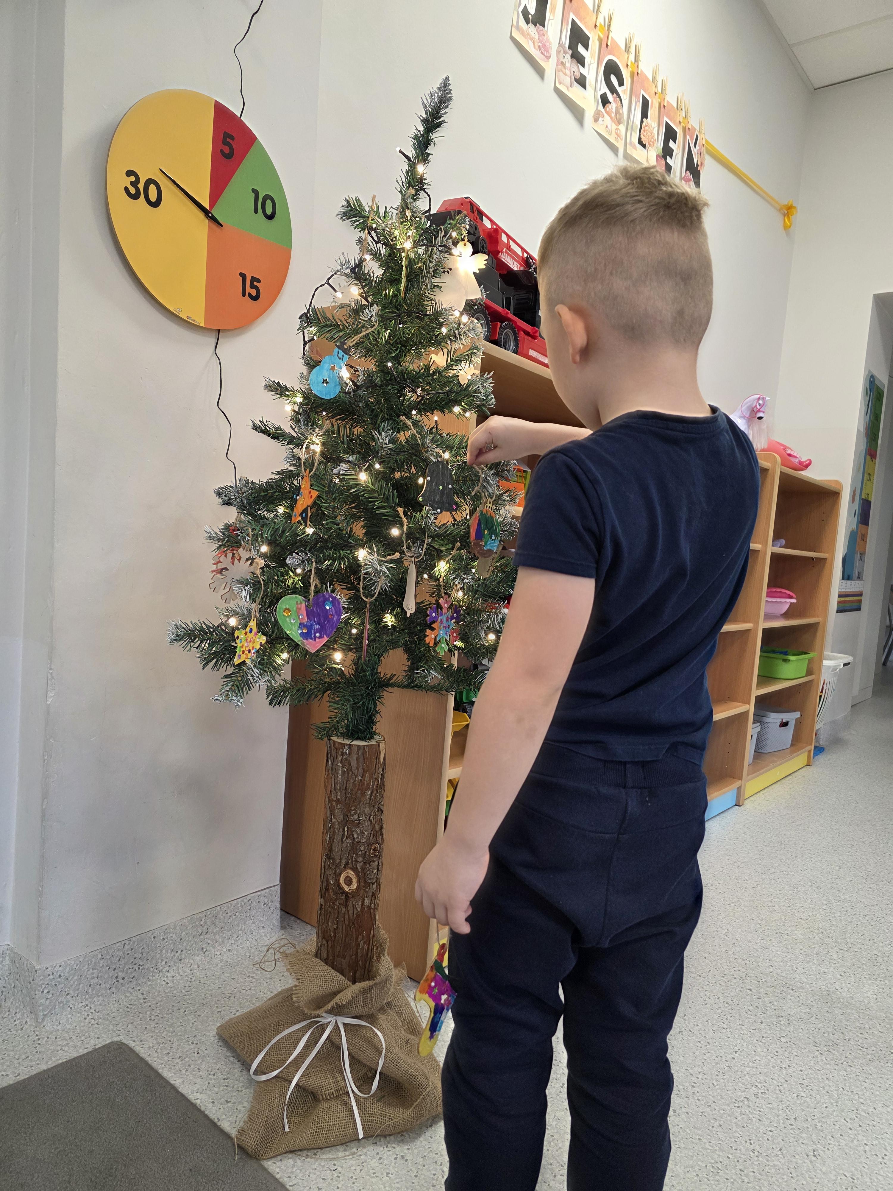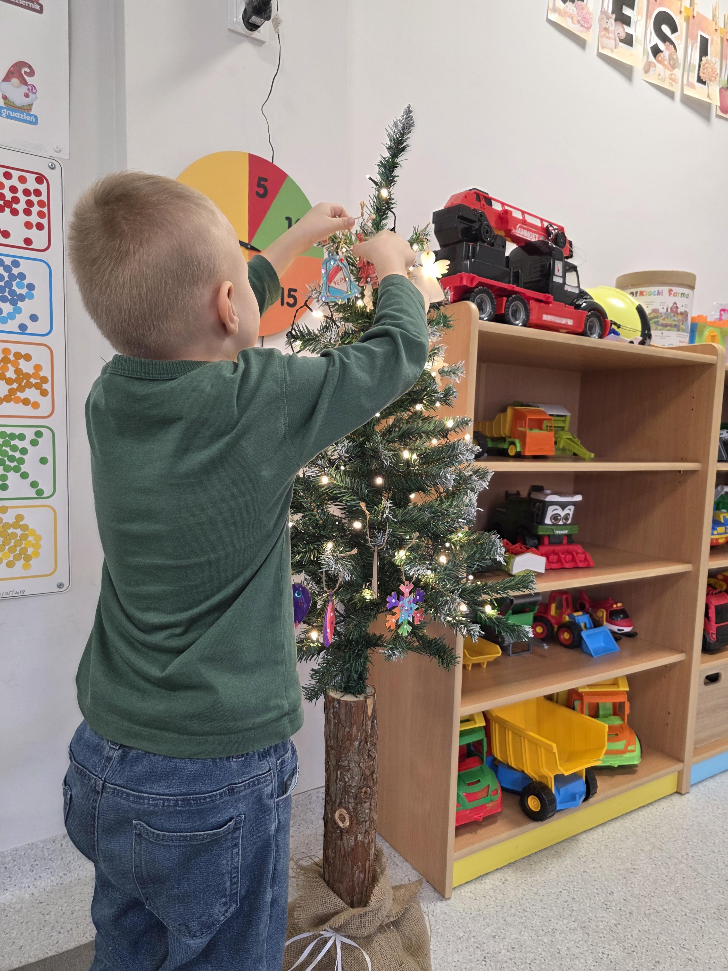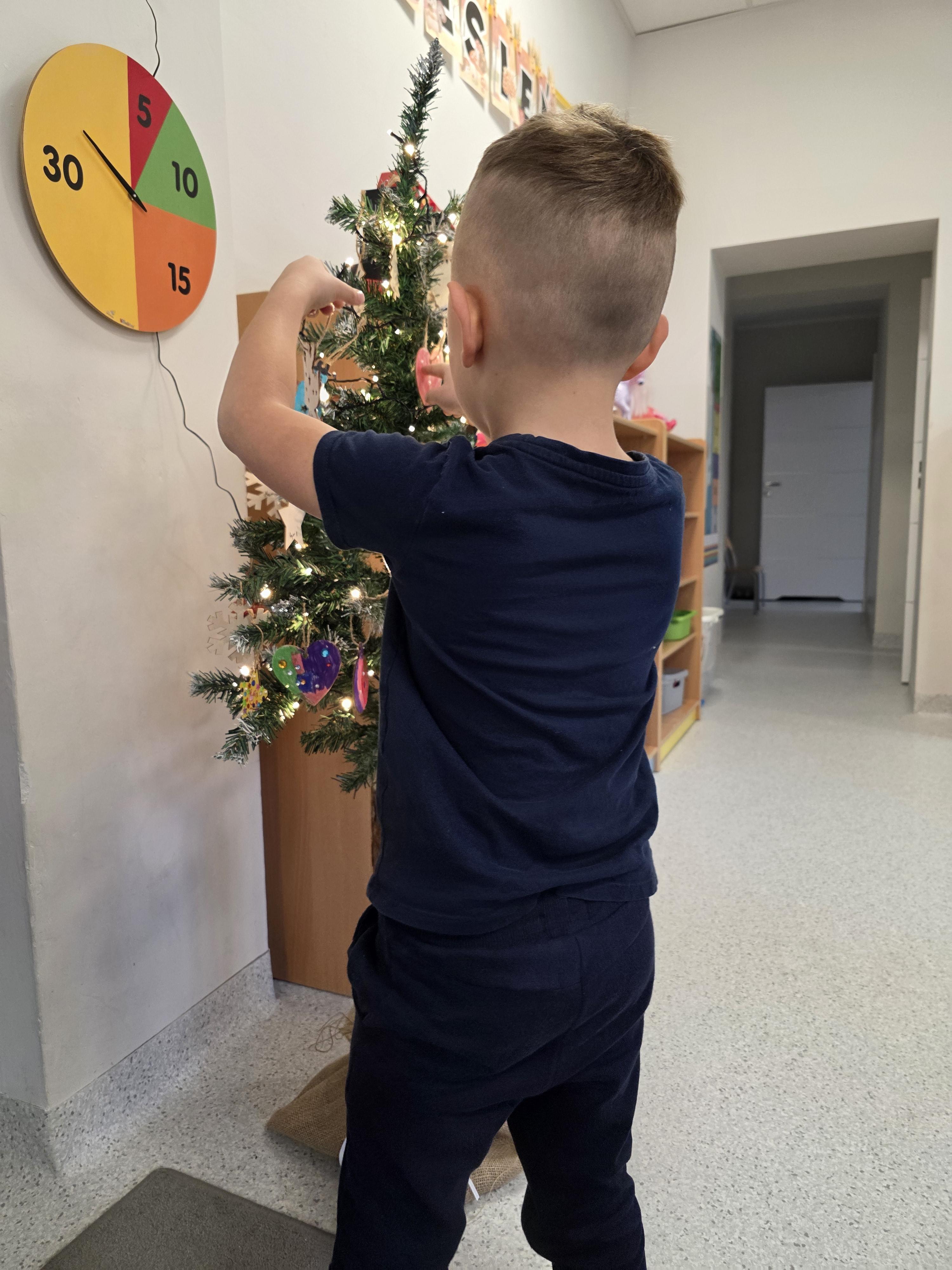 W naszej przedszkolnej grupie zapanował świąteczny nastrój podczas wspólnego ubierania choinki. Dzieci z ogromnym zaangażowaniem wieszały własnoręcznie wykonane ozdoby. Każdy przedszkolak miał okazję zawiesić na drzewku coś od siebie, dzięki czemu choinka stała się wyjątkowa i jedyna w swoim rodzaju. Wspólne ubieranie choinki wprowadziło wszystkich w magiczny klimat nadchodzących świąt.