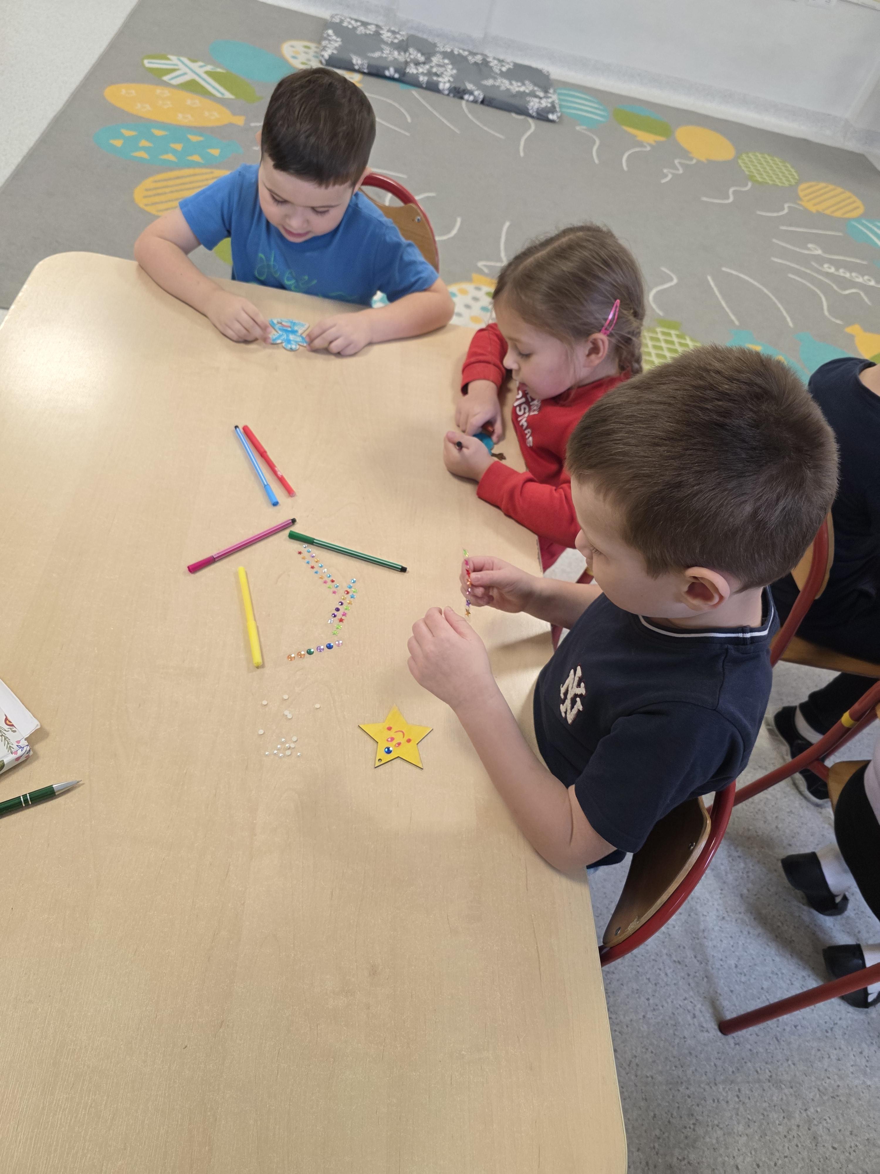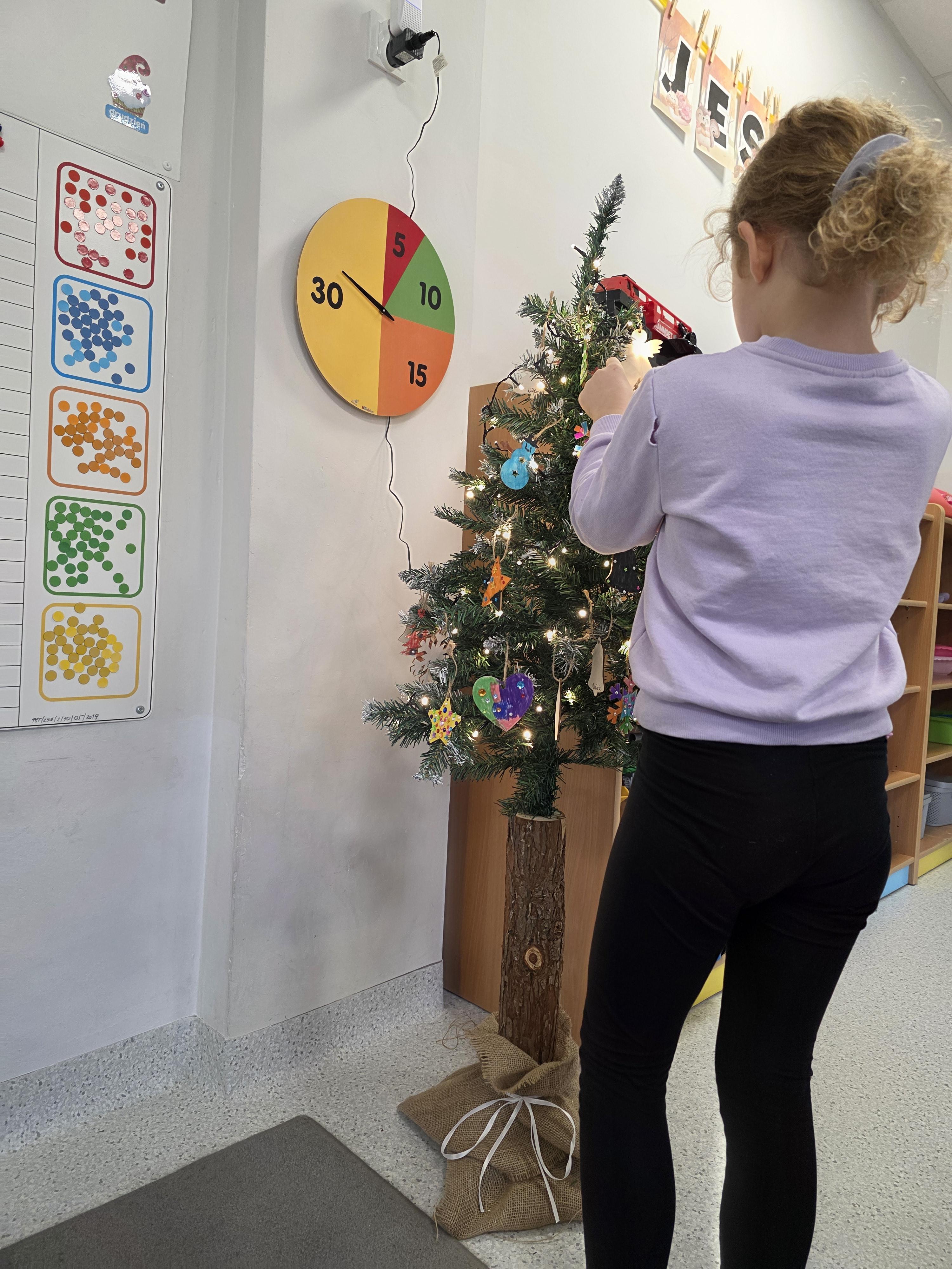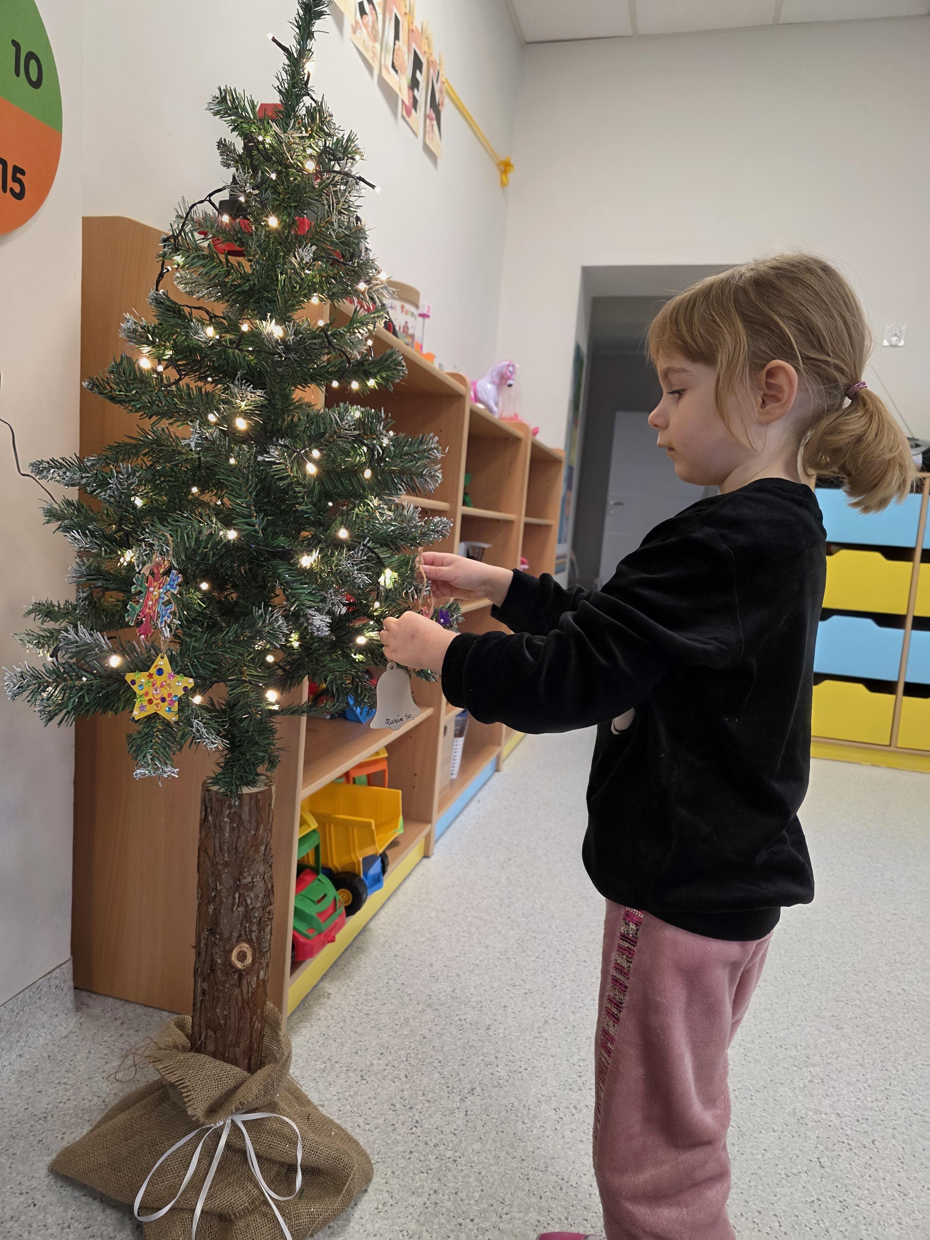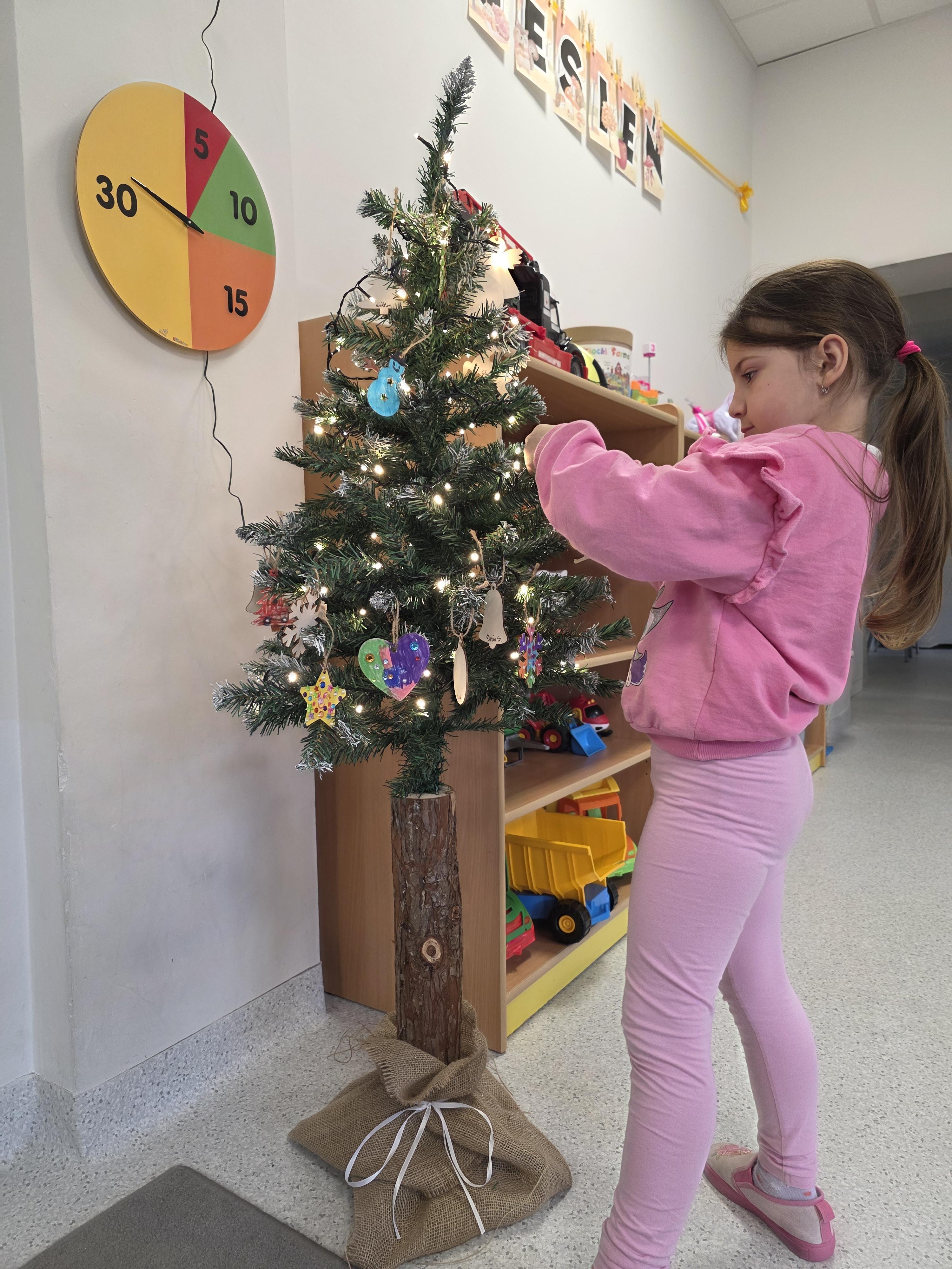 W naszej przedszkolnej grupie zapanował świąteczny nastrój podczas wspólnego ubierania choinki. Dzieci z ogromnym zaangażowaniem wieszały własnoręcznie wykonane ozdoby. Każdy przedszkolak miał okazję zawiesić na drzewku coś od siebie, dzięki czemu choinka stała się wyjątkowa i jedyna w swoim rodzaju. Wspólne ubieranie choinki wprowadziło wszystkich w magiczny klimat nadchodzących świąt.