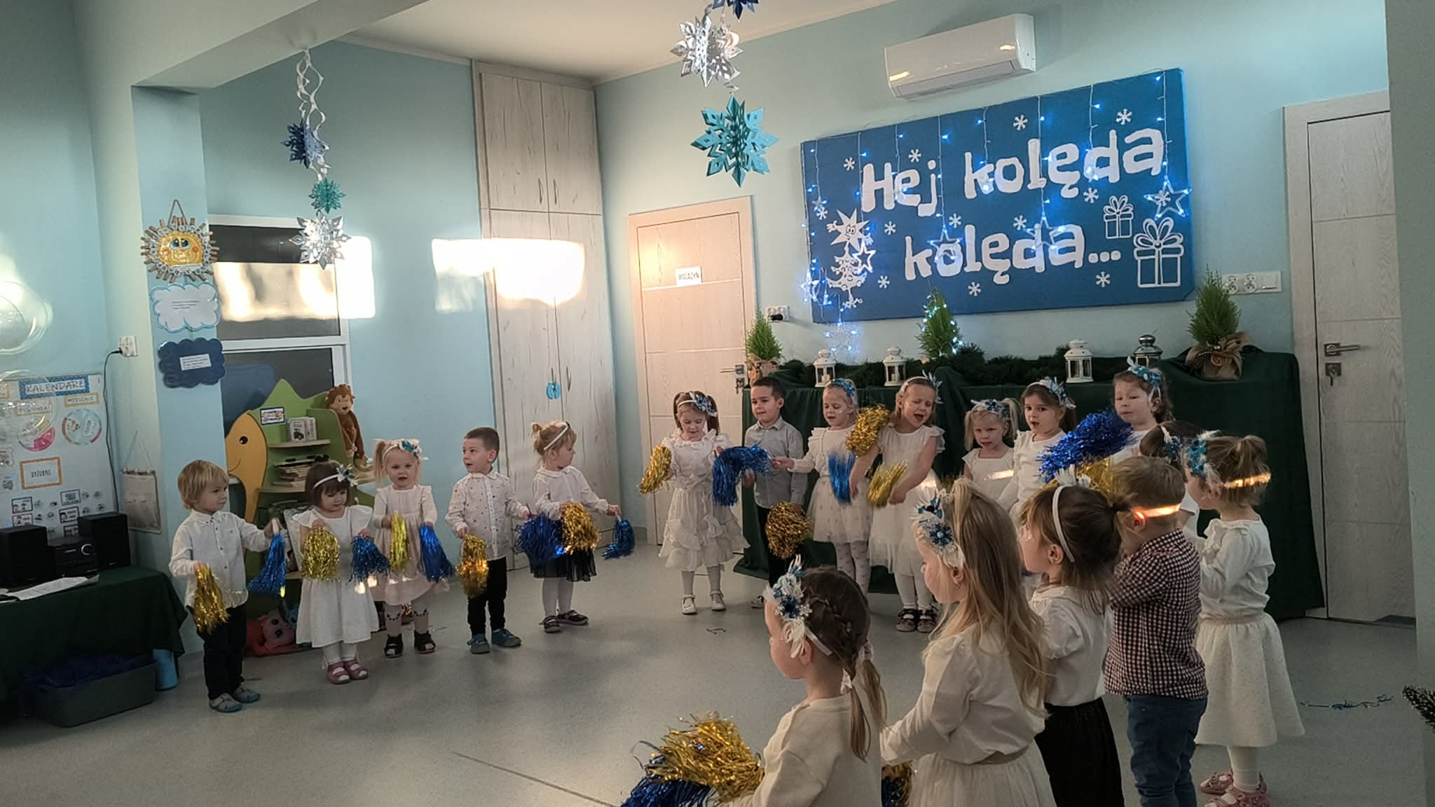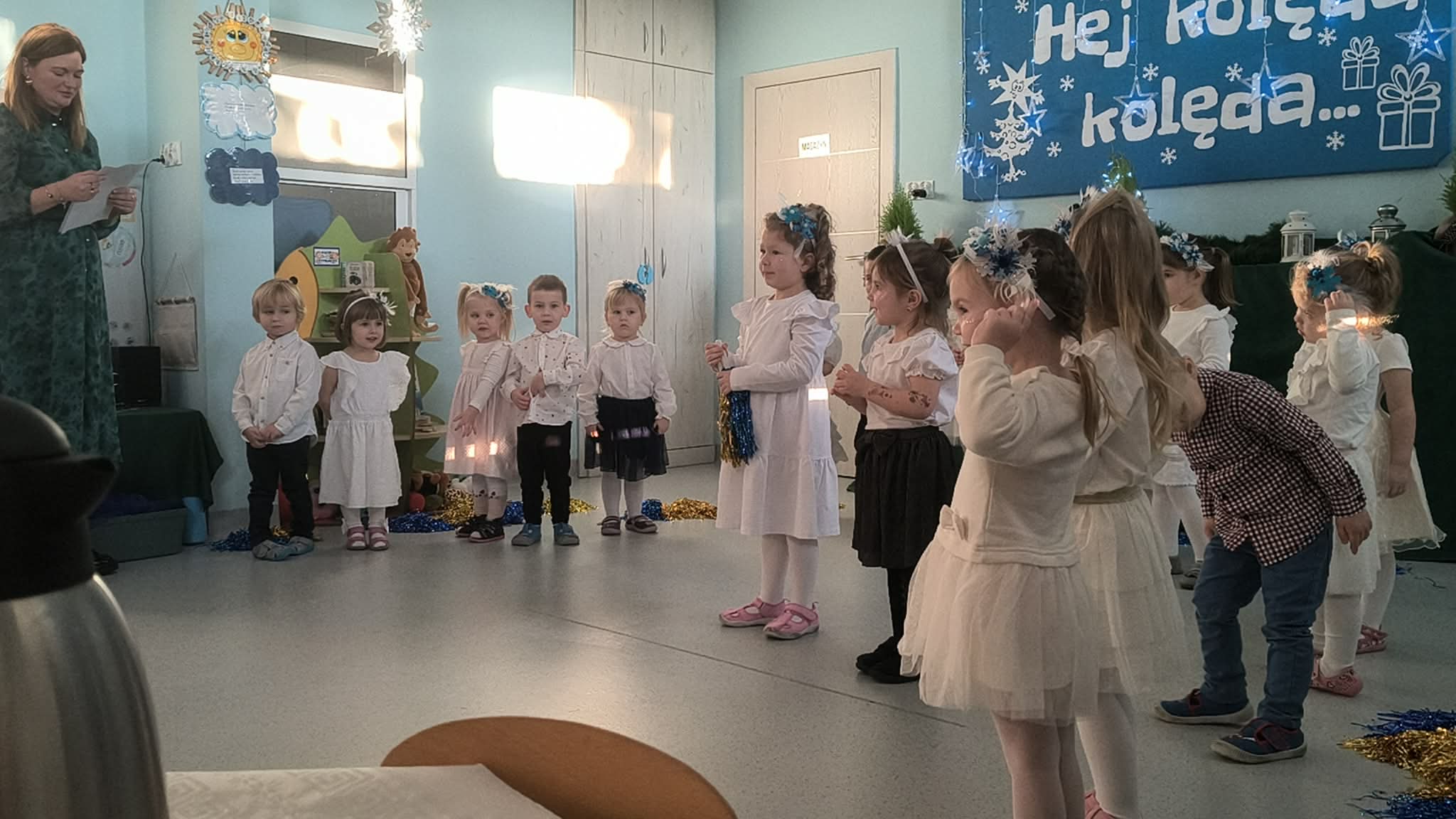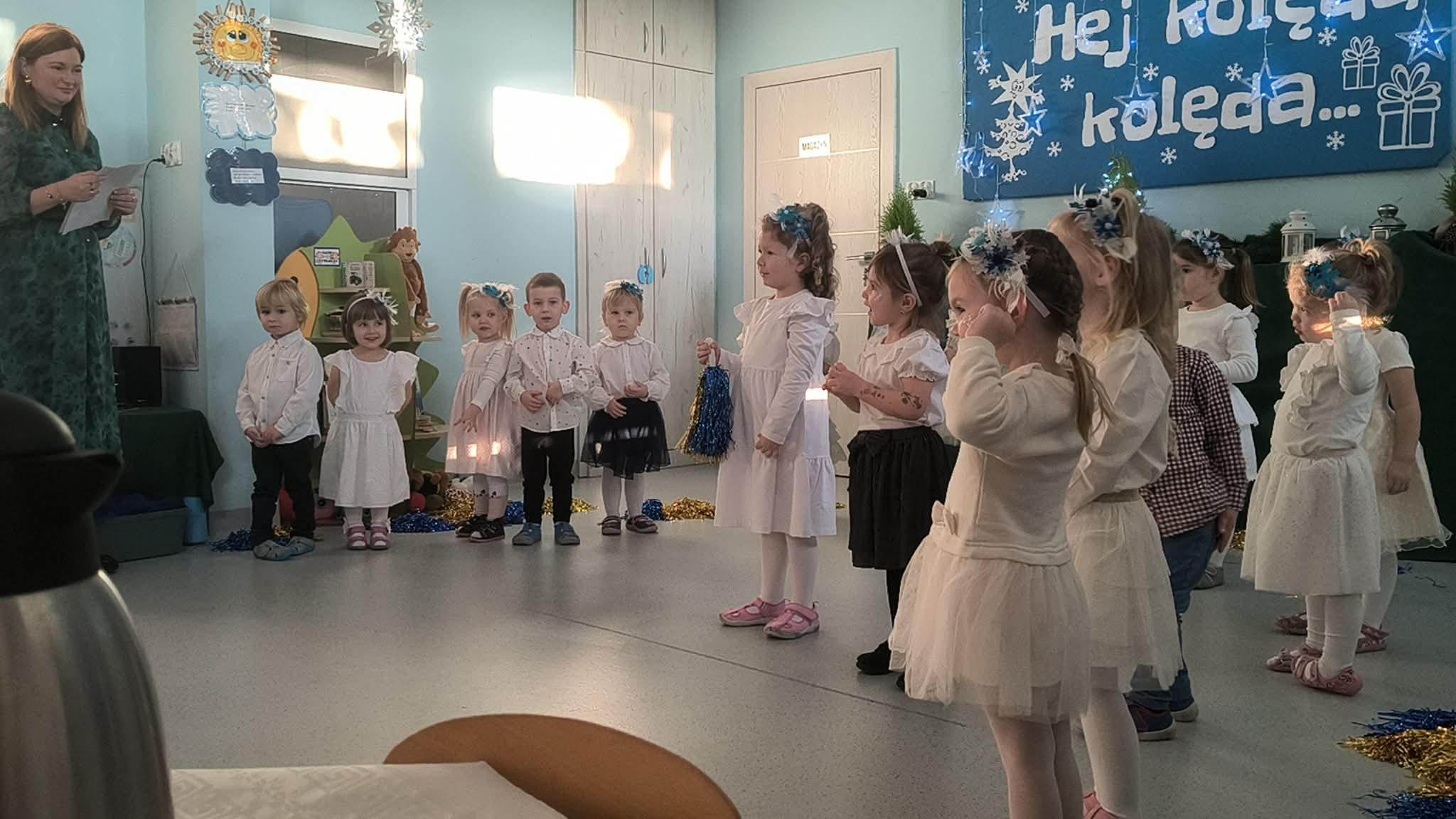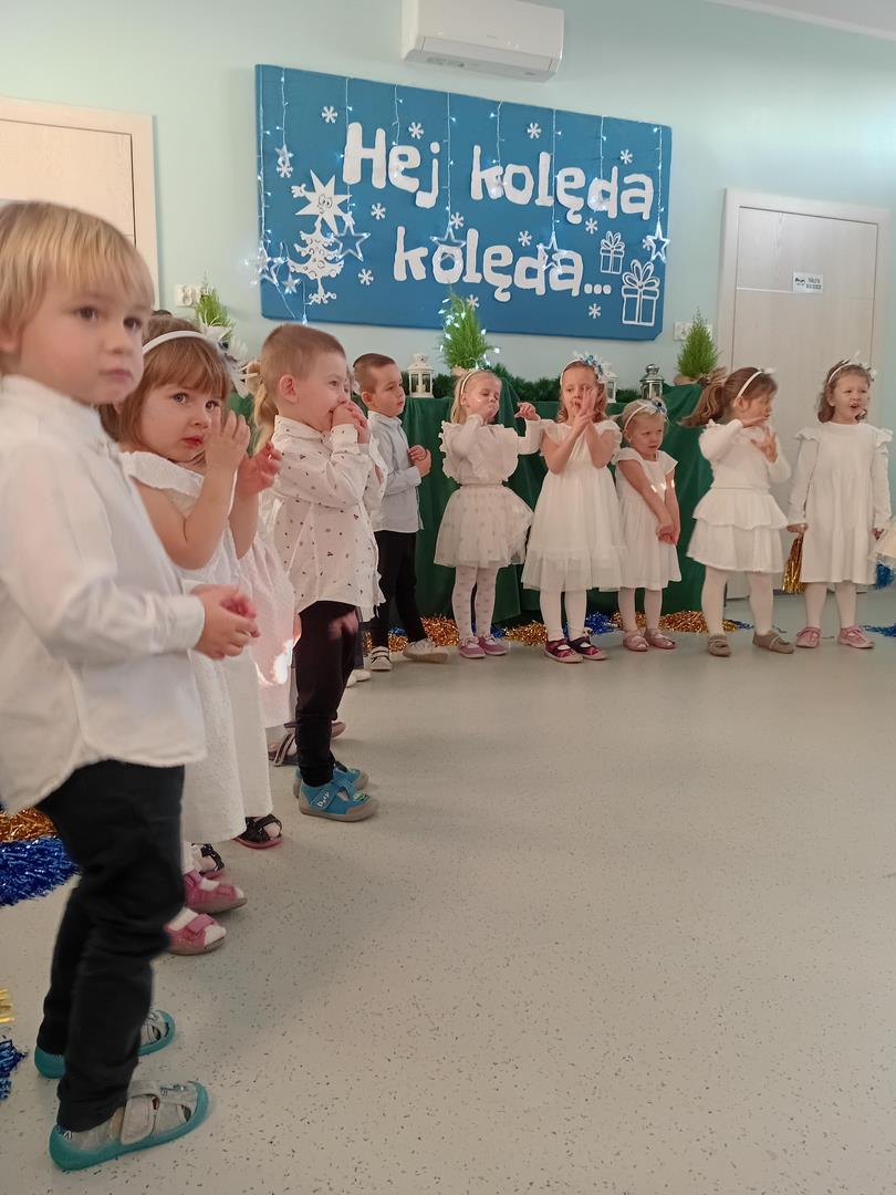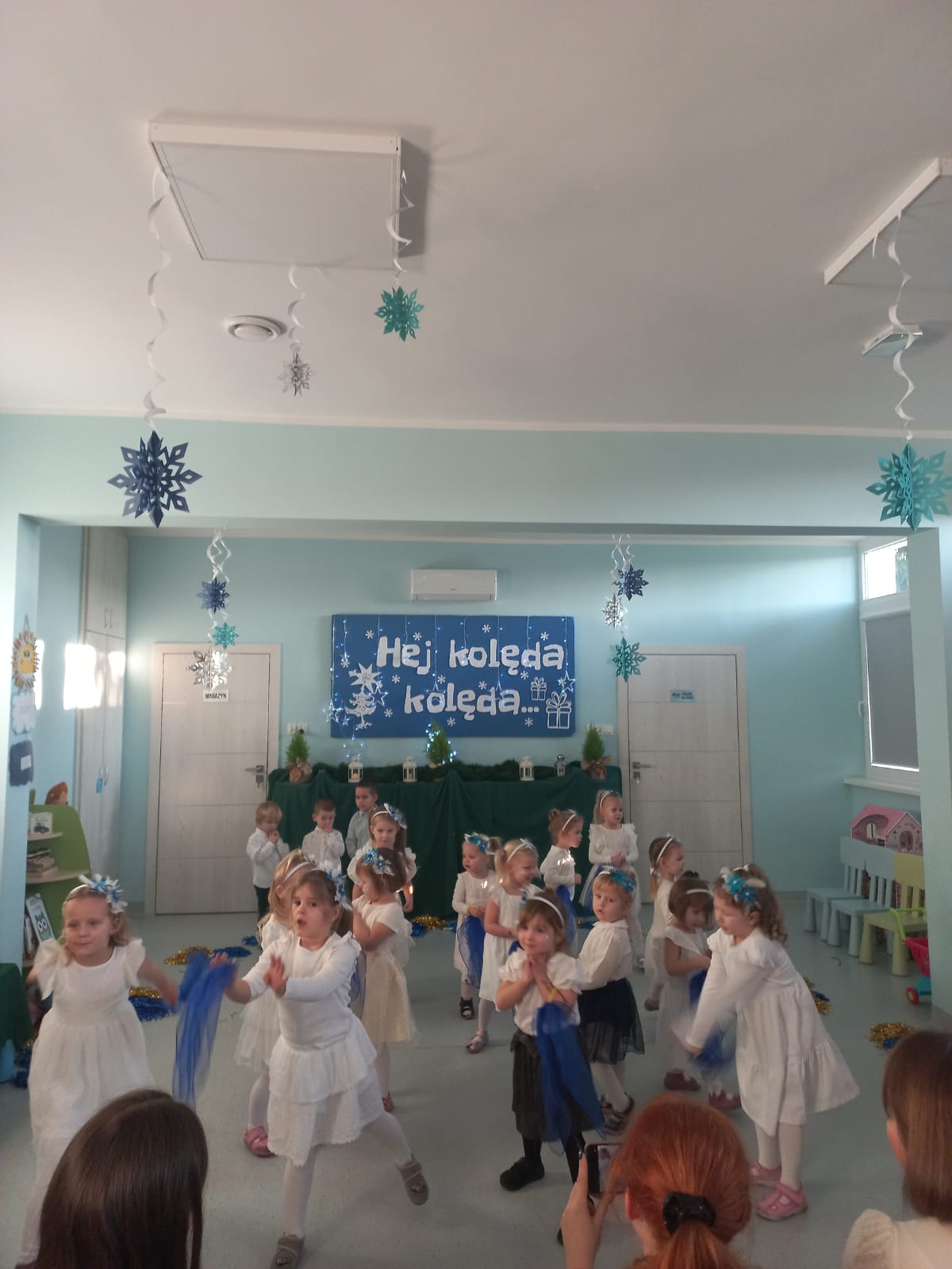 W środę odbyły się w naszej sali świąteczne warsztaty. Na początku przenieśliśmy rodziców do magicznej zimowej krainy, pozjeżdżaliśmy na saneczkach i nawet wyczarowaliśmy śnieg. Poczęstowaliśmy gości słodkościami, a na koniec wykonaliśmy wspólnie śnieżne kule.