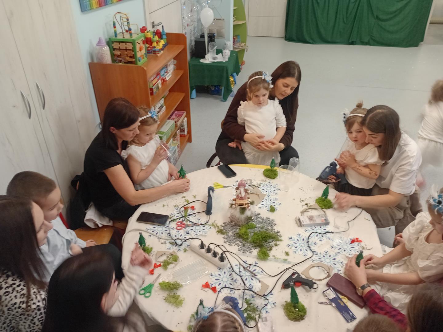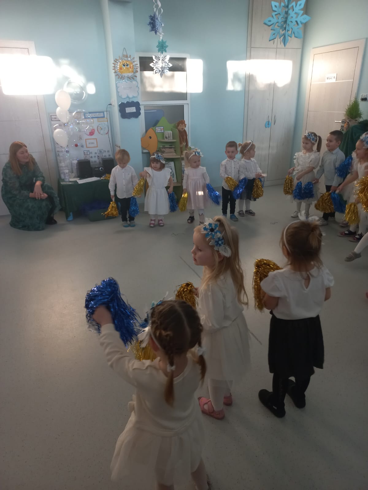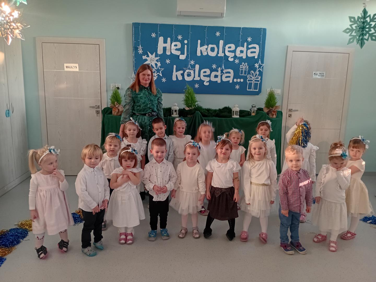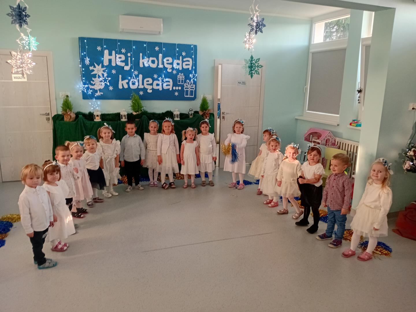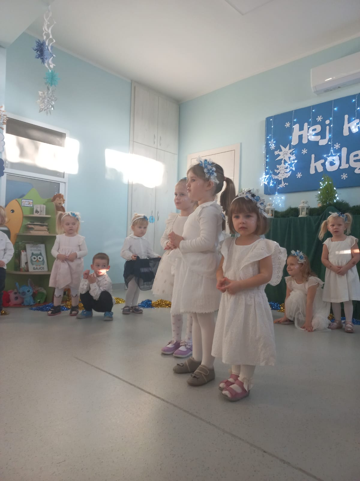 W środę odbyły się w naszej sali świąteczne warsztaty. Na początku przenieśliśmy rodziców do magicznej zimowej krainy, pozjeżdżaliśmy na saneczkach i nawet wyczarowaliśmy śnieg. Poczęstowaliśmy gości słodkościami, a na koniec wykonaliśmy wspólnie śnieżne kule.