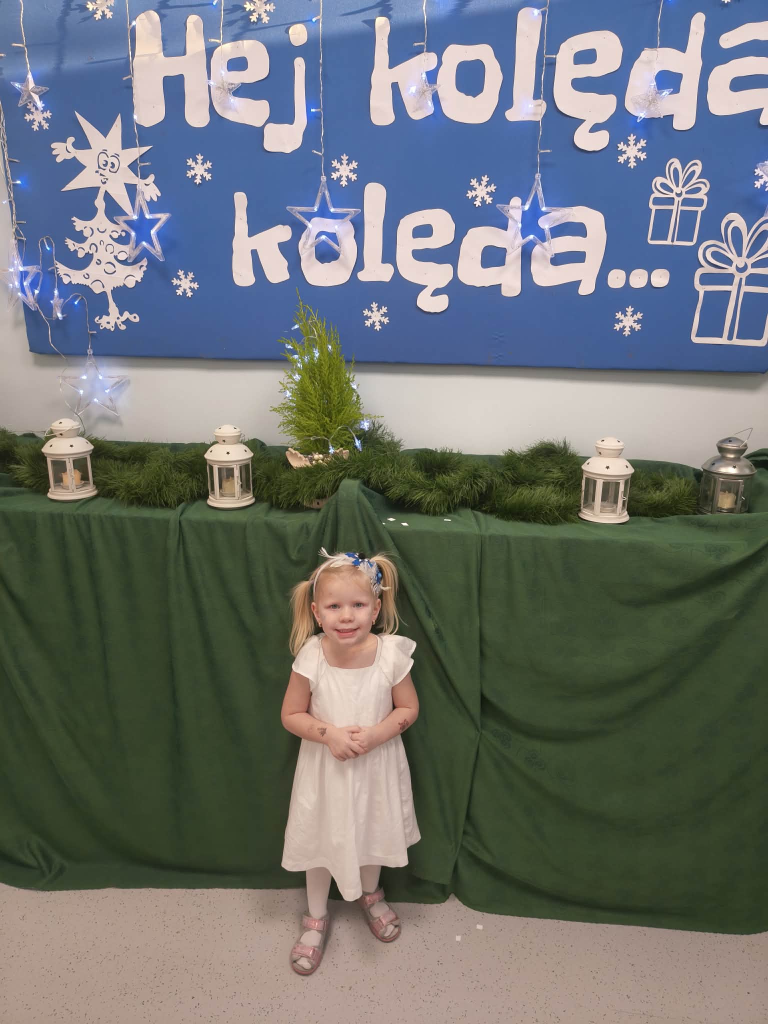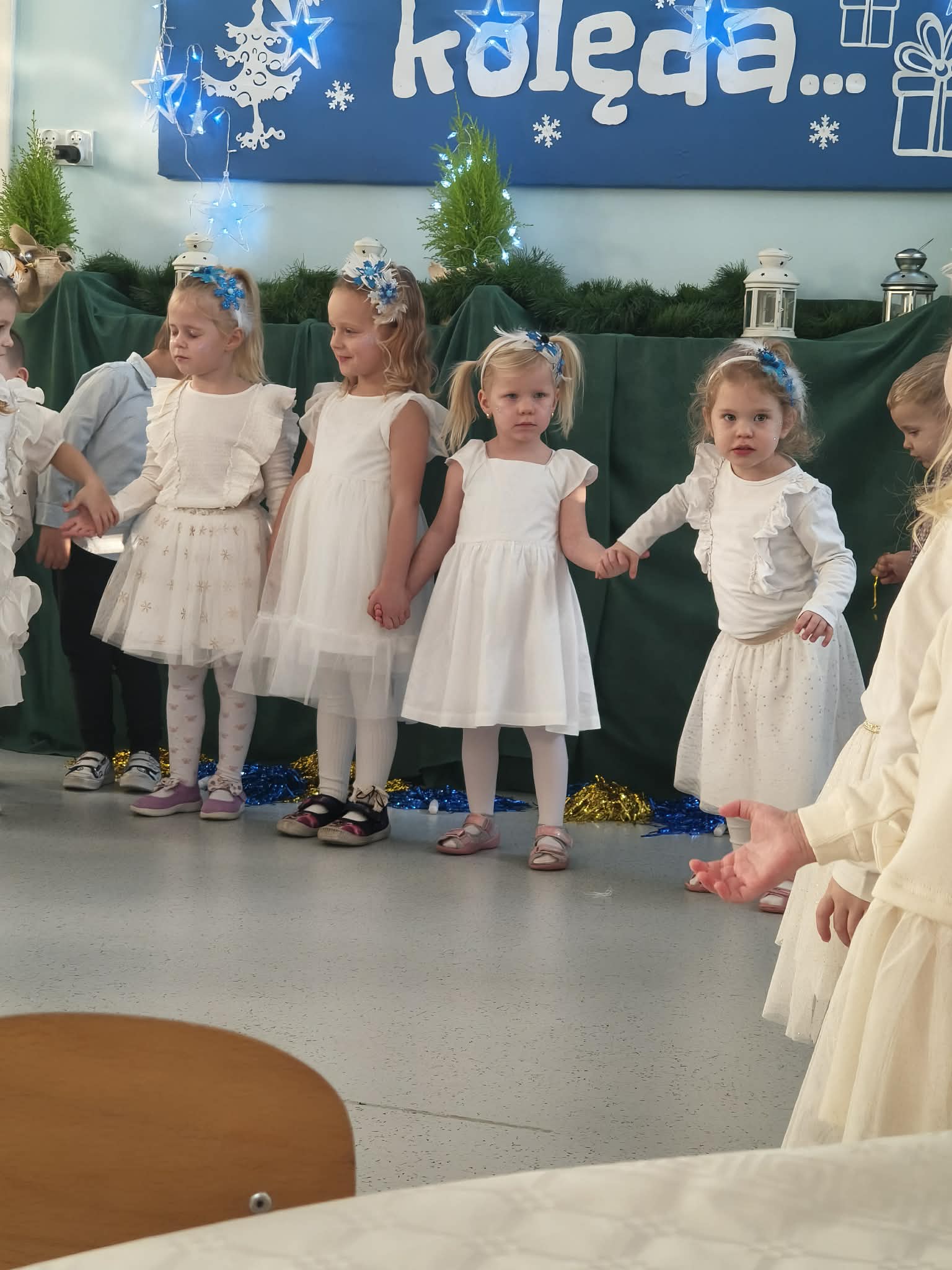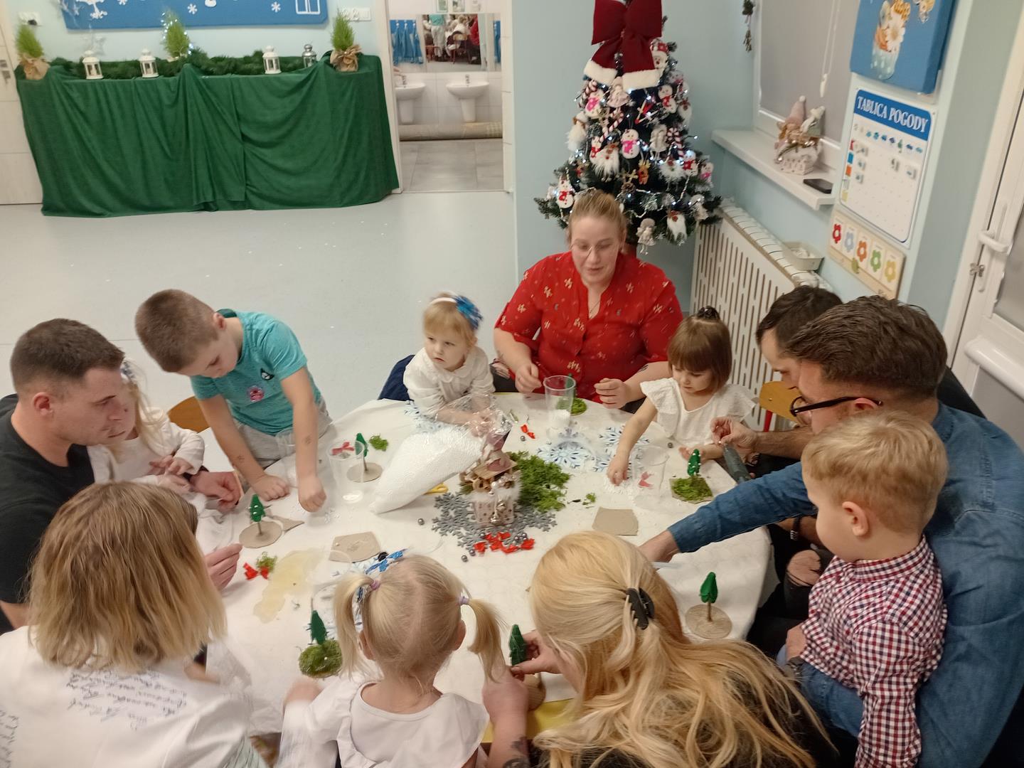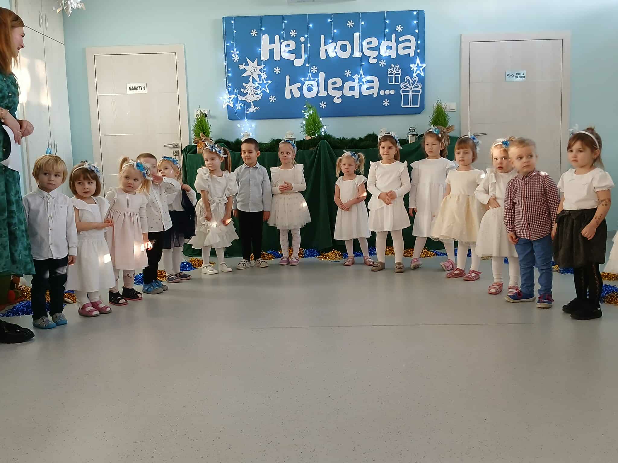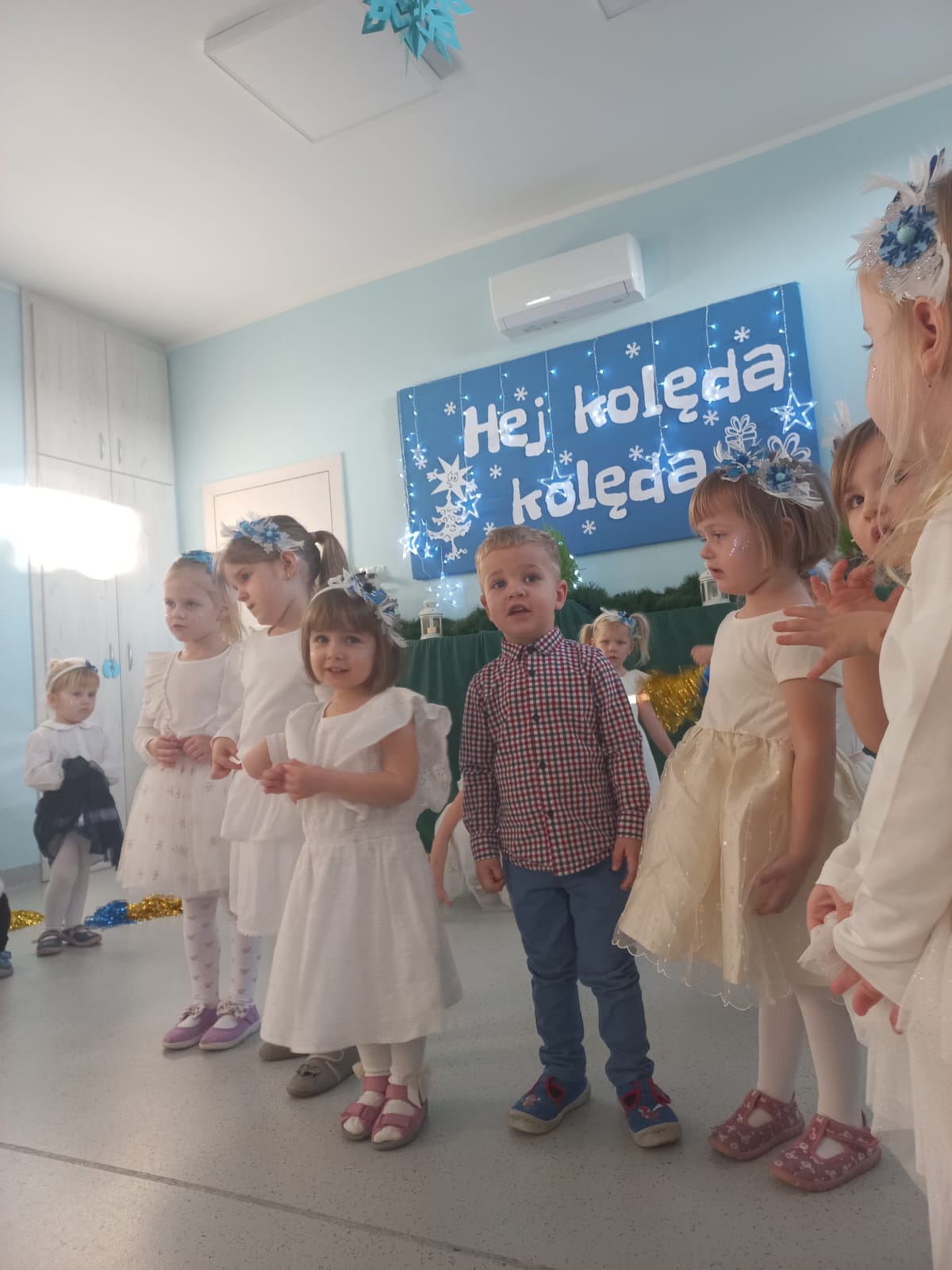 W środę odbyły się w naszej sali świąteczne warsztaty. Na początku przenieśliśmy rodziców do magicznej zimowej krainy, pozjeżdżaliśmy na saneczkach i nawet wyczarowaliśmy śnieg. Poczęstowaliśmy gości słodkościami, a na koniec wykonaliśmy wspólnie śnieżne kule.