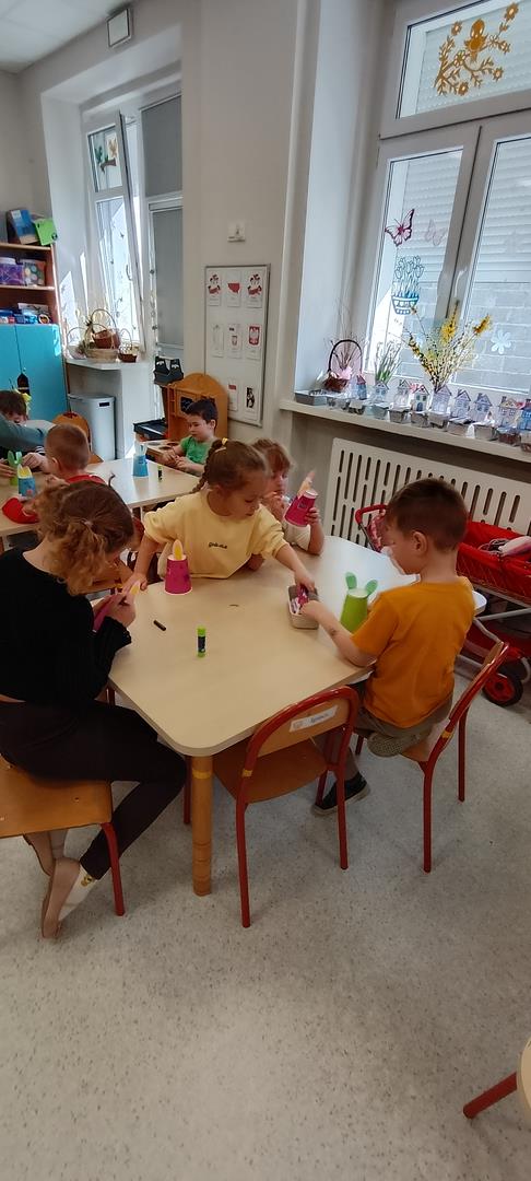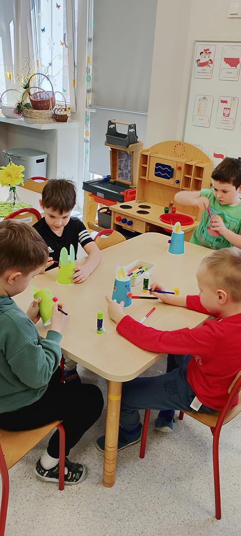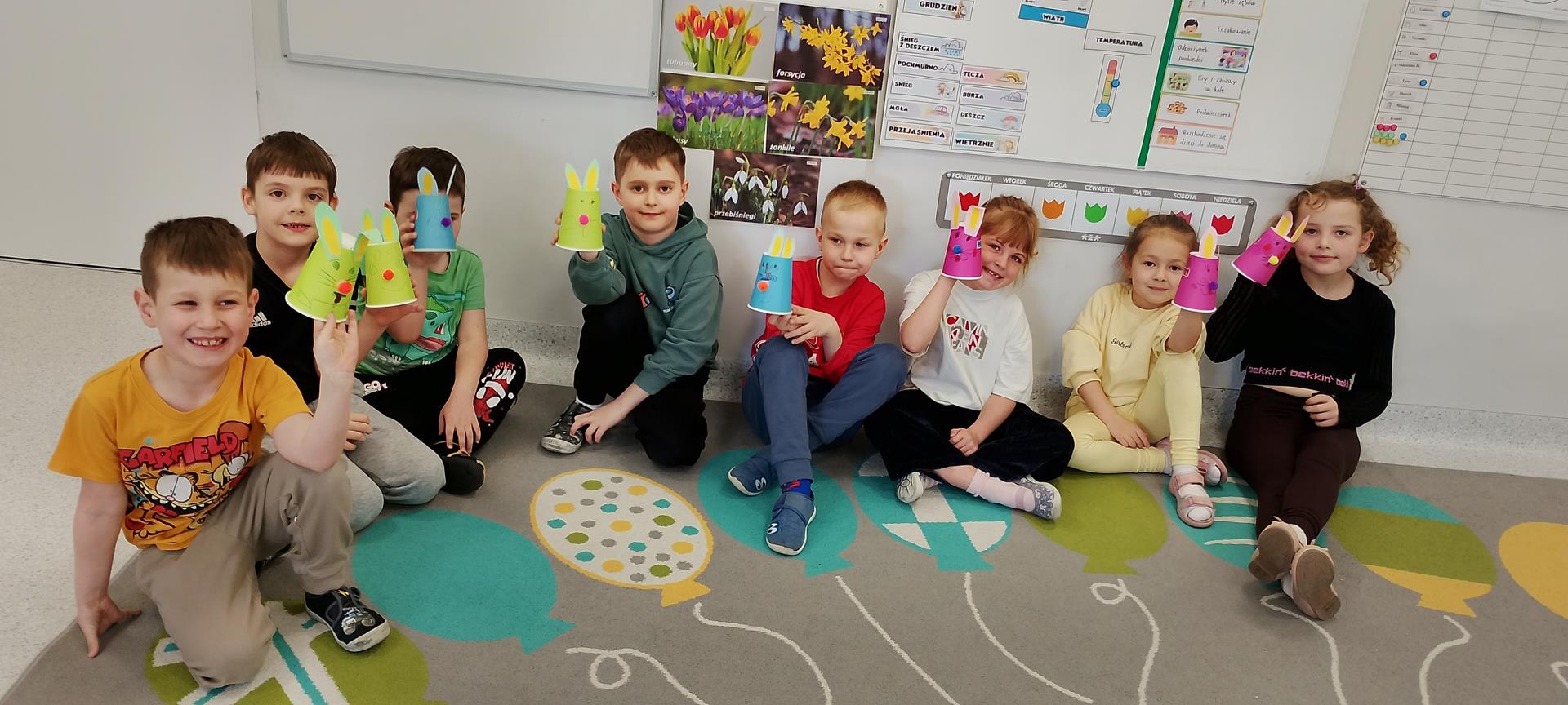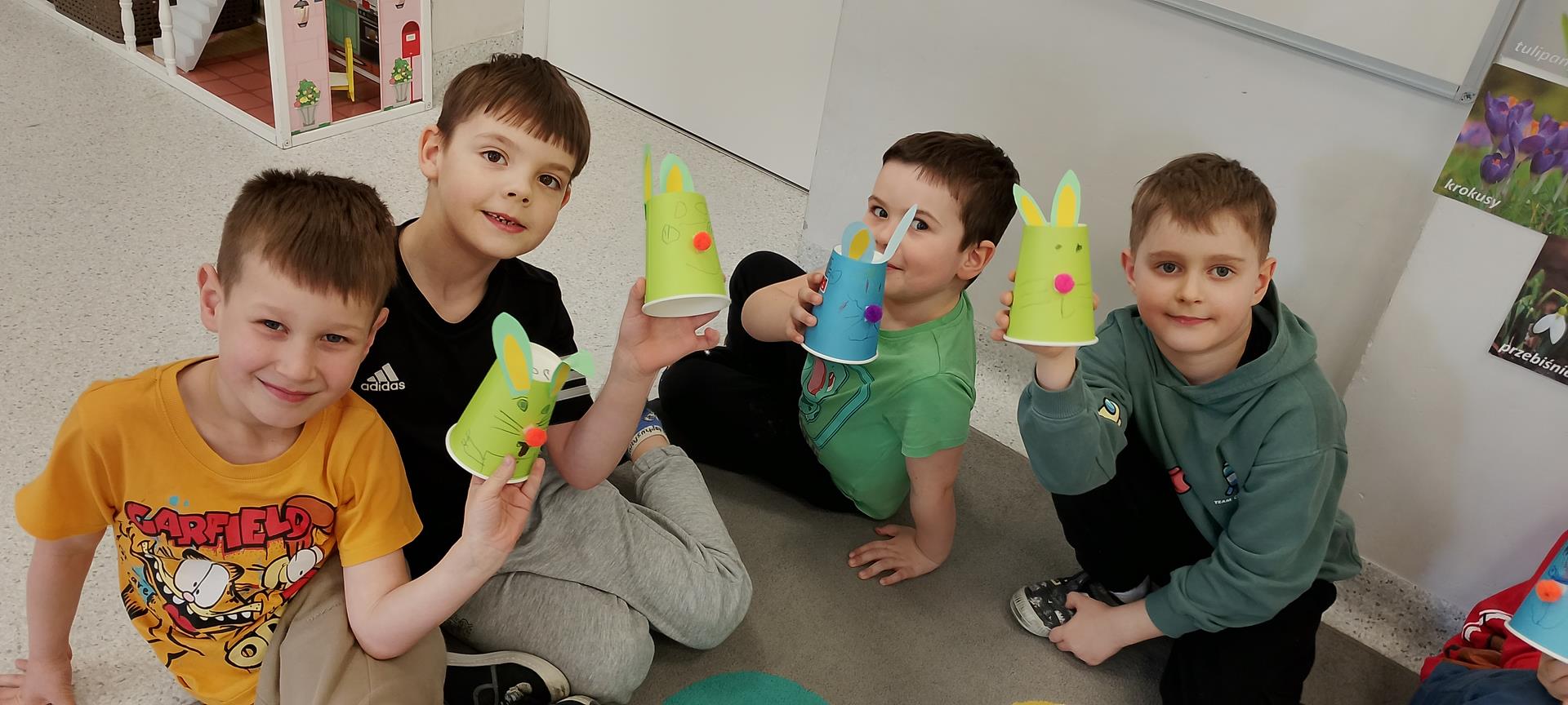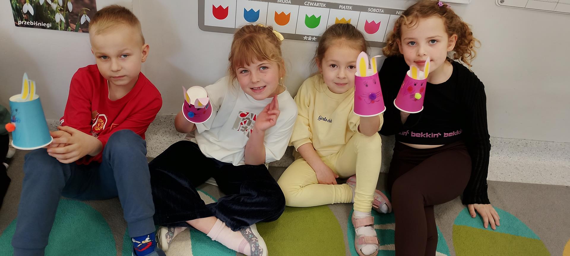 Przedszkolaki wykonały śliczne wielkanocne zajączki z papierowych kubeczków. Dzieci zabrały prace do domu, by mogły zdobić ich pokój.