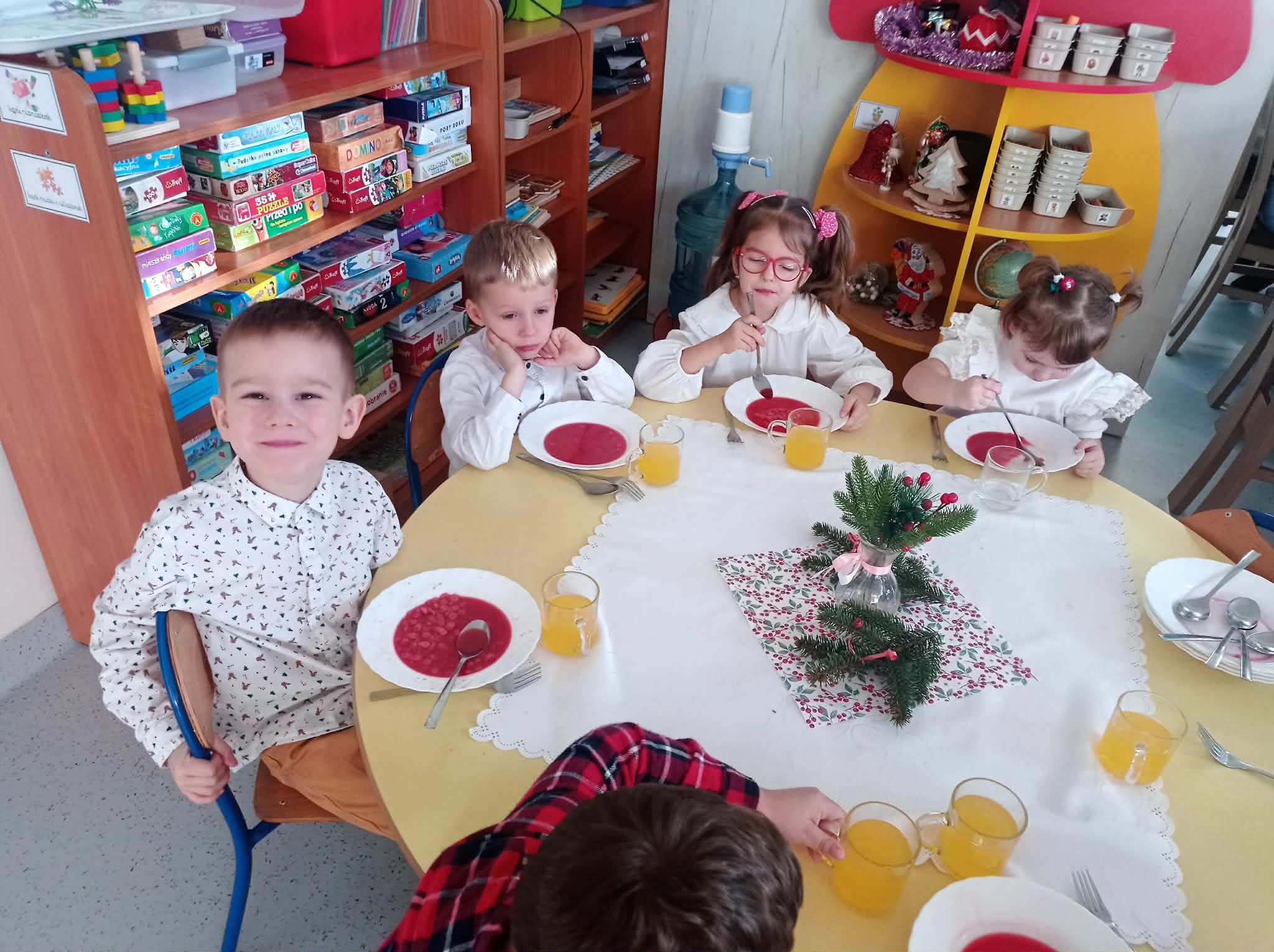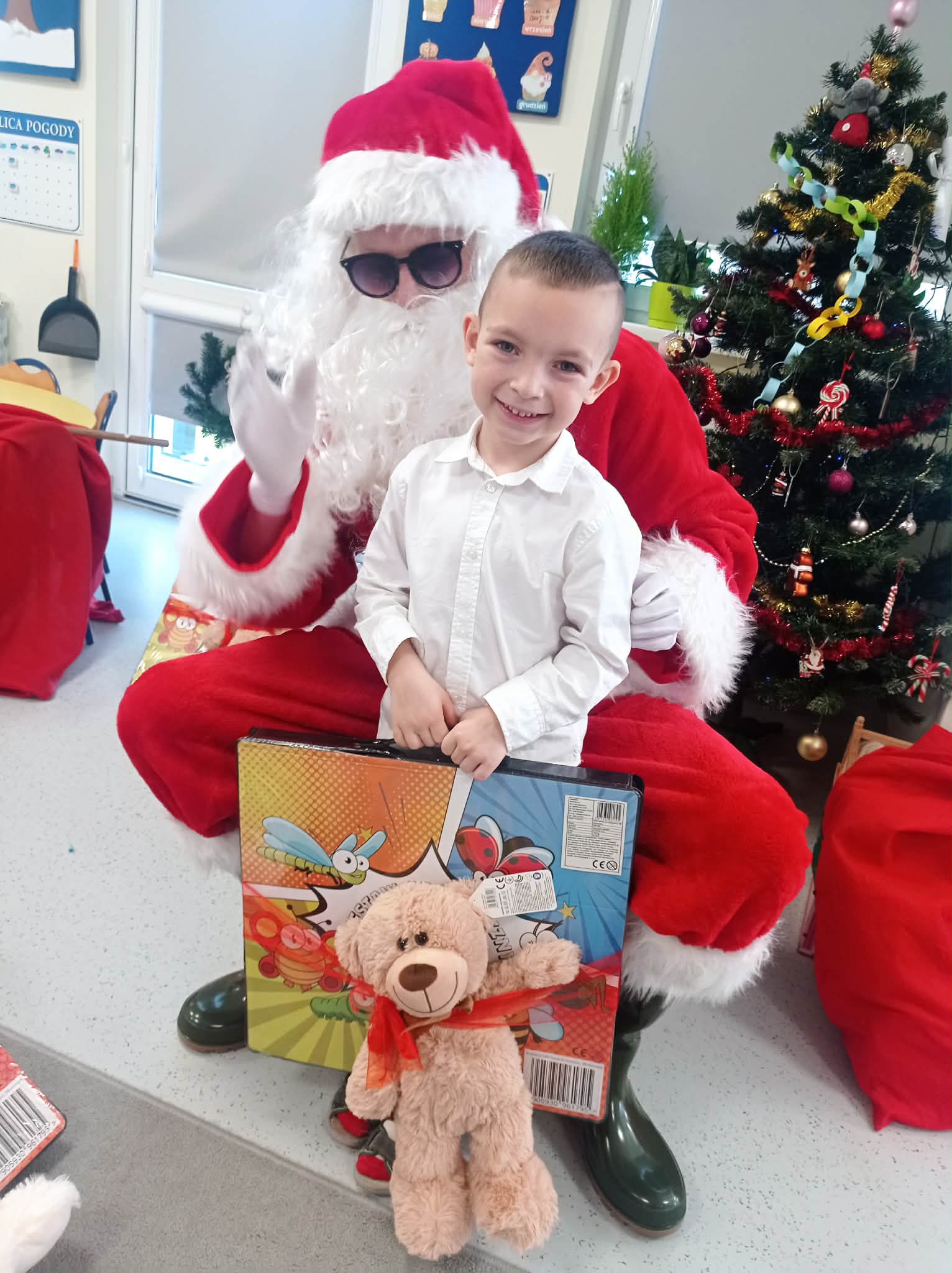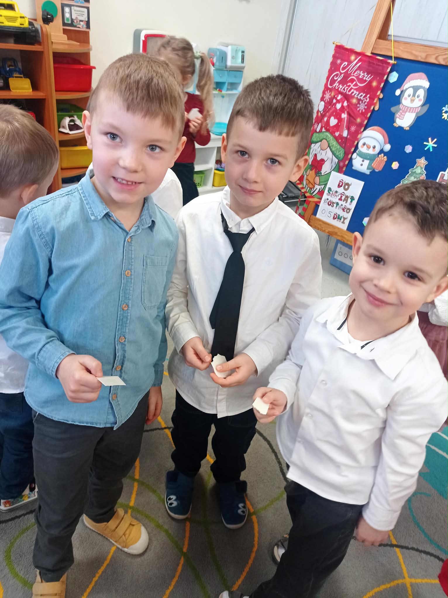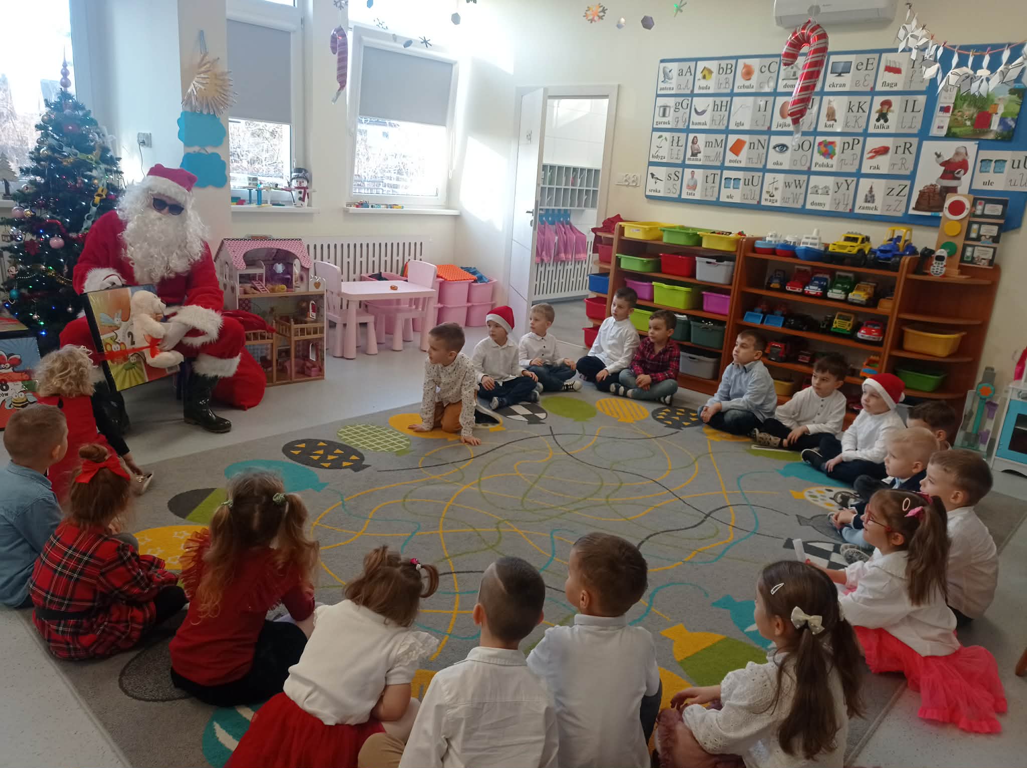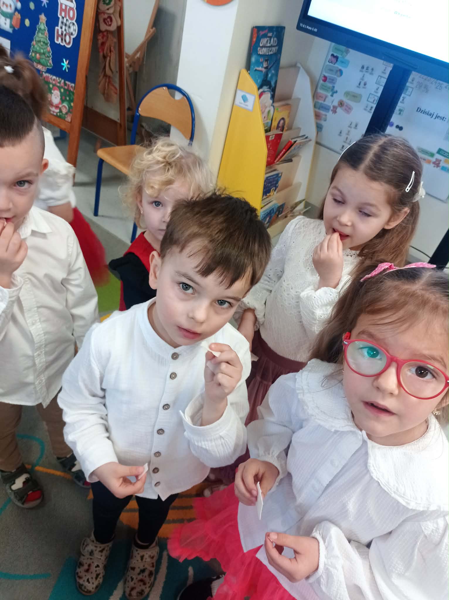 W grupie odbyła się uroczysta Wigilia przedszkolna.Dzieliliśmy się opłatkiem, składając sobie serdeczne życzenia, a wyjątkową radość sprawiły dzieciom odwiedziny Gwiazdora.