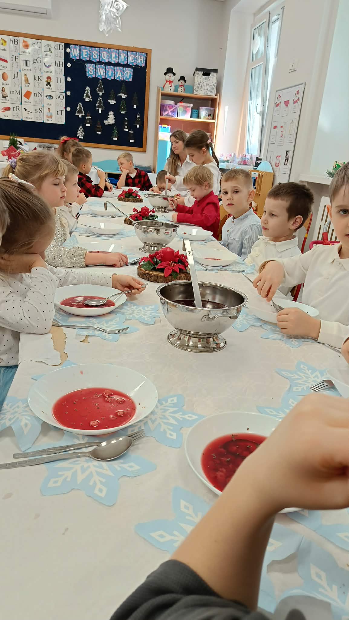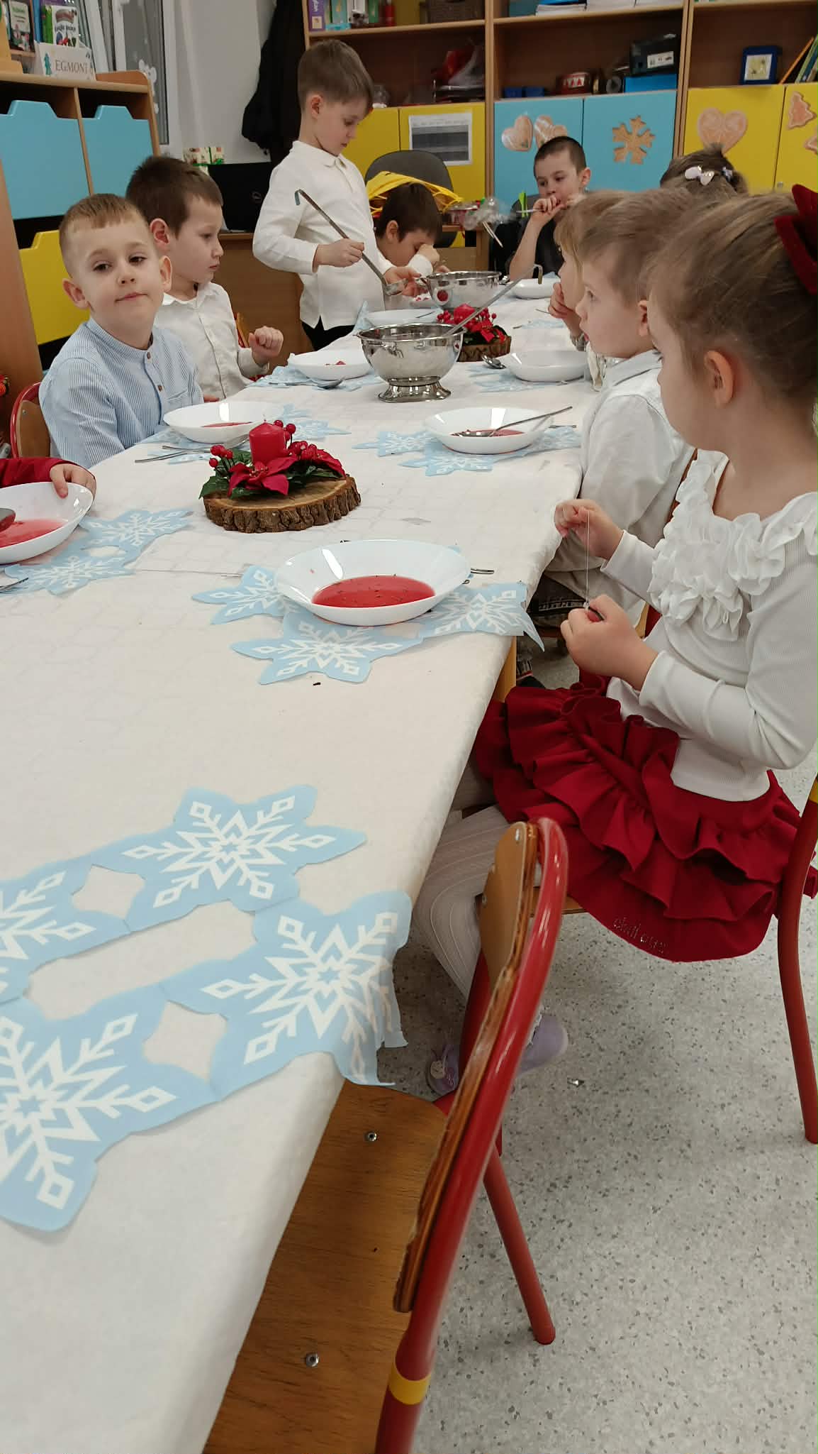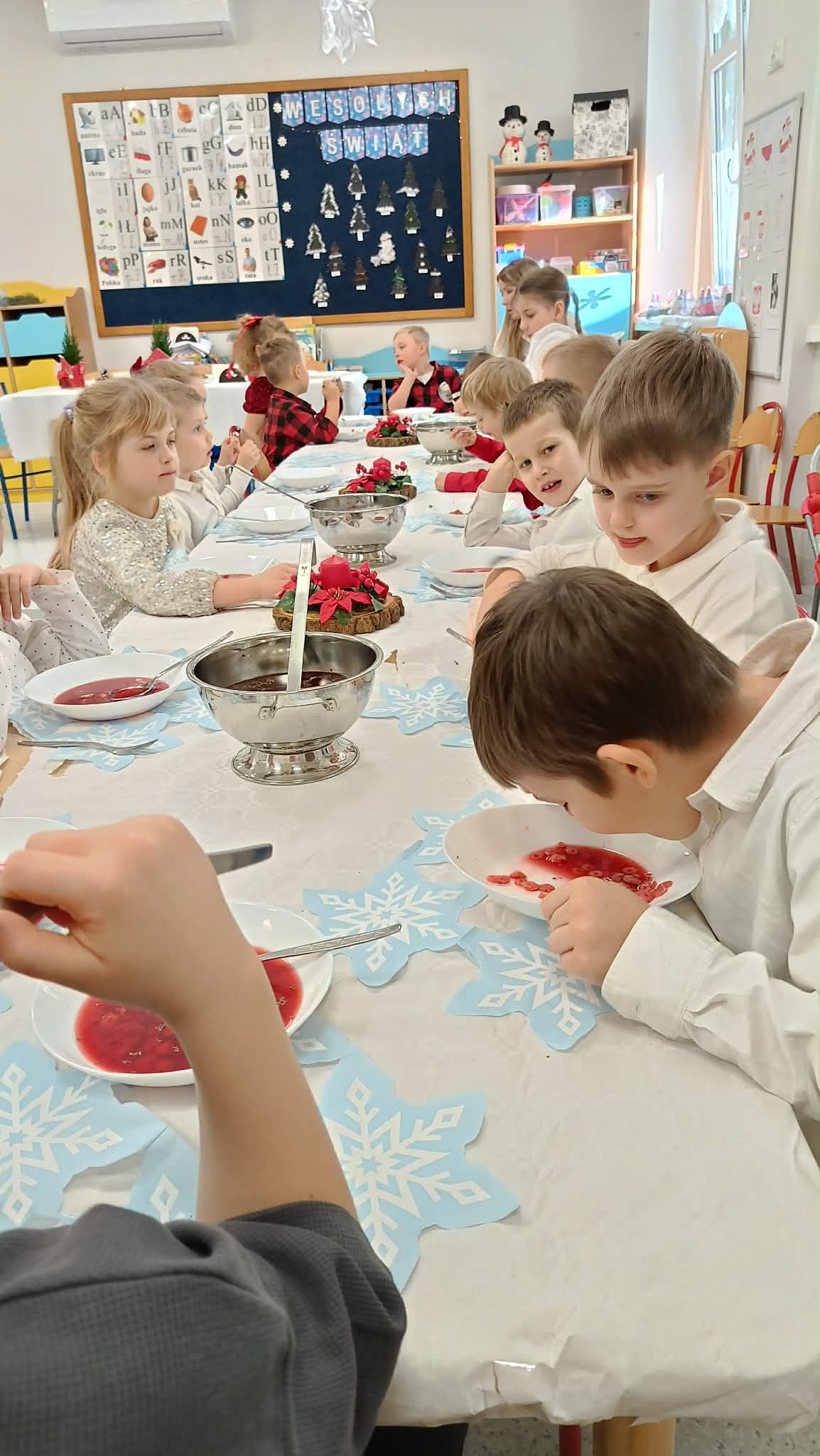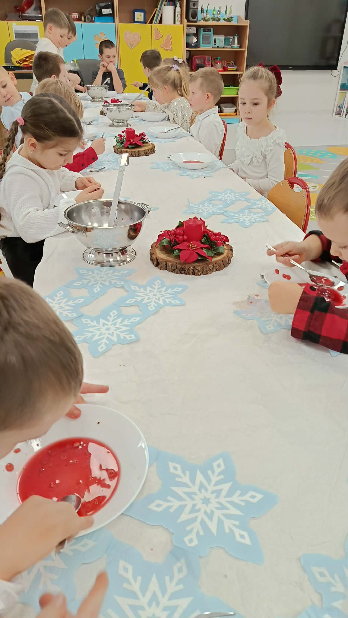 W piątek, 19 grudnia, w naszym przedszkolu odbyła się uroczysta Wigilia. Dzieci w odświętnych strojach śpiewały kolędy, brały udział w zabawach związanych ze świętami oraz zimą, a także z radością powitały Gwiazdora, od którego otrzymały prezenty. Wspólnie z zaproszonymi gośćmi – Paniami Dyrektor – zasiedliśmy do uroczystego drugiego śniadania. Podczas obiadu nie zabrakło tradycyjnych potraw. Spotkanie upłynęło w ciepłej, świątecznej atmosferze.
