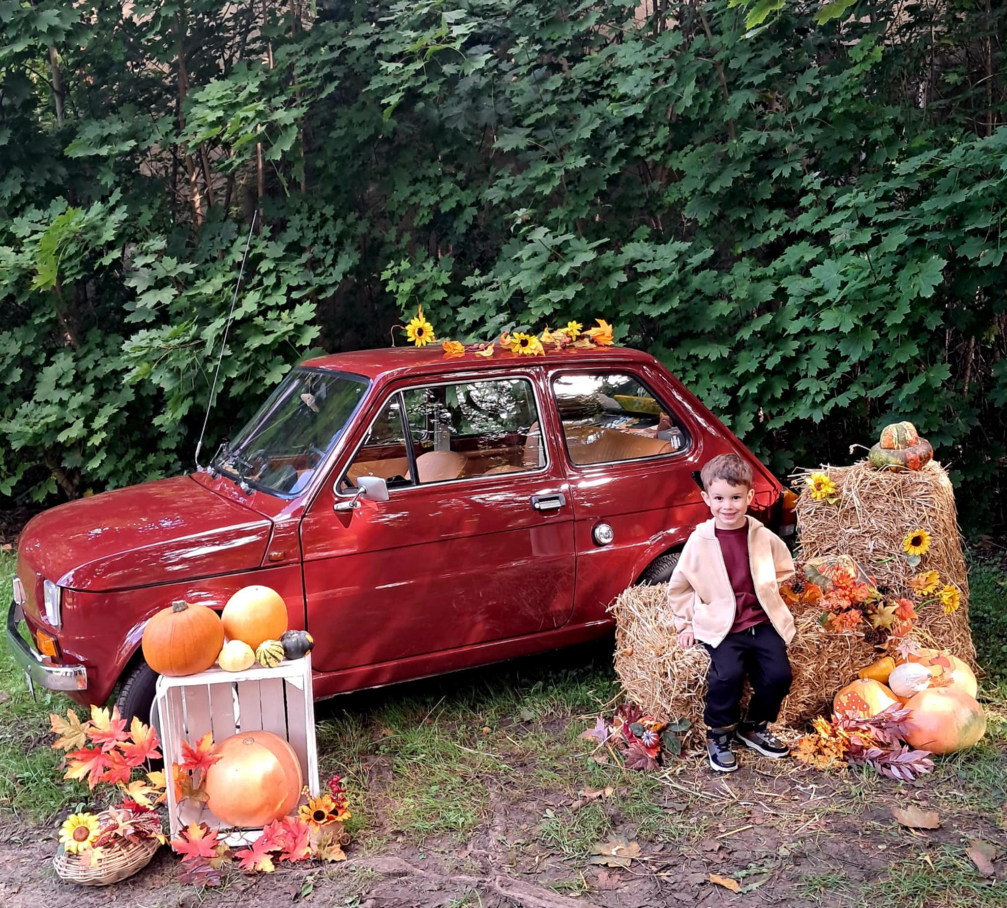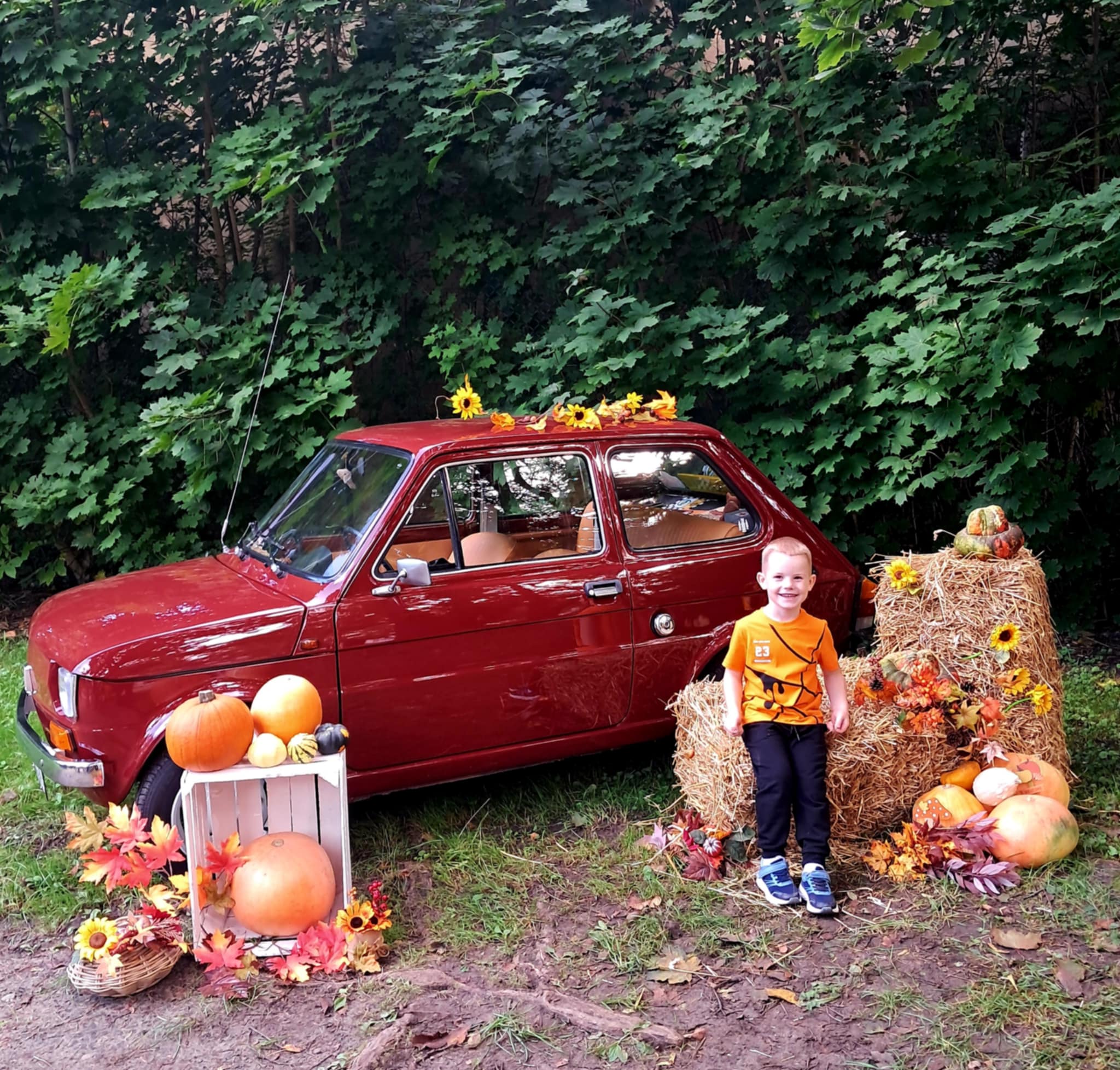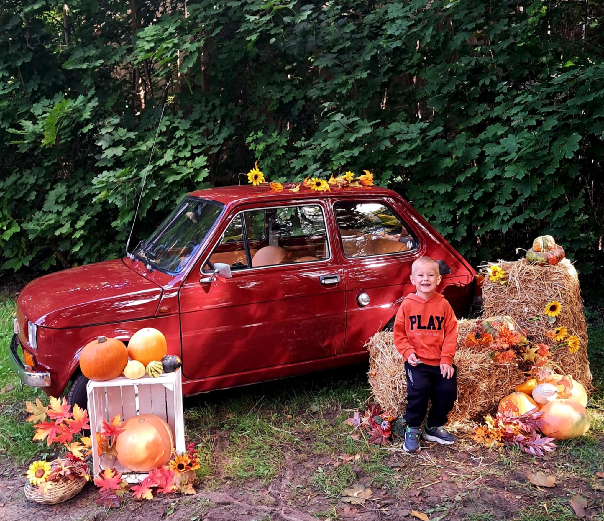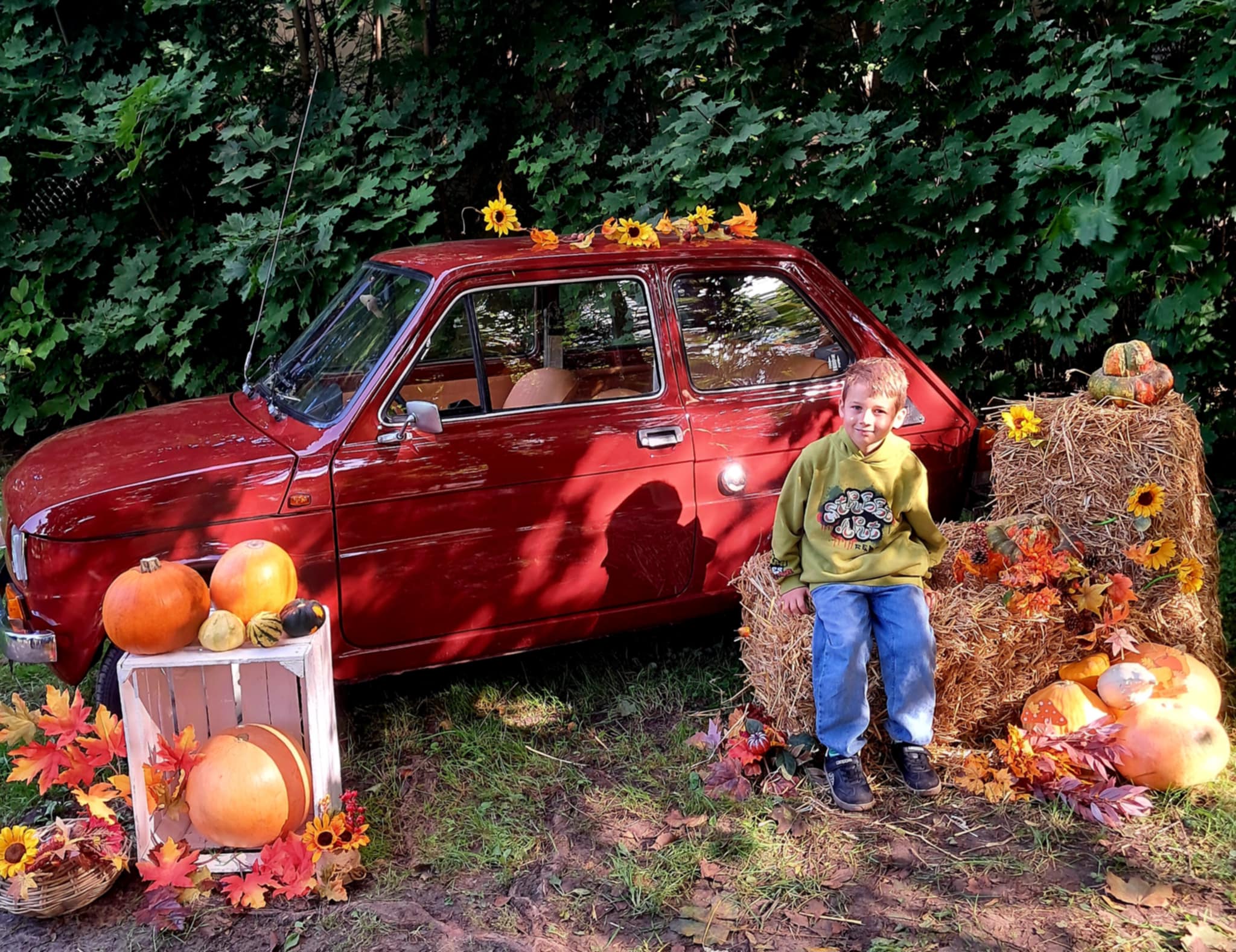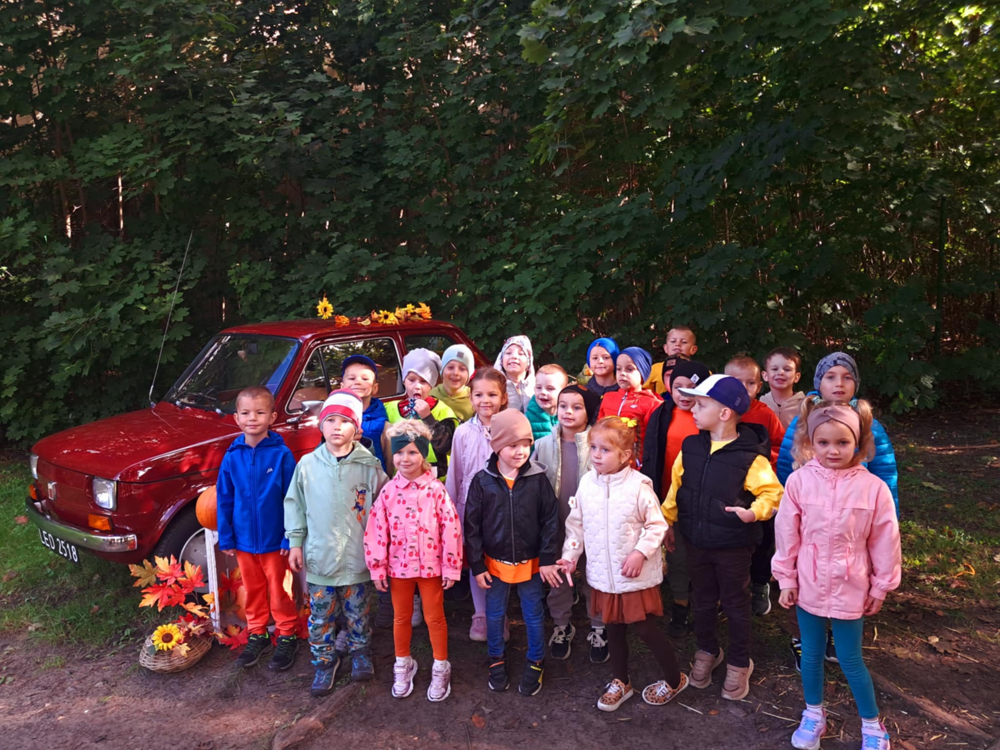 Dziś powitaliśmy jesień! Dzieci wybrały się na spacer do parku. Nie zabrakło także pamiątkowych zdjęć – tym razem w wyjątkowym towarzystwie jesiennego rekwizytu – kultowego auta „Malucha”!
