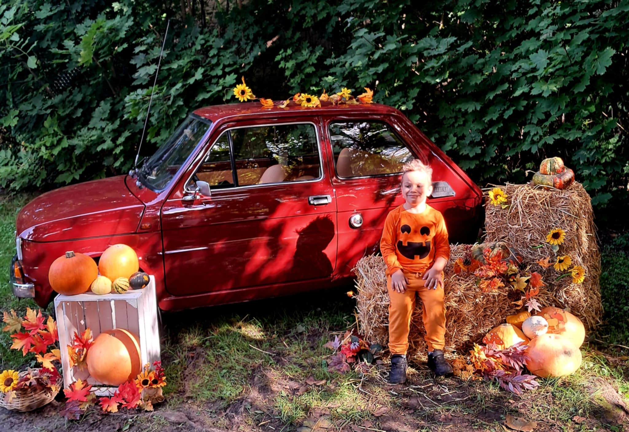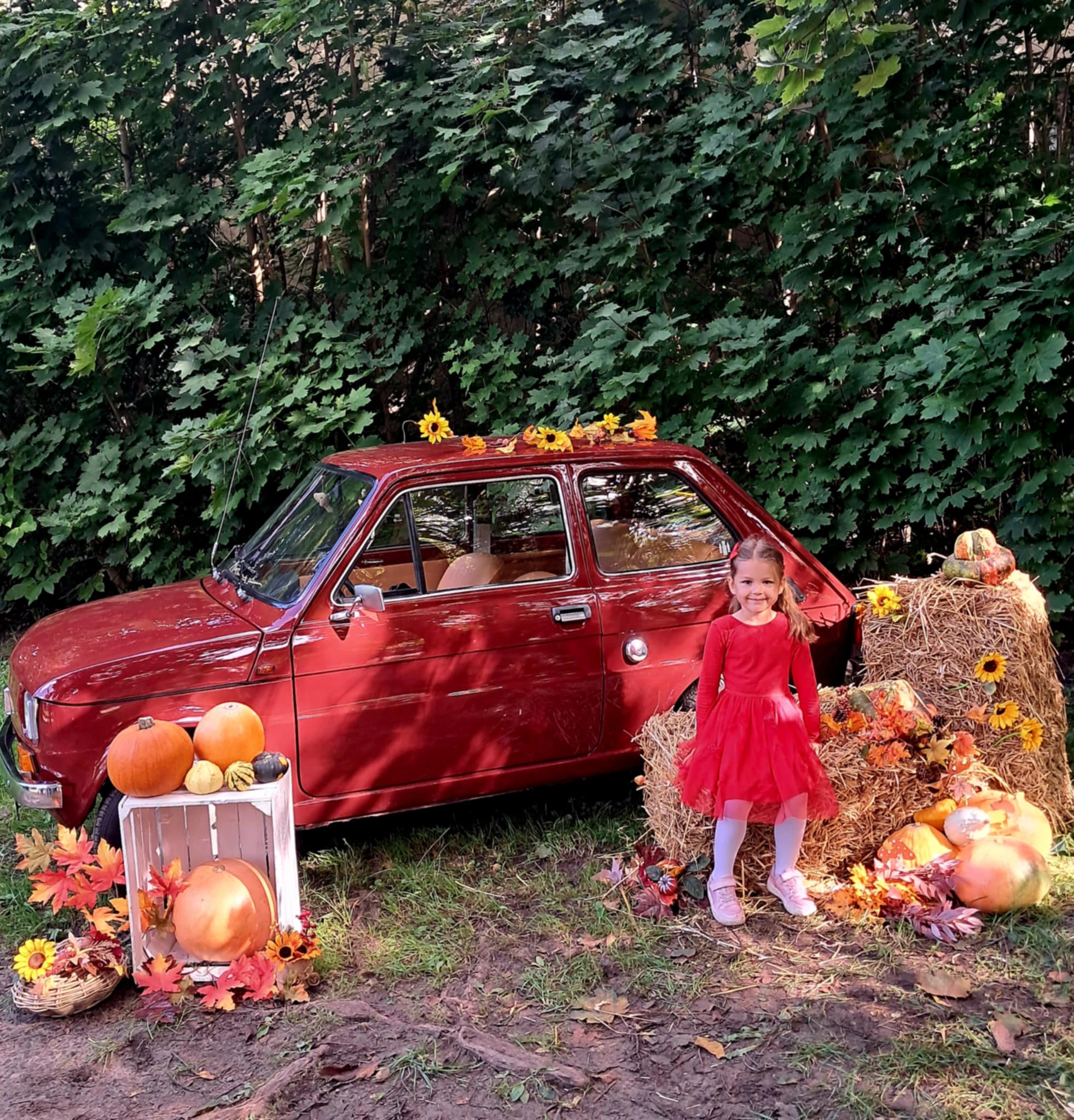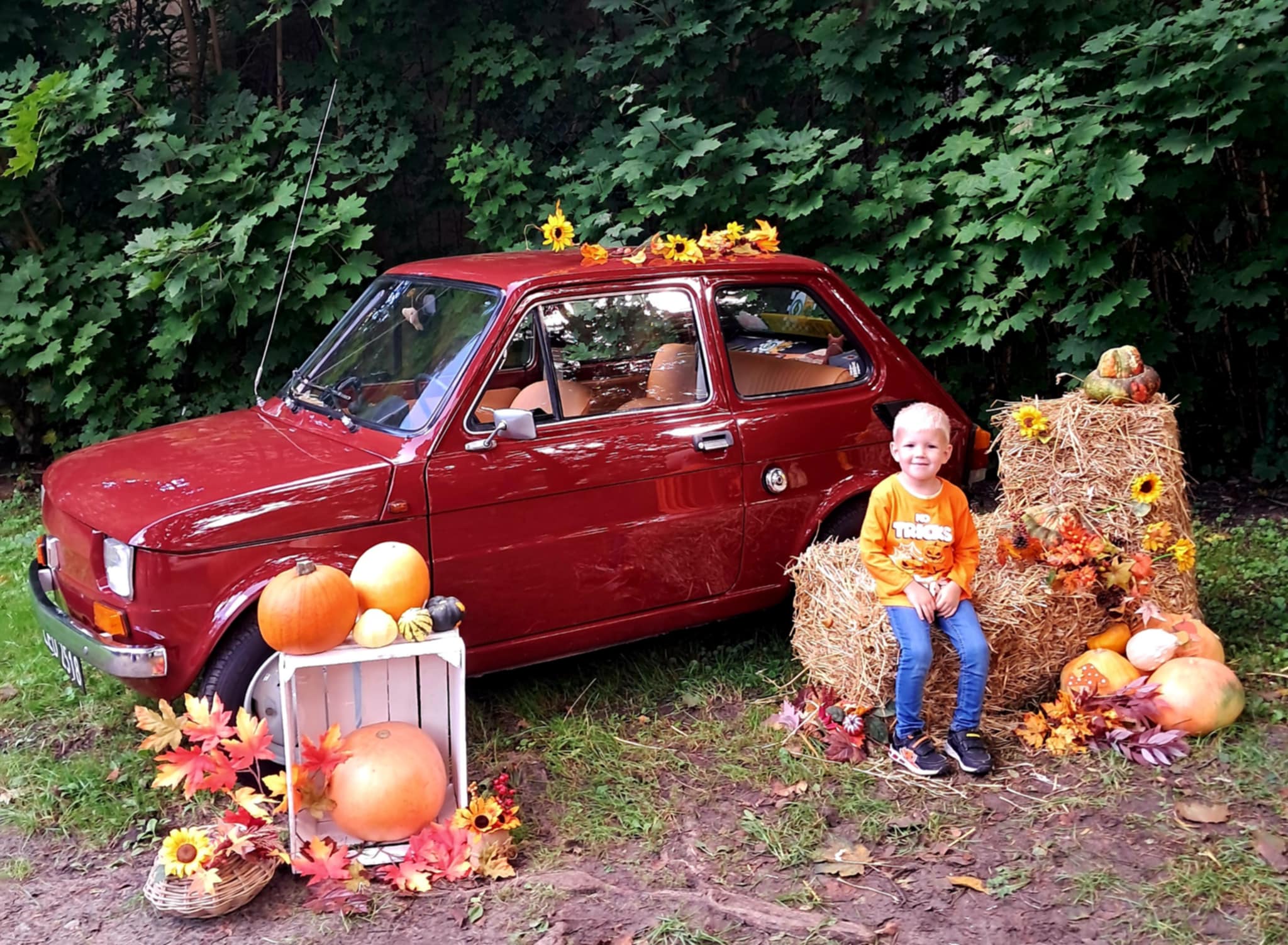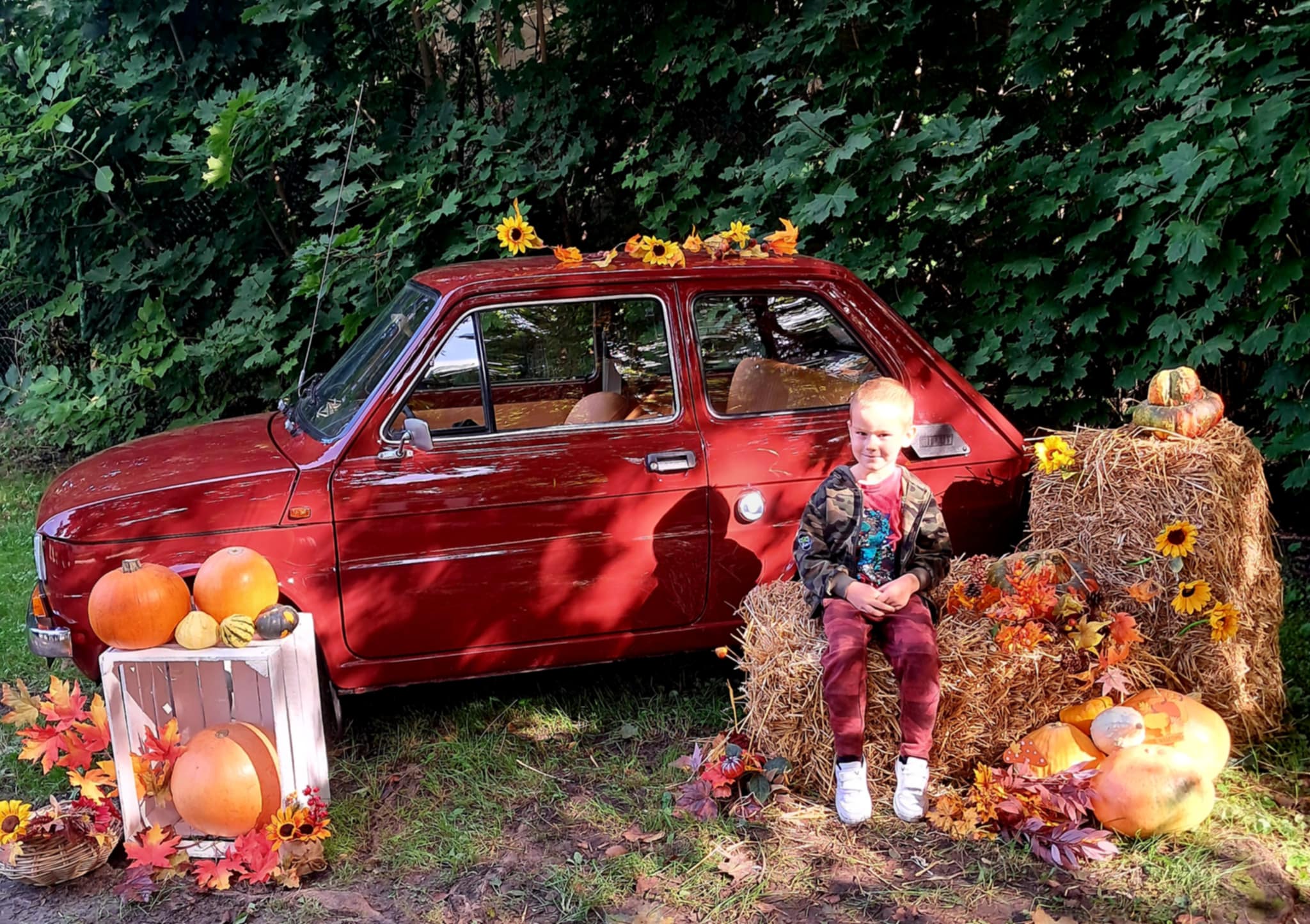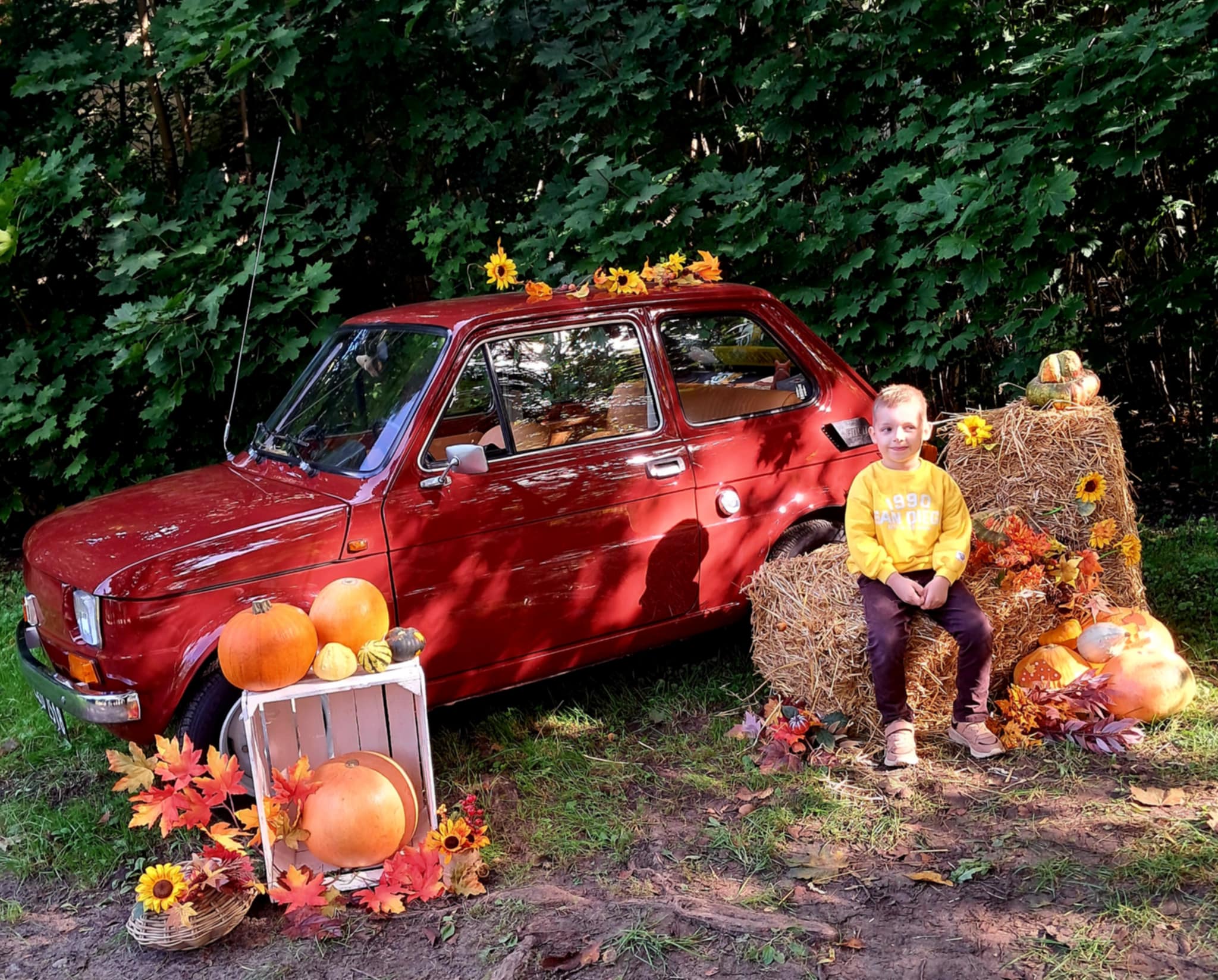 Dziś powitaliśmy jesień! Dzieci wybrały się na spacer do parku. Nie zabrakło także pamiątkowych zdjęć – tym razem w wyjątkowym towarzystwie jesiennego rekwizytu – kultowego auta „Malucha”!
