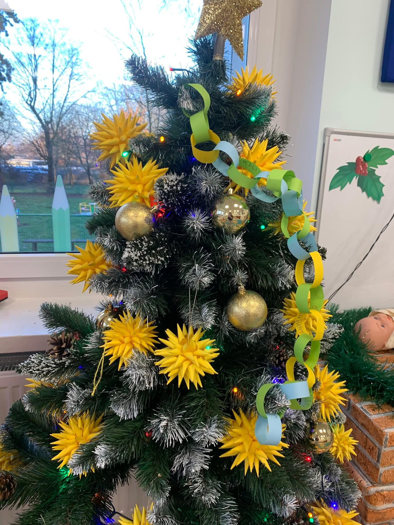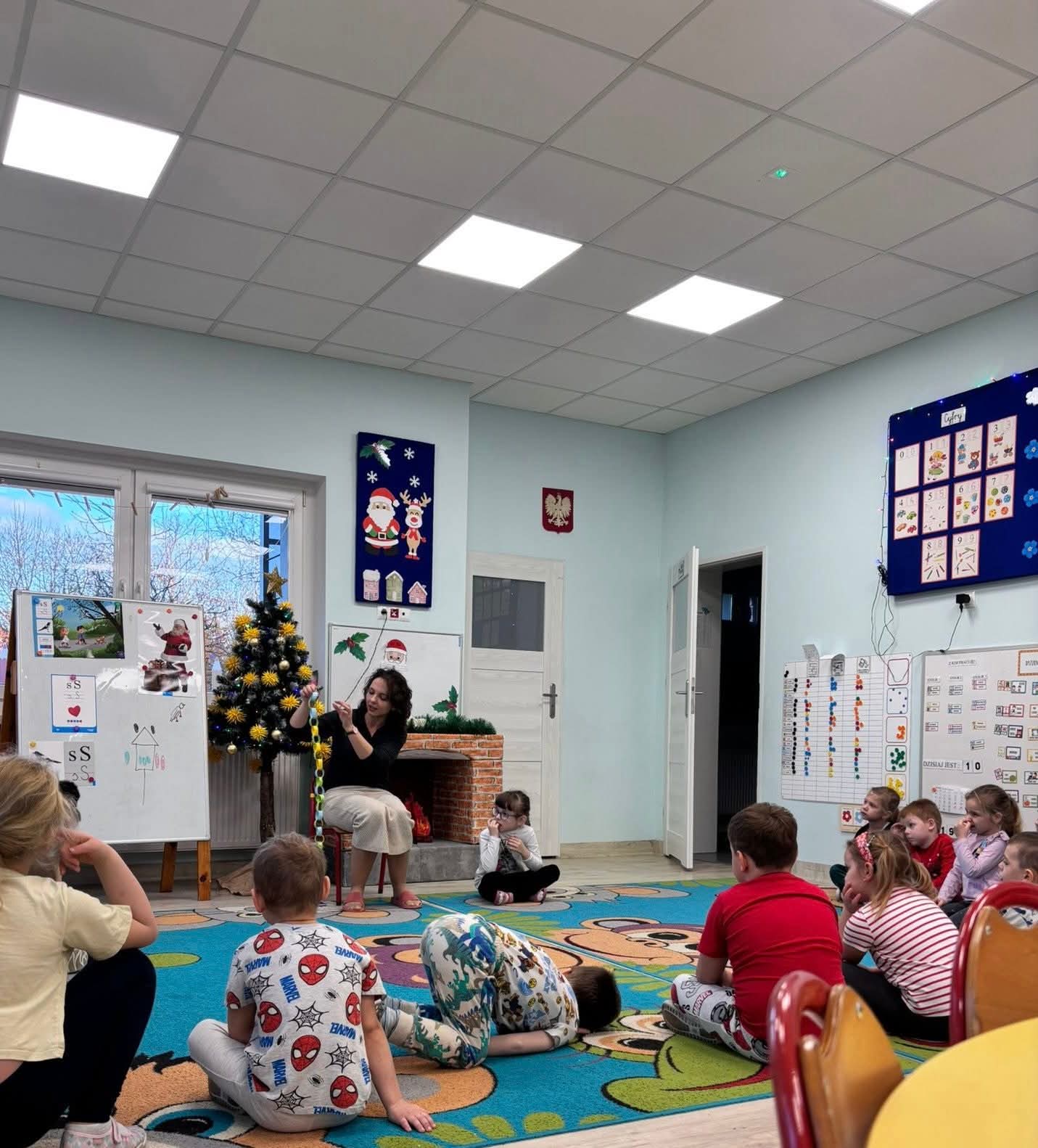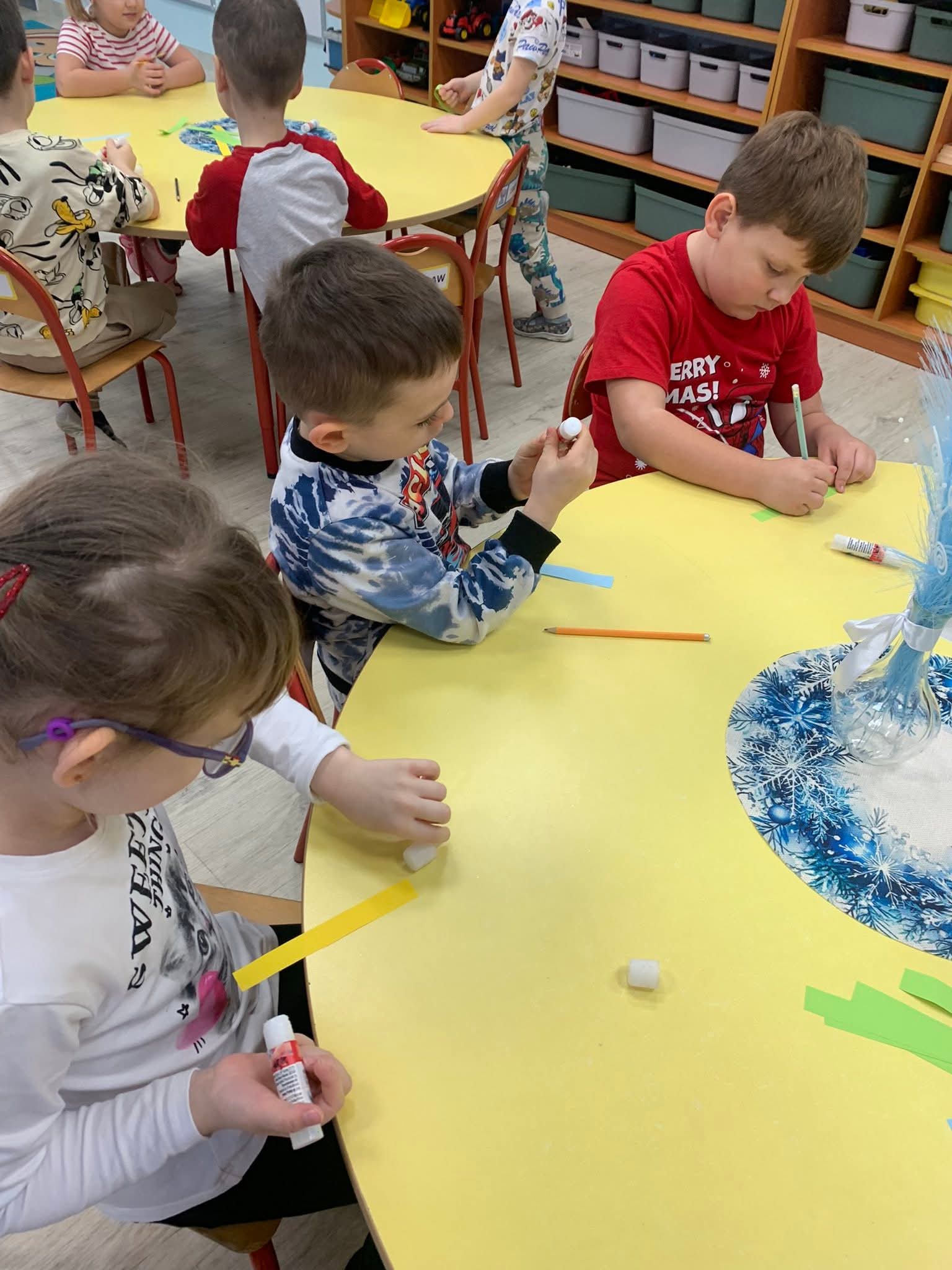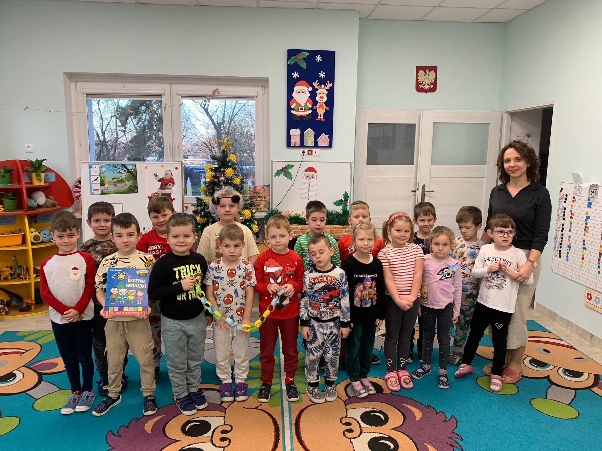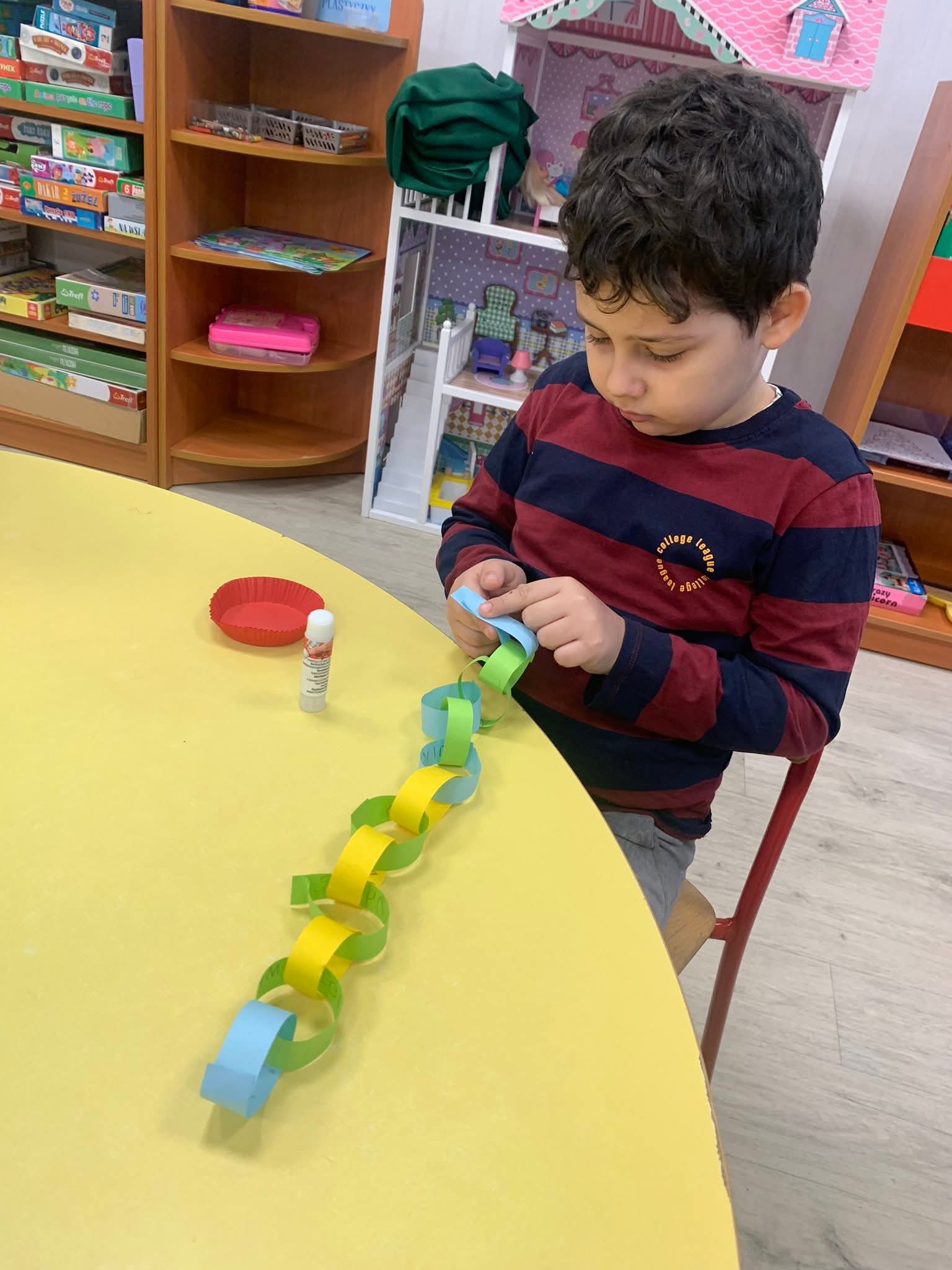 Przedszkolaki z zaangażowaniem podawały przykłady sytuacji, w których robią coś razem, oraz wspólnie rozmawialiśmy o korzyściach płynących ze współdziałania. Ważnym momentem zajęć było wykonanie papierowego łańcucha na choinkę, który powstał dzięki pracy całej grupy.